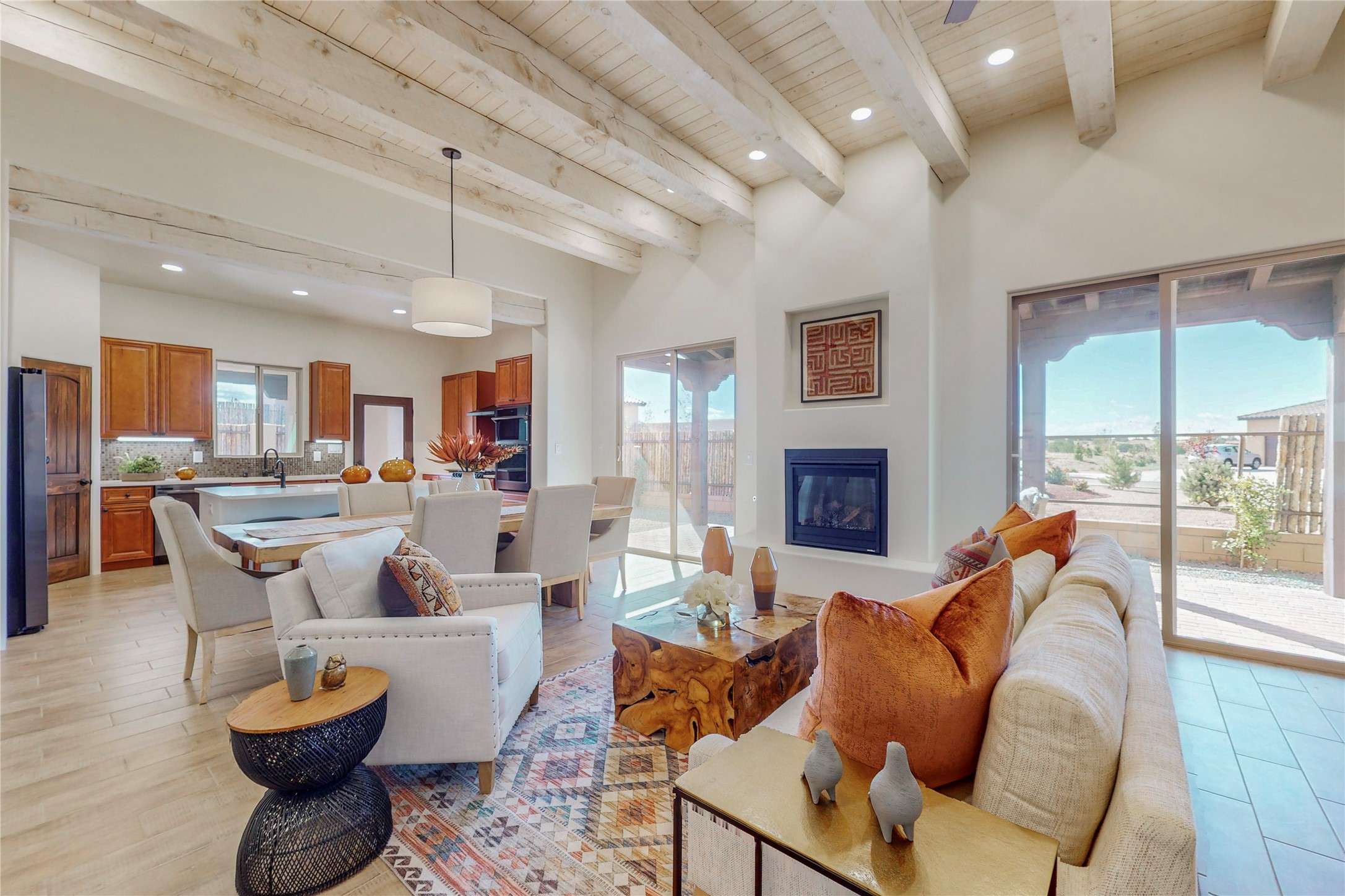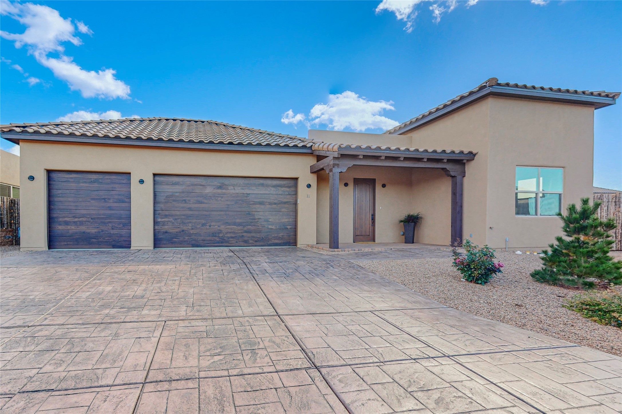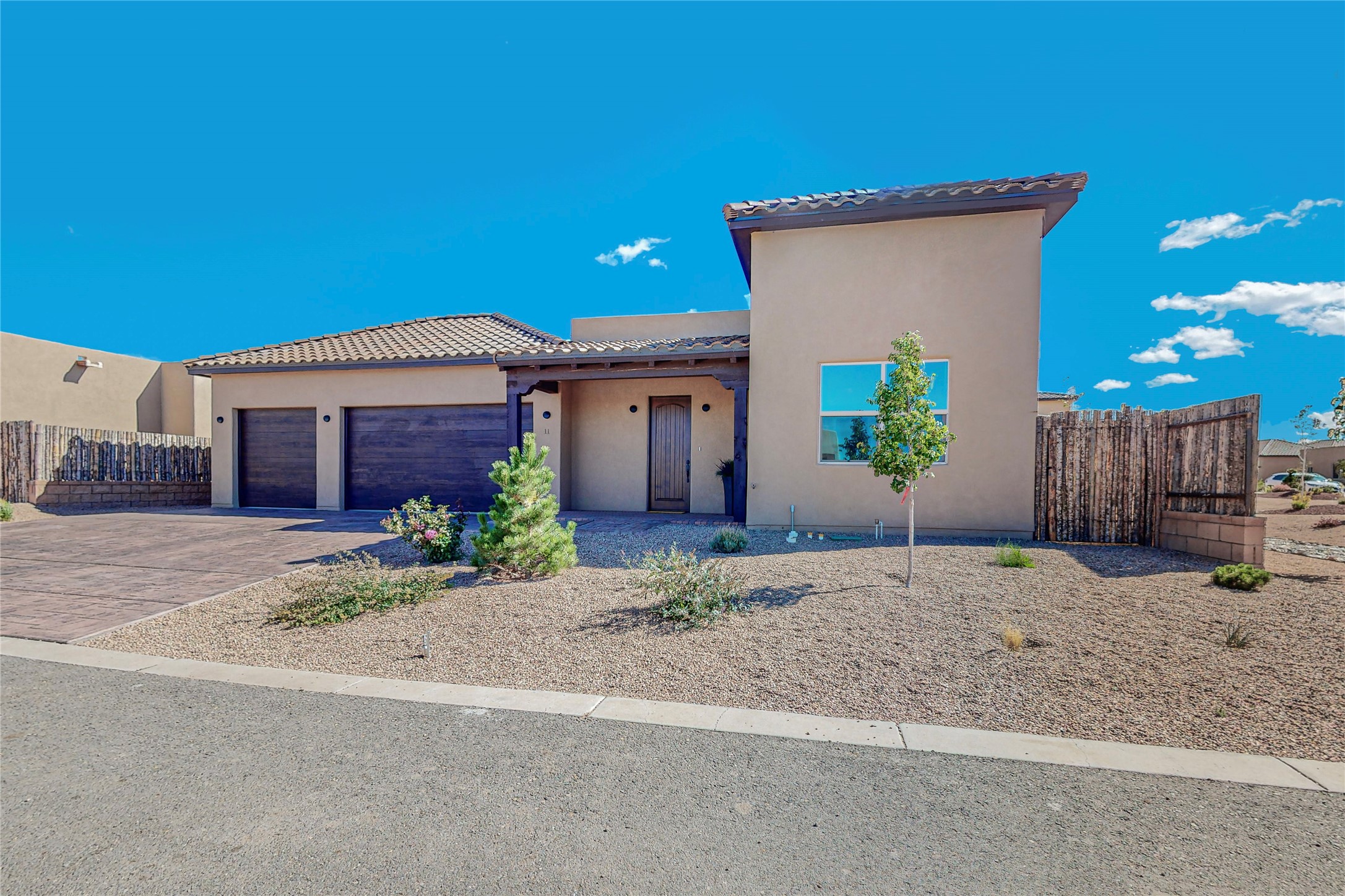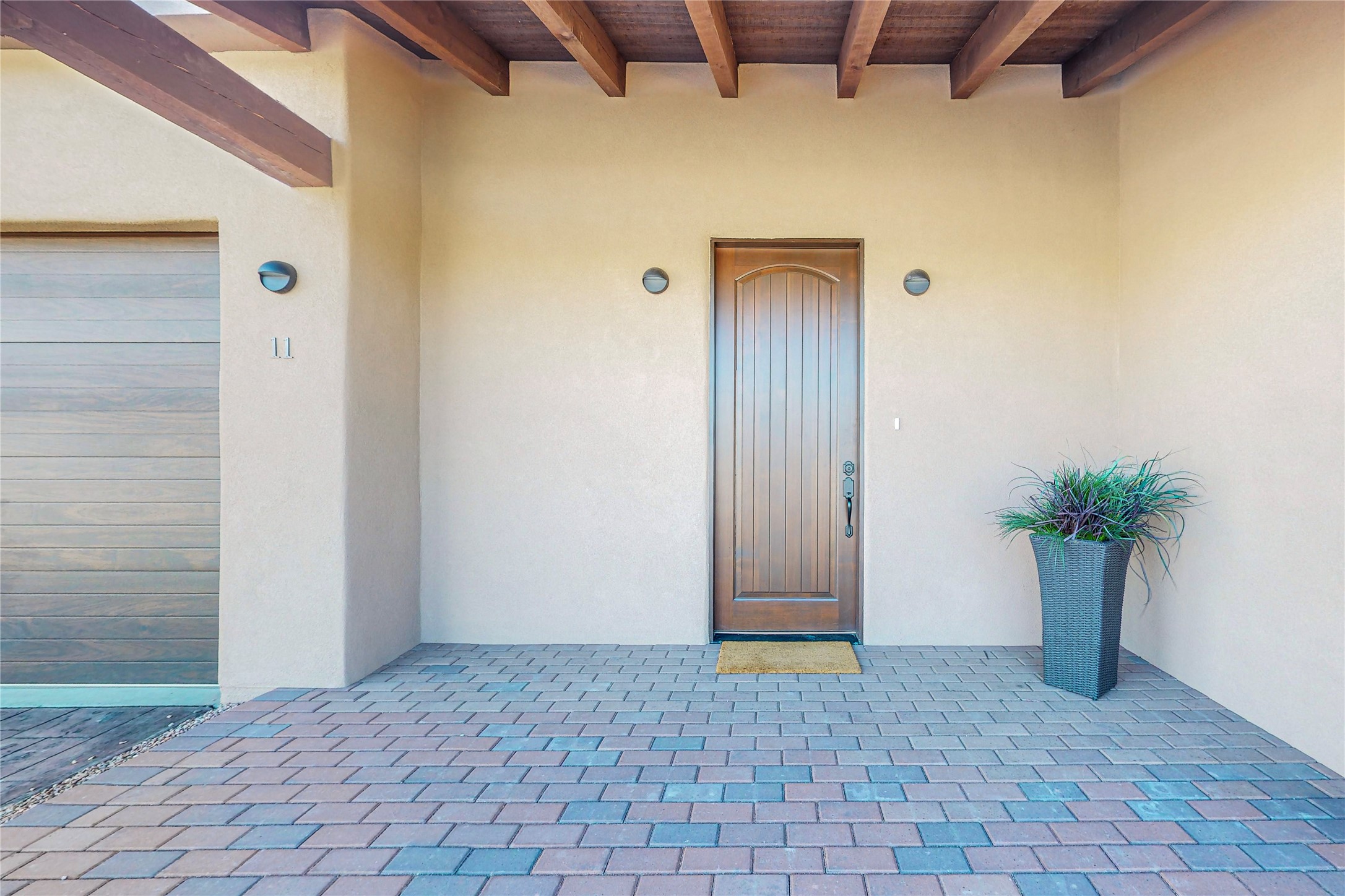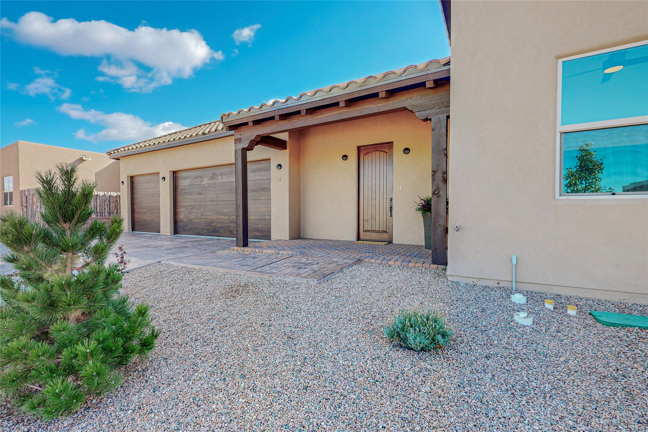 This powerful Santiago Plan is a 2239 sq.ft. 3 bedroom 4 bath home, with three fireplaces, three bedrooms, each with ensuite baths and a 3-car garage. Located at 11 Pinon Doblado in the La Pradera Subdivision, the home has open space on two sides of the home. Access to this home is through an 8 ft tall door which opens into a foyer with a 13-foot boveda ceiling. Immediately to the left is a powder room and an adjacent closet. To the right is a study/bedroom with a gas-fired kiva fireplace and a 3/4 bath. The living room has a 12-foot ceiling, white stained wood beams with T&G trim and a fireplace. The open kitchen has maple cabinets. The kitchen and the guest bedroom open out to a covered portal with a gas fireplace and brick pavers. Floor tile is porcelain plank in a light brown wood-like tone. The owner's suite has an enormous walk-in closet (about 100 sq.ft) and the owner's bath has a skylight, a large walk-in shower with euro-style shower fixtures and an overhead rain shower head. The exterior is a pitched roof Spanish design with clay-concrete tile roofs and covered portals with heavy wood beams and brick pavers. The driveway is a colored stamped concrete design. The insulated three-car garage has two storage closets and an epoxy-coated floor.