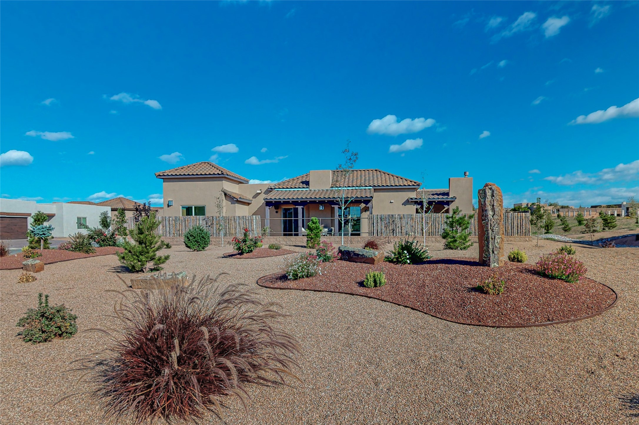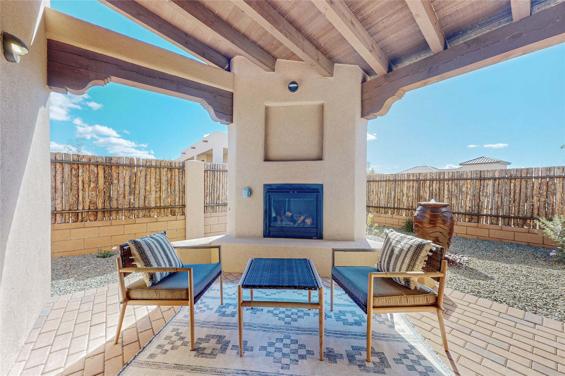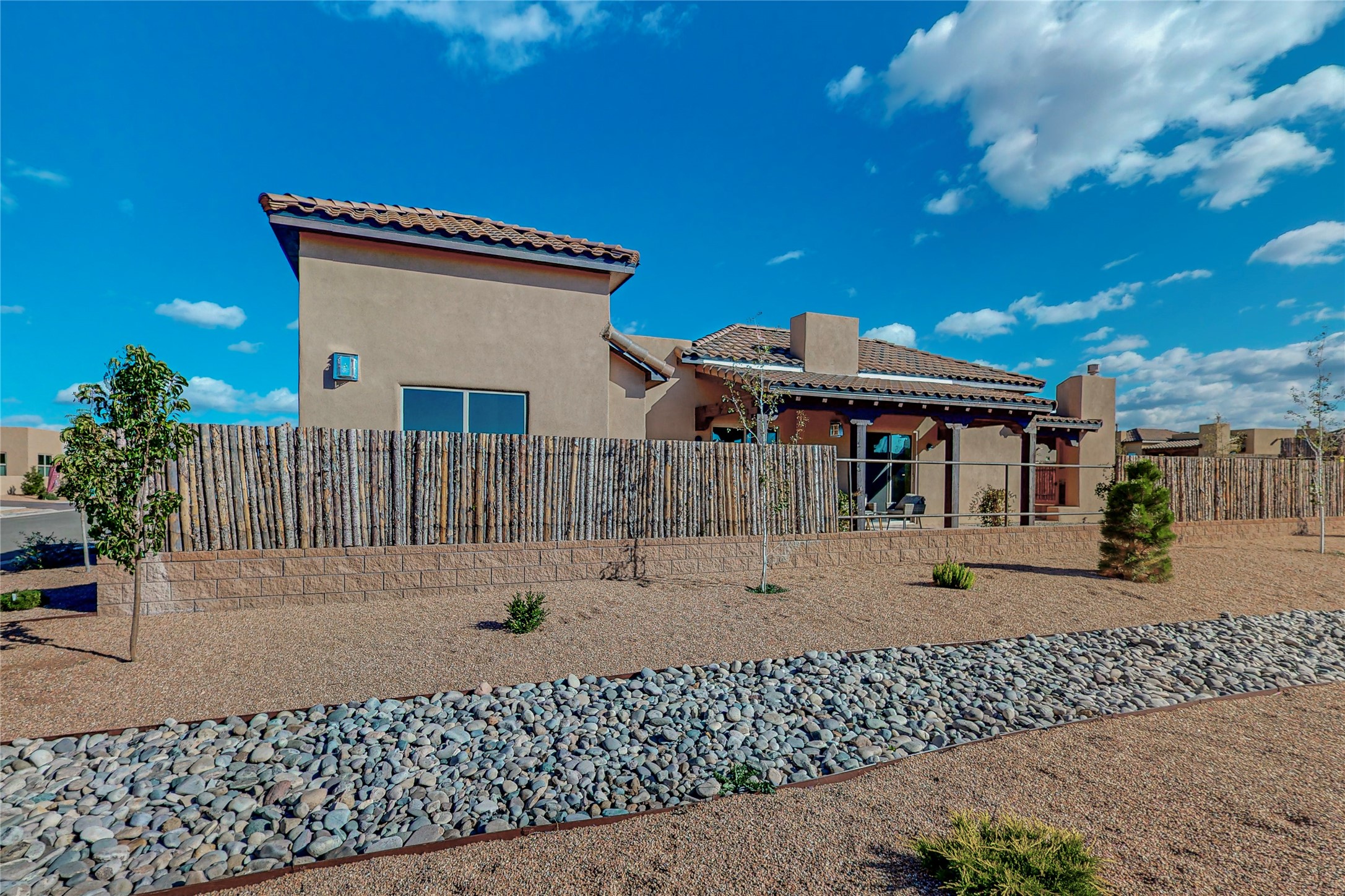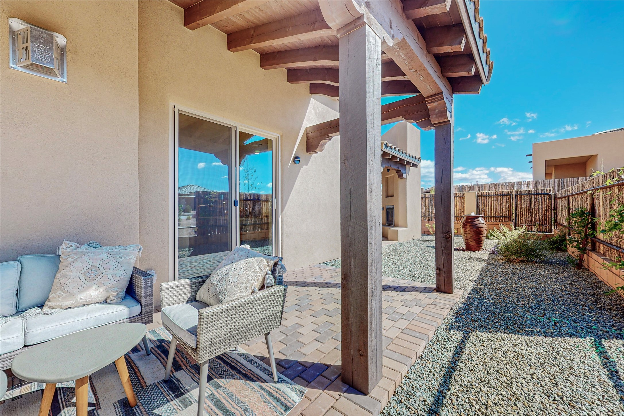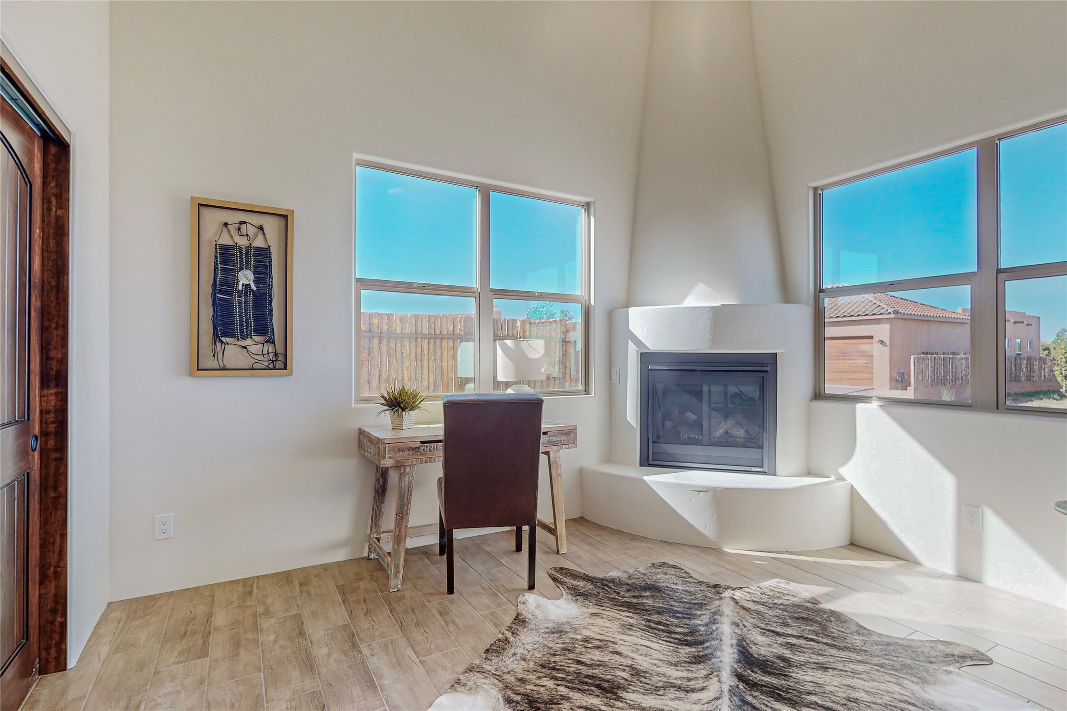 This powerful Santiago Plan is a 2239 sq.ft. 3 bedroom 4 bath home, with three fireplaces, three bedrooms, each with ensuite baths and a 3-car garage. Located at 11 Pinon Doblado in the La Pradera Subdivision, the home has open space on two sides of the home. Access to this home is through an 8 ft tall door which opens into a foyer with a 13-foot boveda ceiling. Immediately to the left is a powder room and an adjacent closet. To the right is a study/bedroom with a gas-fired kiva fireplace and a 3/4 bath. The living room has a 12-foot ceiling, white stained wood beams with T&G trim and a fireplace. The open kitchen has maple cabinets. The kitchen and the guest bedroom open out to a covered portal with a gas fireplace and brick pavers. Floor tile is porcelain plank in a light brown wood-like tone. The owner's suite has an enormous walk-in closet (about 100 sq.ft) and the owner's bath has a skylight, a large walk-in shower with euro-style shower fixtures and an overhead rain shower head. The exterior is a pitched roof Spanish design with clay-concrete tile roofs and covered portals with heavy wood beams and brick pavers. The driveway is a colored stamped concrete design. The insulated three-car garage has two storage closets and an epoxy-coated floor.