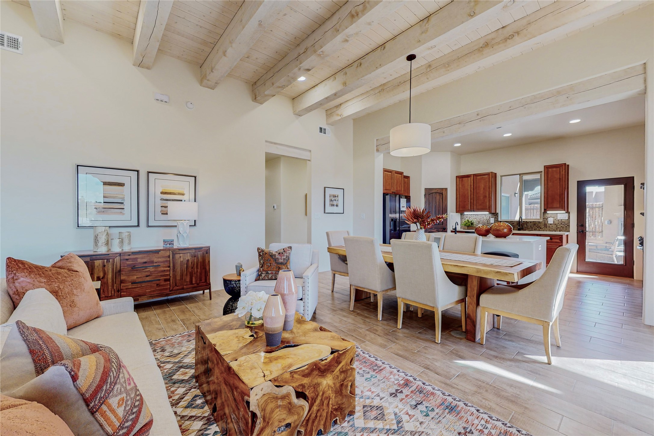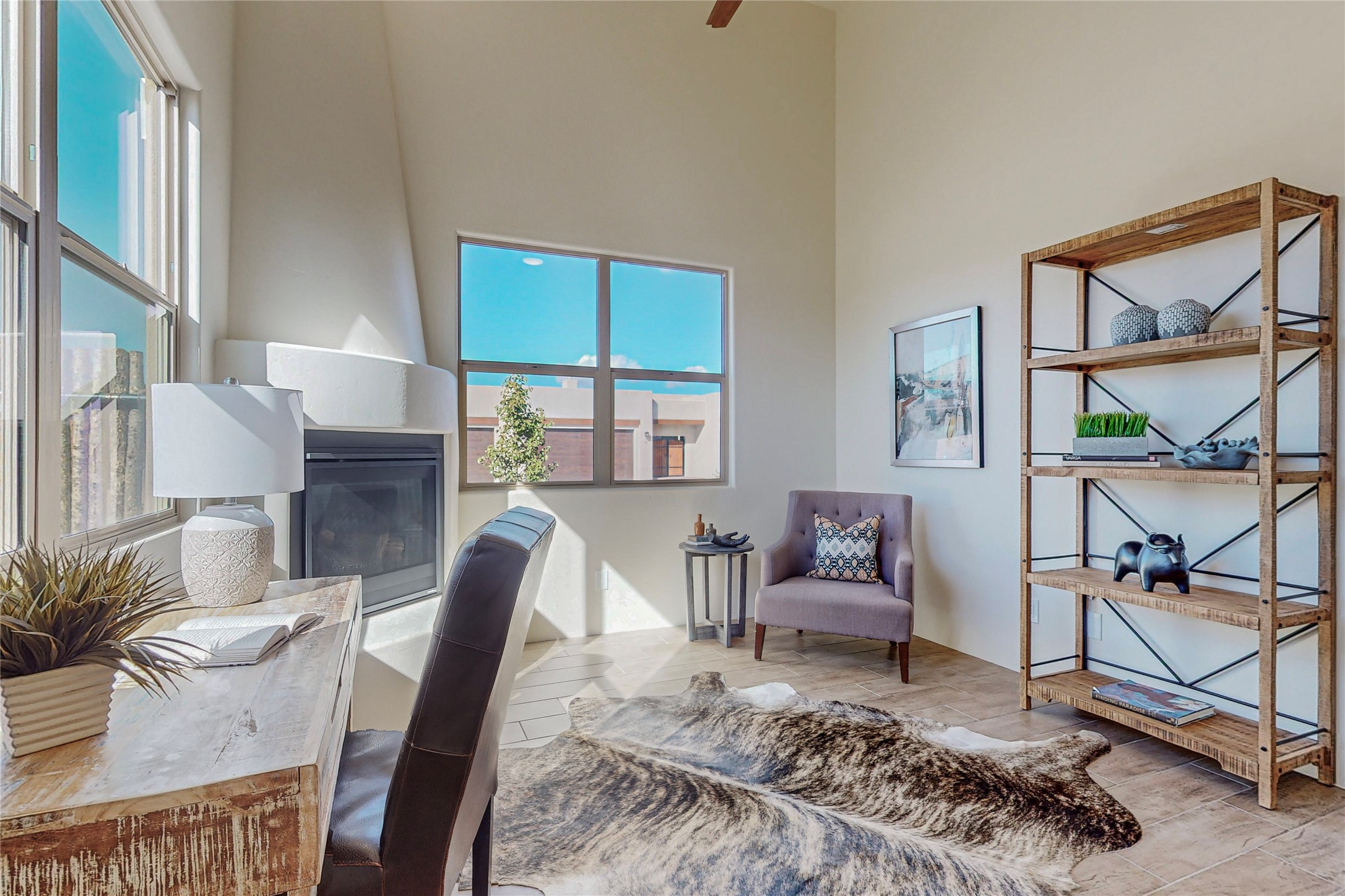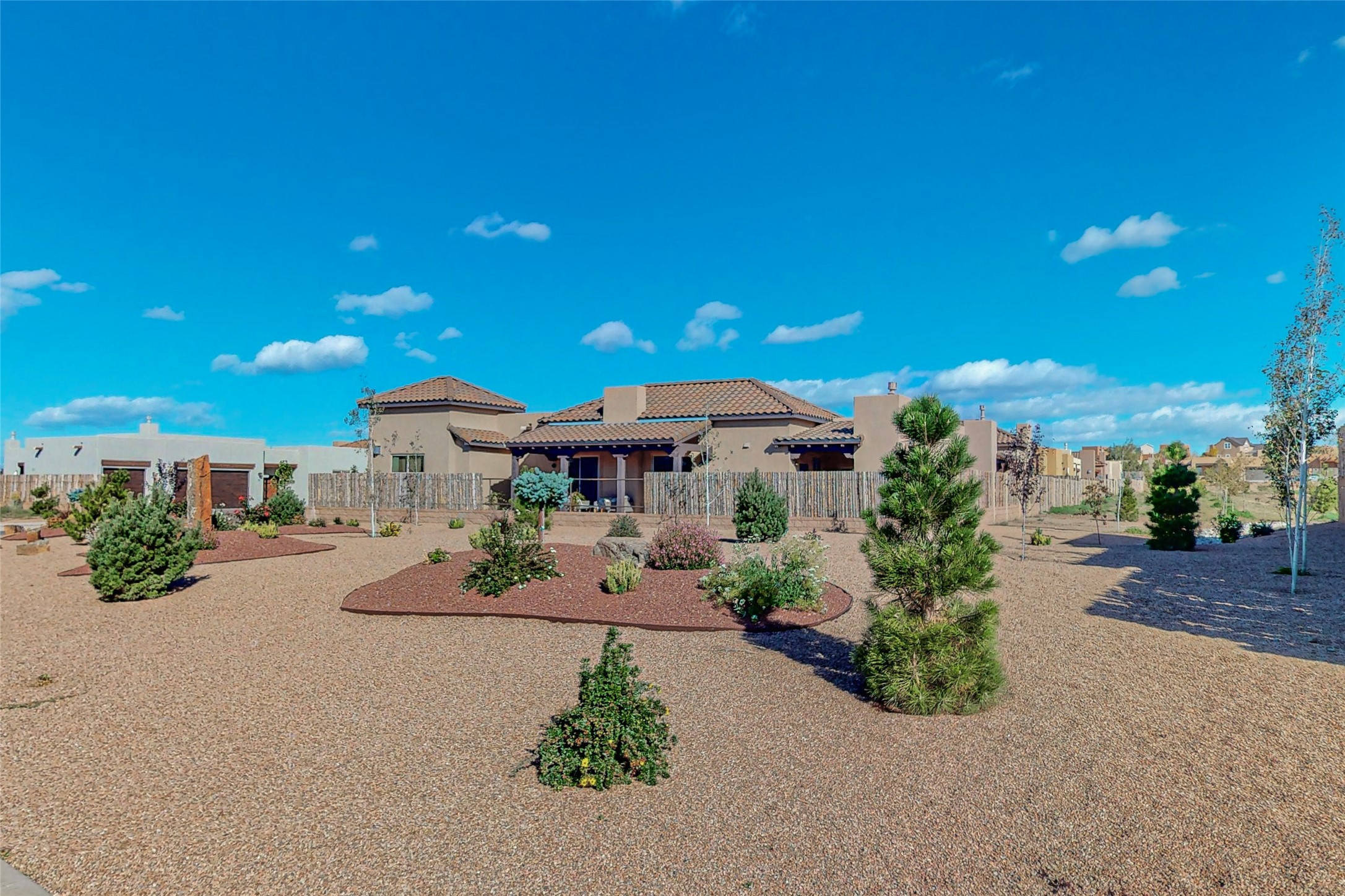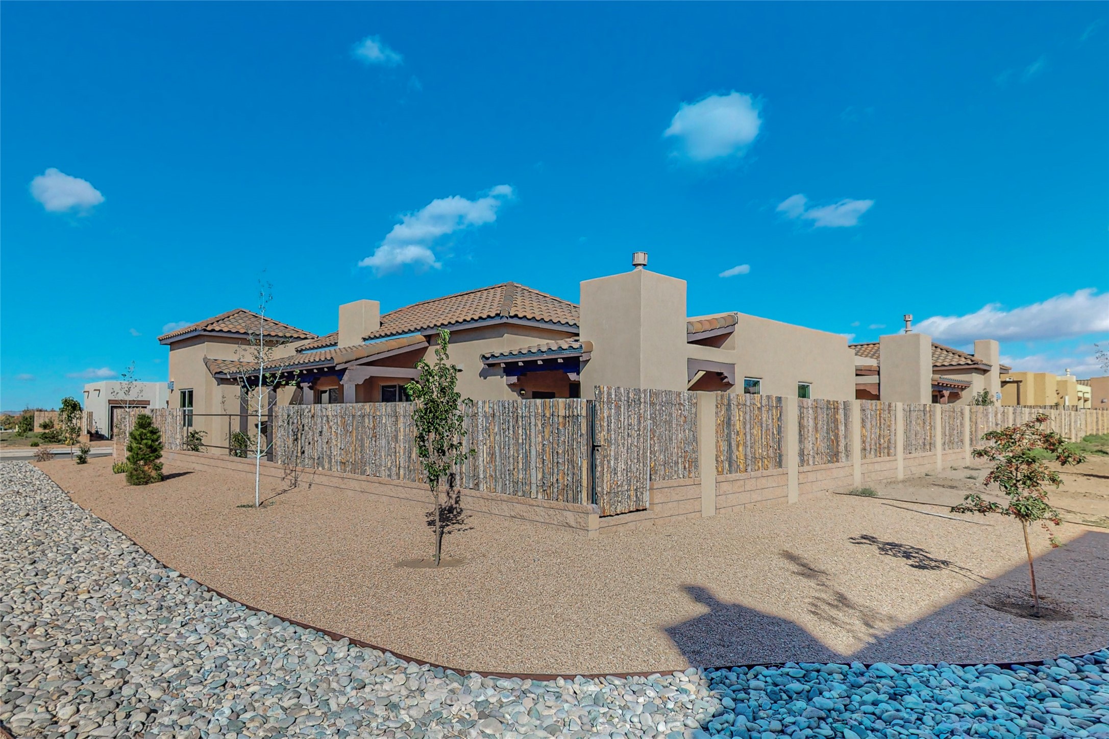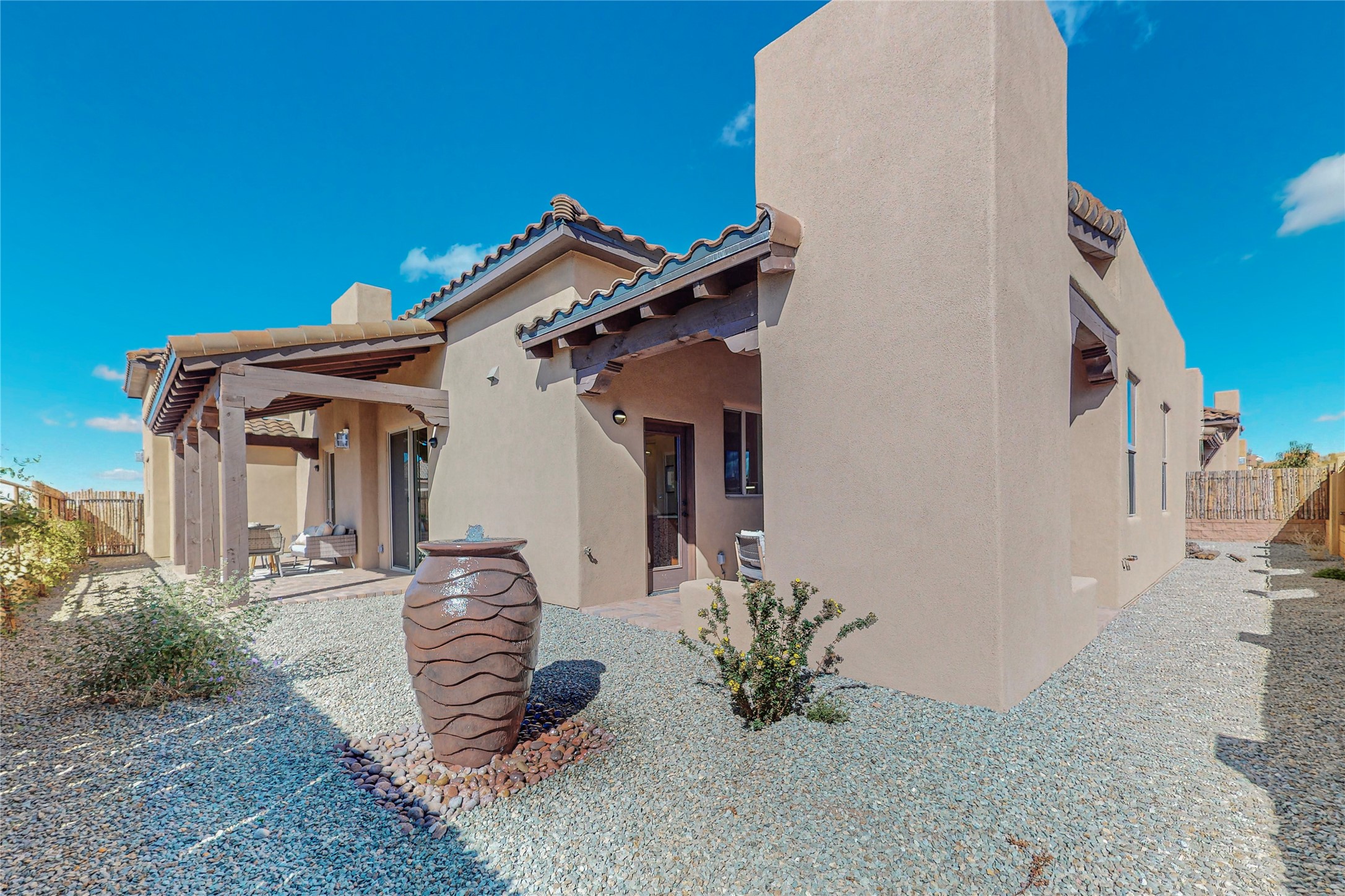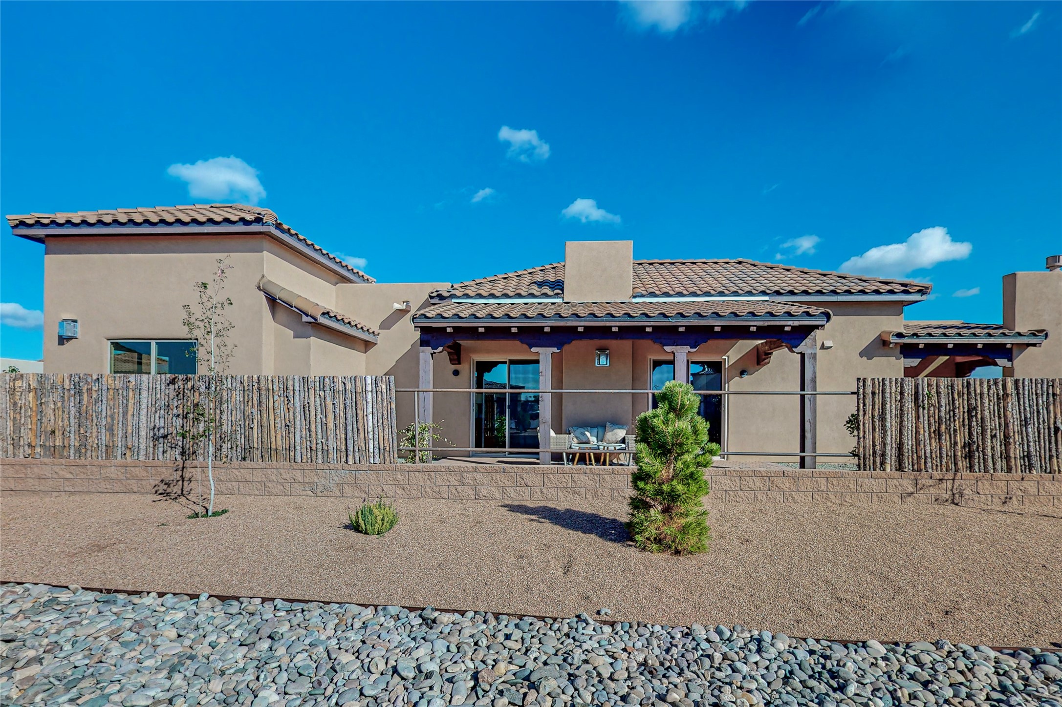 This powerful Santiago Plan is a 2239 sq.ft. 3 bedroom 4 bath home, with three fireplaces, three bedrooms, each with ensuite baths and a 3-car garage. Located at 11 Pinon Doblado in the La Pradera Subdivision, the home has open space on two sides of the home. Access to this home is through an 8 ft tall door which opens into a foyer with a 13-foot boveda ceiling. Immediately to the left is a powder room and an adjacent closet. To the right is a study/bedroom with a gas-fired kiva fireplace and a 3/4 bath. The living room has a 12-foot ceiling, white stained wood beams with T&G trim and a fireplace. The open kitchen has maple cabinets. The kitchen and the guest bedroom open out to a covered portal with a gas fireplace and brick pavers. Floor tile is porcelain plank in a light brown wood-like tone. The owner's suite has an enormous walk-in closet (about 100 sq.ft) and the owner's bath has a skylight, a large walk-in shower with euro-style shower fixtures and an overhead rain shower head. The exterior is a pitched roof Spanish design with clay-concrete tile roofs and covered portals with heavy wood beams and brick pavers. The driveway is a colored stamped concrete design. The insulated three-car garage has two storage closets and an epoxy-coated floor.