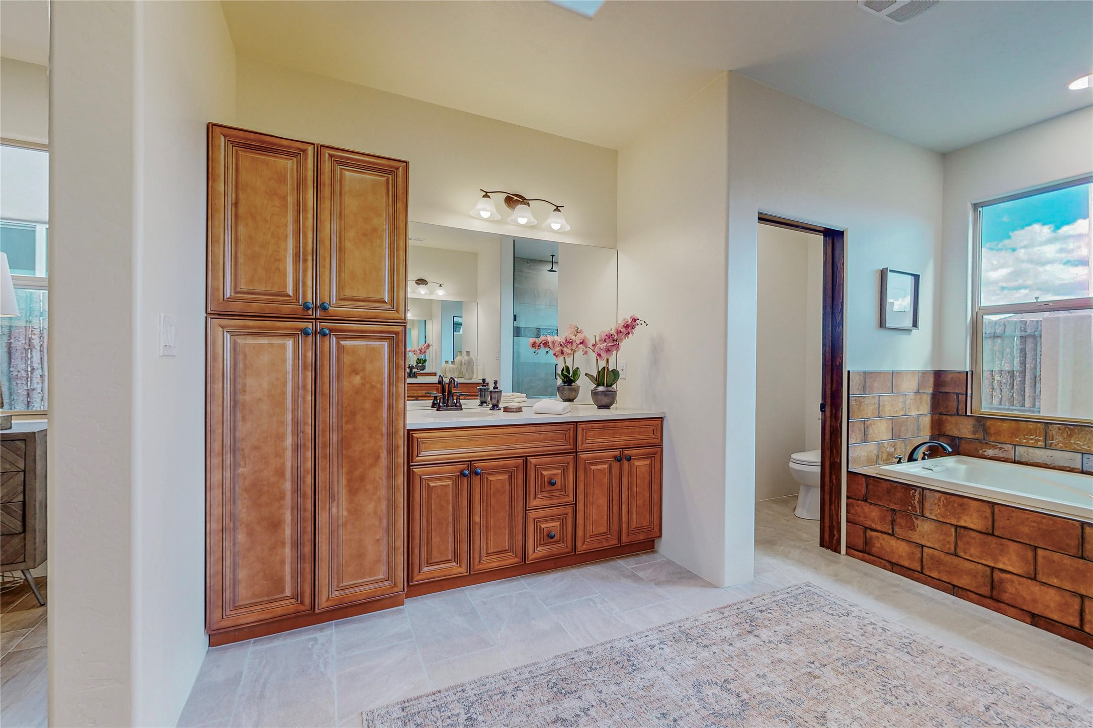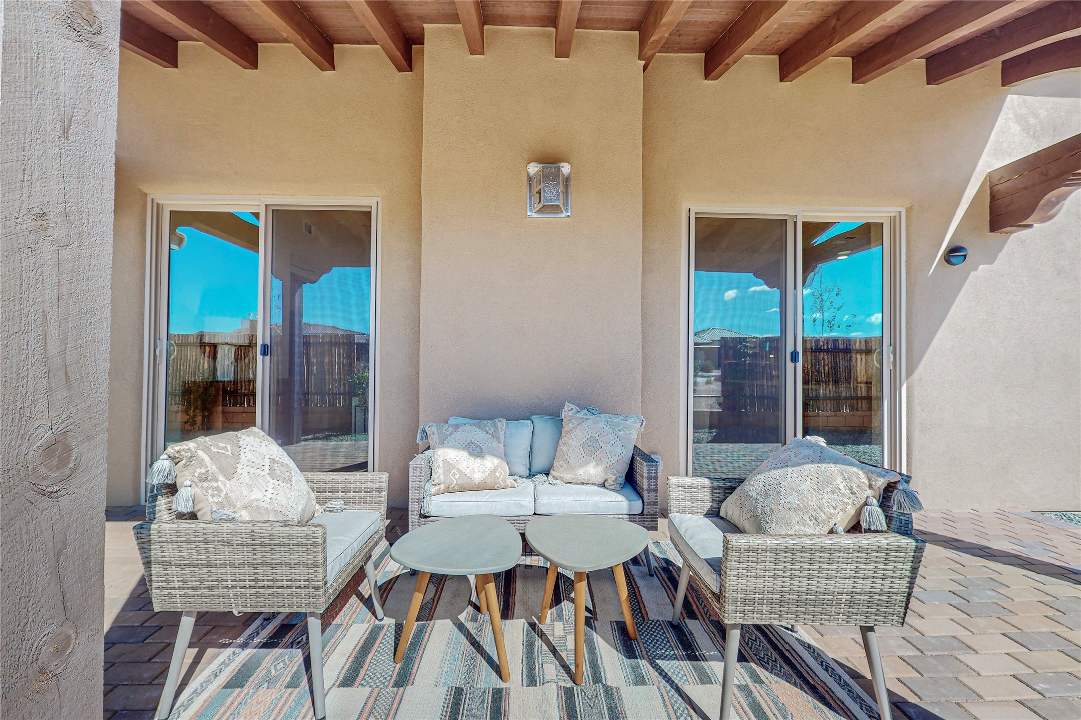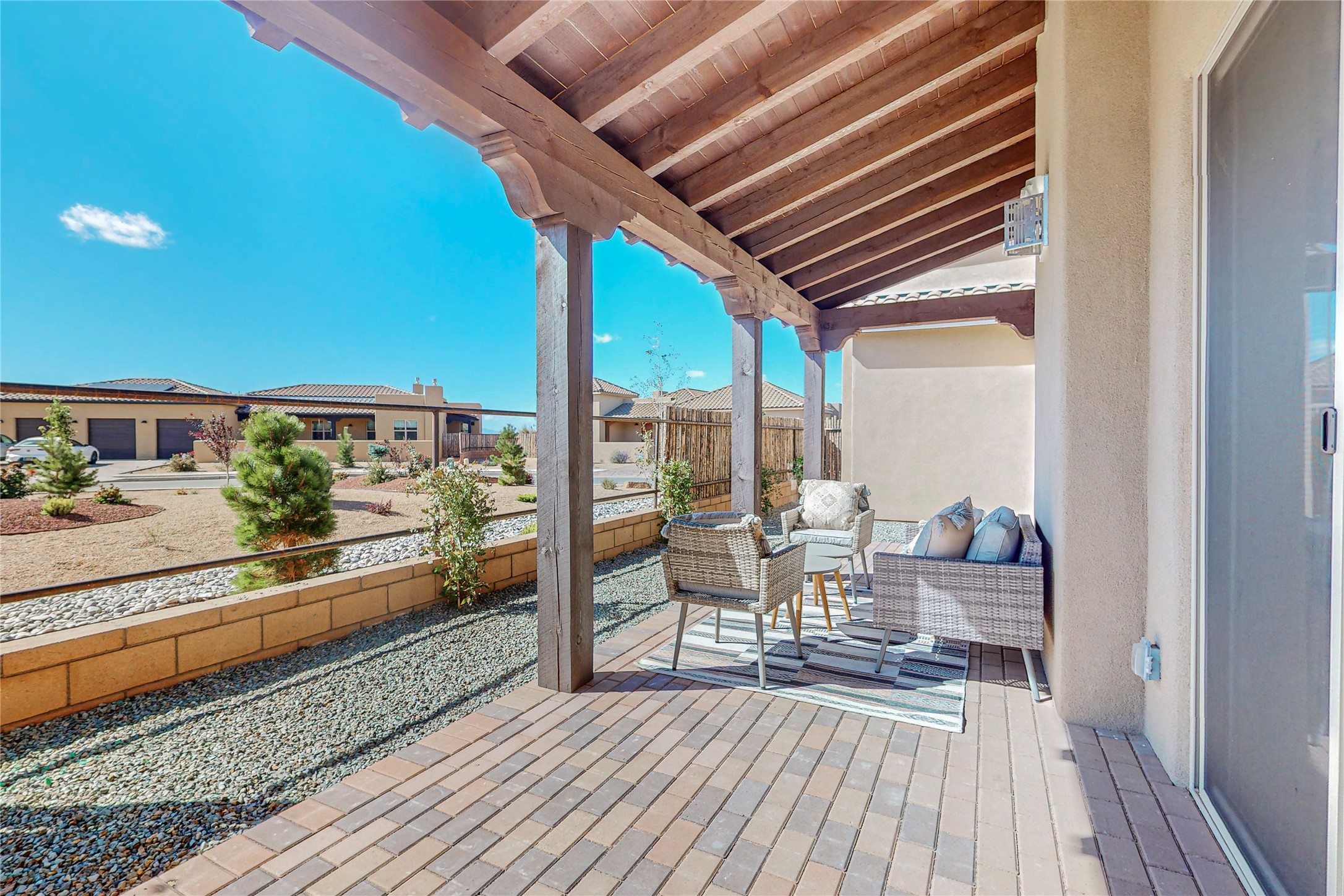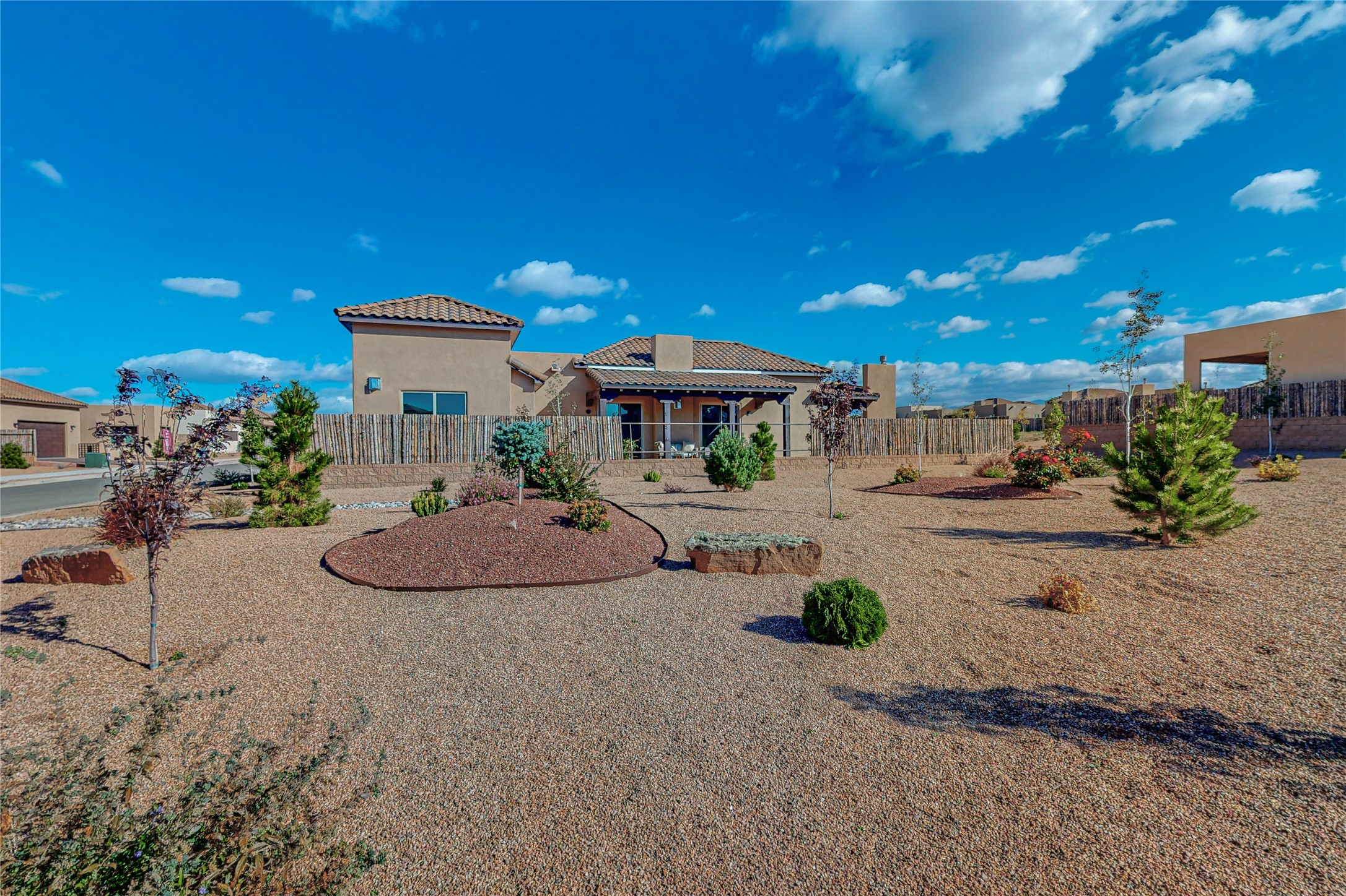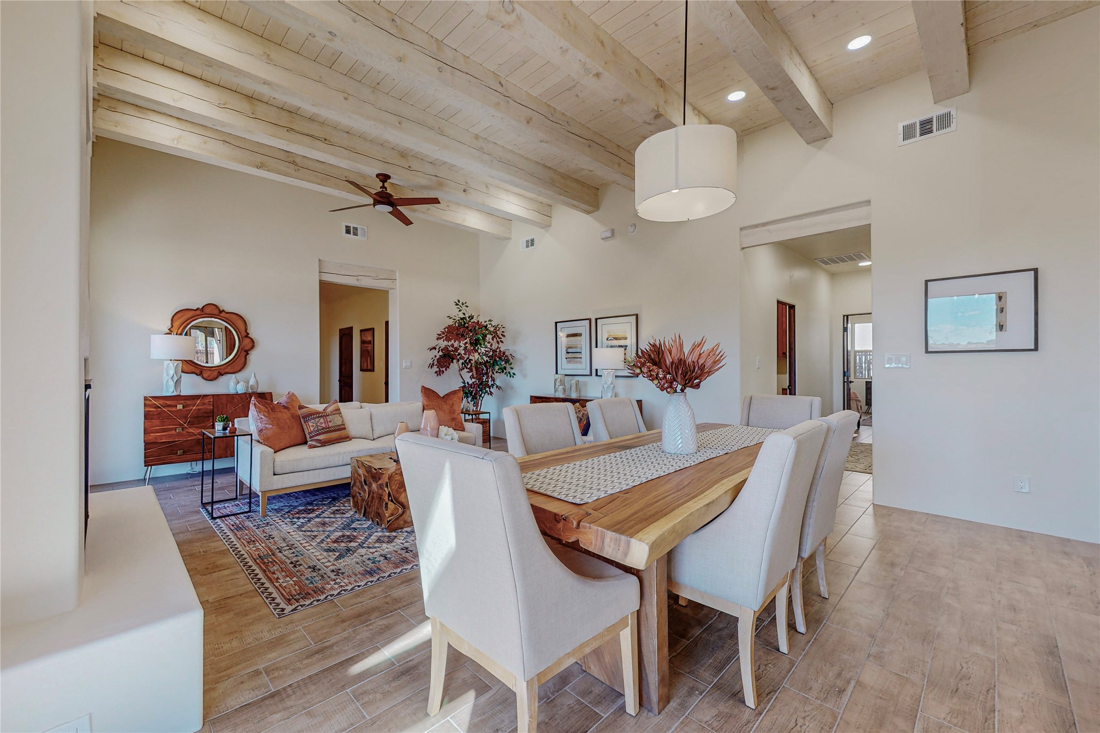 This powerful Santiago Plan is a 2239 sq.ft. 3 bedroom 4 bath home, with three fireplaces, three bedrooms, each with ensuite baths and a 3-car garage. Located at 11 Pinon Doblado in the La Pradera Subdivision, the home has open space on two sides of the home. Access to this home is through an 8 ft tall door which opens into a foyer with a 13-foot boveda ceiling. Immediately to the left is a powder room and an adjacent closet. To the right is a study/bedroom with a gas-fired kiva fireplace and a 3/4 bath. The living room has a 12-foot ceiling, white stained wood beams with T&G trim and a fireplace. The open kitchen has maple cabinets. The kitchen and the guest bedroom open out to a covered portal with a gas fireplace and brick pavers. Floor tile is porcelain plank in a light brown wood-like tone. The owner's suite has an enormous walk-in closet (about 100 sq.ft) and the owner's bath has a skylight, a large walk-in shower with euro-style shower fixtures and an overhead rain shower head. The exterior is a pitched roof Spanish design with clay-concrete tile roofs and covered portals with heavy wood beams and brick pavers. The driveway is a colored stamped concrete design. The insulated three-car garage has two storage closets and an epoxy-coated floor.