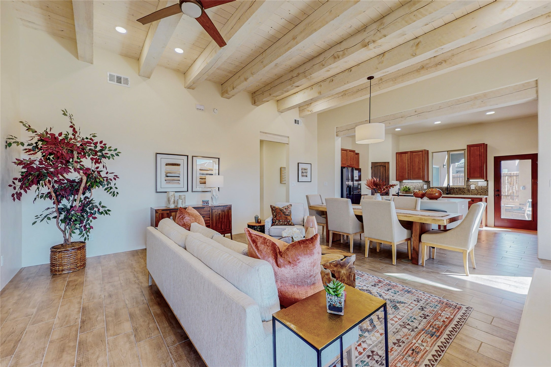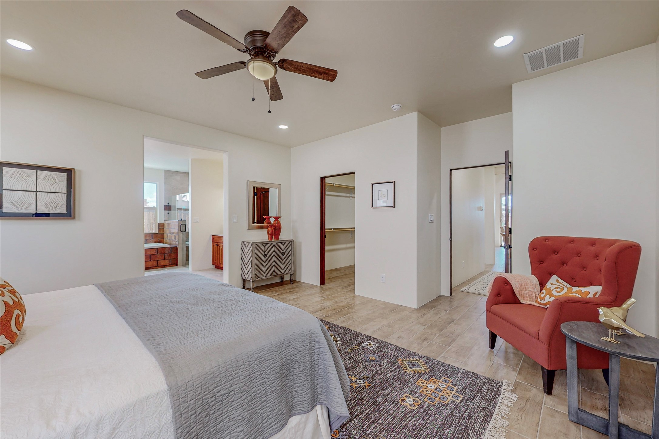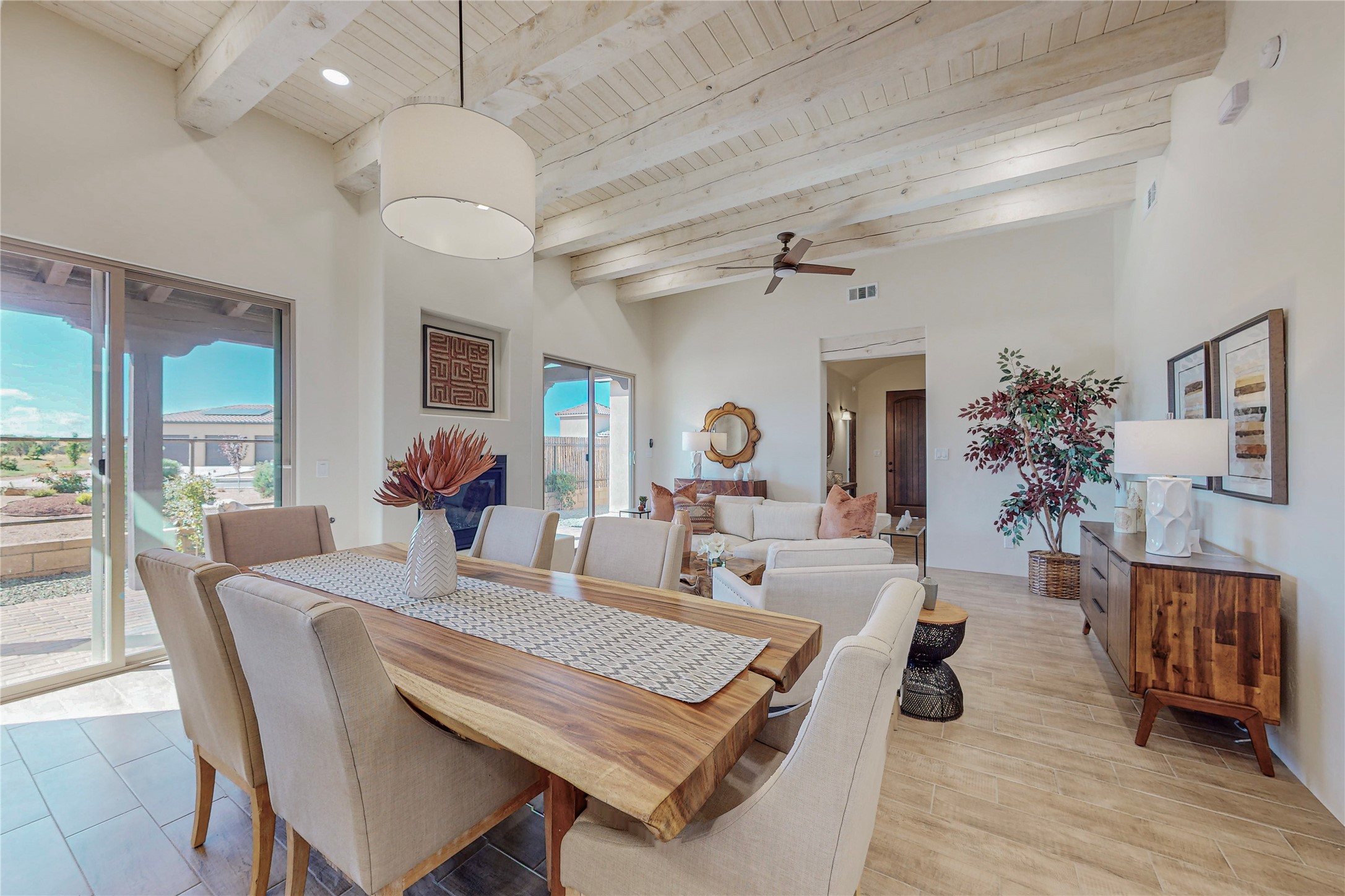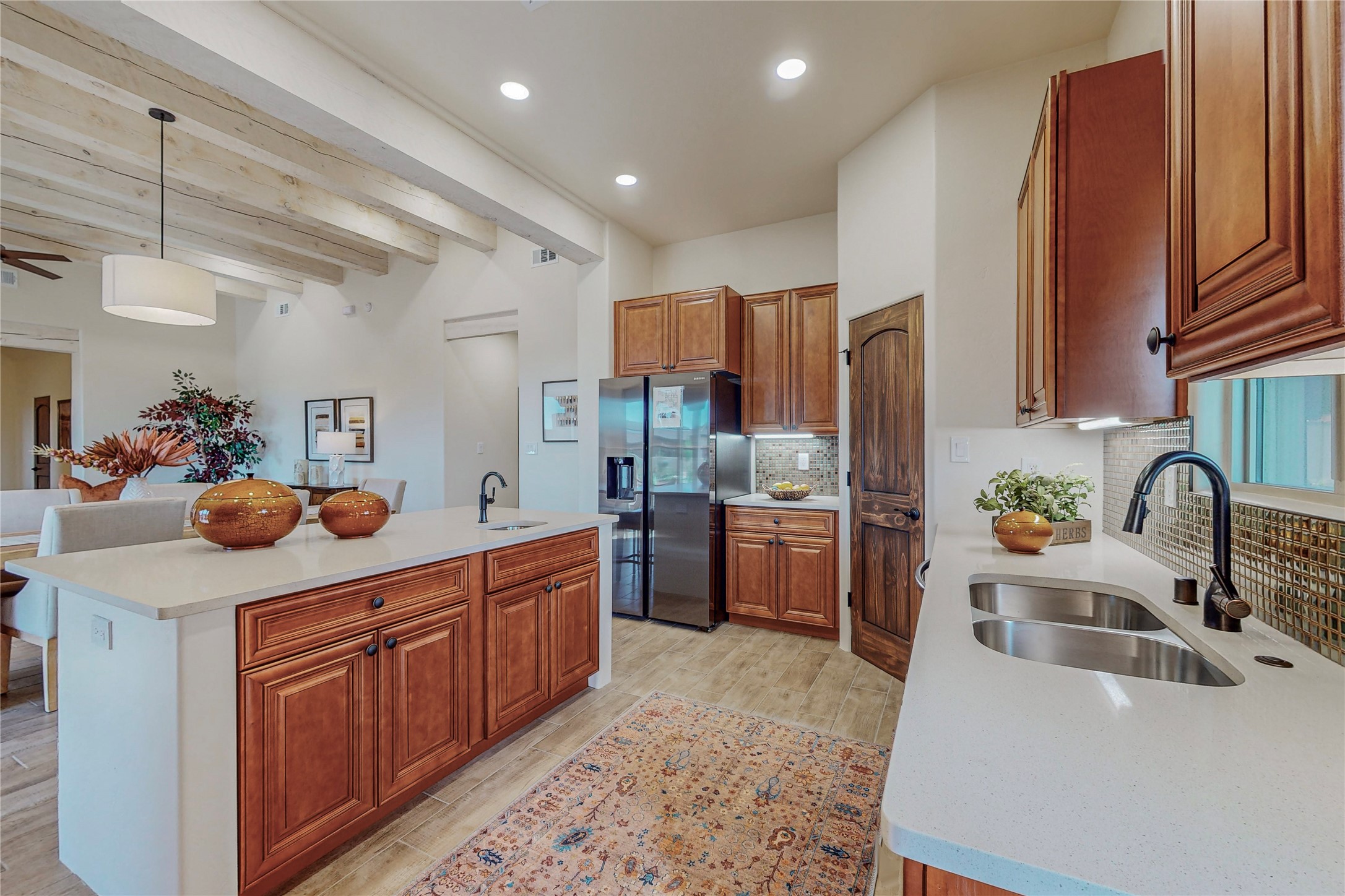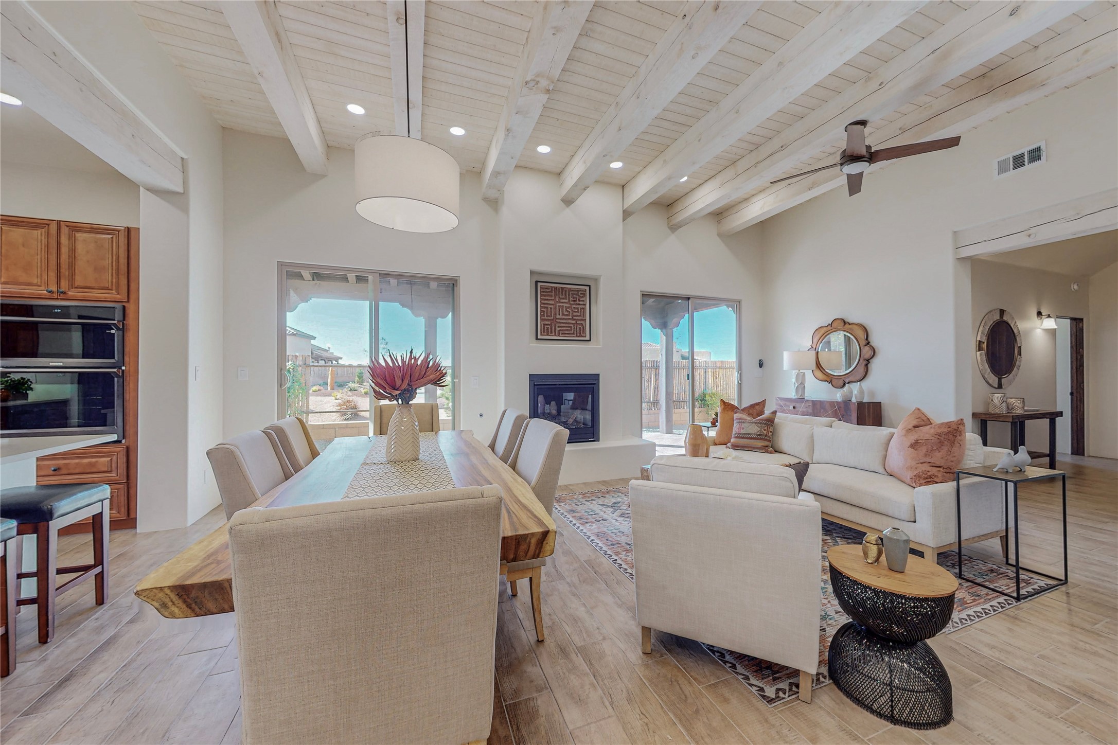 This powerful Santiago Plan is a 2239 sq.ft. 3 bedroom 4 bath home, with three fireplaces, three bedrooms, each with ensuite baths and a 3-car garage. Located at 11 Pinon Doblado in the La Pradera Subdivision, the home has open space on two sides of the home. Access to this home is through an 8 ft tall door which opens into a foyer with a 13-foot boveda ceiling. Immediately to the left is a powder room and an adjacent closet. To the right is a study/bedroom with a gas-fired kiva fireplace and a 3/4 bath. The living room has a 12-foot ceiling, white stained wood beams with T&G trim and a fireplace. The open kitchen has maple cabinets. The kitchen and the guest bedroom open out to a covered portal with a gas fireplace and brick pavers. Floor tile is porcelain plank in a light brown wood-like tone. The owner's suite has an enormous walk-in closet (about 100 sq.ft) and the owner's bath has a skylight, a large walk-in shower with euro-style shower fixtures and an overhead rain shower head. The exterior is a pitched roof Spanish design with clay-concrete tile roofs and covered portals with heavy wood beams and brick pavers. The driveway is a colored stamped concrete design. The insulated three-car garage has two storage closets and an epoxy-coated floor.