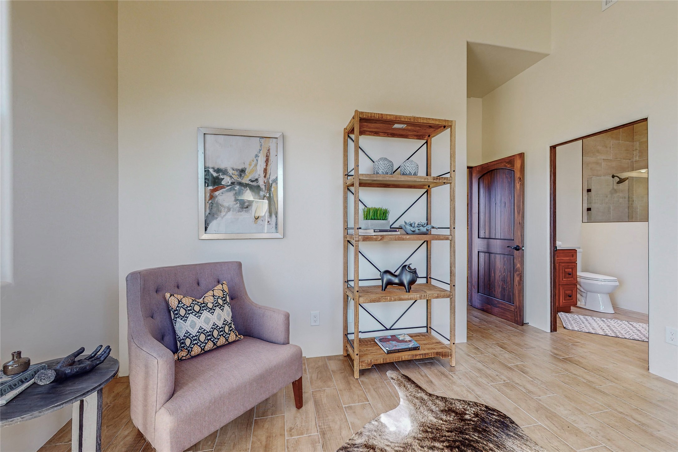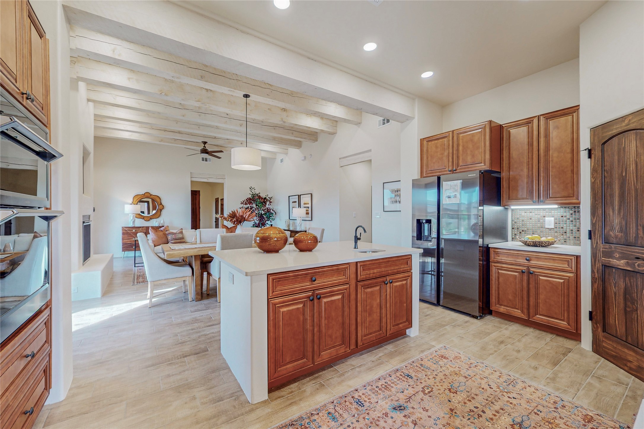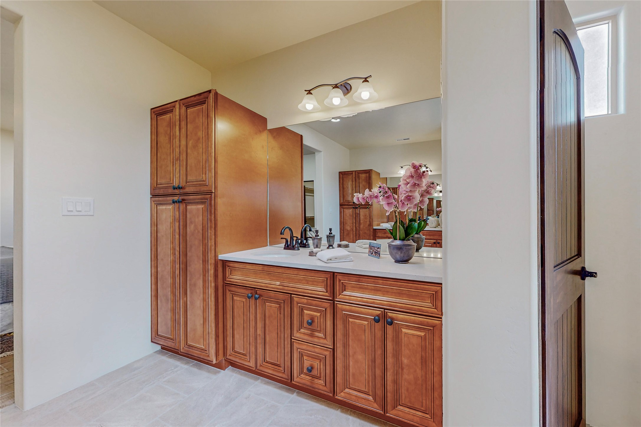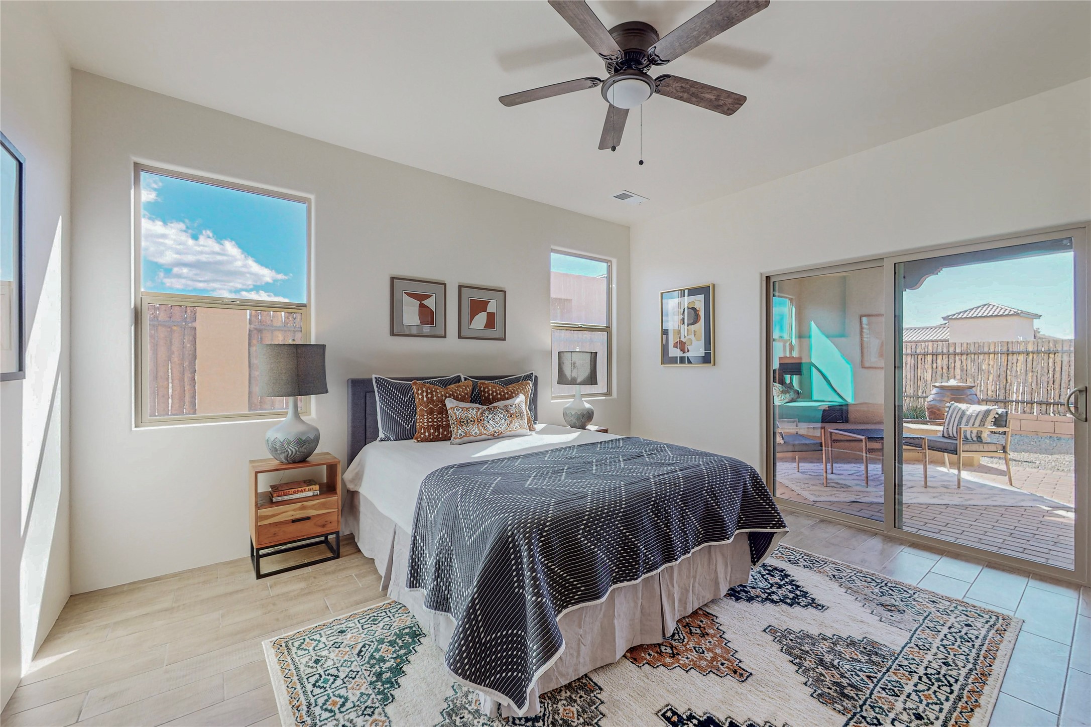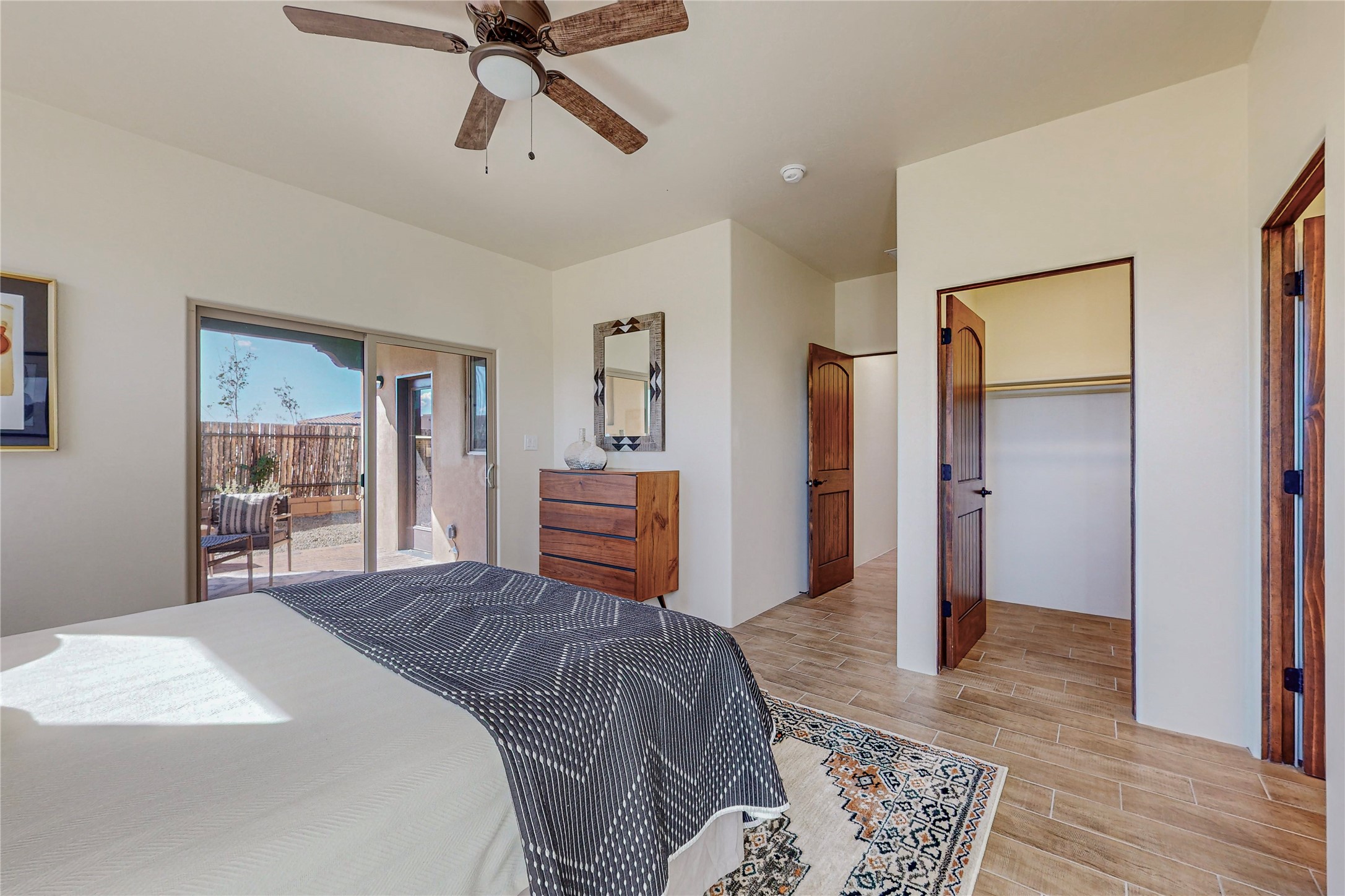This powerful Santiago Plan is a 2239 sq.ft. 3 bedroom 4 bath home, with three fireplaces, three bedrooms, each with ensuite baths and a 3-car garage. Located at 11 Pinon Doblado in the La Pradera Subdivision, the home has open space on two sides of the home. Access to this home is through an 8 ft tall door which opens into a foyer with a 13-foot boveda ceiling. Immediately to the left is a powder room and an adjacent closet. To the right is a study/bedroom with a gas-fired kiva fireplace and a 3/4 bath. The living room has a 12-foot ceiling, white stained wood beams with T&G trim and a fireplace. The open kitchen has maple cabinets. The kitchen and the guest bedroom open out to a covered portal with a gas fireplace and brick pavers. Floor tile is porcelain plank in a light brown wood-like tone. The owner's suite has an enormous walk-in closet (about 100 sq.ft) and the owner's bath has a skylight, a large walk-in shower with euro-style shower fixtures and an overhead rain shower head. The exterior is a pitched roof Spanish design with clay-concrete tile roofs and covered portals with heavy wood beams and brick pavers. The driveway is a colored stamped concrete design. The insulated three-car garage has two storage closets and an epoxy-coated floor.