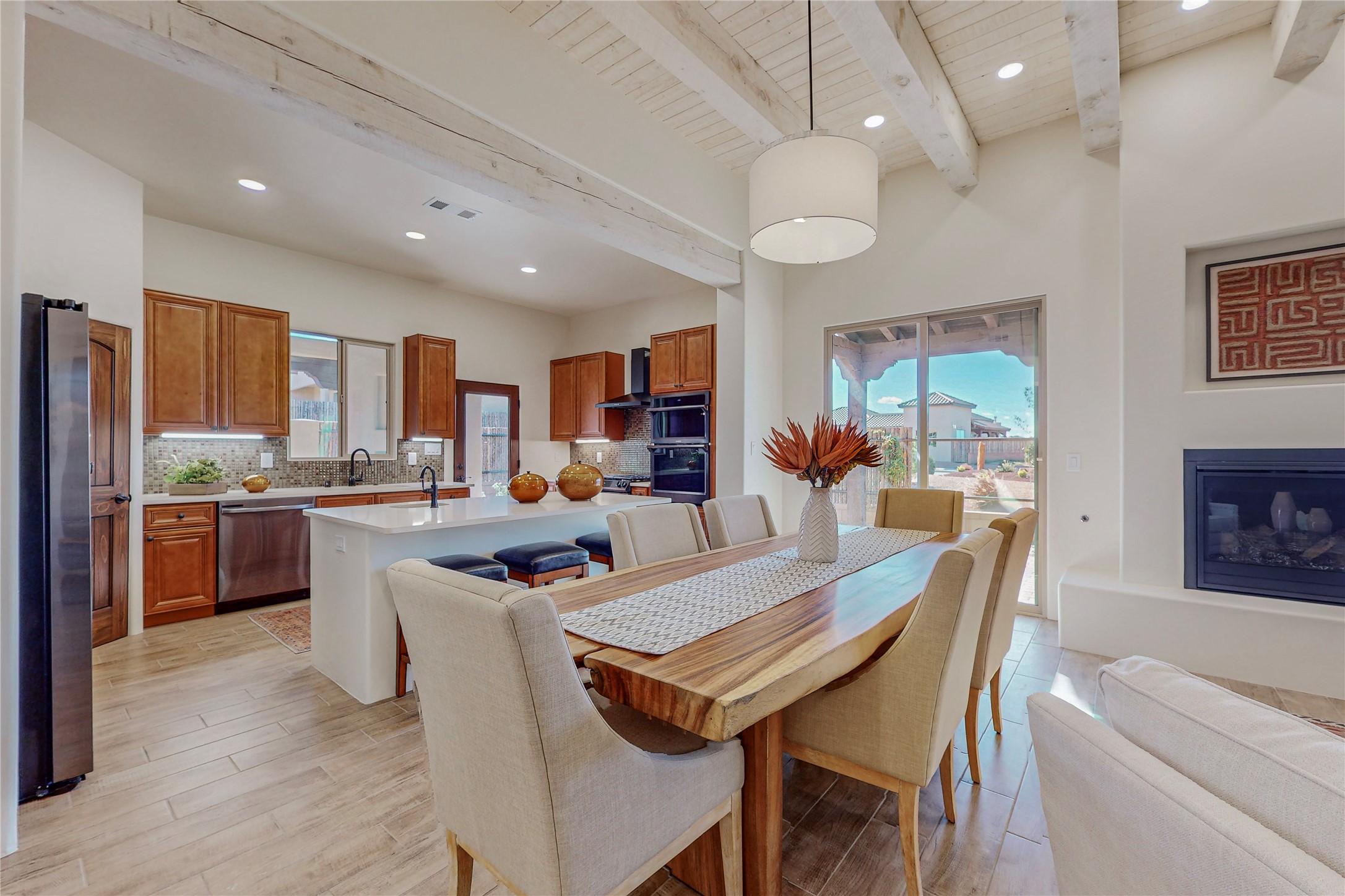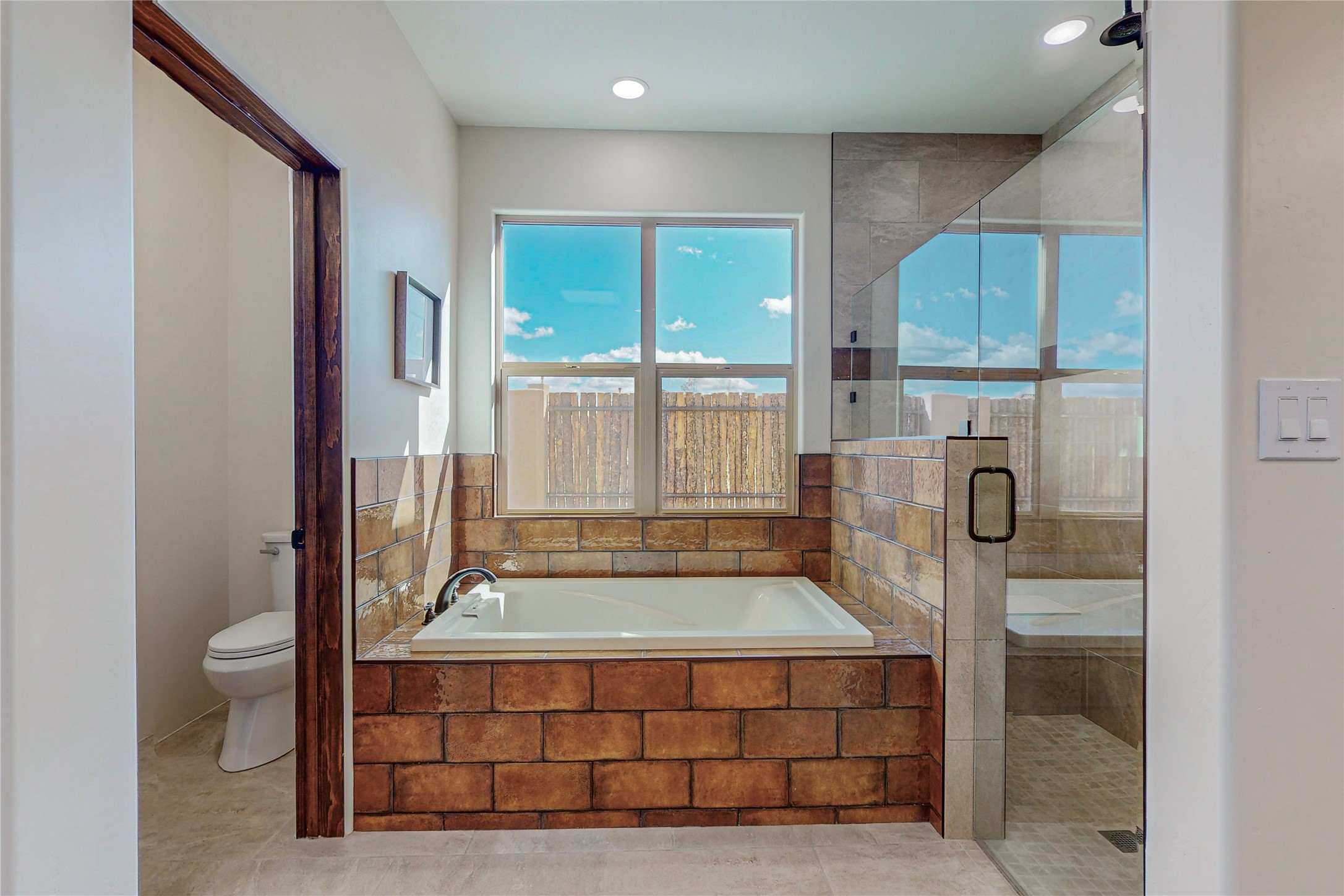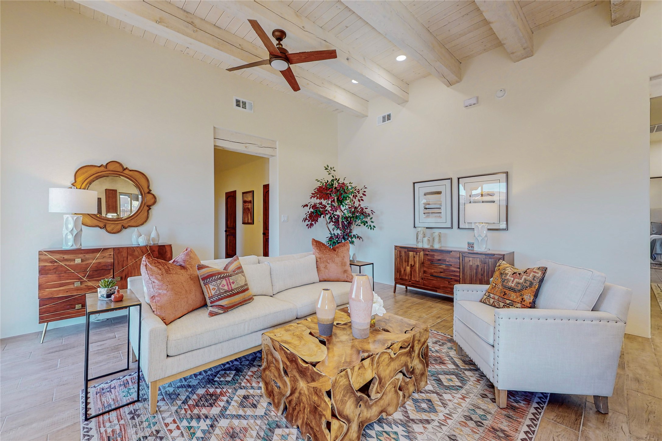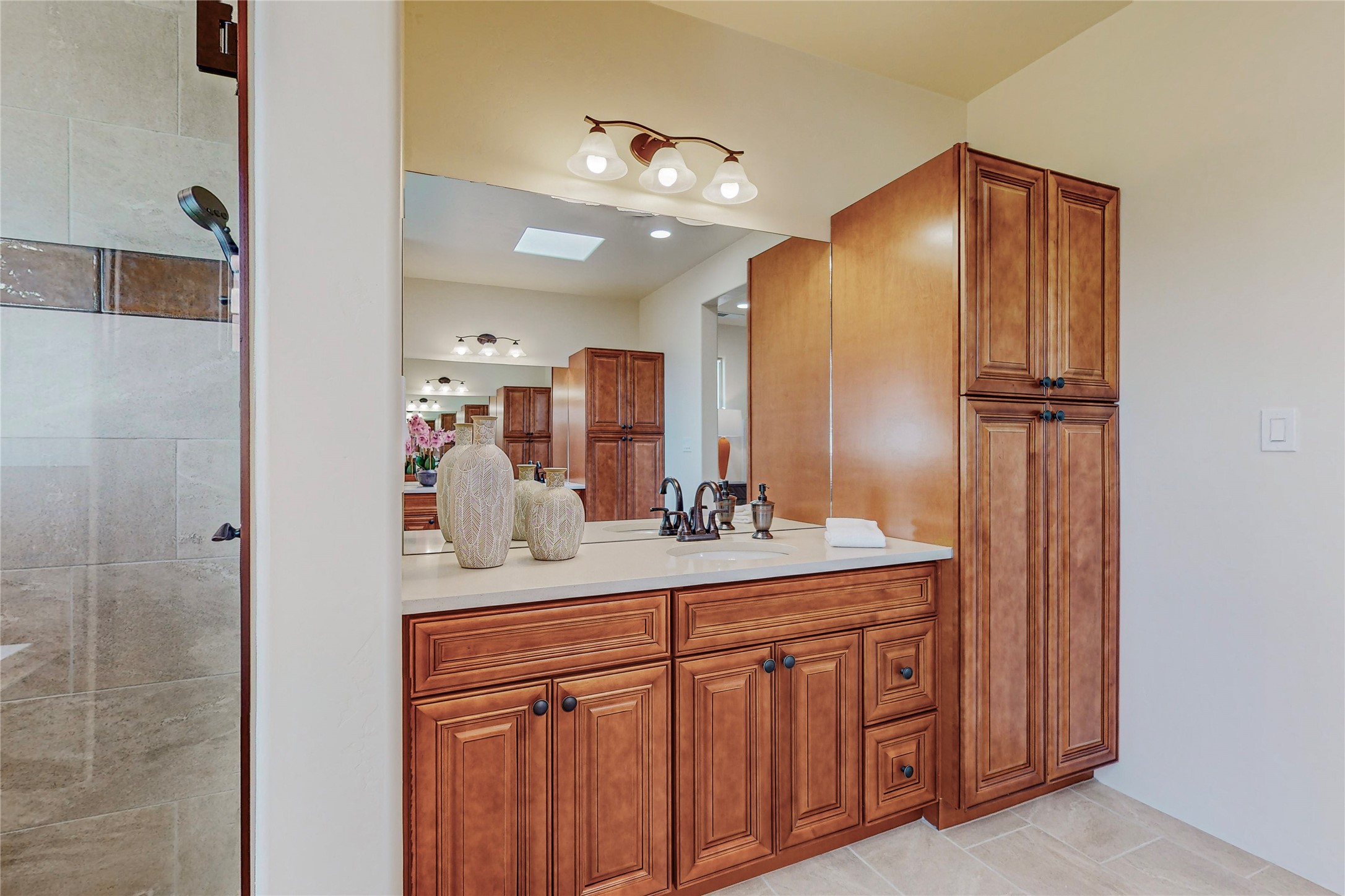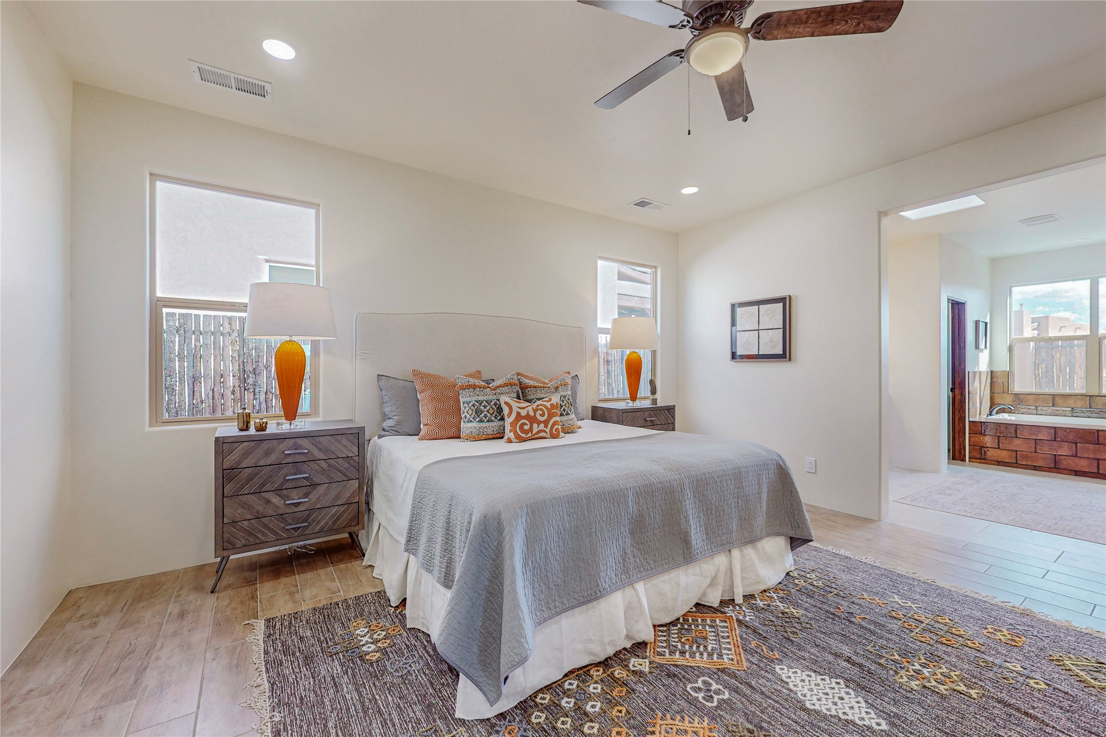 This powerful Santiago Plan is a 2239 sq.ft. 3 bedroom 4 bath home, with three fireplaces, three bedrooms, each with ensuite baths and a 3-car garage. Located at 11 Pinon Doblado in the La Pradera Subdivision, the home has open space on two sides of the home. Access to this home is through an 8 ft tall door which opens into a foyer with a 13-foot boveda ceiling. Immediately to the left is a powder room and an adjacent closet. To the right is a study/bedroom with a gas-fired kiva fireplace and a 3/4 bath. The living room has a 12-foot ceiling, white stained wood beams with T&G trim and a fireplace. The open kitchen has maple cabinets. The kitchen and the guest bedroom open out to a covered portal with a gas fireplace and brick pavers. Floor tile is porcelain plank in a light brown wood-like tone. The owner's suite has an enormous walk-in closet (about 100 sq.ft) and the owner's bath has a skylight, a large walk-in shower with euro-style shower fixtures and an overhead rain shower head. The exterior is a pitched roof Spanish design with clay-concrete tile roofs and covered portals with heavy wood beams and brick pavers. The driveway is a colored stamped concrete design. The insulated three-car garage has two storage closets and an epoxy-coated floor.