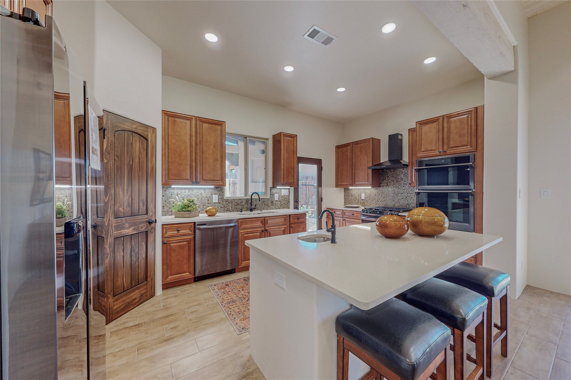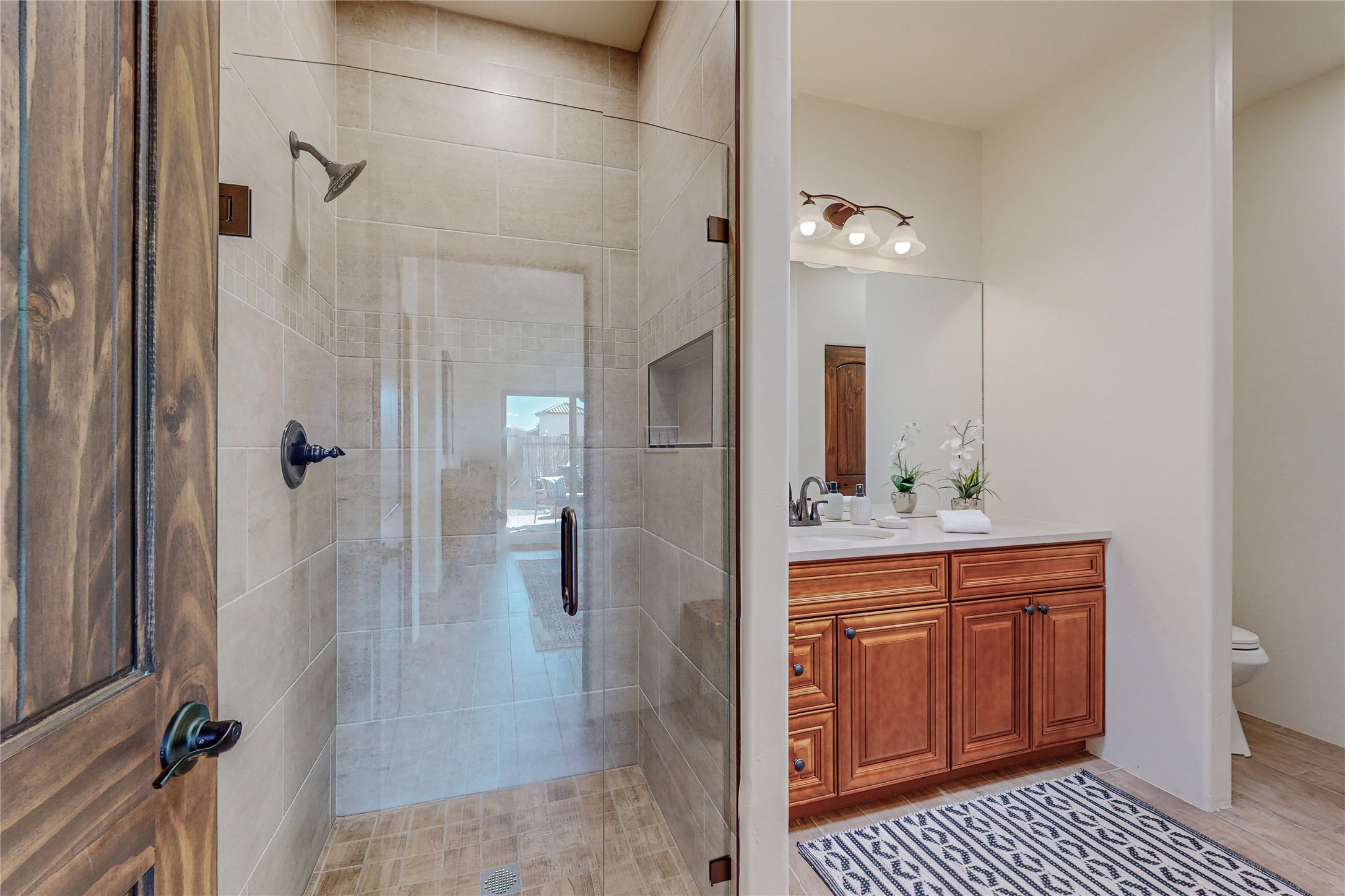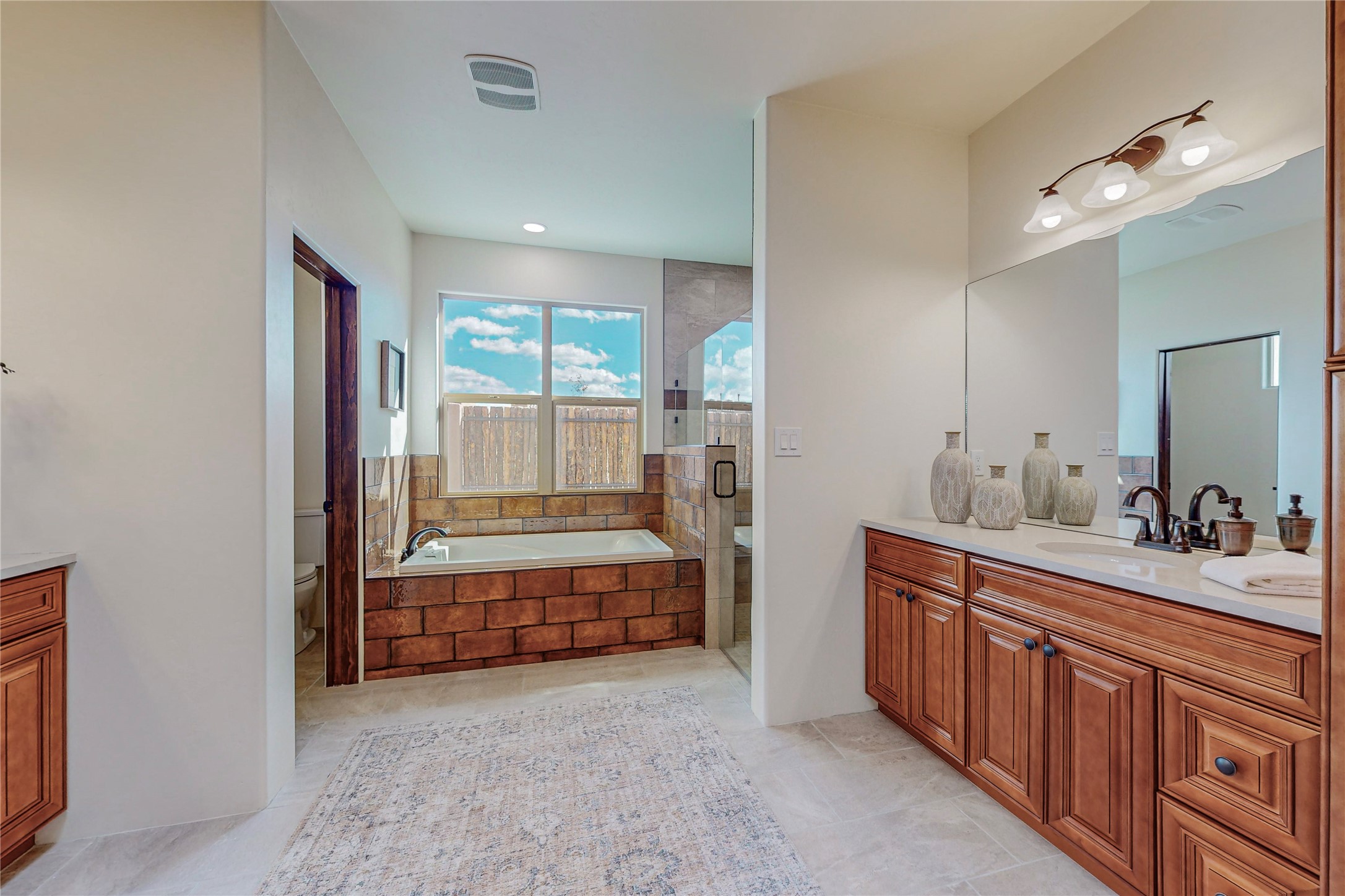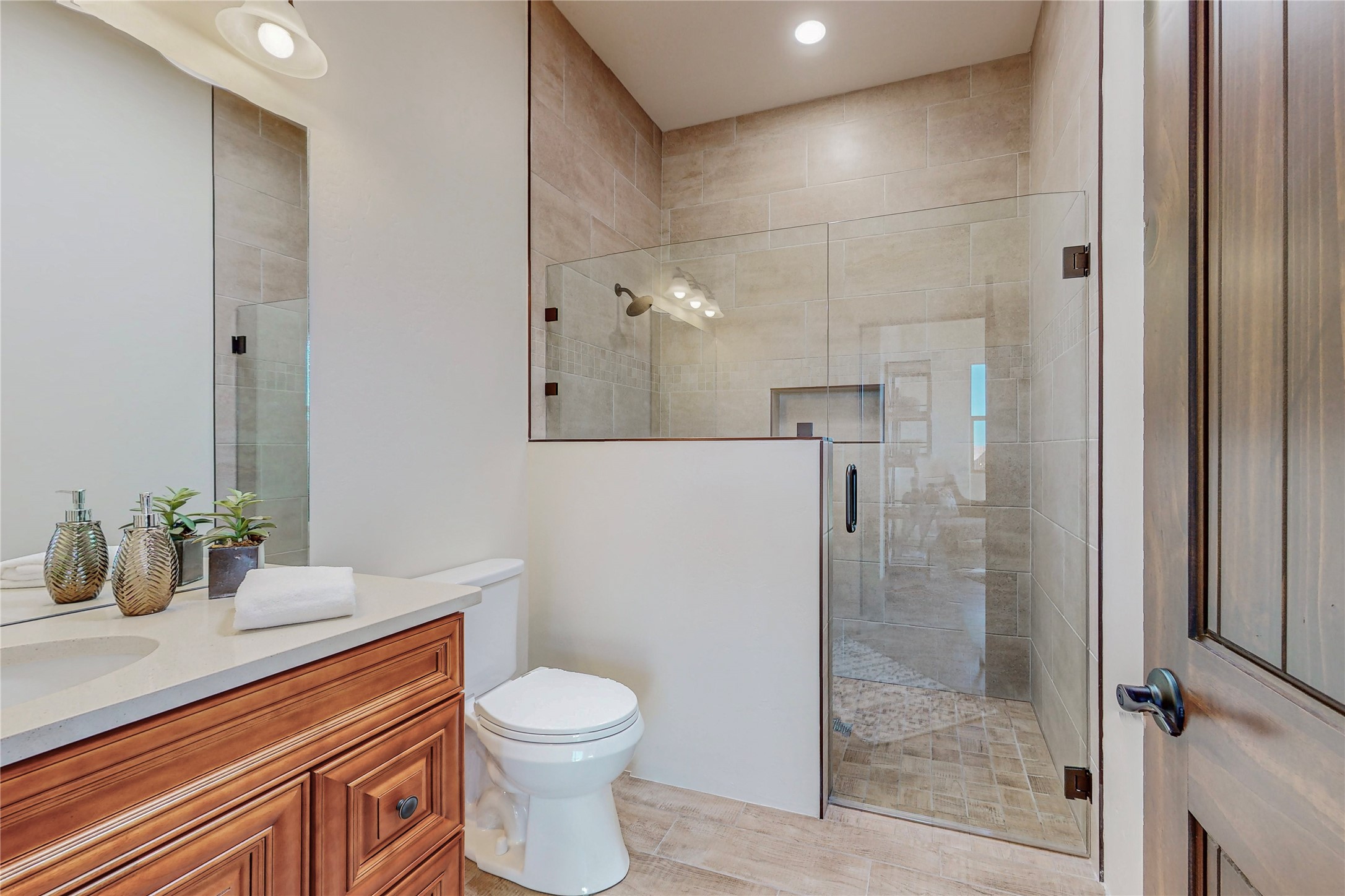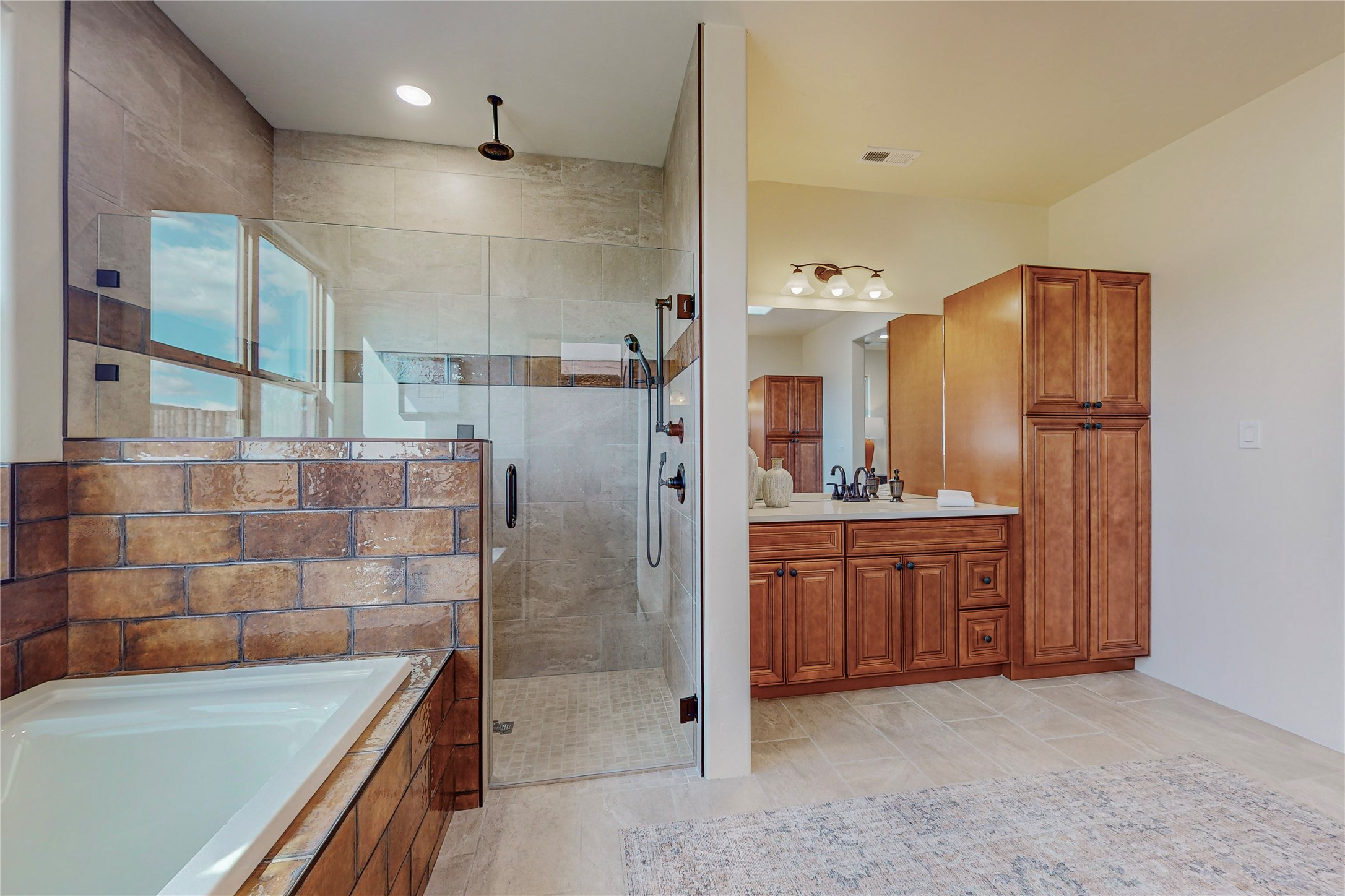 This powerful Santiago Plan is a 2239 sq.ft. 3 bedroom 4 bath home, with three fireplaces, three bedrooms, each with ensuite baths and a 3-car garage. Located at 11 Pinon Doblado in the La Pradera Subdivision, the home has open space on two sides of the home. Access to this home is through an 8 ft tall door which opens into a foyer with a 13-foot boveda ceiling. Immediately to the left is a powder room and an adjacent closet. To the right is a study/bedroom with a gas-fired kiva fireplace and a 3/4 bath. The living room has a 12-foot ceiling, white stained wood beams with T&G trim and a fireplace. The open kitchen has maple cabinets. The kitchen and the guest bedroom open out to a covered portal with a gas fireplace and brick pavers. Floor tile is porcelain plank in a light brown wood-like tone. The owner's suite has an enormous walk-in closet (about 100 sq.ft) and the owner's bath has a skylight, a large walk-in shower with euro-style shower fixtures and an overhead rain shower head. The exterior is a pitched roof Spanish design with clay-concrete tile roofs and covered portals with heavy wood beams and brick pavers. The driveway is a colored stamped concrete design. The insulated three-car garage has two storage closets and an epoxy-coated floor.