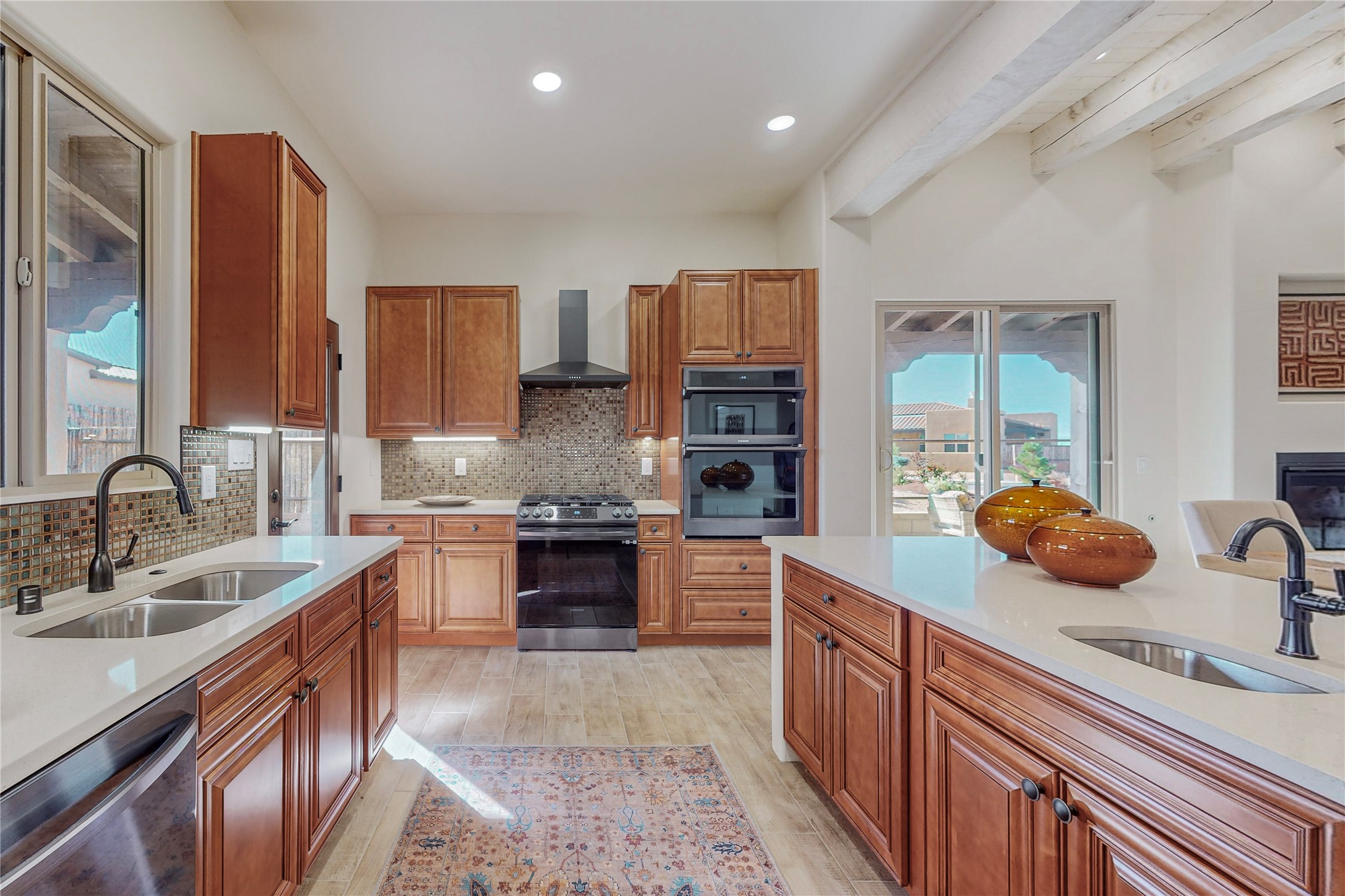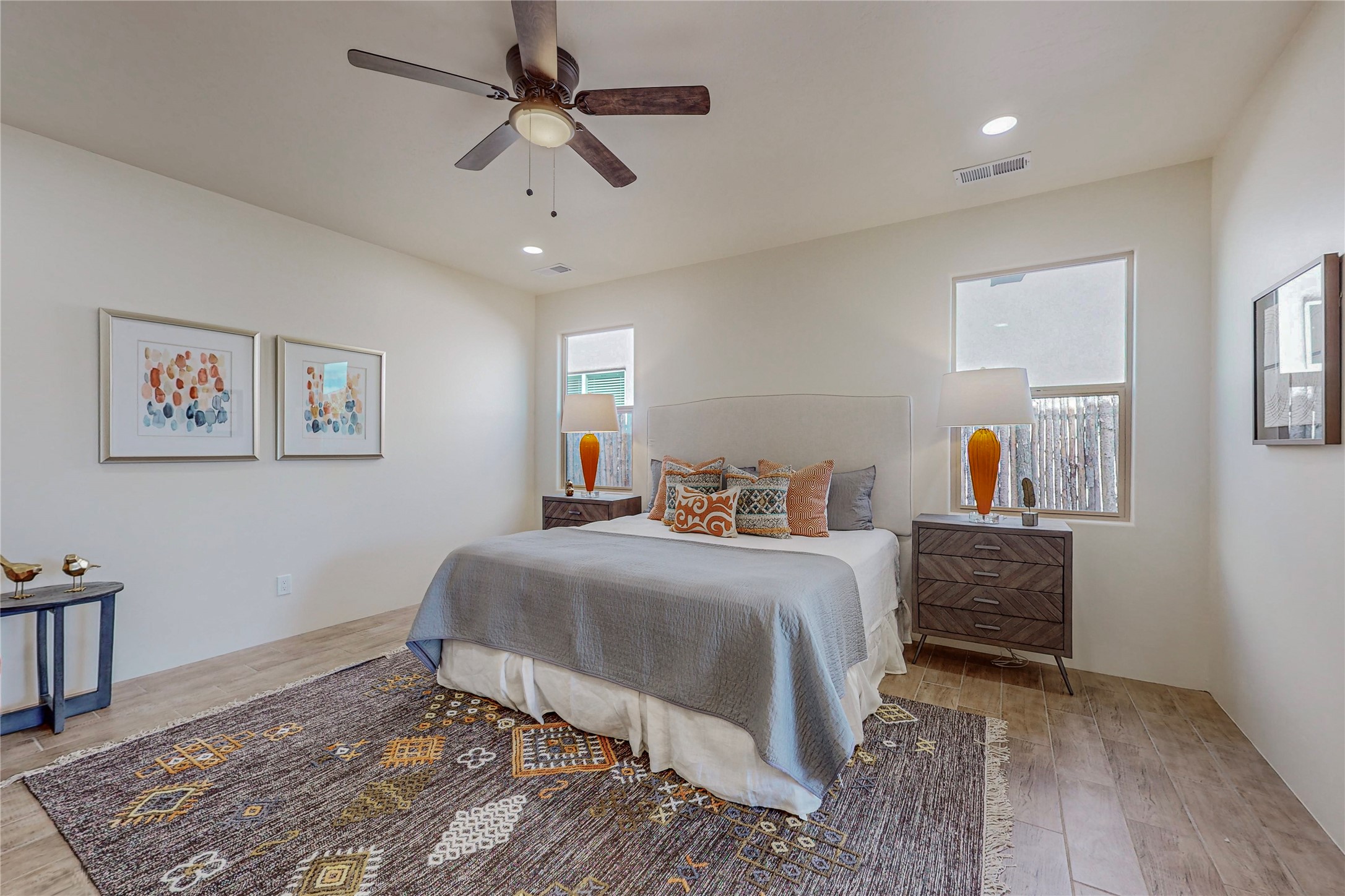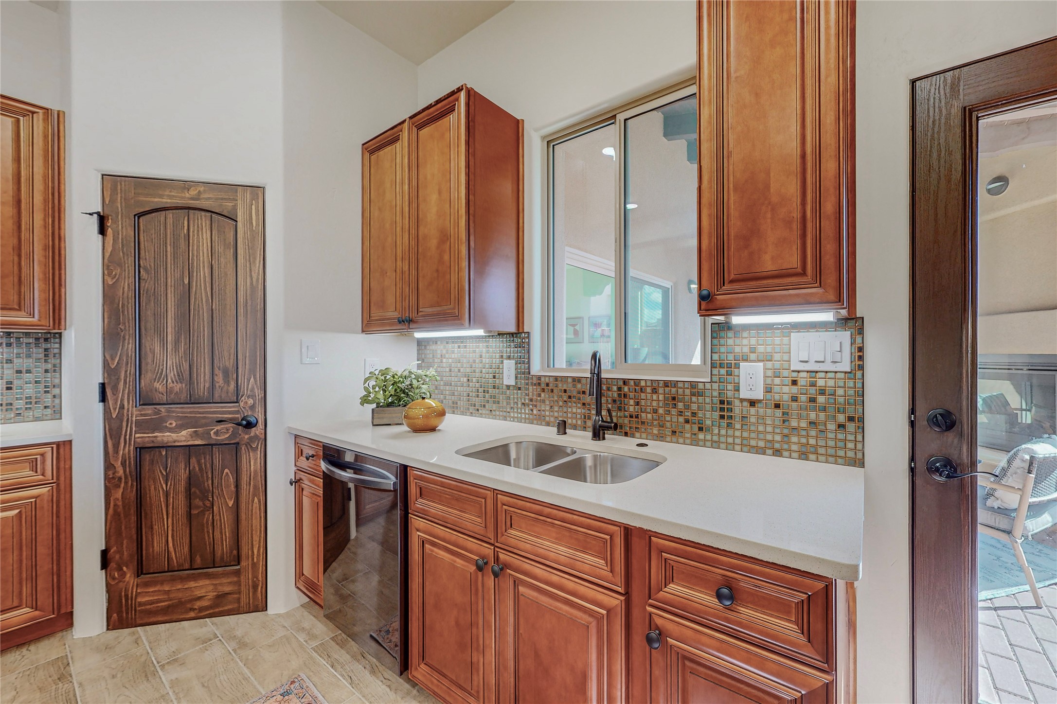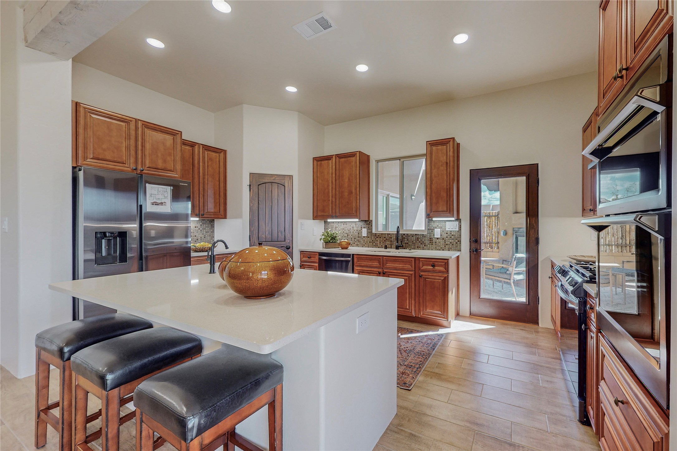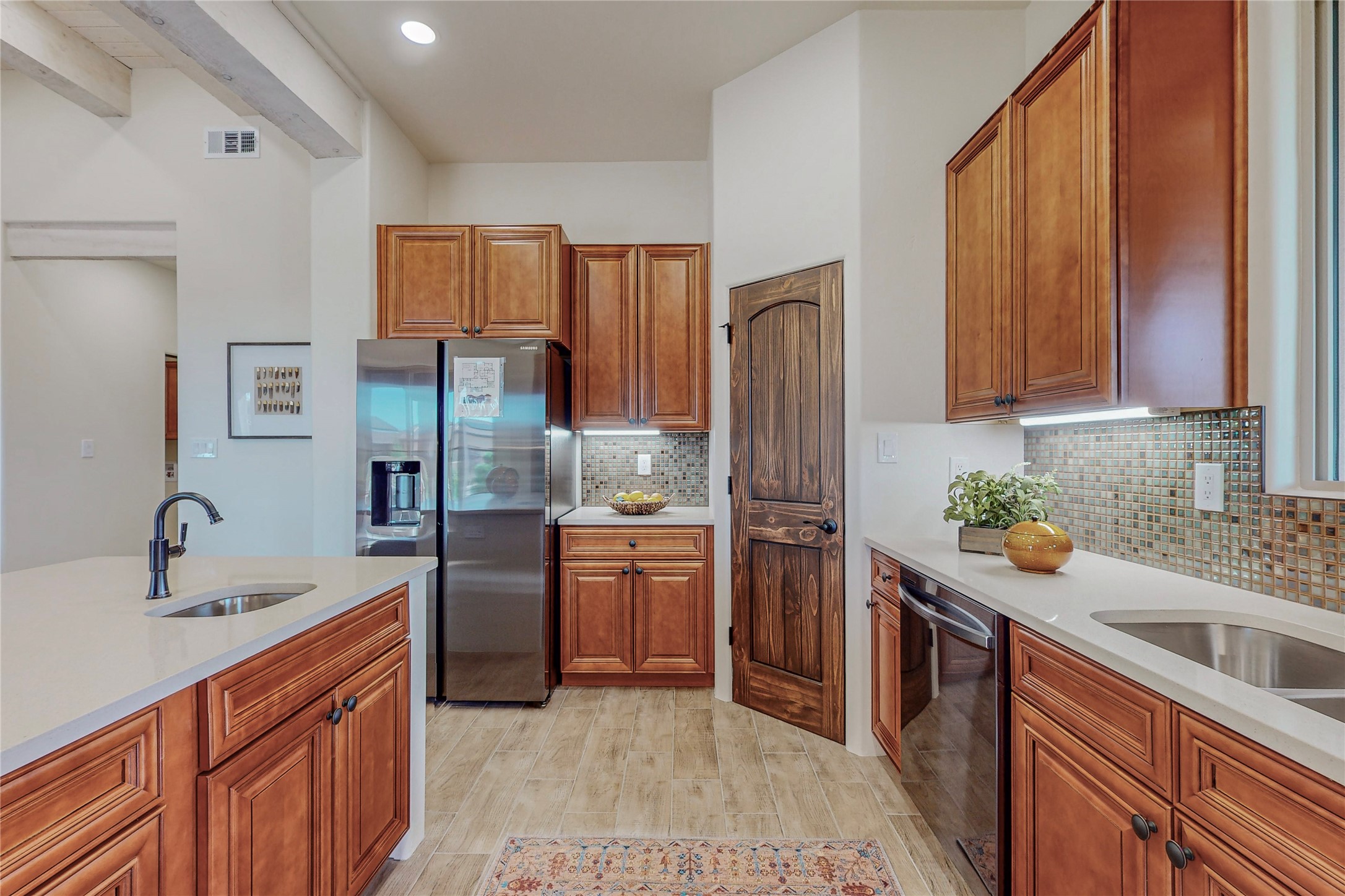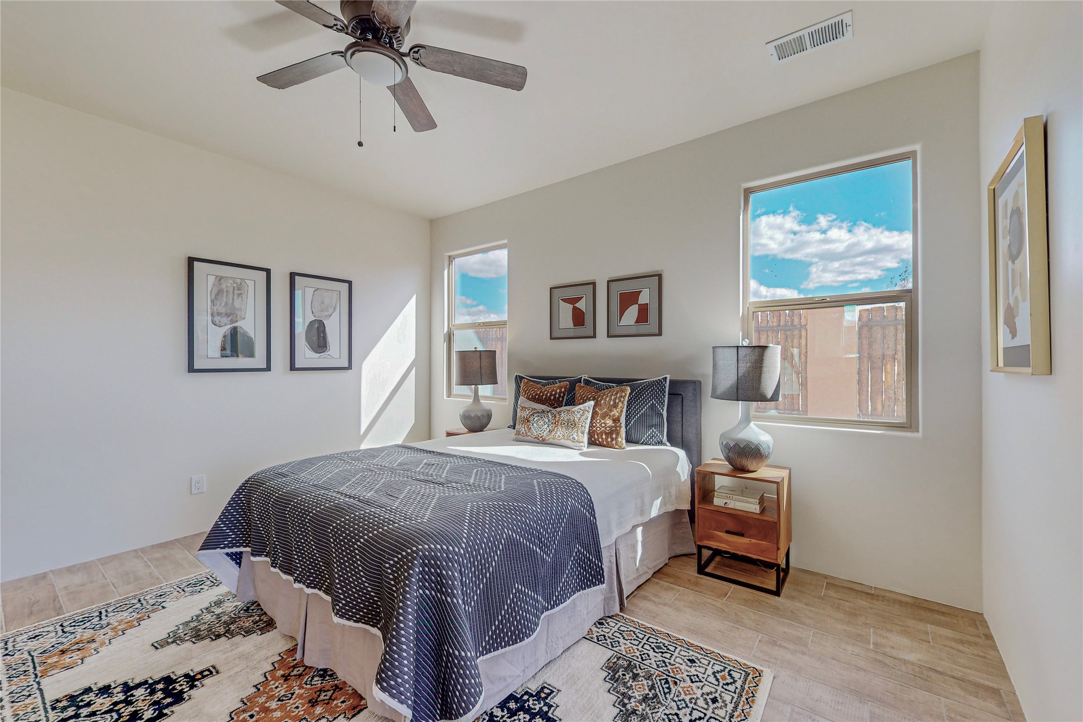 This powerful Santiago Plan is a 2239 sq.ft. 3 bedroom 4 bath home, with three fireplaces, three bedrooms, each with ensuite baths and a 3-car garage. Located at 11 Pinon Doblado in the La Pradera Subdivision, the home has open space on two sides of the home. Access to this home is through an 8 ft tall door which opens into a foyer with a 13-foot boveda ceiling. Immediately to the left is a powder room and an adjacent closet. To the right is a study/bedroom with a gas-fired kiva fireplace and a 3/4 bath. The living room has a 12-foot ceiling, white stained wood beams with T&G trim and a fireplace. The open kitchen has maple cabinets. The kitchen and the guest bedroom open out to a covered portal with a gas fireplace and brick pavers. Floor tile is porcelain plank in a light brown wood-like tone. The owner's suite has an enormous walk-in closet (about 100 sq.ft) and the owner's bath has a skylight, a large walk-in shower with euro-style shower fixtures and an overhead rain shower head. The exterior is a pitched roof Spanish design with clay-concrete tile roofs and covered portals with heavy wood beams and brick pavers. The driveway is a colored stamped concrete design. The insulated three-car garage has two storage closets and an epoxy-coated floor.