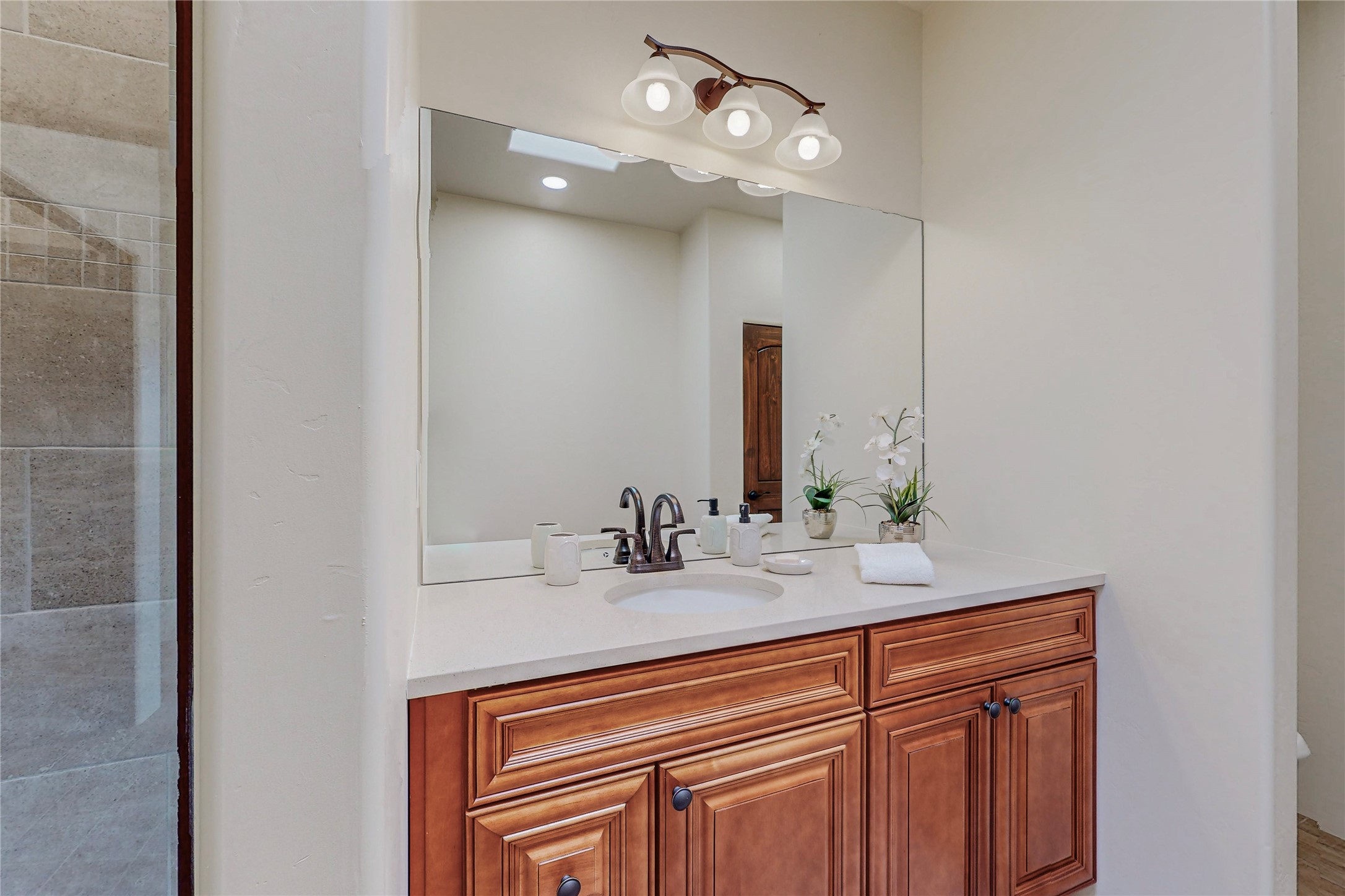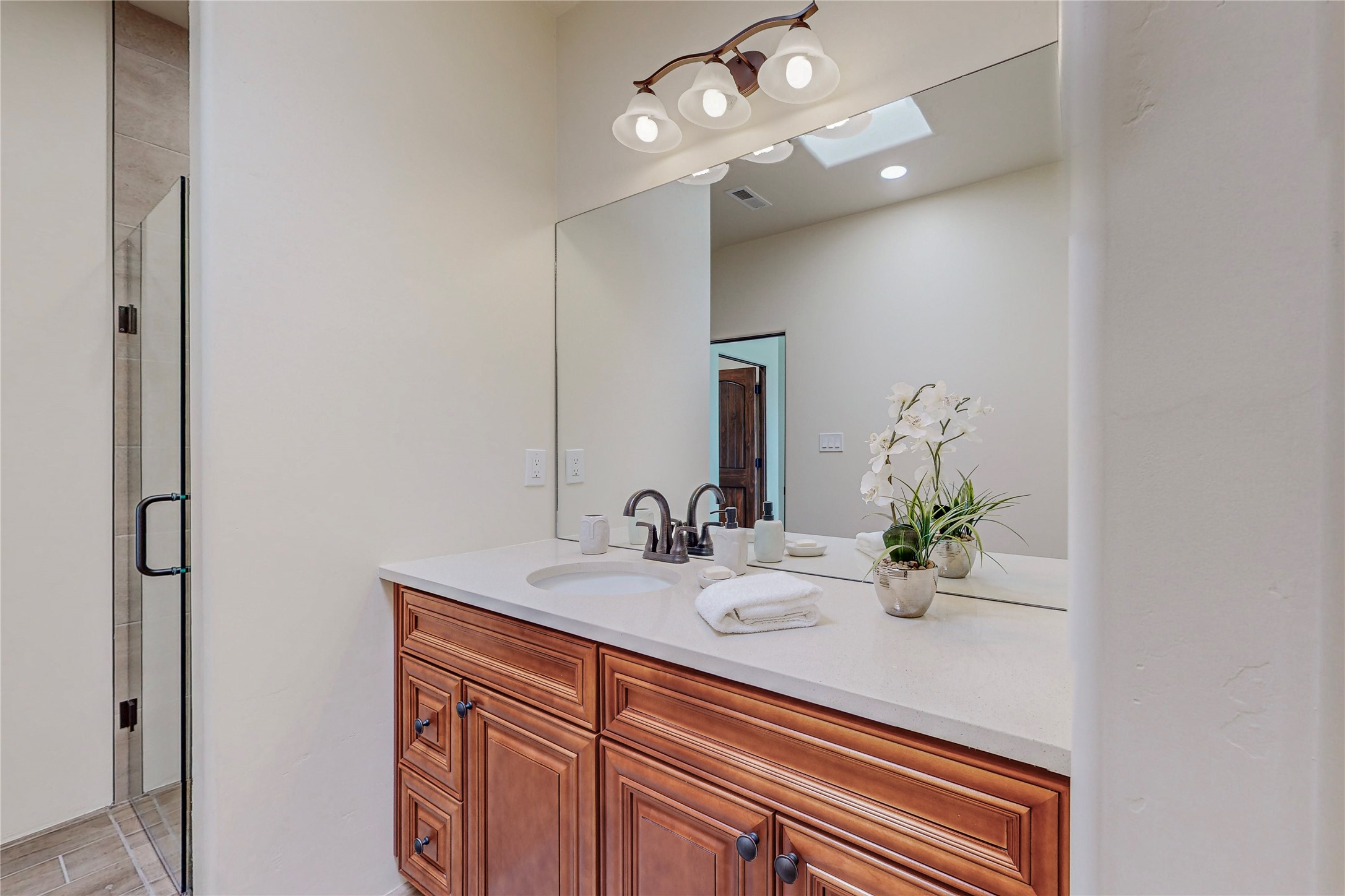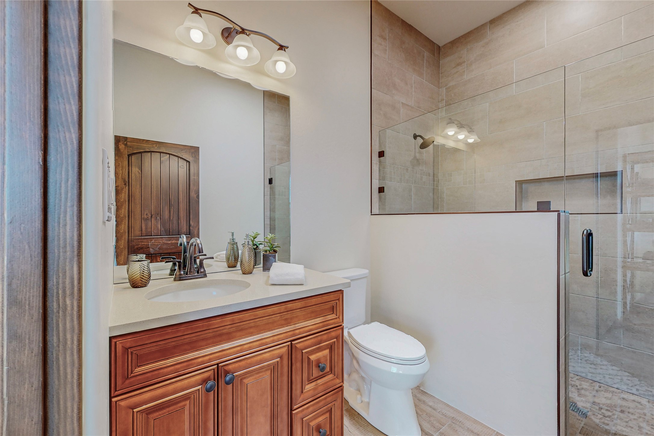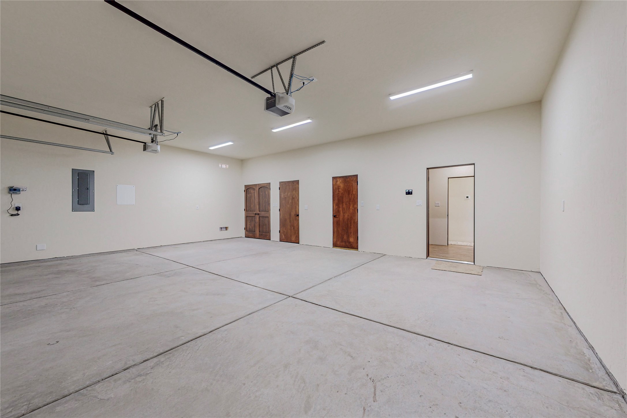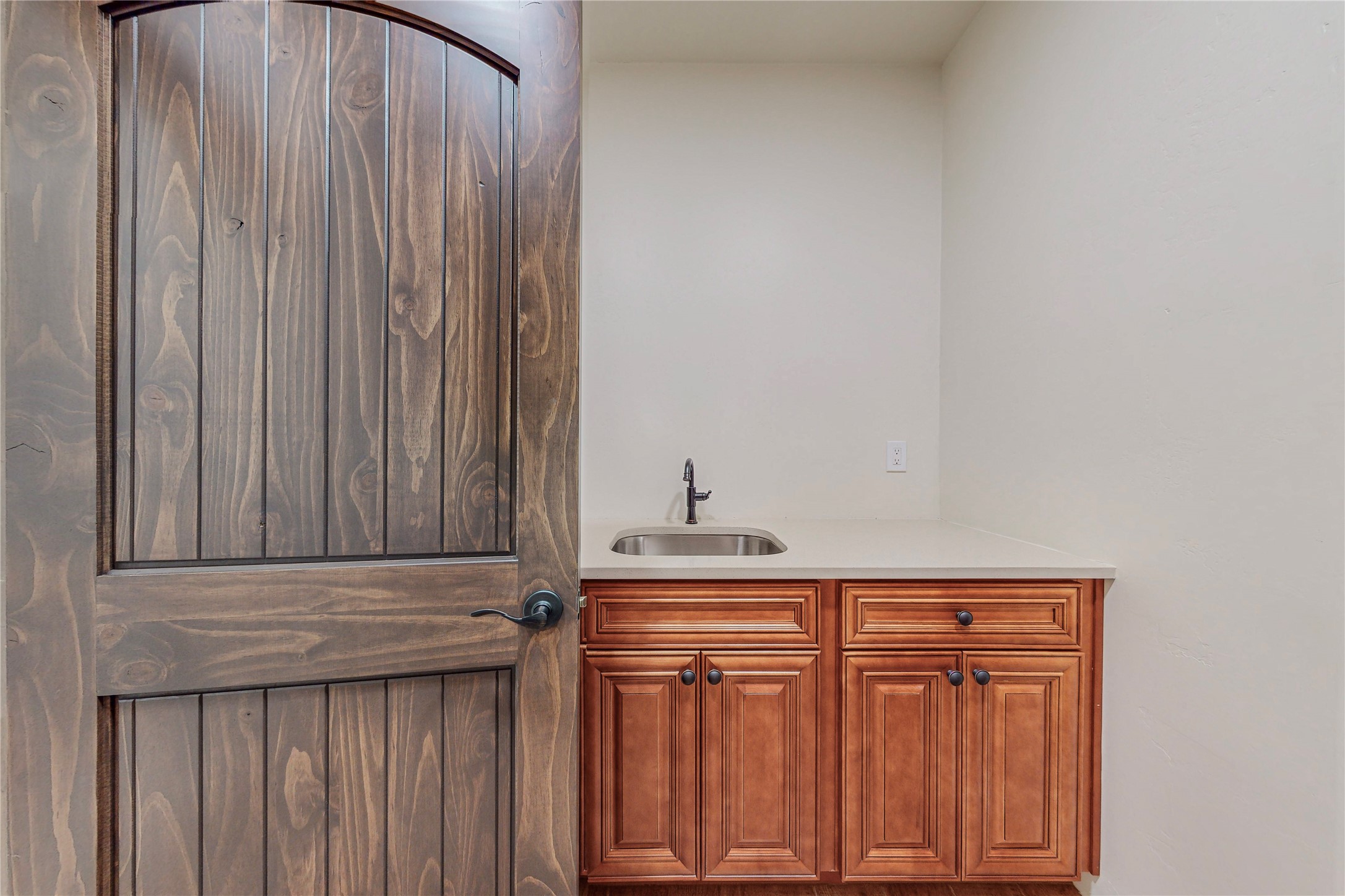 This powerful Santiago Plan is a 2239 sq.ft. 3 bedroom 4 bath home, with three fireplaces, three bedrooms, each with ensuite baths and a 3-car garage. Located at 11 Pinon Doblado in the La Pradera Subdivision, the home has open space on two sides of the home. Access to this home is through an 8 ft tall door which opens into a foyer with a 13-foot boveda ceiling. Immediately to the left is a powder room and an adjacent closet. To the right is a study/bedroom with a gas-fired kiva fireplace and a 3/4 bath. The living room has a 12-foot ceiling, white stained wood beams with T&G trim and a fireplace. The open kitchen has maple cabinets. The kitchen and the guest bedroom open out to a covered portal with a gas fireplace and brick pavers. Floor tile is porcelain plank in a light brown wood-like tone. The owner's suite has an enormous walk-in closet (about 100 sq.ft) and the owner's bath has a skylight, a large walk-in shower with euro-style shower fixtures and an overhead rain shower head. The exterior is a pitched roof Spanish design with clay-concrete tile roofs and covered portals with heavy wood beams and brick pavers. The driveway is a colored stamped concrete design. The insulated three-car garage has two storage closets and an epoxy-coated floor.