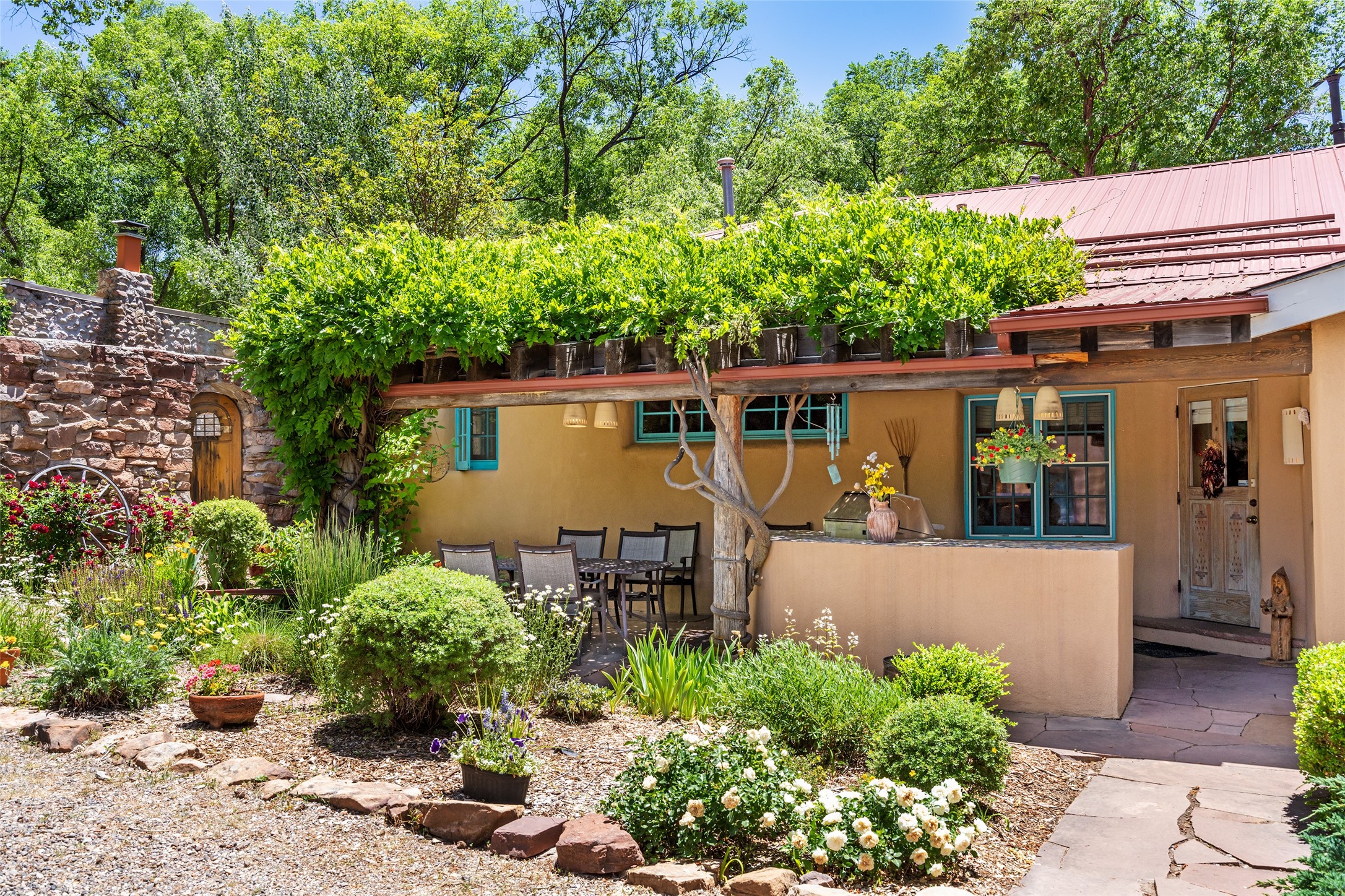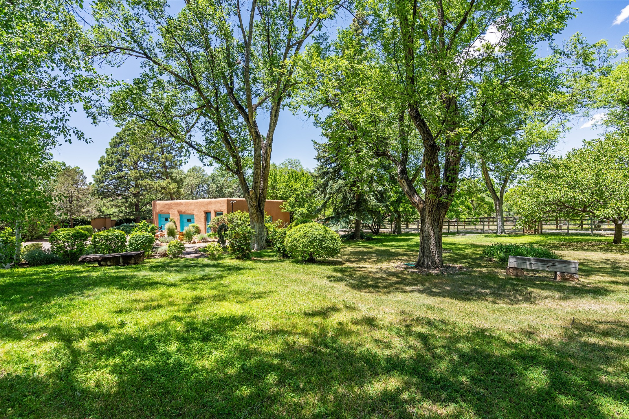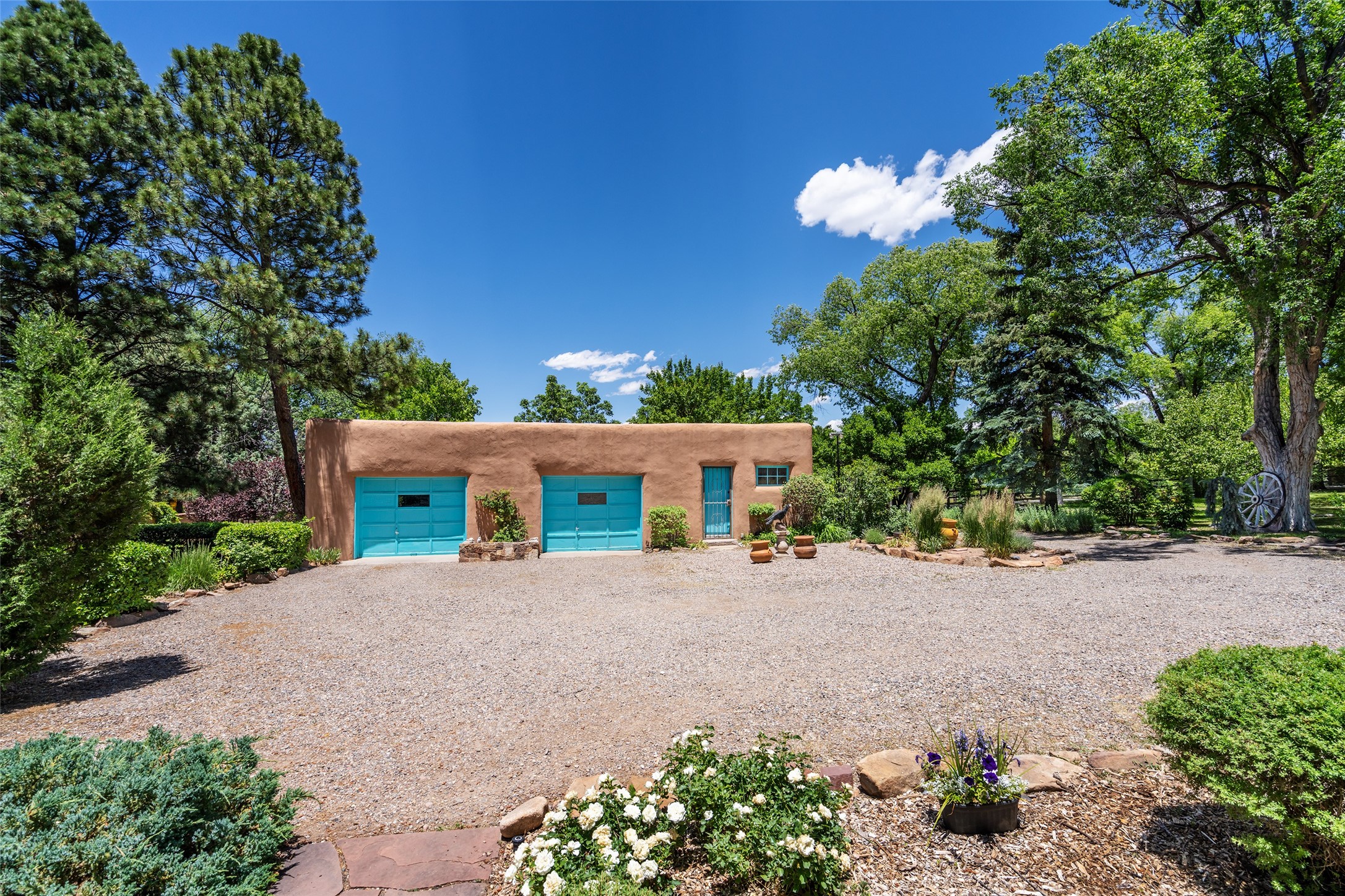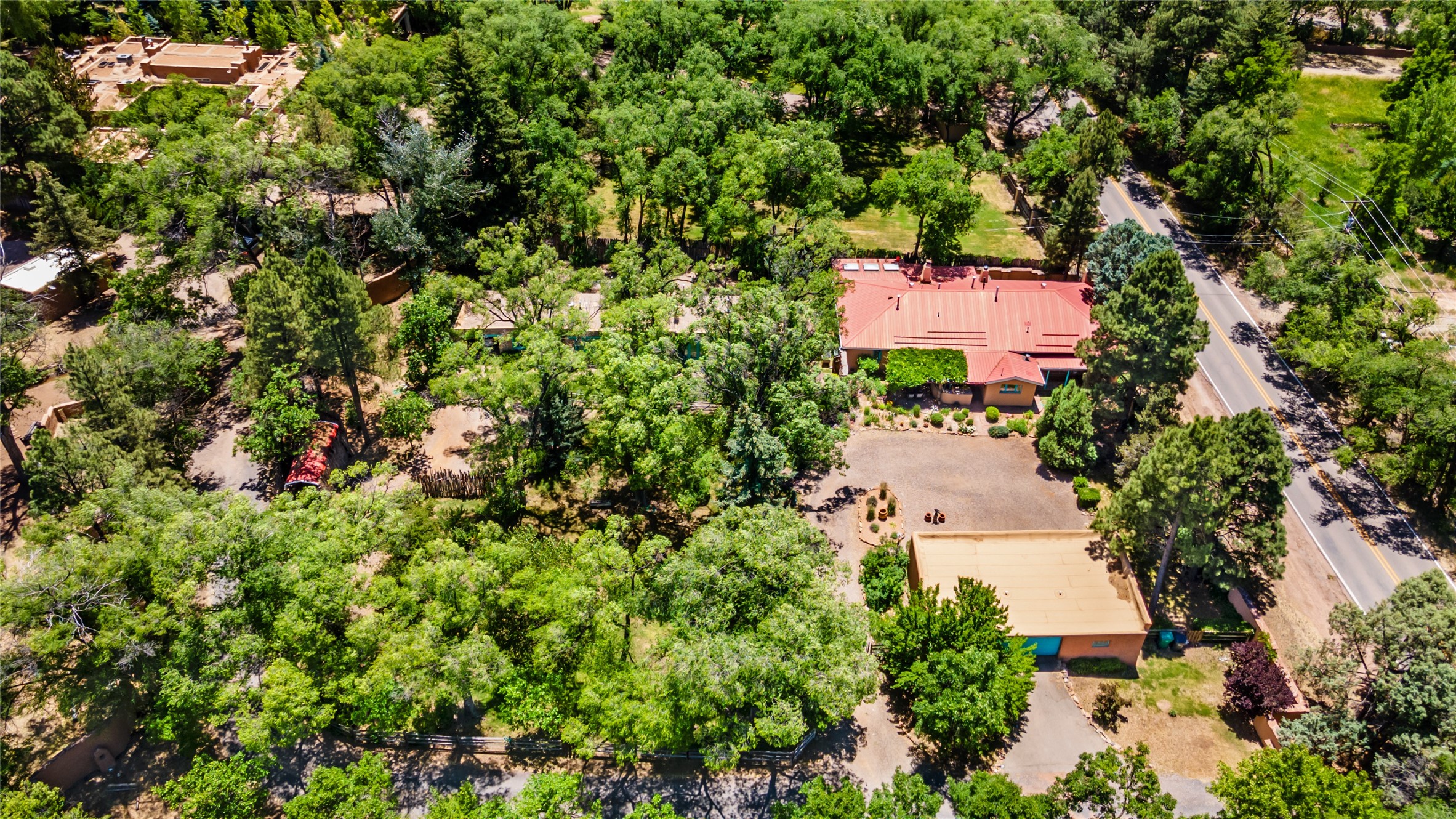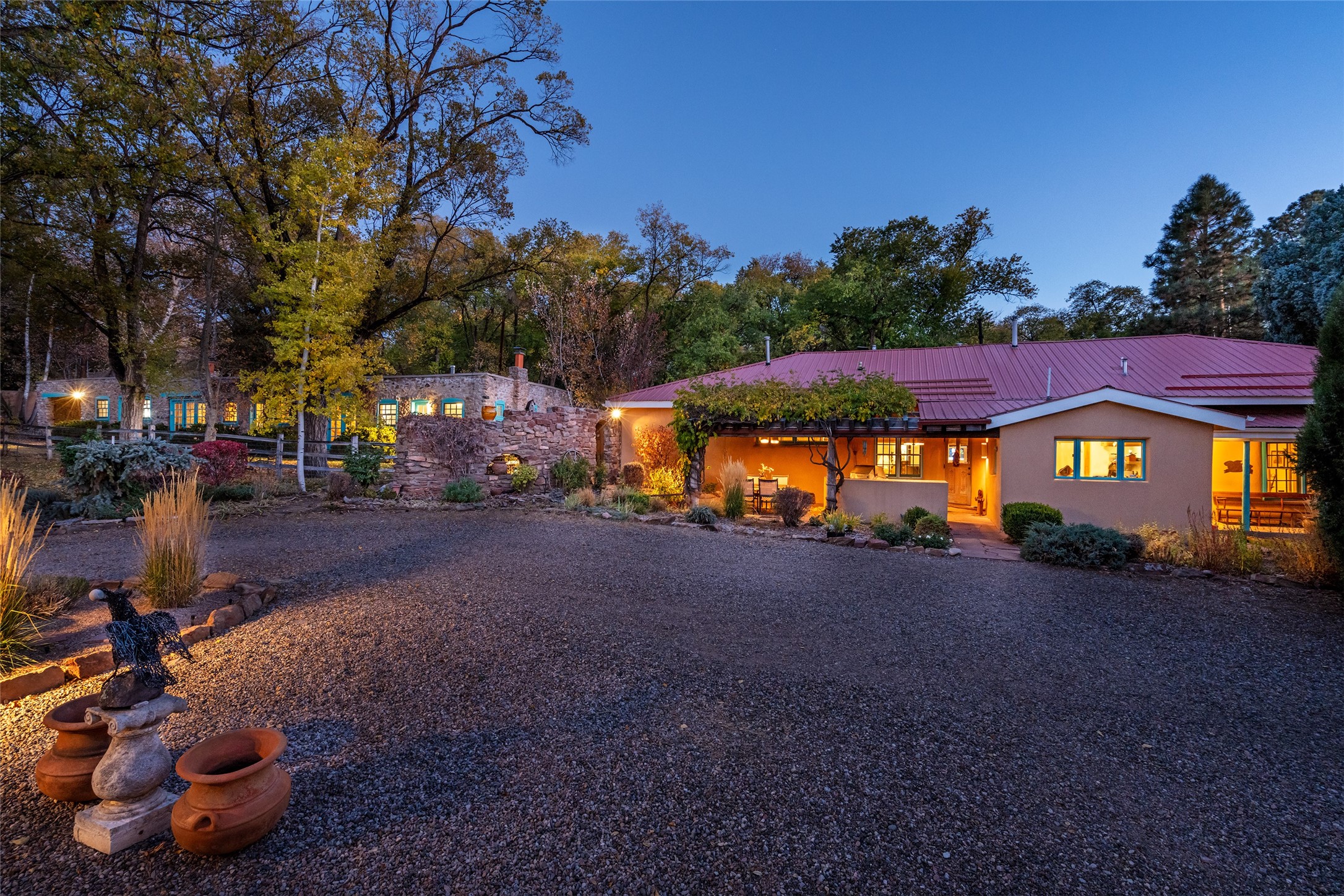 Historic Tesuque property with water rights, a New Mexico dream! Experience what used to be the community hub of Tesuque Village, home to the post office, market, small cottage motel, service station and residence of the postmistress and proprietor.All businesses have long since relocated. The main structure was converted into a private home and the motel into a casita with 2 independent guest apartments, all on 2 lots totaling 1.8 acres. The 3 bedroom, 2 bath double adobe main home features 2 kiva fireplaces in the main living room with a third stone fireplace in the primary bedroom. Traditional viga and cove ceilings decorate the main shared living spaces, with beam and plank ceilings in the halls, bedrooms, bath and sitting rooms. Built-in shelving and multiple closets offer ample storage. The charm continues with custom cabinetry and tin detailing in the kitchen. Also included are unique details such as a dugout for mechanics beneath the floor of the garage, once the Sinclair Service Station, and an outdoor bar with built-in grill. The guest apartments were previously the Modern Cottage Court Motel, a picturesque stone structure. The first apartment has potential for 2 bedrooms or a bedroom and flex space, 1 bath, a full kitchen, 2 fireplaces, an enclosed parking space, and beautiful stonework, all local river rock. The second is a charming studio with a kitchenette and fireplace.The home's character is amplified by the incredible gardens, tree canopy and mature fruit trees. The separate lot is a conservation easement offering additional space to enjoy. Modern updates include forced air heating, a tankless water heater, and an upgraded laundry room in the main house, and a newer roof on the guest house and garage. This special property includes 3 wells and surface water acequia rights. Experience this one-of-a-kind landmark today!