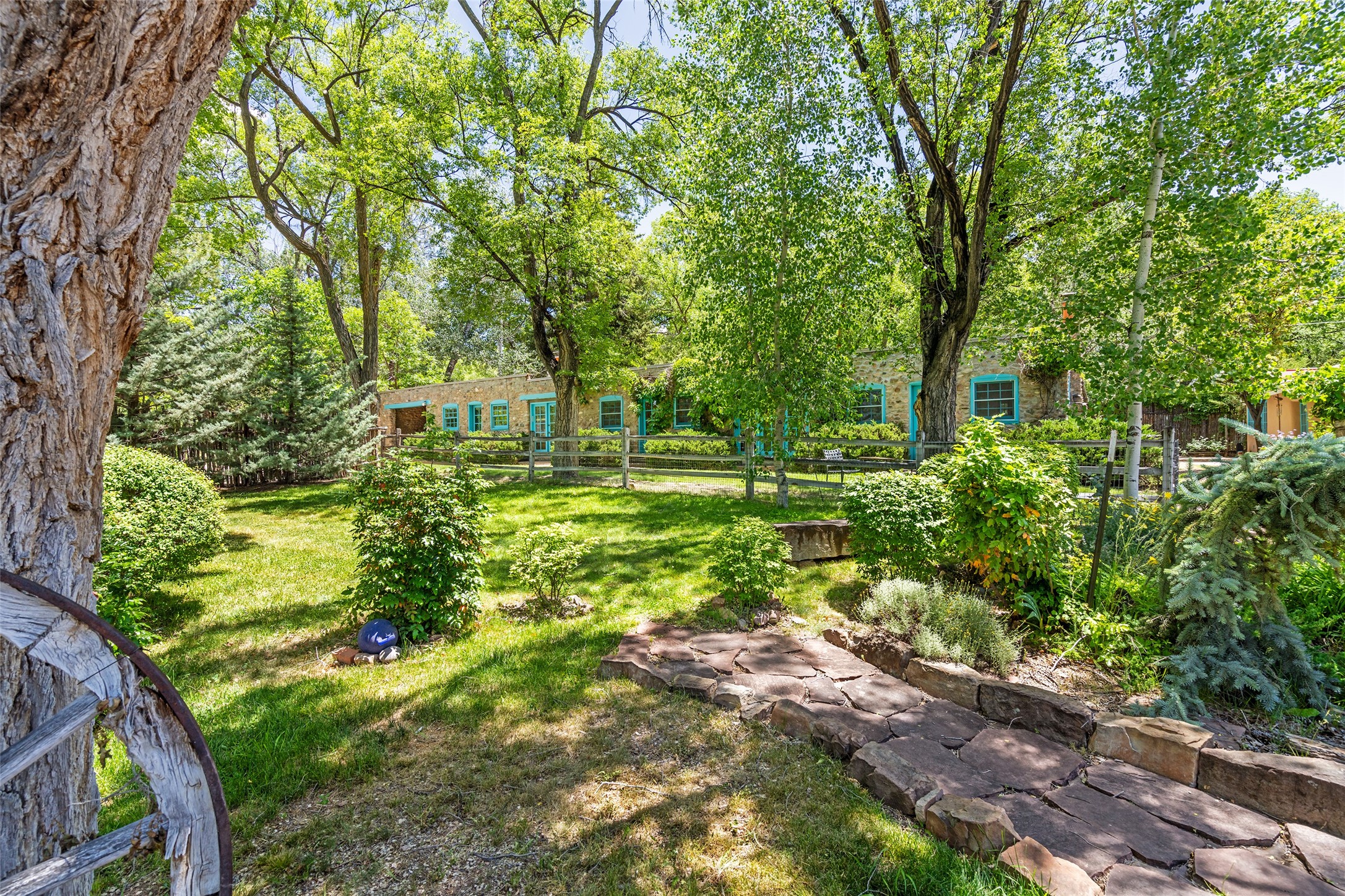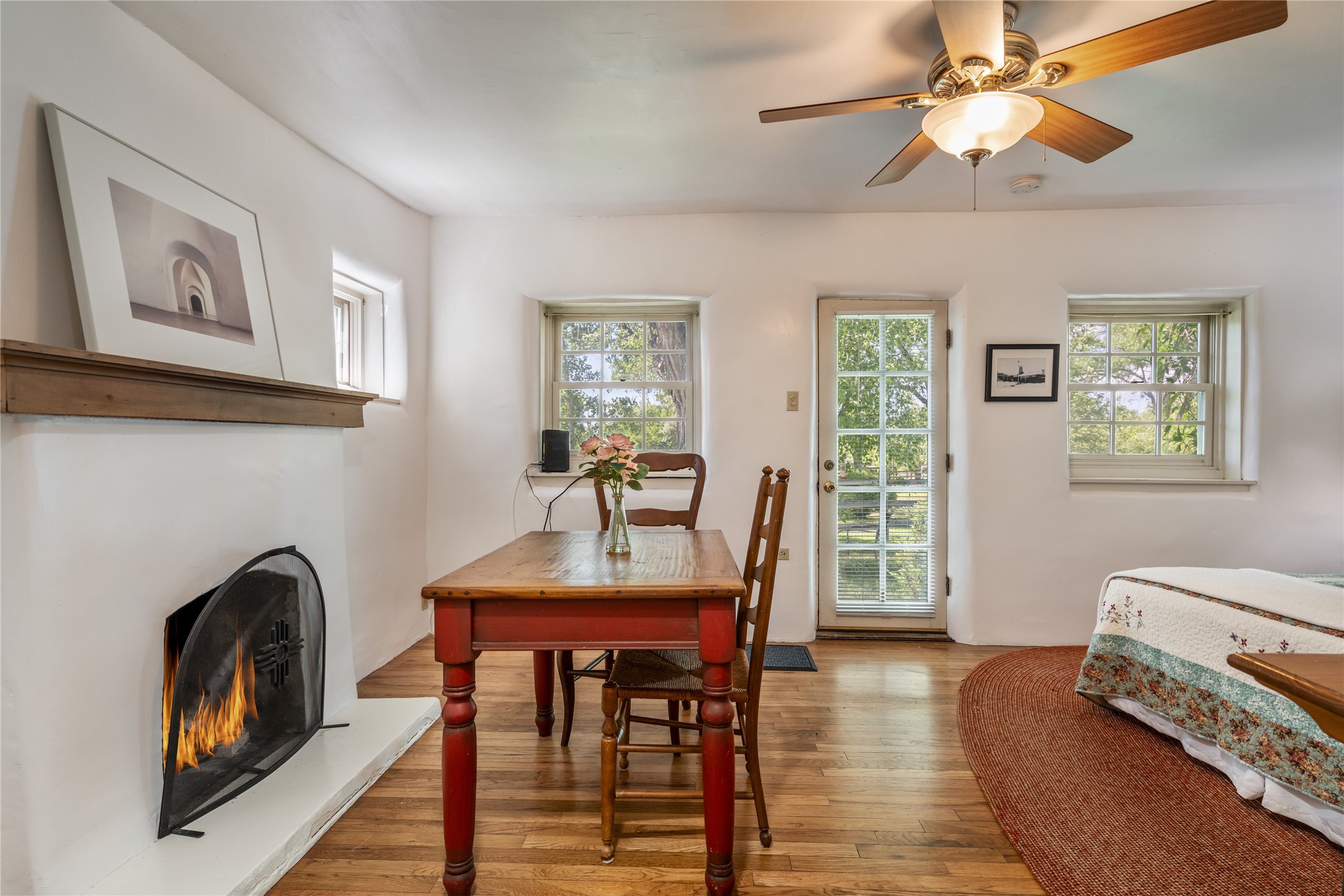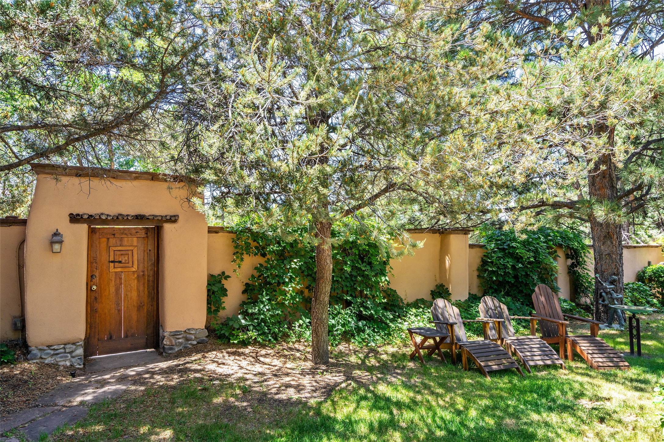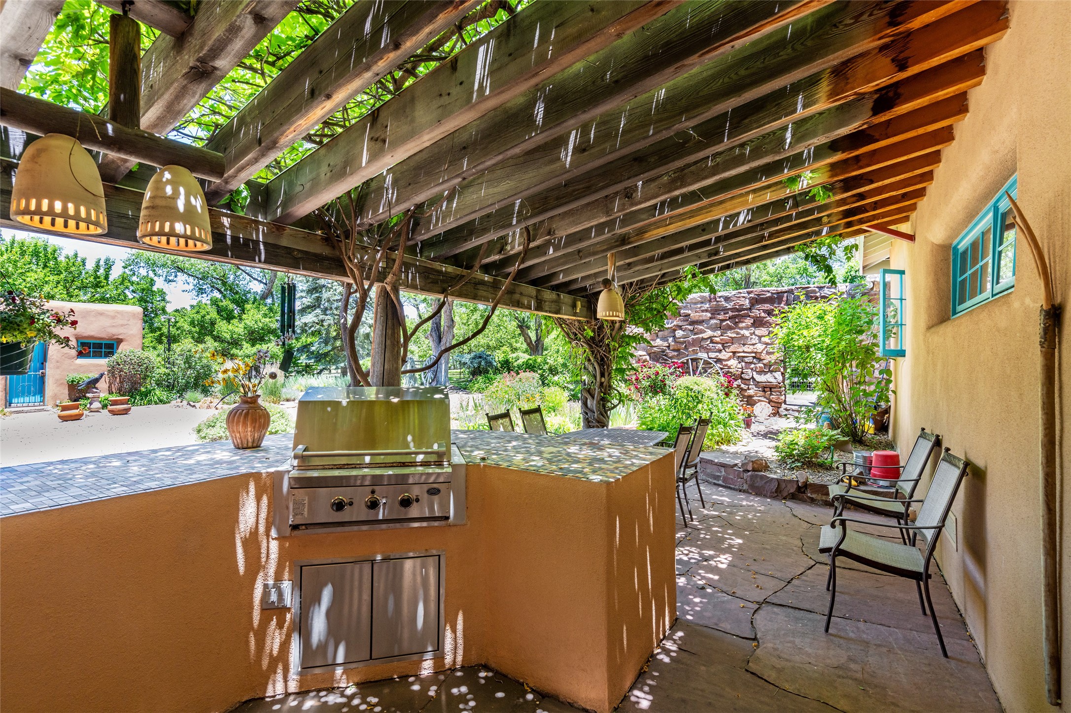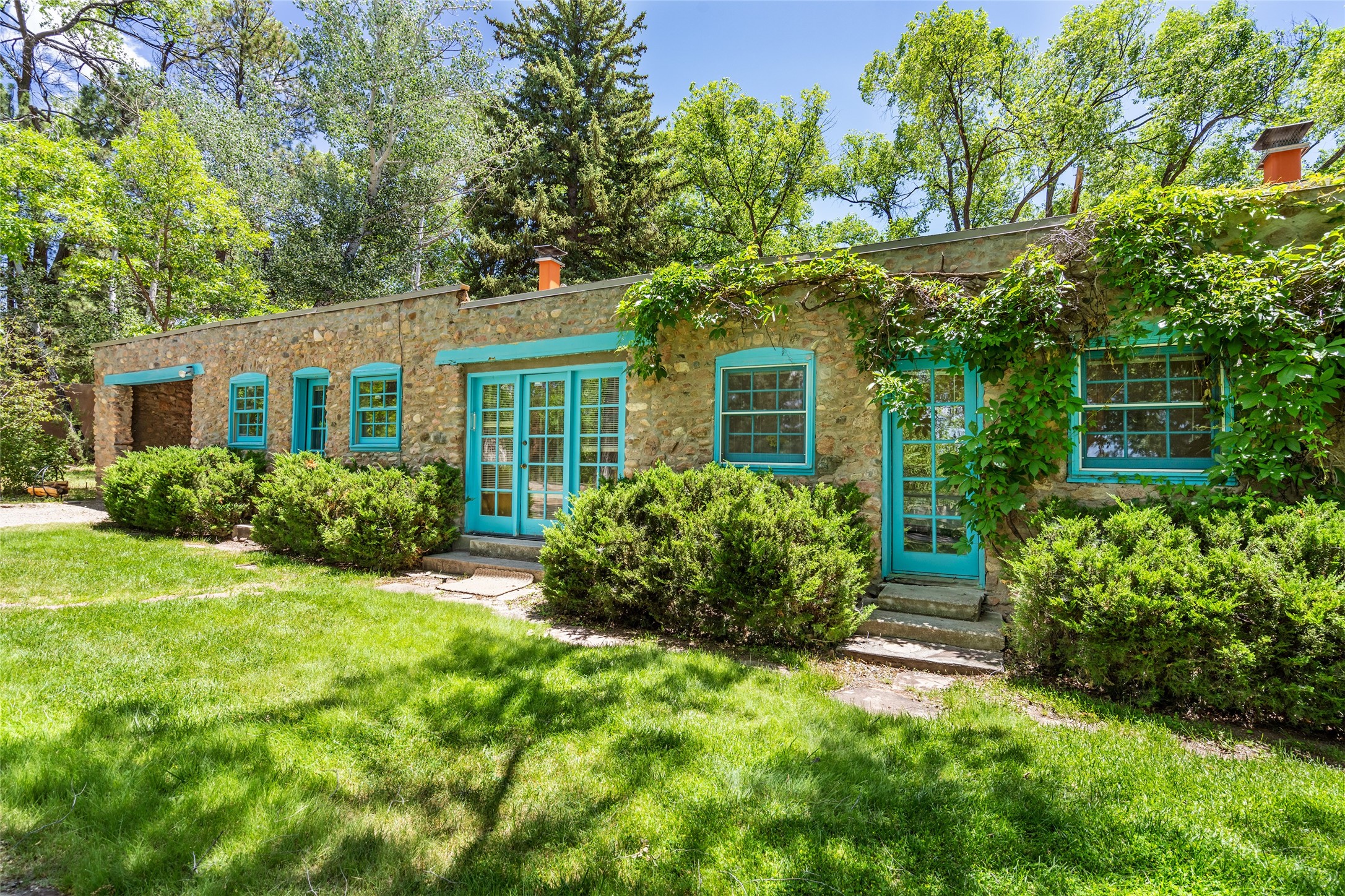 Historic Tesuque property with water rights, a New Mexico dream! Experience what used to be the community hub of Tesuque Village, home to the post office, market, small cottage motel, service station and residence of the postmistress and proprietor.All businesses have long since relocated. The main structure was converted into a private home and the motel into a casita with 2 independent guest apartments, all on 2 lots totaling 1.8 acres. The 3 bedroom, 2 bath double adobe main home features 2 kiva fireplaces in the main living room with a third stone fireplace in the primary bedroom. Traditional viga and cove ceilings decorate the main shared living spaces, with beam and plank ceilings in the halls, bedrooms, bath and sitting rooms. Built-in shelving and multiple closets offer ample storage. The charm continues with custom cabinetry and tin detailing in the kitchen. Also included are unique details such as a dugout for mechanics beneath the floor of the garage, once the Sinclair Service Station, and an outdoor bar with built-in grill. The guest apartments were previously the Modern Cottage Court Motel, a picturesque stone structure. The first apartment has potential for 2 bedrooms or a bedroom and flex space, 1 bath, a full kitchen, 2 fireplaces, an enclosed parking space, and beautiful stonework, all local river rock. The second is a charming studio with a kitchenette and fireplace.The home's character is amplified by the incredible gardens, tree canopy and mature fruit trees. The separate lot is a conservation easement offering additional space to enjoy. Modern updates include forced air heating, a tankless water heater, and an upgraded laundry room in the main house, and a newer roof on the guest house and garage. This special property includes 3 wells and surface water acequia rights. Experience this one-of-a-kind landmark today!