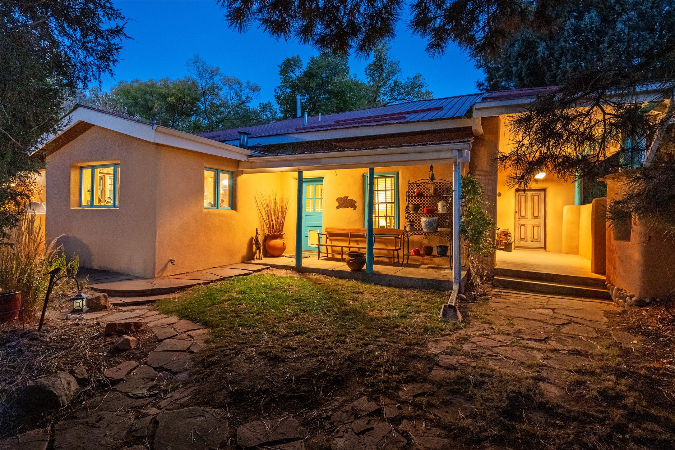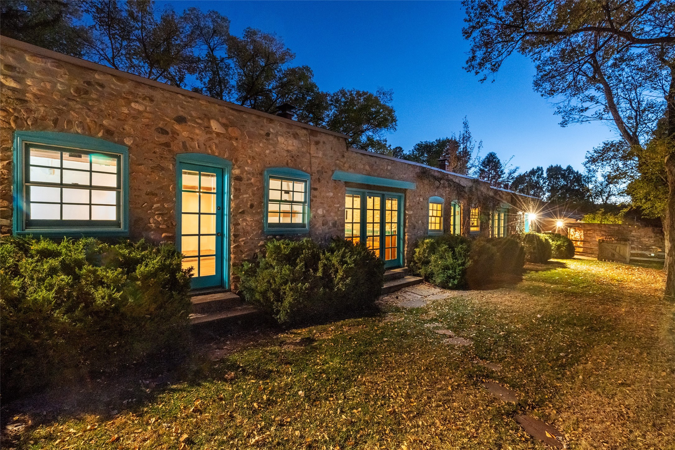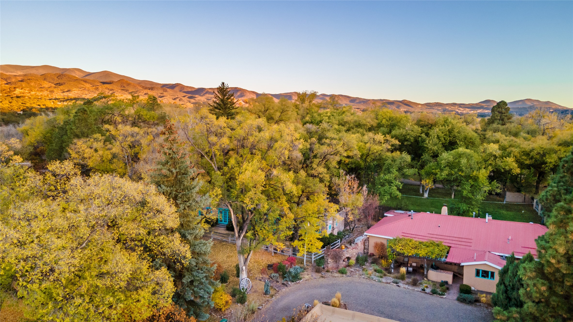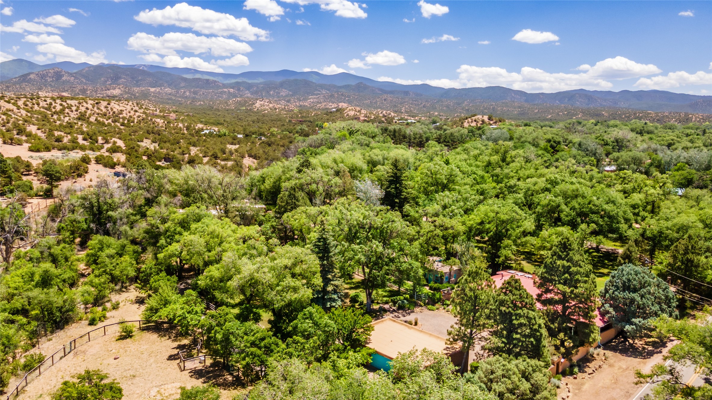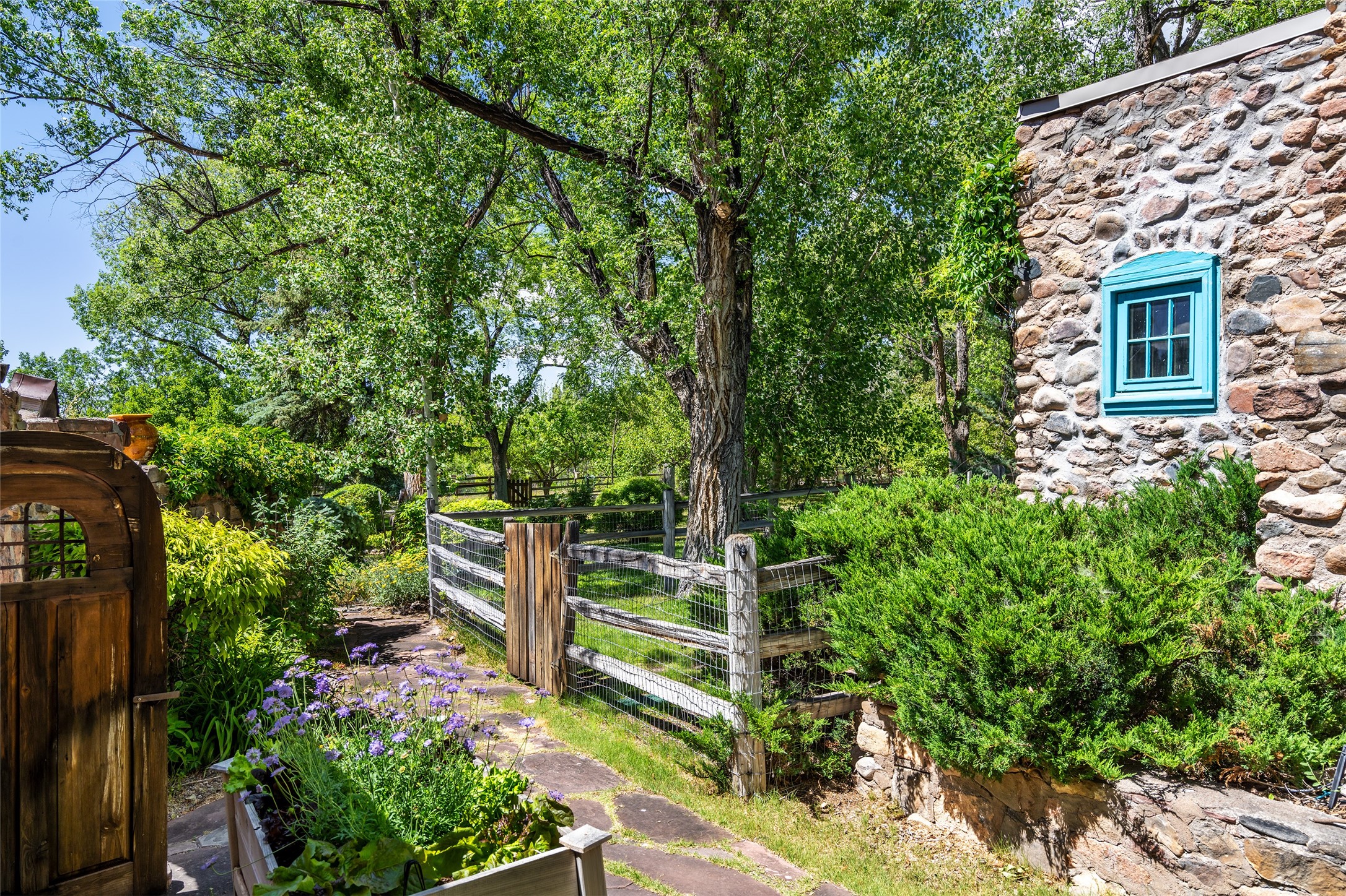 Historic Tesuque property with water rights, a New Mexico dream! Experience what used to be the community hub of Tesuque Village, home to the post office, market, small cottage motel, service station and residence of the postmistress and proprietor.All businesses have long since relocated. The main structure was converted into a private home and the motel into a casita with 2 independent guest apartments, all on 2 lots totaling 1.8 acres. The 3 bedroom, 2 bath double adobe main home features 2 kiva fireplaces in the main living room with a third stone fireplace in the primary bedroom. Traditional viga and cove ceilings decorate the main shared living spaces, with beam and plank ceilings in the halls, bedrooms, bath and sitting rooms. Built-in shelving and multiple closets offer ample storage. The charm continues with custom cabinetry and tin detailing in the kitchen. Also included are unique details such as a dugout for mechanics beneath the floor of the garage, once the Sinclair Service Station, and an outdoor bar with built-in grill. The guest apartments were previously the Modern Cottage Court Motel, a picturesque stone structure. The first apartment has potential for 2 bedrooms or a bedroom and flex space, 1 bath, a full kitchen, 2 fireplaces, an enclosed parking space, and beautiful stonework, all local river rock. The second is a charming studio with a kitchenette and fireplace.The home's character is amplified by the incredible gardens, tree canopy and mature fruit trees. The separate lot is a conservation easement offering additional space to enjoy. Modern updates include forced air heating, a tankless water heater, and an upgraded laundry room in the main house, and a newer roof on the guest house and garage. This special property includes 3 wells and surface water acequia rights. Experience this one-of-a-kind landmark today!