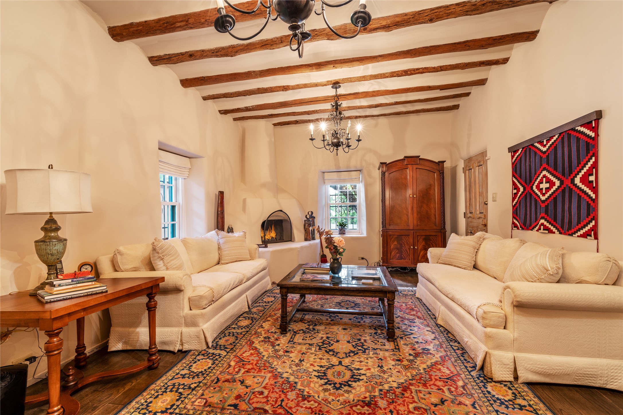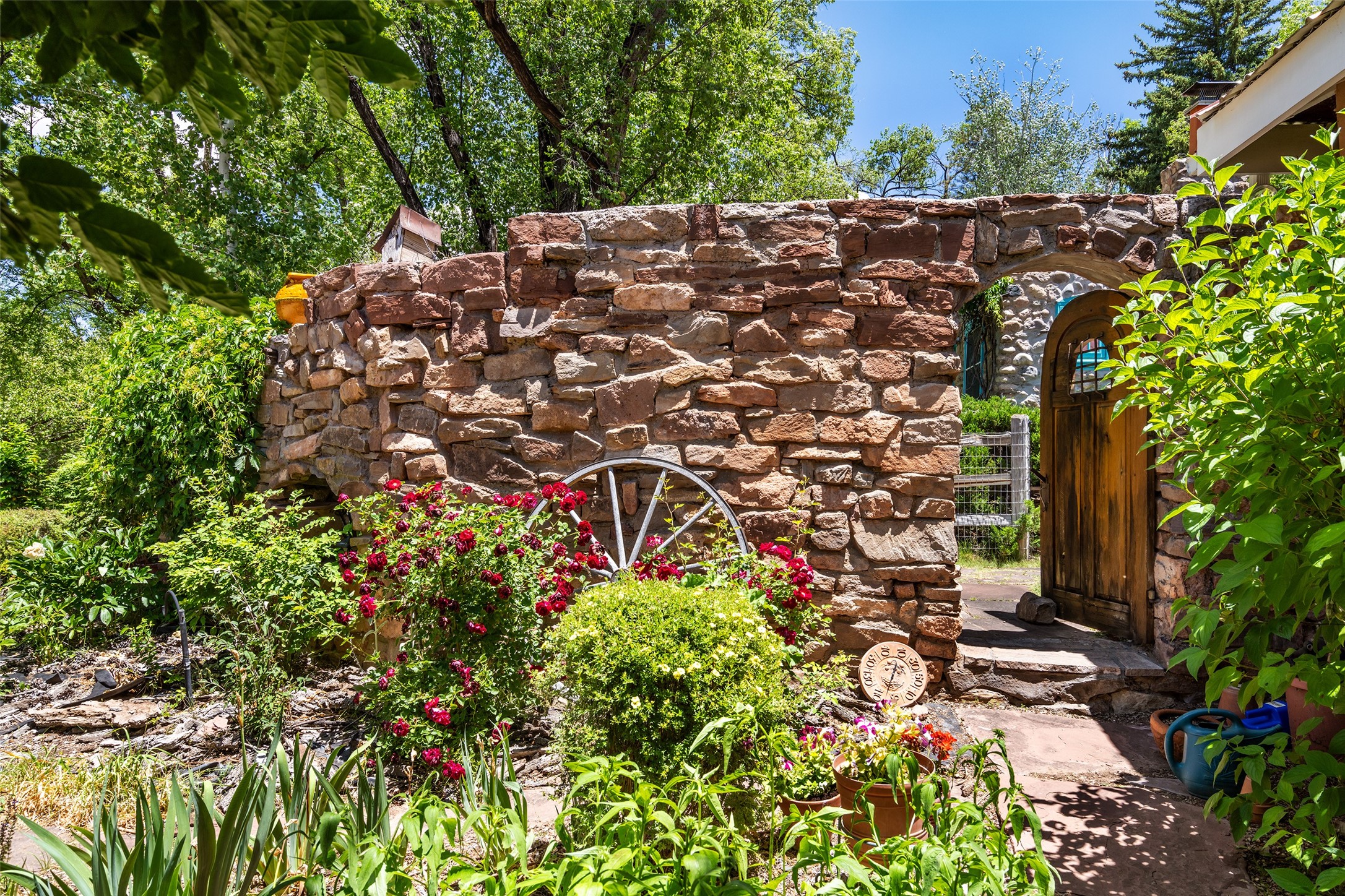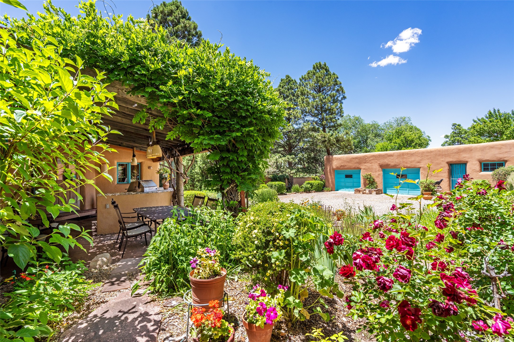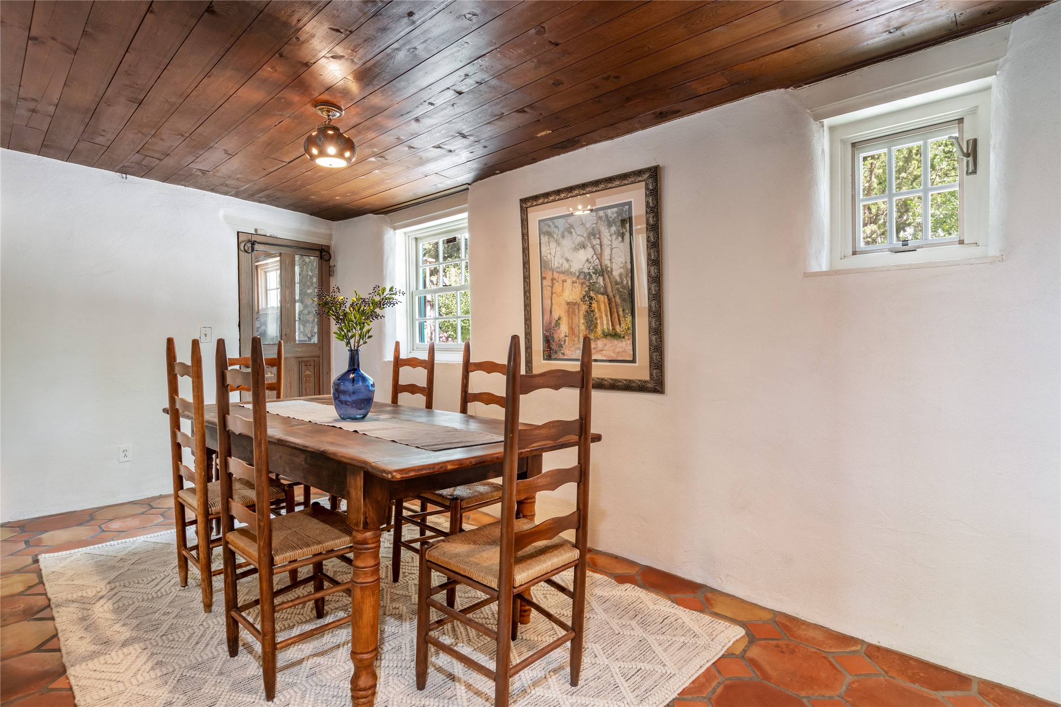 Historic Tesuque property with water rights, a New Mexico dream! Experience what used to be the community hub of Tesuque Village, home to the post office, market, small cottage motel, service station and residence of the postmistress and proprietor.All businesses have long since relocated. The main structure was converted into a private home and the motel into a casita with 2 independent guest apartments, all on 2 lots totaling 1.8 acres. The 3 bedroom, 2 bath double adobe main home features 2 kiva fireplaces in the main living room with a third stone fireplace in the primary bedroom. Traditional viga and cove ceilings decorate the main shared living spaces, with beam and plank ceilings in the halls, bedrooms, bath and sitting rooms. Built-in shelving and multiple closets offer ample storage. The charm continues with custom cabinetry and tin detailing in the kitchen. Also included are unique details such as a dugout for mechanics beneath the floor of the garage, once the Sinclair Service Station, and an outdoor bar with built-in grill. The guest apartments were previously the Modern Cottage Court Motel, a picturesque stone structure. The first apartment has potential for 2 bedrooms or a bedroom and flex space, 1 bath, a full kitchen, 2 fireplaces, an enclosed parking space, and beautiful stonework, all local river rock. The second is a charming studio with a kitchenette and fireplace.The home's character is amplified by the incredible gardens, tree canopy and mature fruit trees. The separate lot is a conservation easement offering additional space to enjoy. Modern updates include forced air heating, a tankless water heater, and an upgraded laundry room in the main house, and a newer roof on the guest house and garage. This special property includes 3 wells and surface water acequia rights. Experience this one-of-a-kind landmark today!