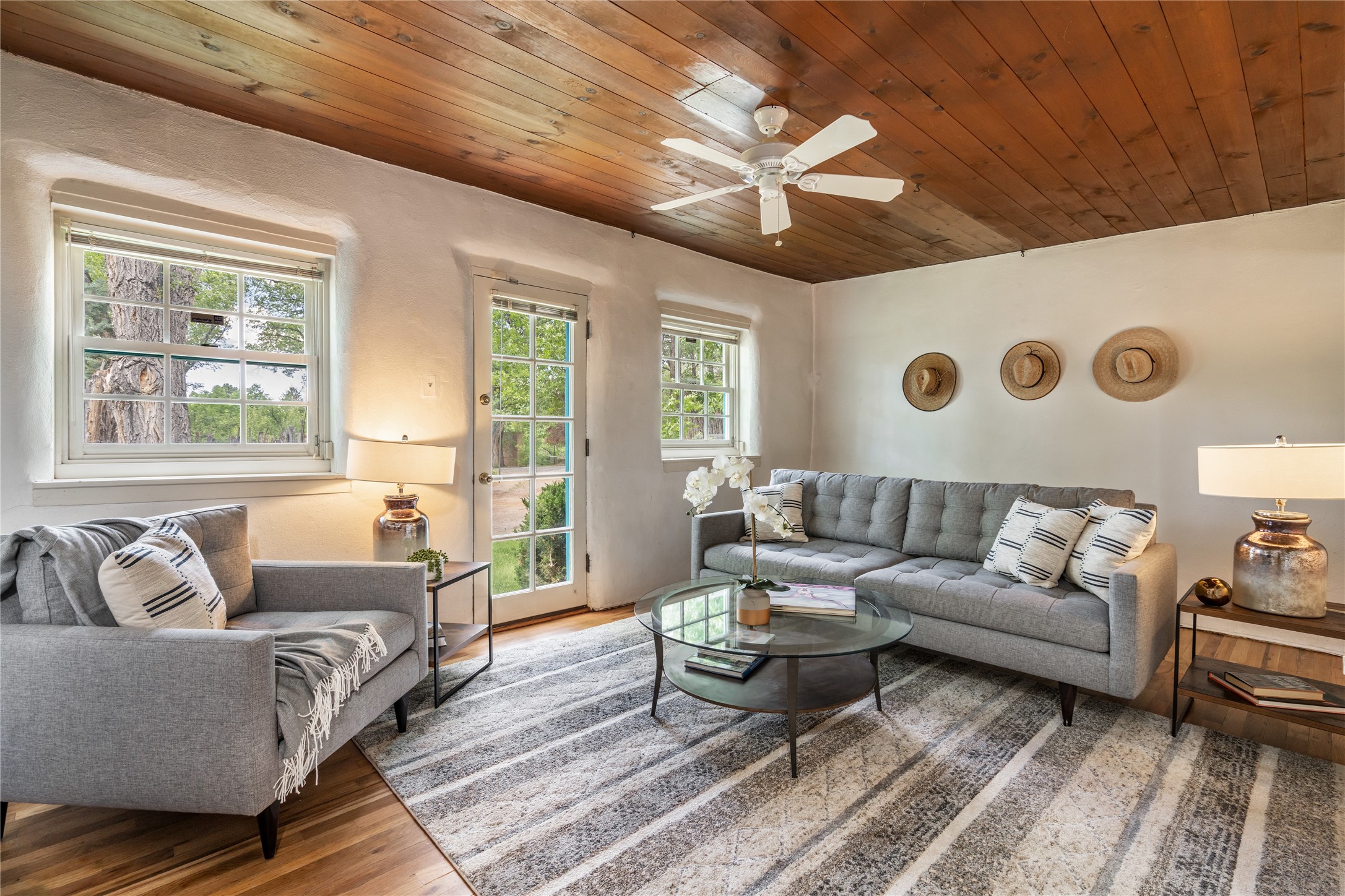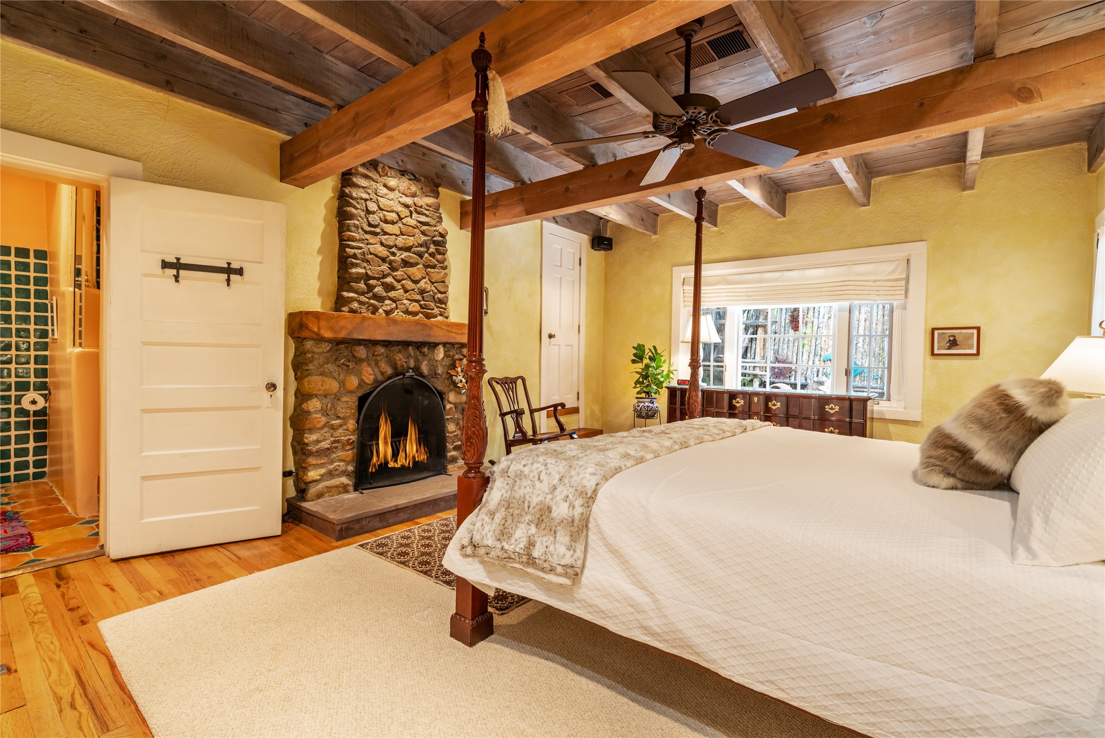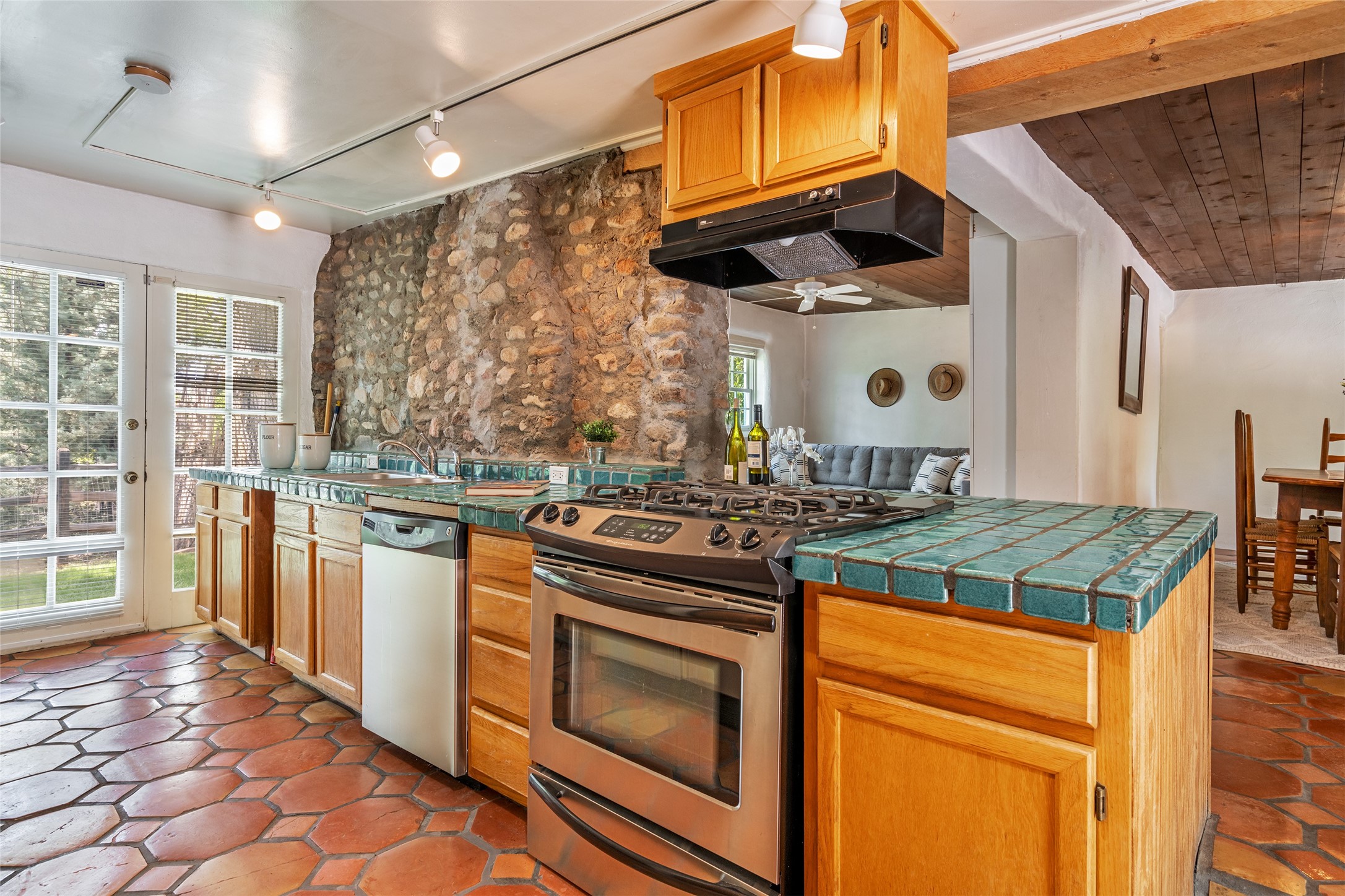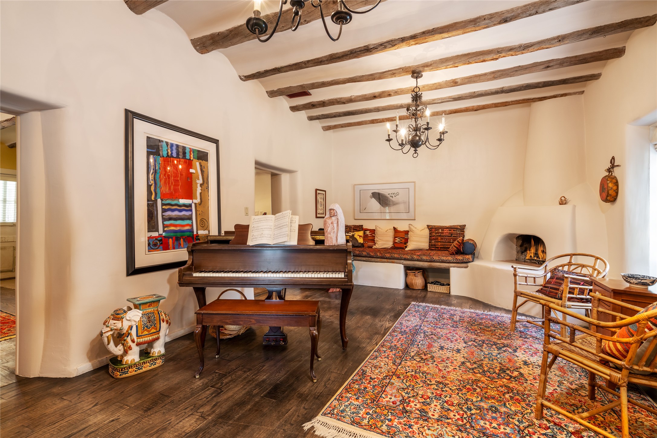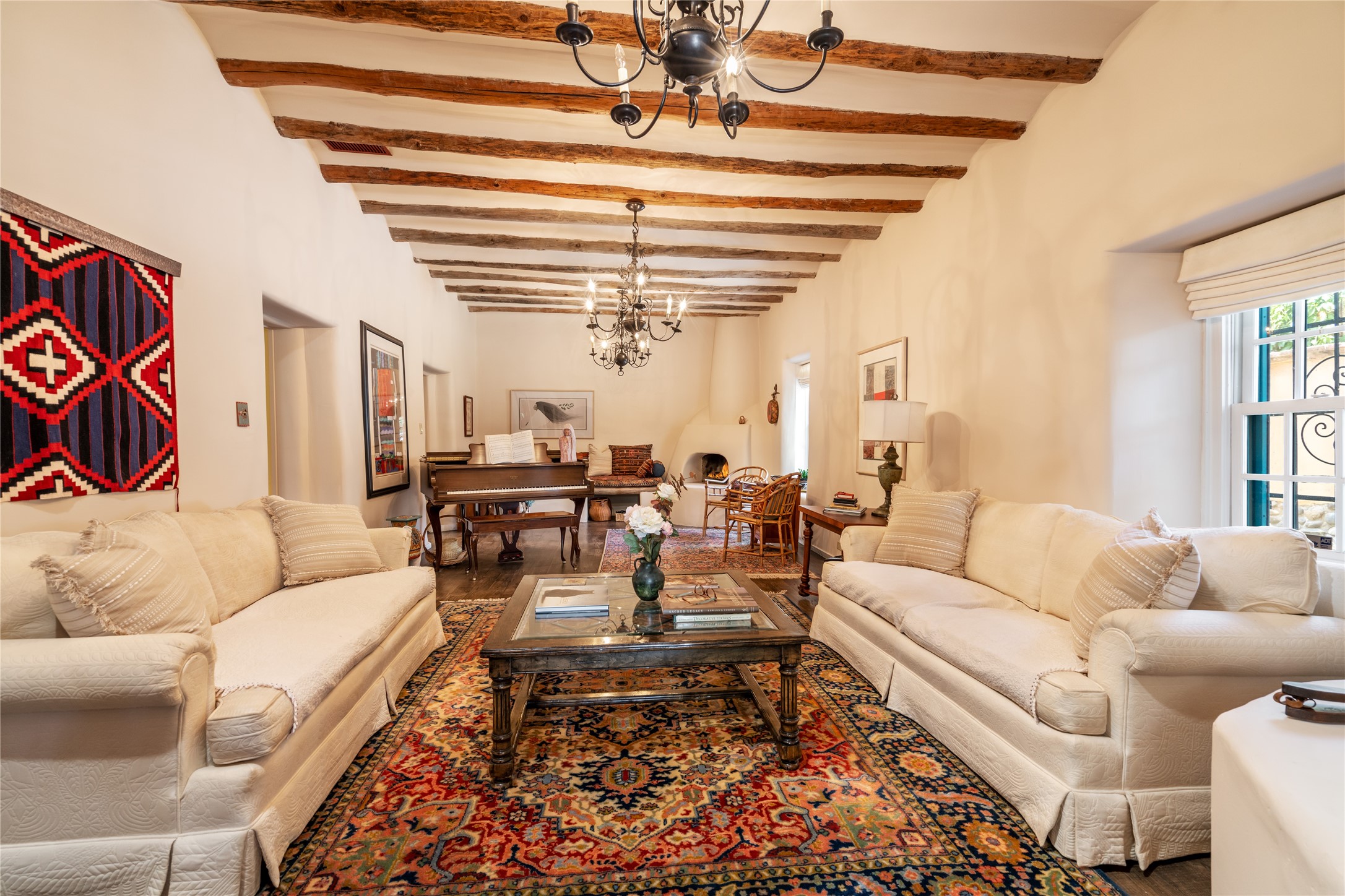 Historic Tesuque property with water rights, a New Mexico dream! Experience what used to be the community hub of Tesuque Village, home to the post office, market, small cottage motel, service station and residence of the postmistress and proprietor.All businesses have long since relocated. The main structure was converted into a private home and the motel into a casita with 2 independent guest apartments, all on 2 lots totaling 1.8 acres. The 3 bedroom, 2 bath double adobe main home features 2 kiva fireplaces in the main living room with a third stone fireplace in the primary bedroom. Traditional viga and cove ceilings decorate the main shared living spaces, with beam and plank ceilings in the halls, bedrooms, bath and sitting rooms. Built-in shelving and multiple closets offer ample storage. The charm continues with custom cabinetry and tin detailing in the kitchen. Also included are unique details such as a dugout for mechanics beneath the floor of the garage, once the Sinclair Service Station, and an outdoor bar with built-in grill. The guest apartments were previously the Modern Cottage Court Motel, a picturesque stone structure. The first apartment has potential for 2 bedrooms or a bedroom and flex space, 1 bath, a full kitchen, 2 fireplaces, an enclosed parking space, and beautiful stonework, all local river rock. The second is a charming studio with a kitchenette and fireplace.The home's character is amplified by the incredible gardens, tree canopy and mature fruit trees. The separate lot is a conservation easement offering additional space to enjoy. Modern updates include forced air heating, a tankless water heater, and an upgraded laundry room in the main house, and a newer roof on the guest house and garage. This special property includes 3 wells and surface water acequia rights. Experience this one-of-a-kind landmark today!