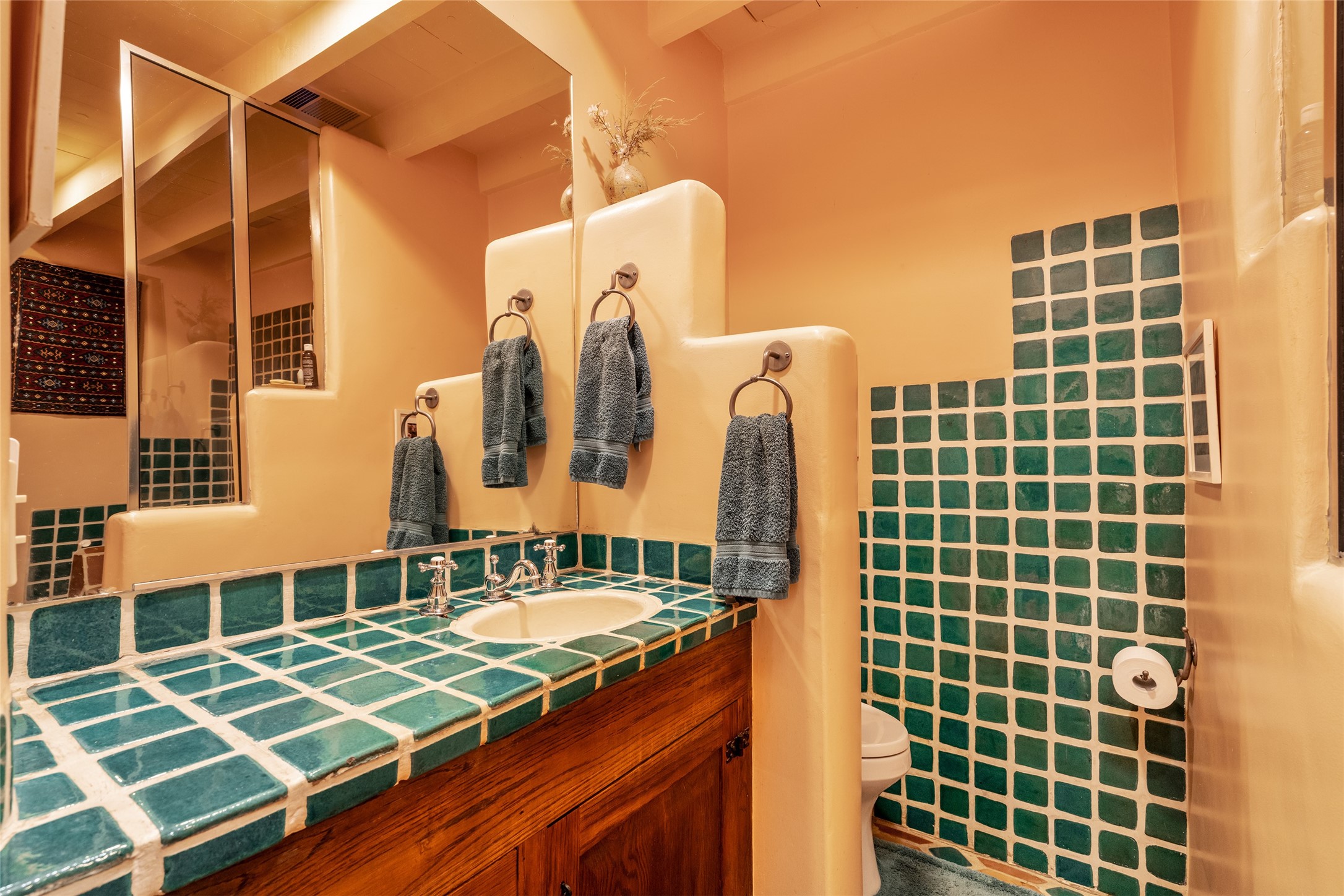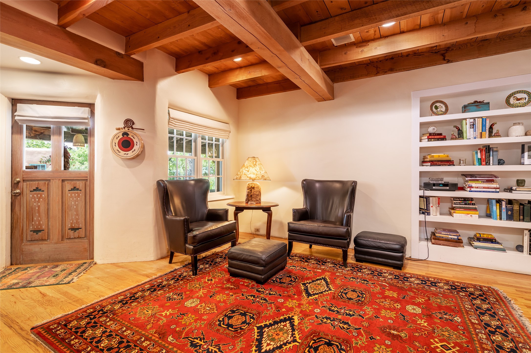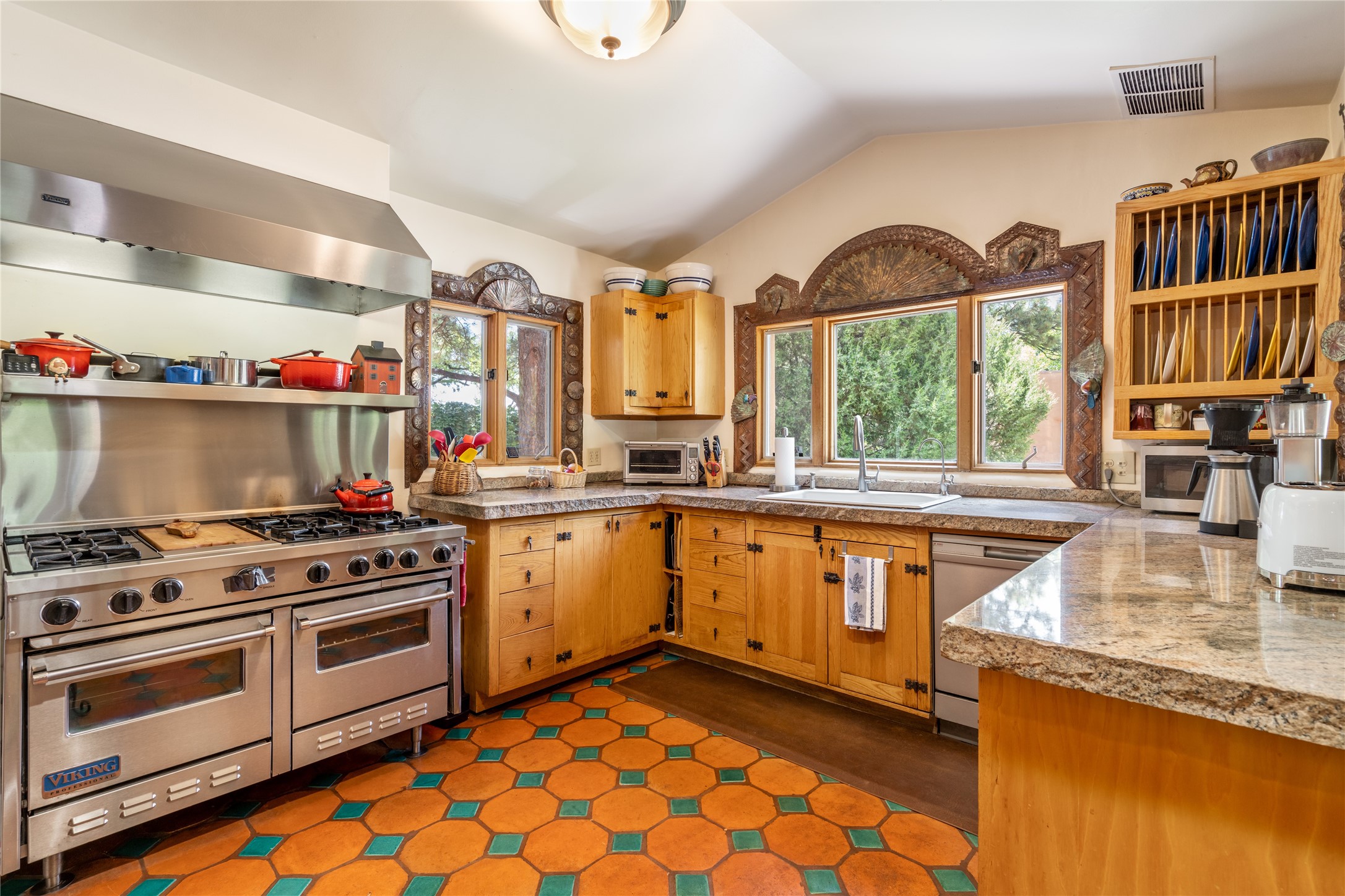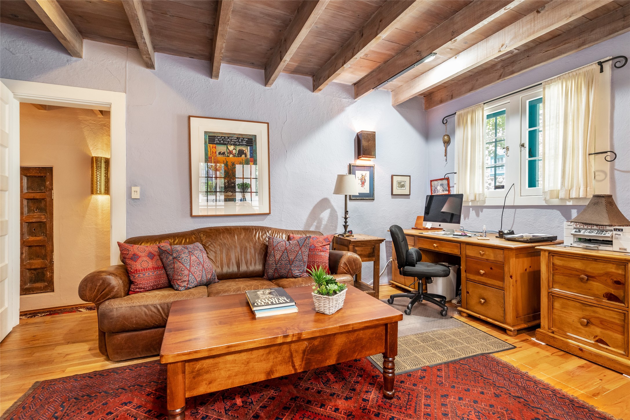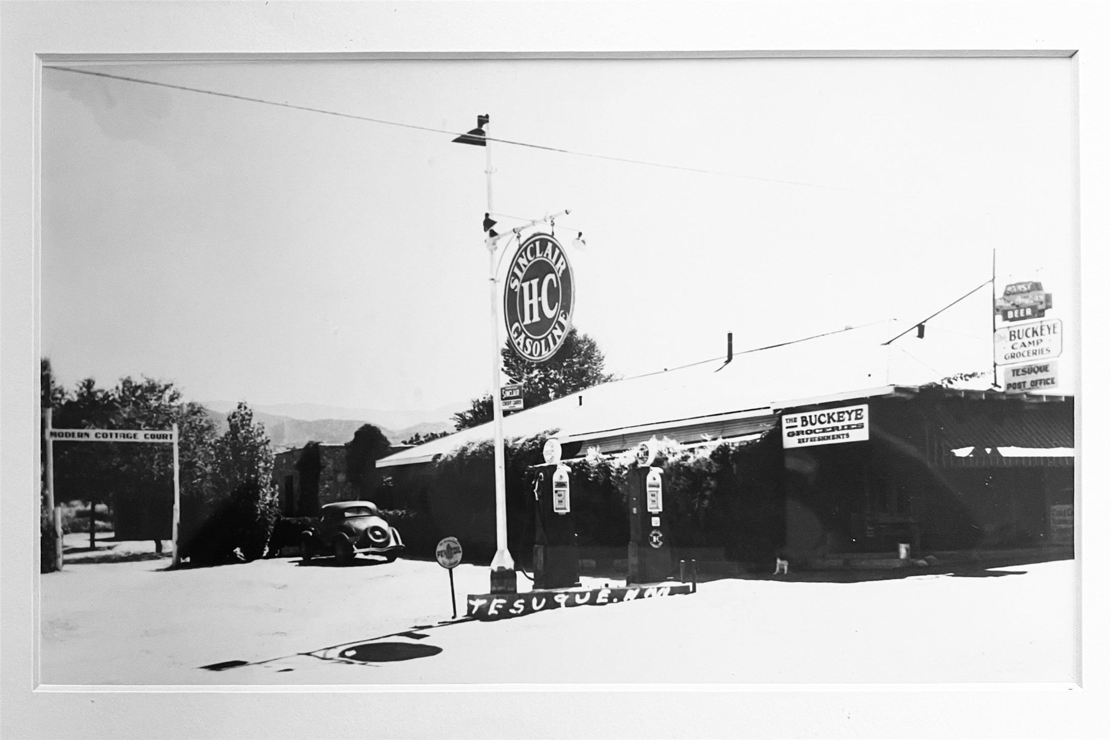 Historic Tesuque property with water rights, a New Mexico dream! Experience what used to be the community hub of Tesuque Village, home to the post office, market, small cottage motel, service station and residence of the postmistress and proprietor.All businesses have long since relocated. The main structure was converted into a private home and the motel into a casita with 2 independent guest apartments, all on 2 lots totaling 1.8 acres. The 3 bedroom, 2 bath double adobe main home features 2 kiva fireplaces in the main living room with a third stone fireplace in the primary bedroom. Traditional viga and cove ceilings decorate the main shared living spaces, with beam and plank ceilings in the halls, bedrooms, bath and sitting rooms. Built-in shelving and multiple closets offer ample storage. The charm continues with custom cabinetry and tin detailing in the kitchen. Also included are unique details such as a dugout for mechanics beneath the floor of the garage, once the Sinclair Service Station, and an outdoor bar with built-in grill. The guest apartments were previously the Modern Cottage Court Motel, a picturesque stone structure. The first apartment has potential for 2 bedrooms or a bedroom and flex space, 1 bath, a full kitchen, 2 fireplaces, an enclosed parking space, and beautiful stonework, all local river rock. The second is a charming studio with a kitchenette and fireplace.The home's character is amplified by the incredible gardens, tree canopy and mature fruit trees. The separate lot is a conservation easement offering additional space to enjoy. Modern updates include forced air heating, a tankless water heater, and an upgraded laundry room in the main house, and a newer roof on the guest house and garage. This special property includes 3 wells and surface water acequia rights. Experience this one-of-a-kind landmark today!
