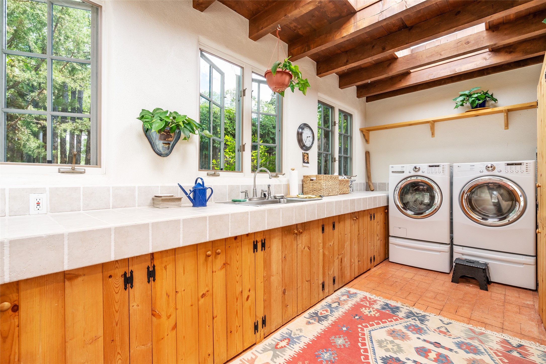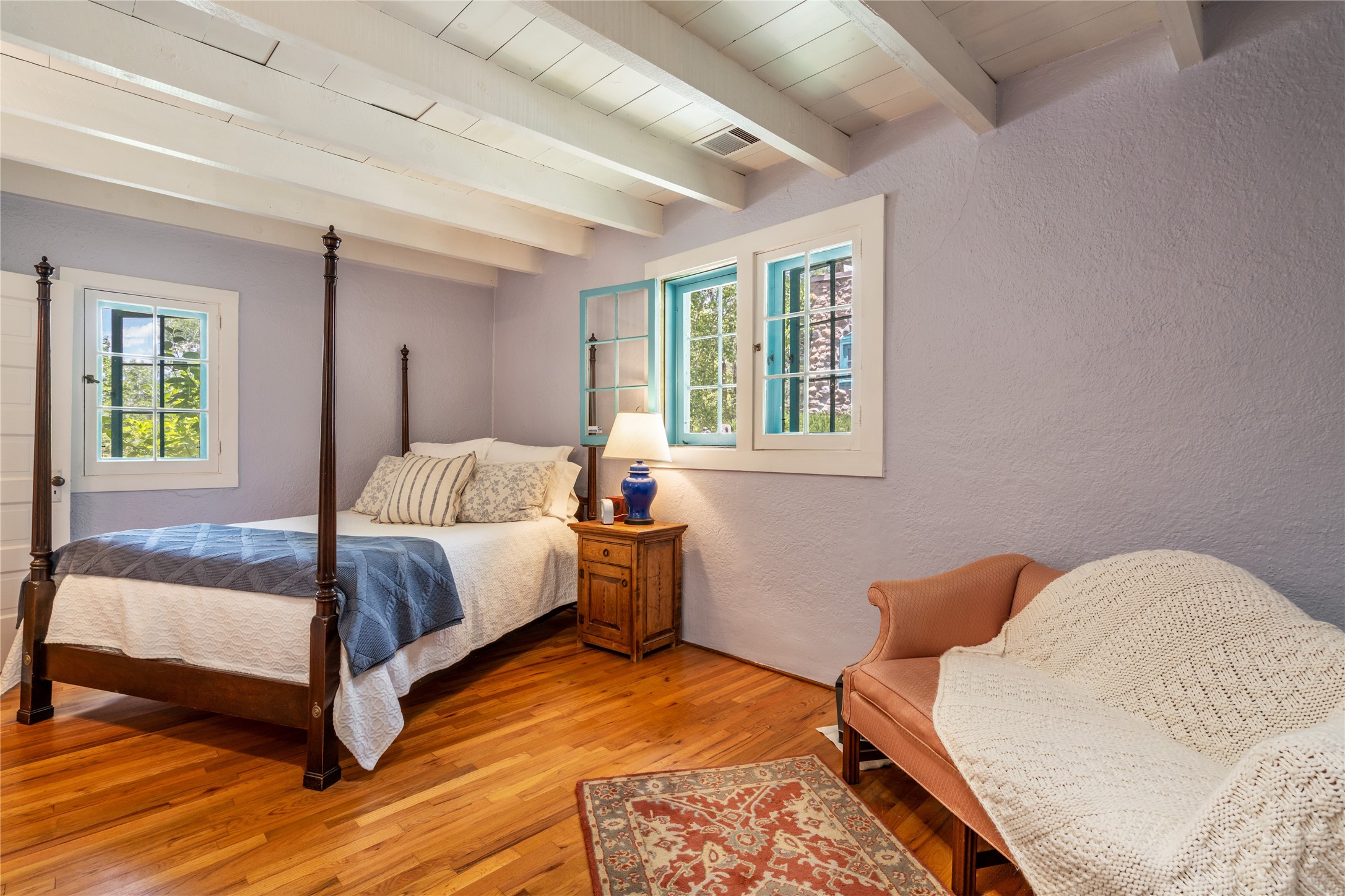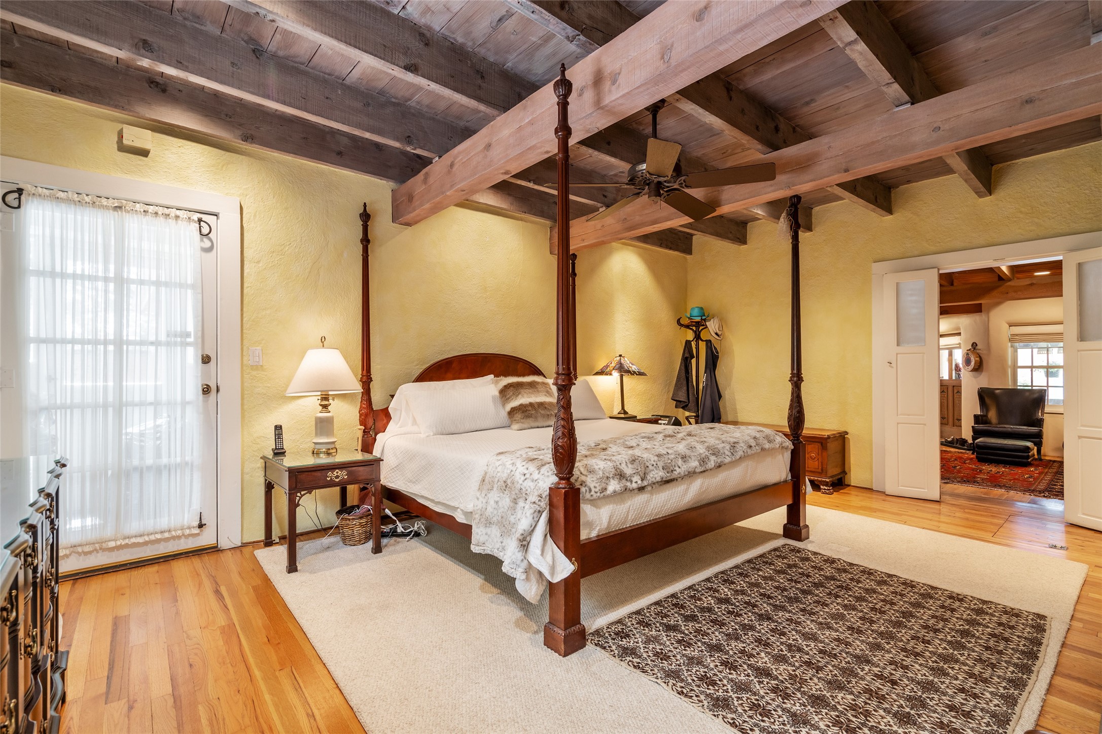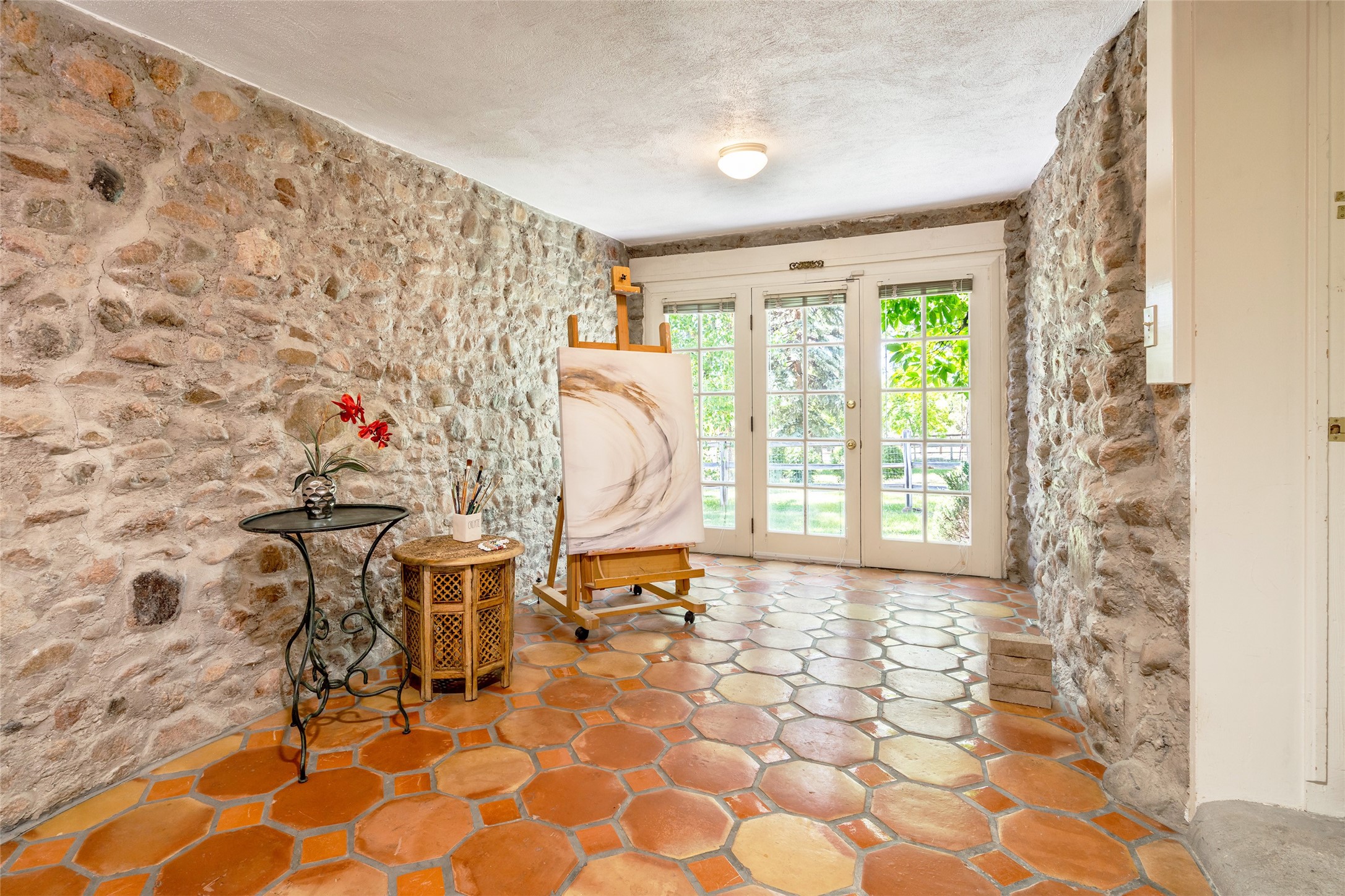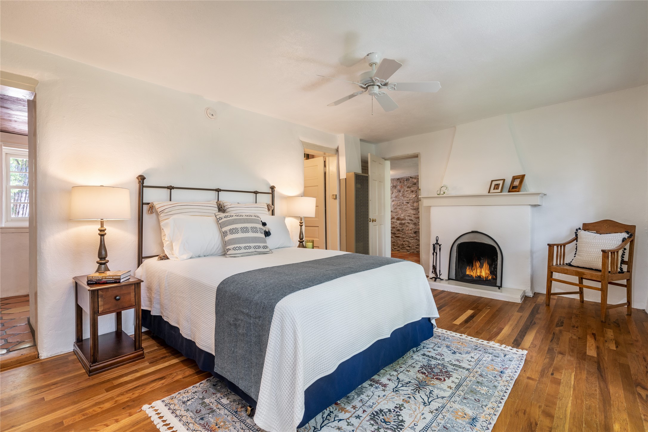 Historic Tesuque property with water rights, a New Mexico dream! Experience what used to be the community hub of Tesuque Village, home to the post office, market, small cottage motel, service station and residence of the postmistress and proprietor.All businesses have long since relocated. The main structure was converted into a private home and the motel into a casita with 2 independent guest apartments, all on 2 lots totaling 1.8 acres. The 3 bedroom, 2 bath double adobe main home features 2 kiva fireplaces in the main living room with a third stone fireplace in the primary bedroom. Traditional viga and cove ceilings decorate the main shared living spaces, with beam and plank ceilings in the halls, bedrooms, bath and sitting rooms. Built-in shelving and multiple closets offer ample storage. The charm continues with custom cabinetry and tin detailing in the kitchen. Also included are unique details such as a dugout for mechanics beneath the floor of the garage, once the Sinclair Service Station, and an outdoor bar with built-in grill. The guest apartments were previously the Modern Cottage Court Motel, a picturesque stone structure. The first apartment has potential for 2 bedrooms or a bedroom and flex space, 1 bath, a full kitchen, 2 fireplaces, an enclosed parking space, and beautiful stonework, all local river rock. The second is a charming studio with a kitchenette and fireplace.The home's character is amplified by the incredible gardens, tree canopy and mature fruit trees. The separate lot is a conservation easement offering additional space to enjoy. Modern updates include forced air heating, a tankless water heater, and an upgraded laundry room in the main house, and a newer roof on the guest house and garage. This special property includes 3 wells and surface water acequia rights. Experience this one-of-a-kind landmark today!
