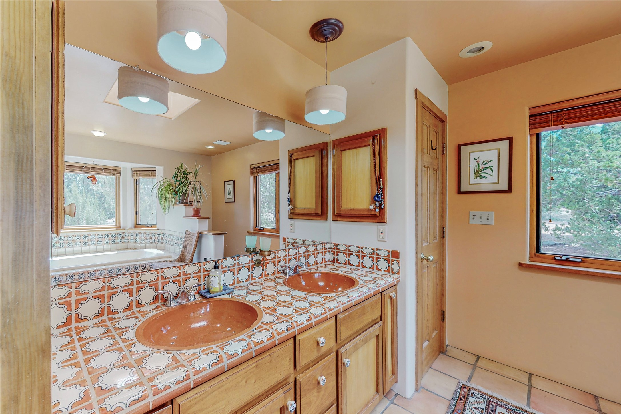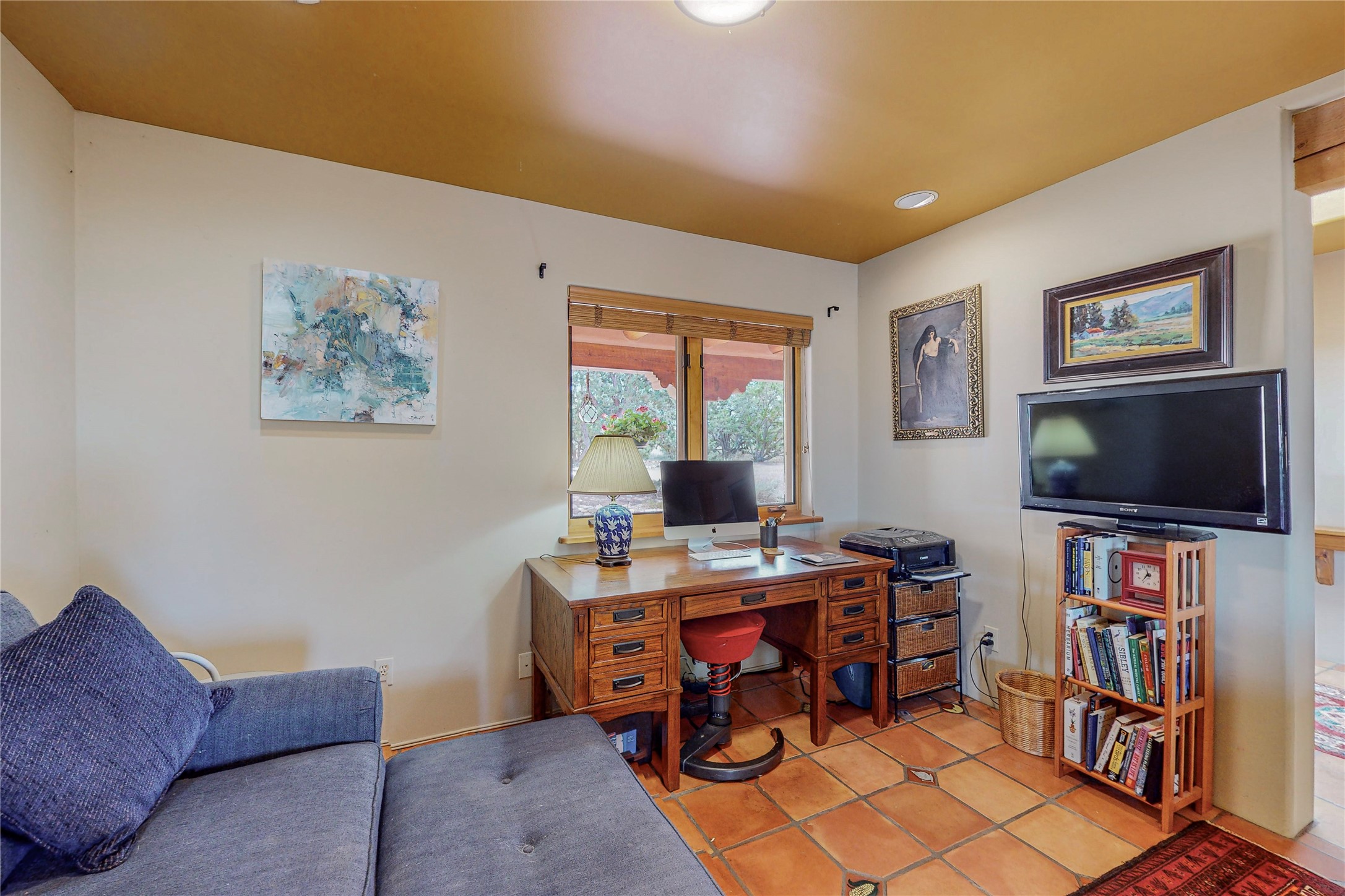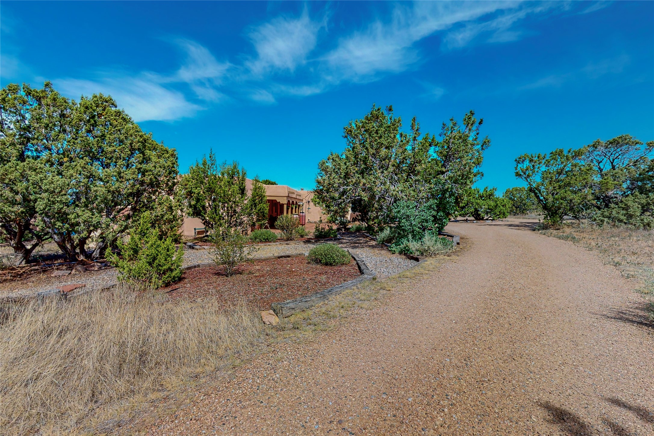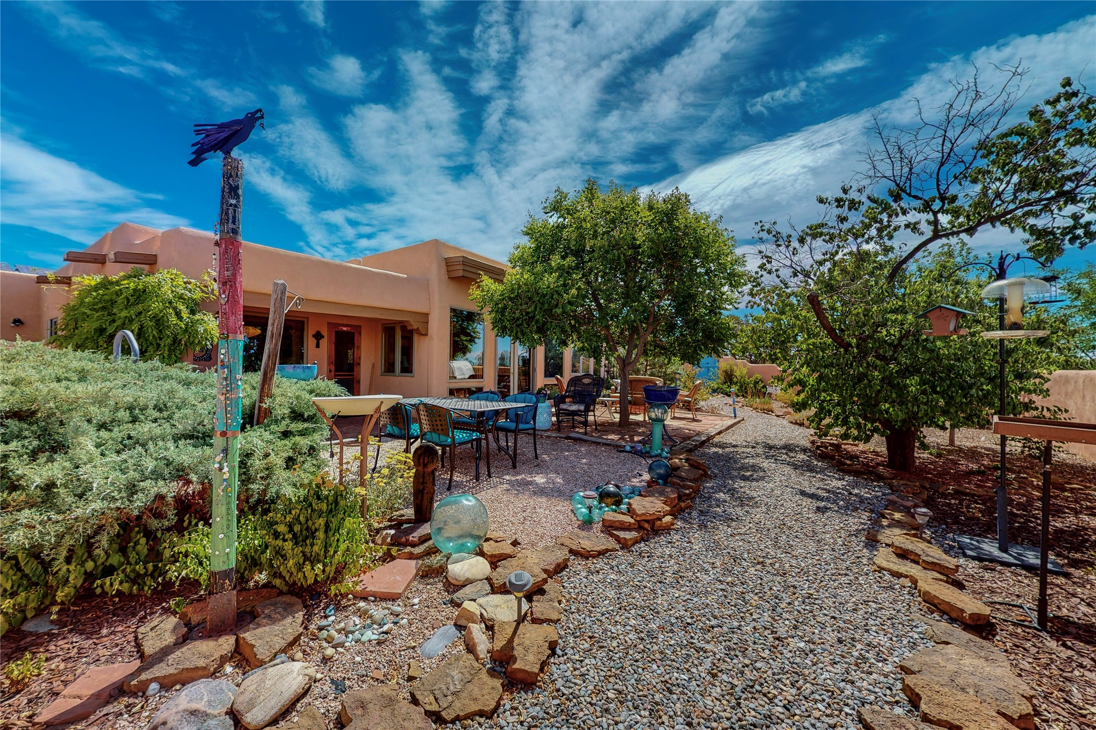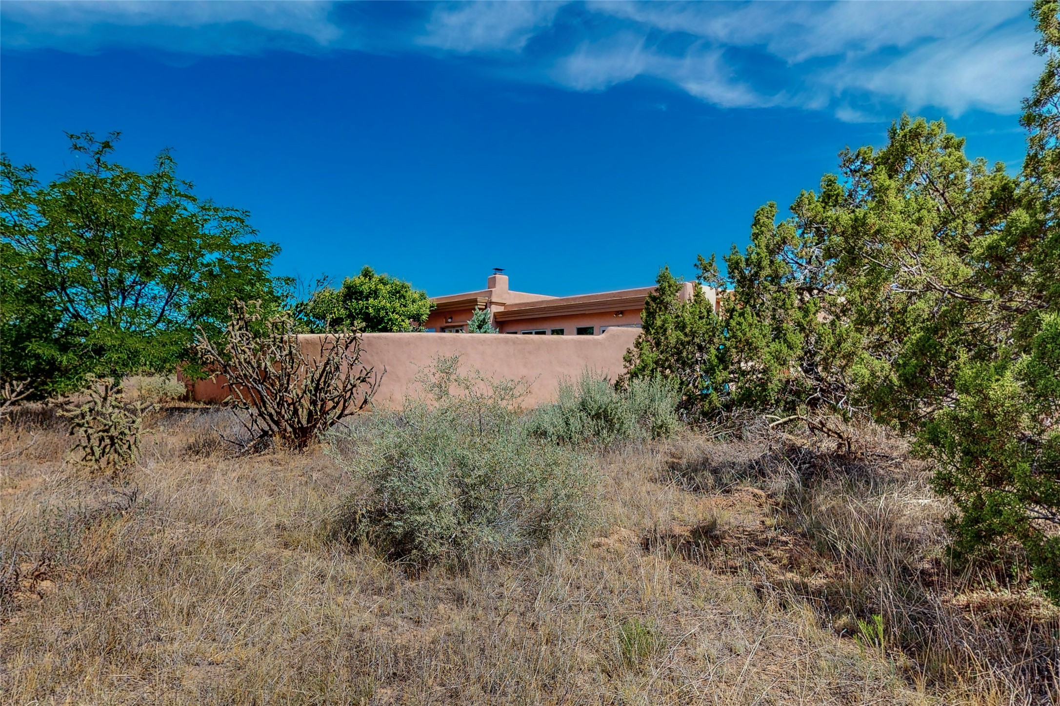 There is a lot to love about this delightful home custom built by Bowen & Picket Builders in the early 90's. Oozing with ambience and Santa Fe charm with Saltillo tile floors, viga ceilings, carved corbelled beams and kiva fireplace. A traditional pueblo design with added eco efficiency. Natural gas radiant heat, passive and active solar system, boiler and on demand hot water heater only 3 years old. A large multi purpose studio with storage room, 1 car garage, a sauna and hot tub. Fabulous privately walled gardens, water catchment cisterns and even a raised bed veggie patch. Privately located on a cul de sac with Eldorado views, access to the pool, tennis, pickleball, disc golf, parks and clubhouse activities yet only minutes into Santa Fe. This home is a must see.