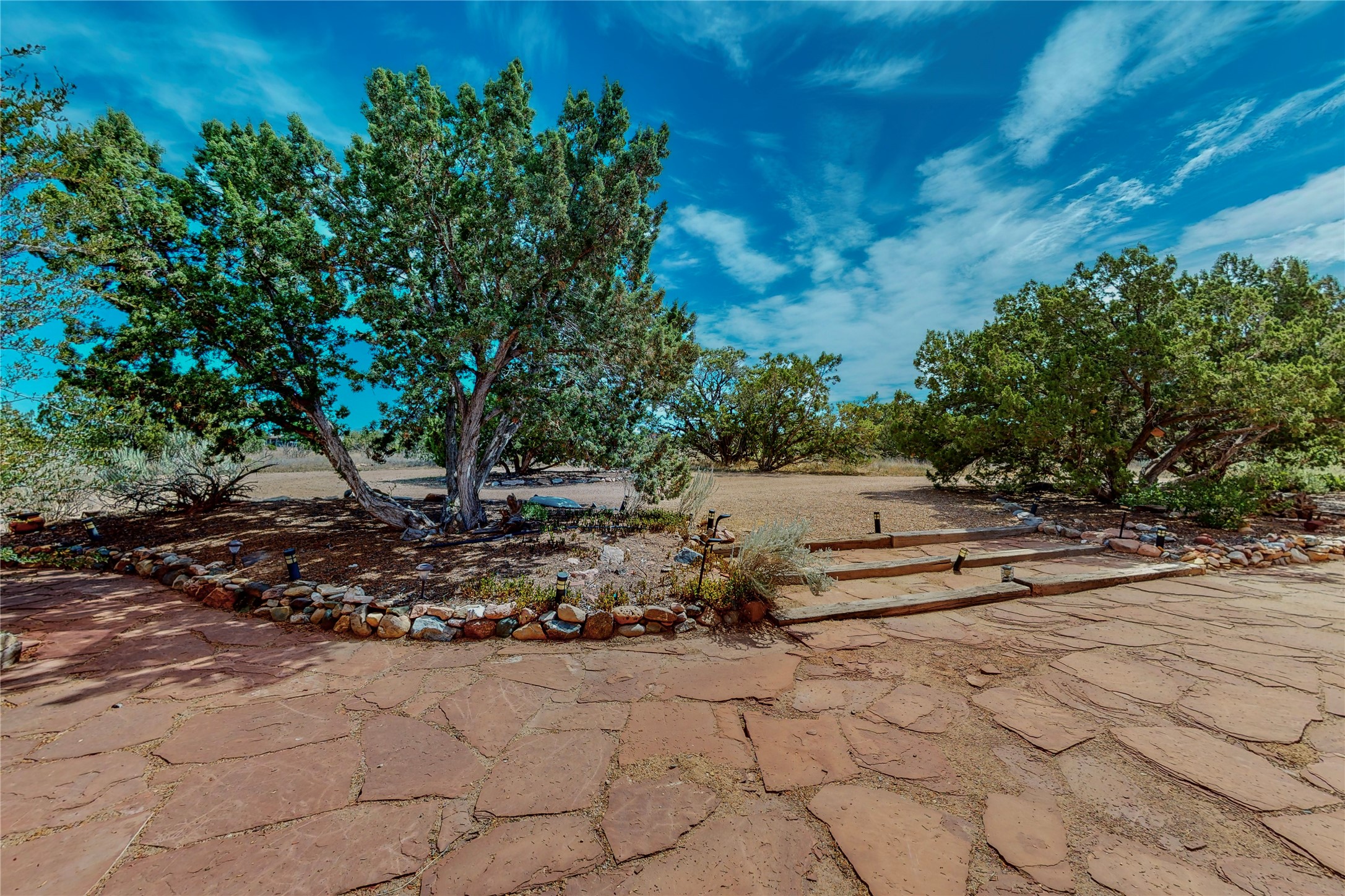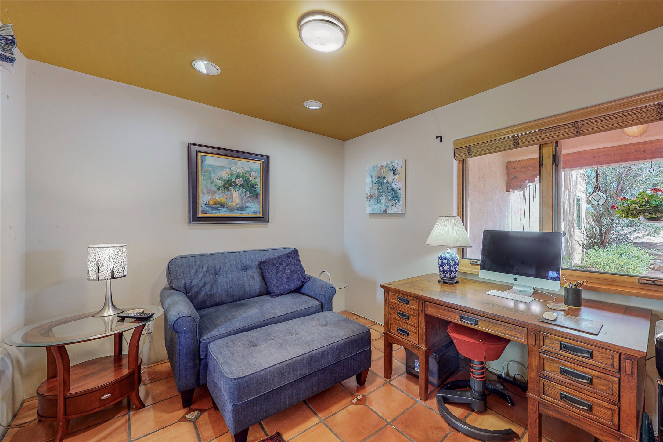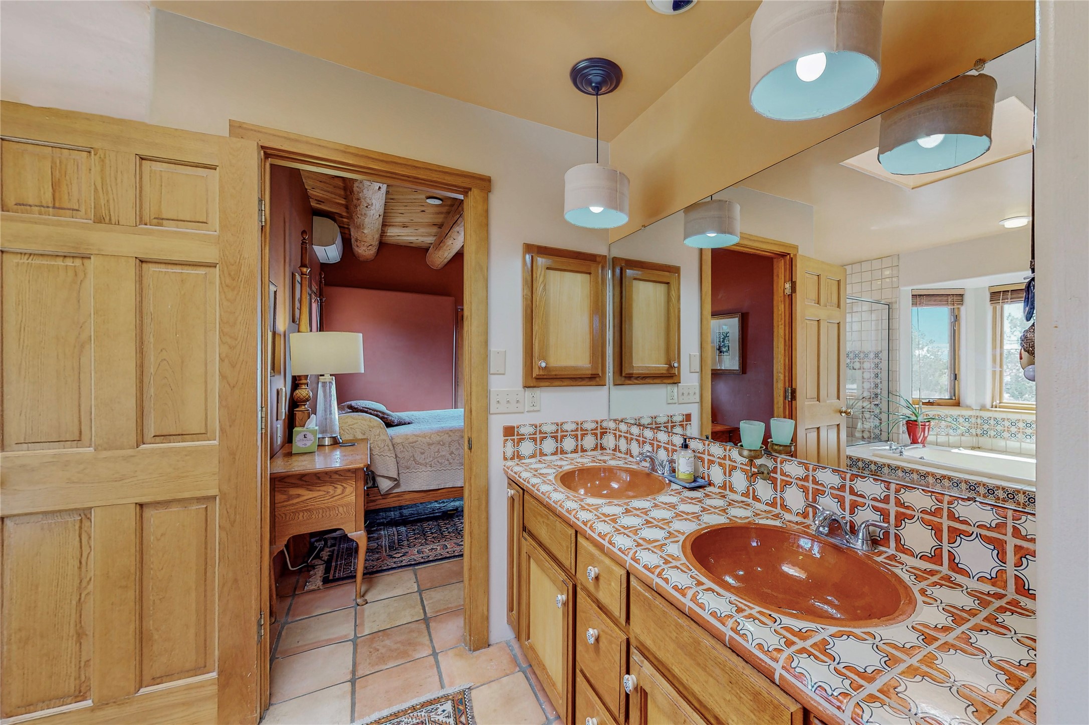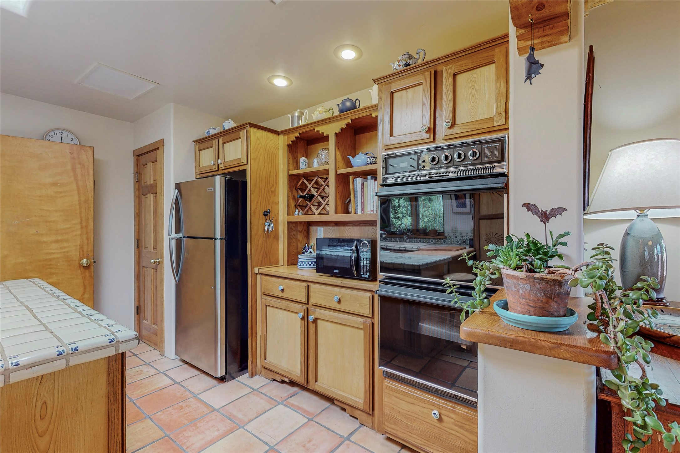 There is a lot to love about this delightful home custom built by Bowen & Picket Builders in the early 90's. Oozing with ambience and Santa Fe charm with Saltillo tile floors, viga ceilings, carved corbelled beams and kiva fireplace. A traditional pueblo design with added eco efficiency. Natural gas radiant heat, passive and active solar system, boiler and on demand hot water heater only 3 years old. A large multi purpose studio with storage room, 1 car garage, a sauna and hot tub. Fabulous privately walled gardens, water catchment cisterns and even a raised bed veggie patch. Privately located on a cul de sac with Eldorado views, access to the pool, tennis, pickleball, disc golf, parks and clubhouse activities yet only minutes into Santa Fe. This home is a must see.