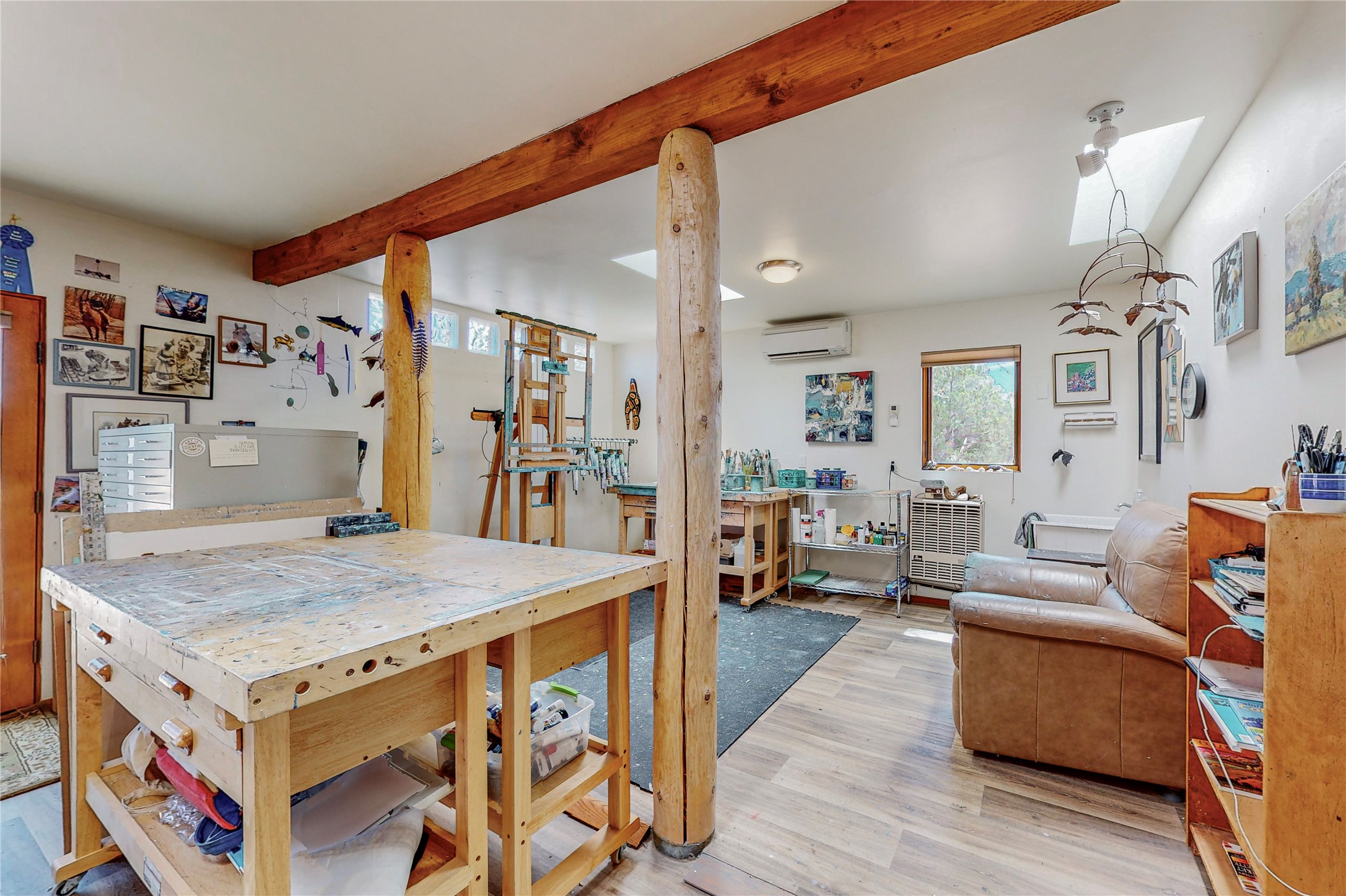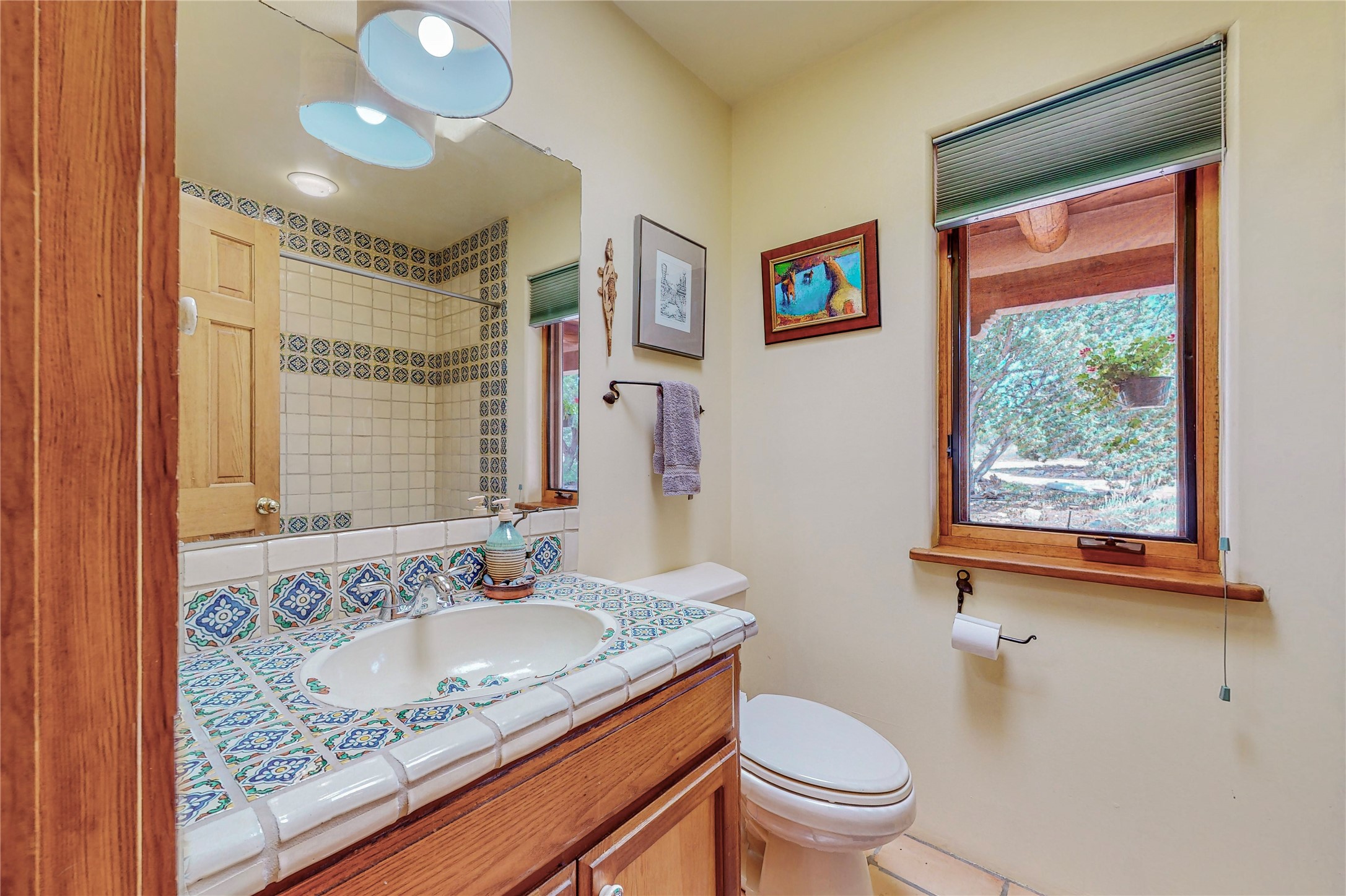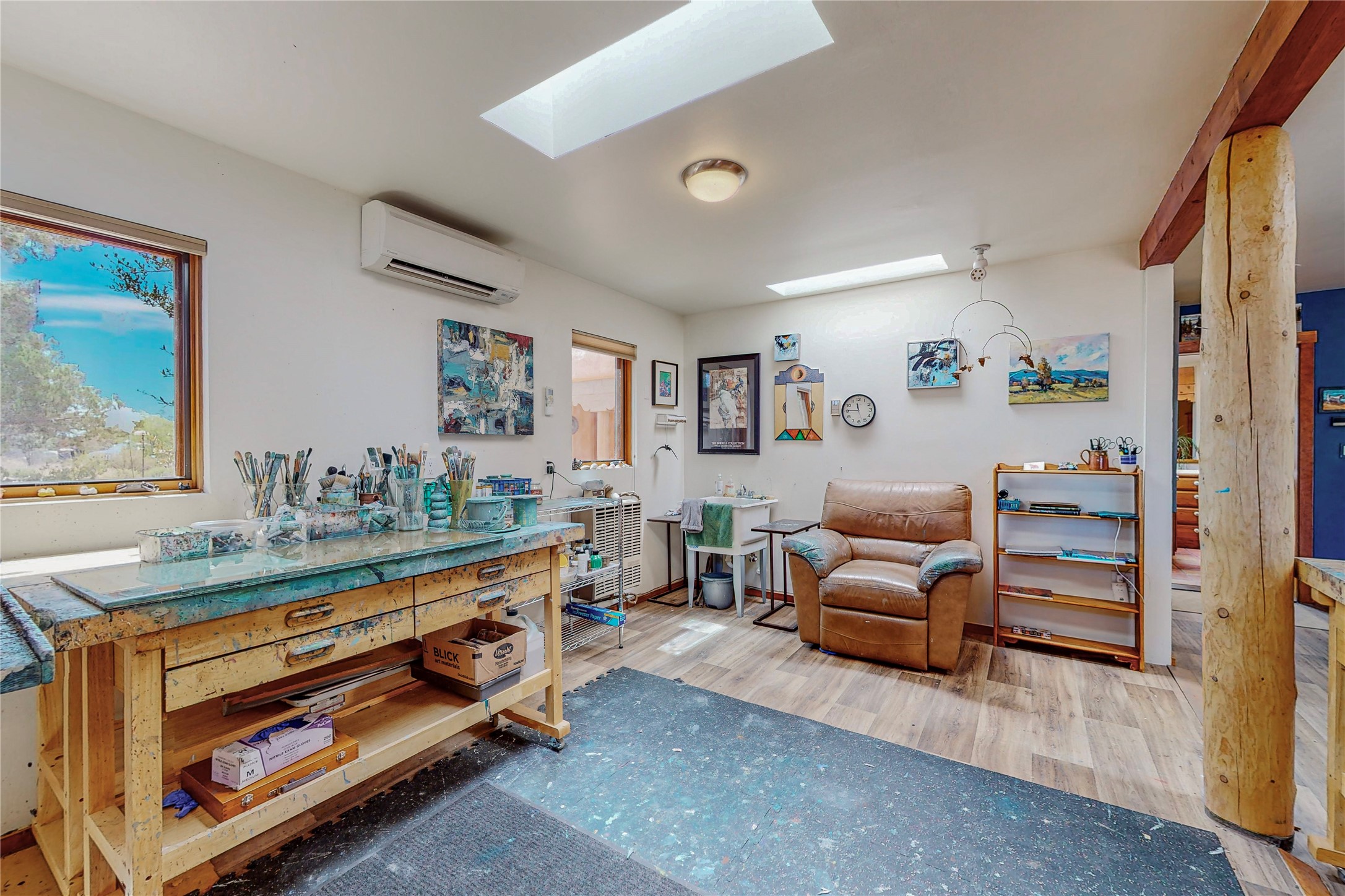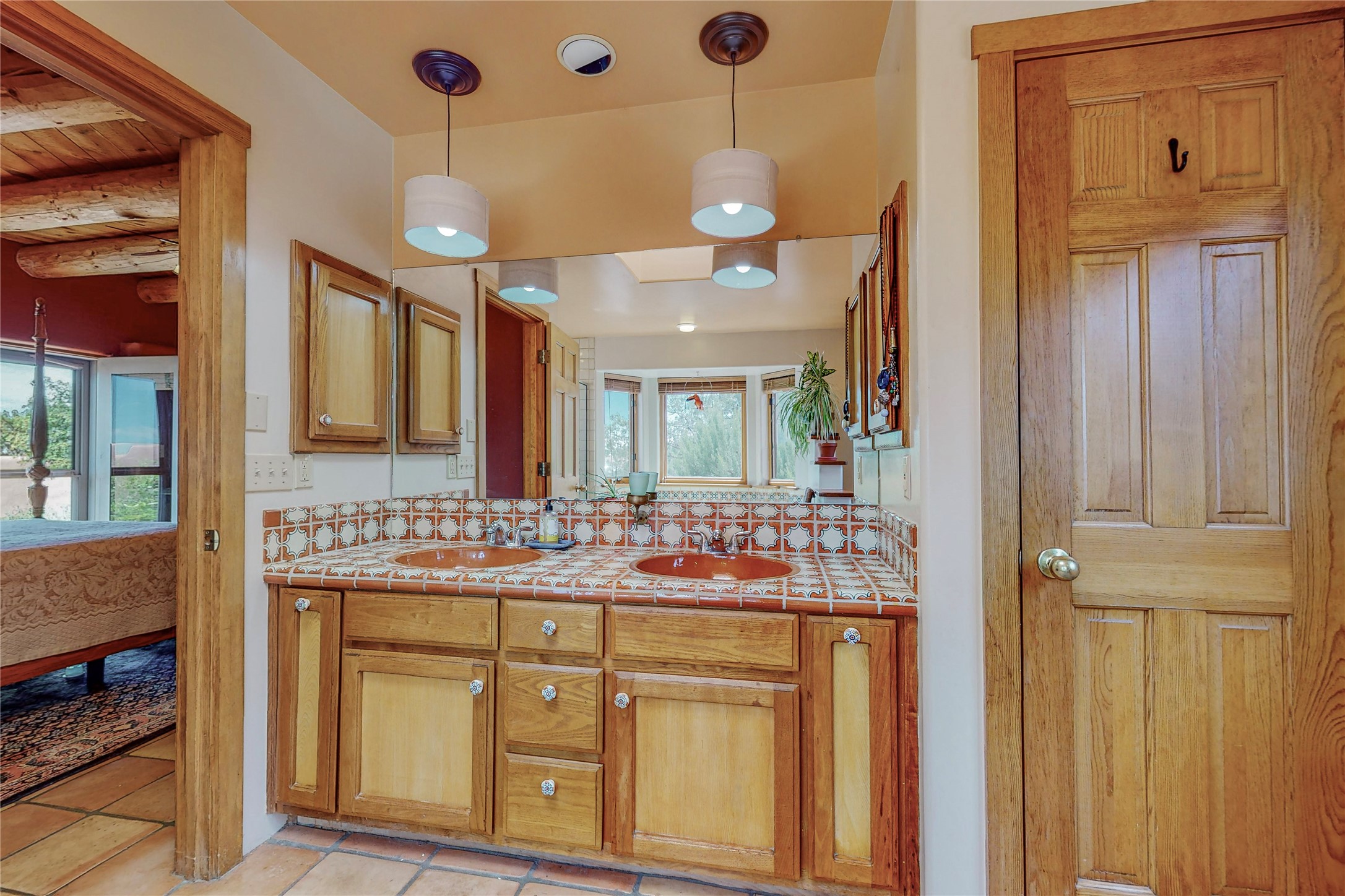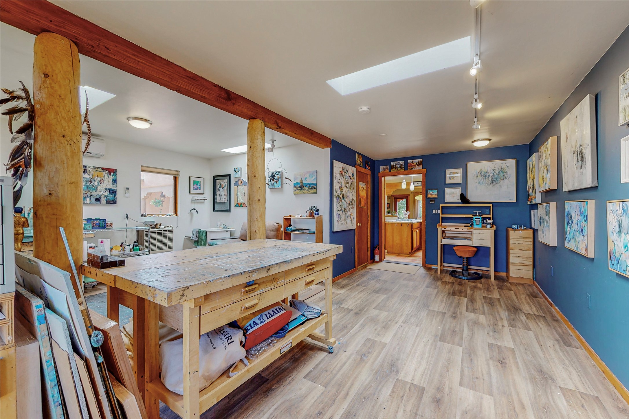 There is a lot to love about this delightful home custom built by Bowen & Picket Builders in the early 90's. Oozing with ambience and Santa Fe charm with Saltillo tile floors, viga ceilings, carved corbelled beams and kiva fireplace. A traditional pueblo design with added eco efficiency. Natural gas radiant heat, passive and active solar system, boiler and on demand hot water heater only 3 years old. A large multi purpose studio with storage room, 1 car garage, a sauna and hot tub. Fabulous privately walled gardens, water catchment cisterns and even a raised bed veggie patch. Privately located on a cul de sac with Eldorado views, access to the pool, tennis, pickleball, disc golf, parks and clubhouse activities yet only minutes into Santa Fe. This home is a must see.