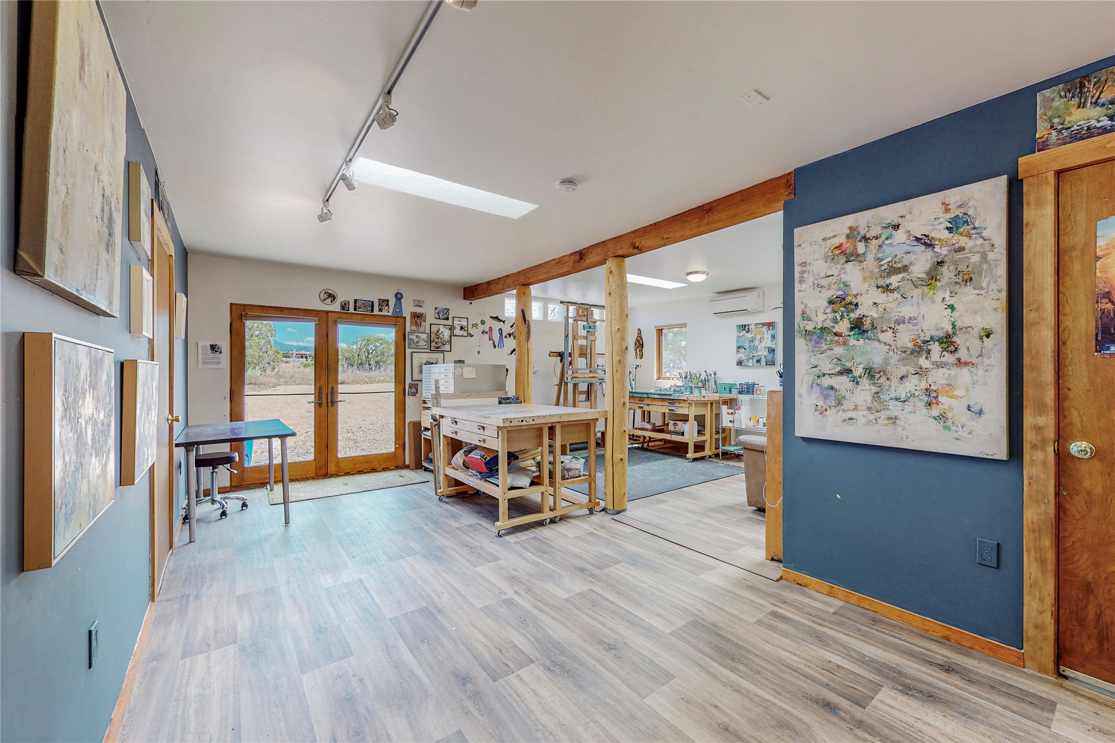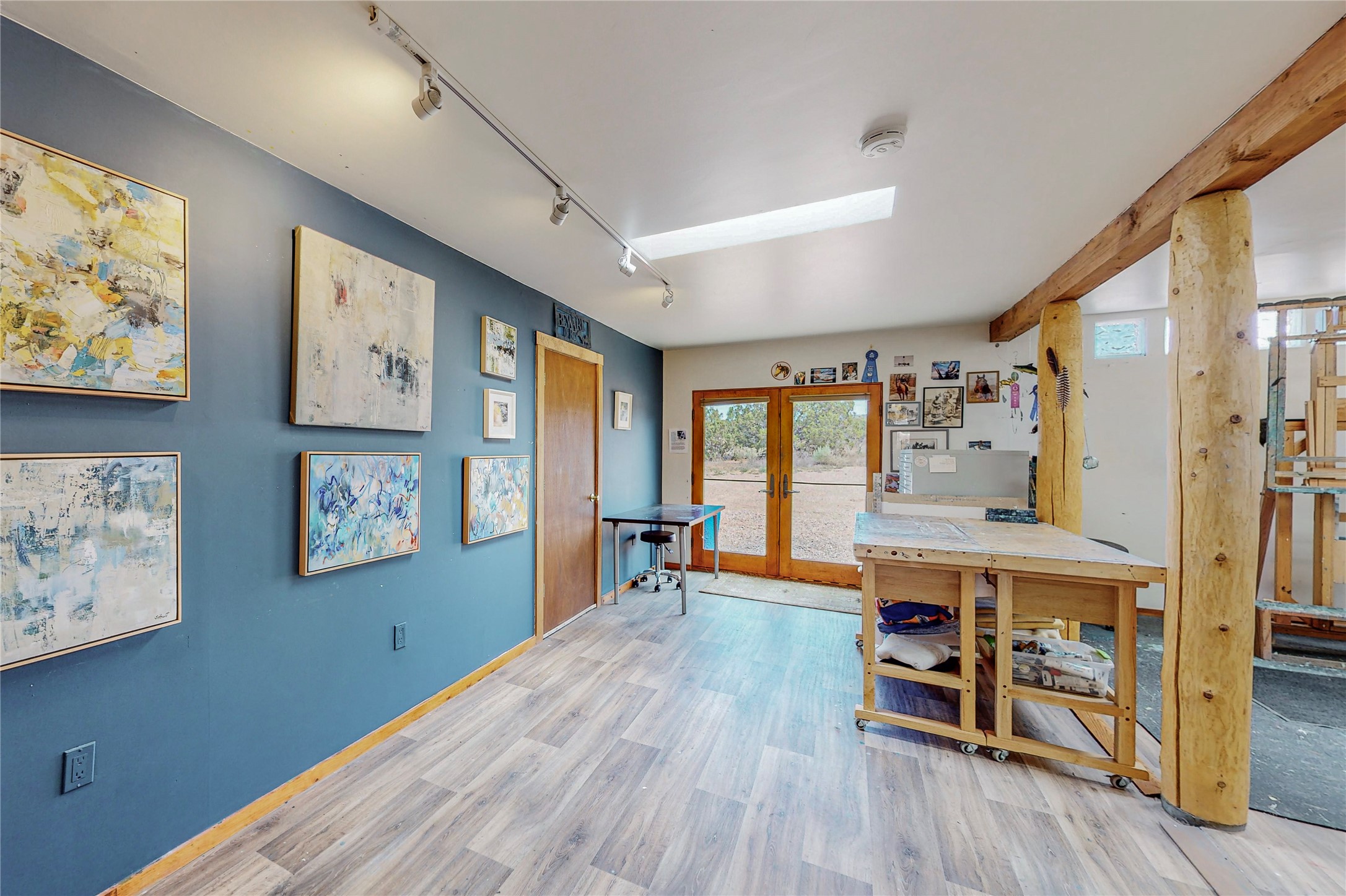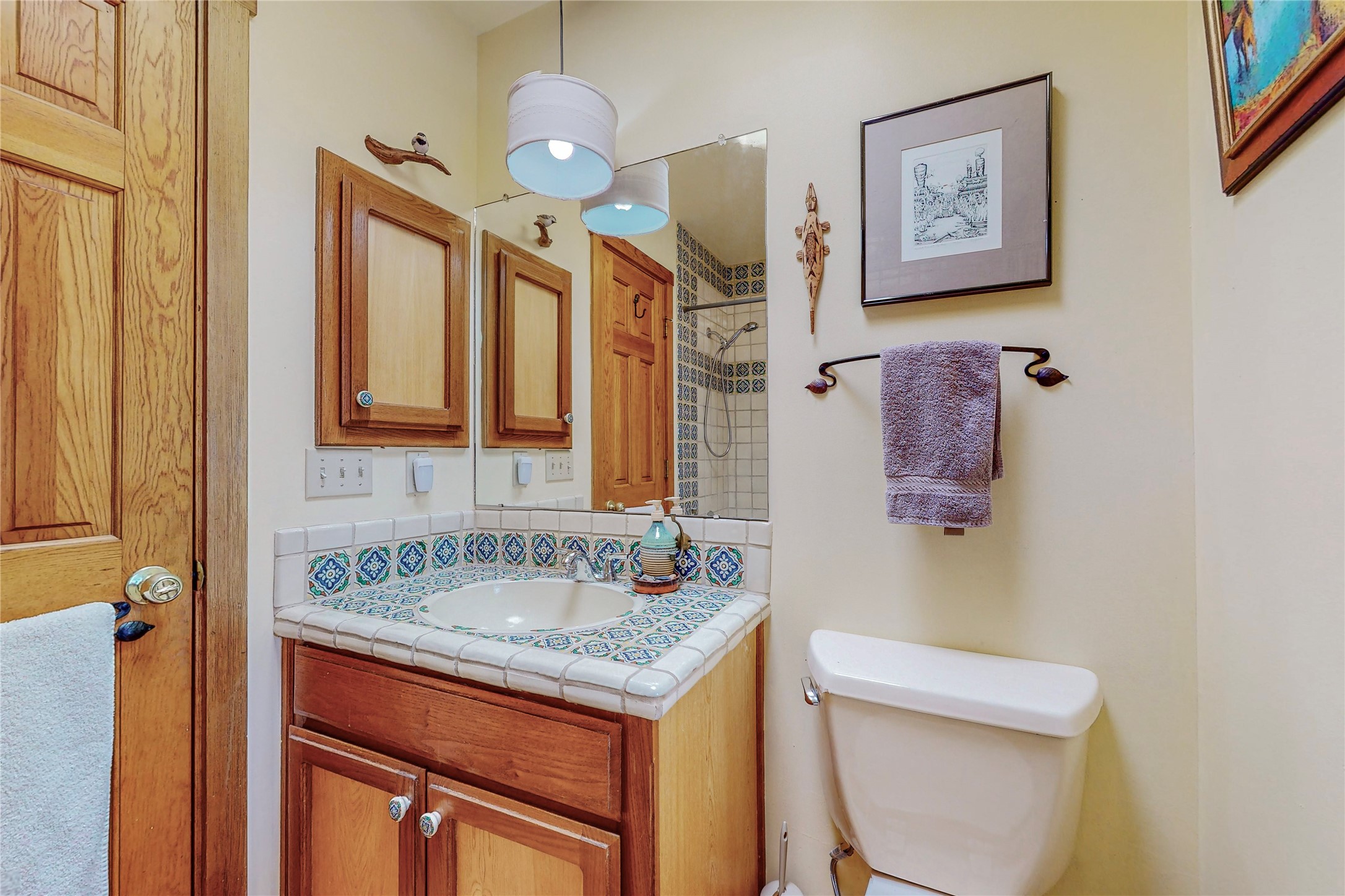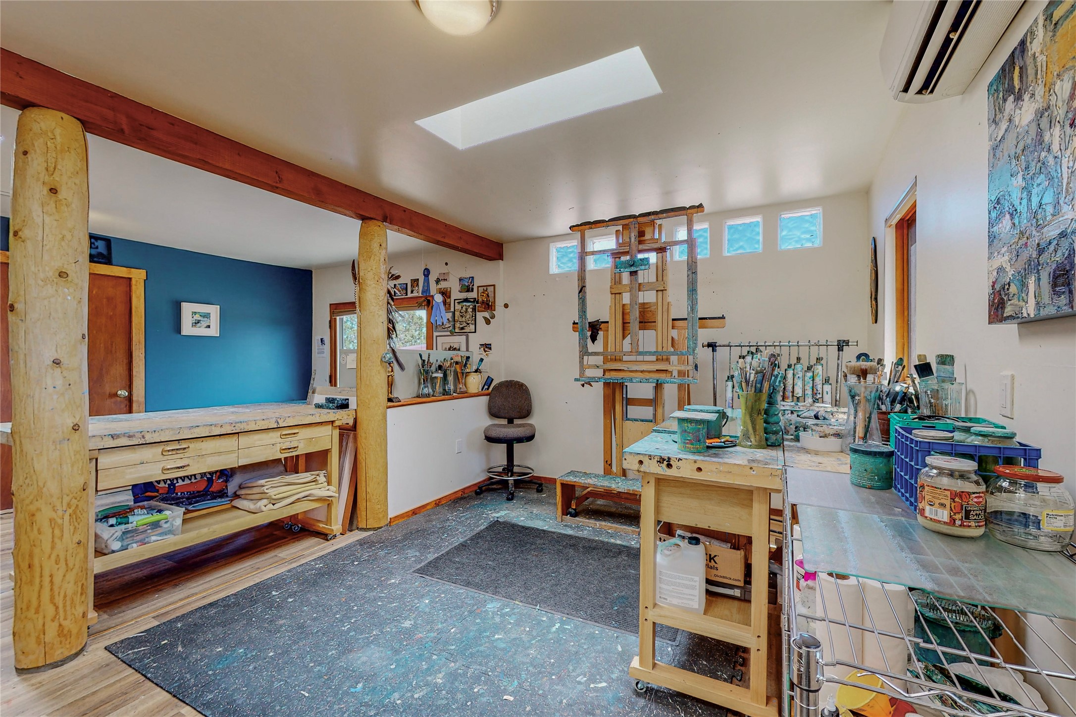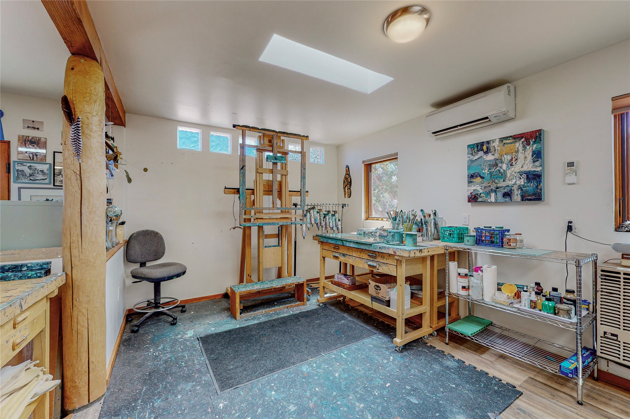 There is a lot to love about this delightful home custom built by Bowen & Picket Builders in the early 90's. Oozing with ambience and Santa Fe charm with Saltillo tile floors, viga ceilings, carved corbelled beams and kiva fireplace. A traditional pueblo design with added eco efficiency. Natural gas radiant heat, passive and active solar system, boiler and on demand hot water heater only 3 years old. A large multi purpose studio with storage room, 1 car garage, a sauna and hot tub. Fabulous privately walled gardens, water catchment cisterns and even a raised bed veggie patch. Privately located on a cul de sac with Eldorado views, access to the pool, tennis, pickleball, disc golf, parks and clubhouse activities yet only minutes into Santa Fe. This home is a must see.