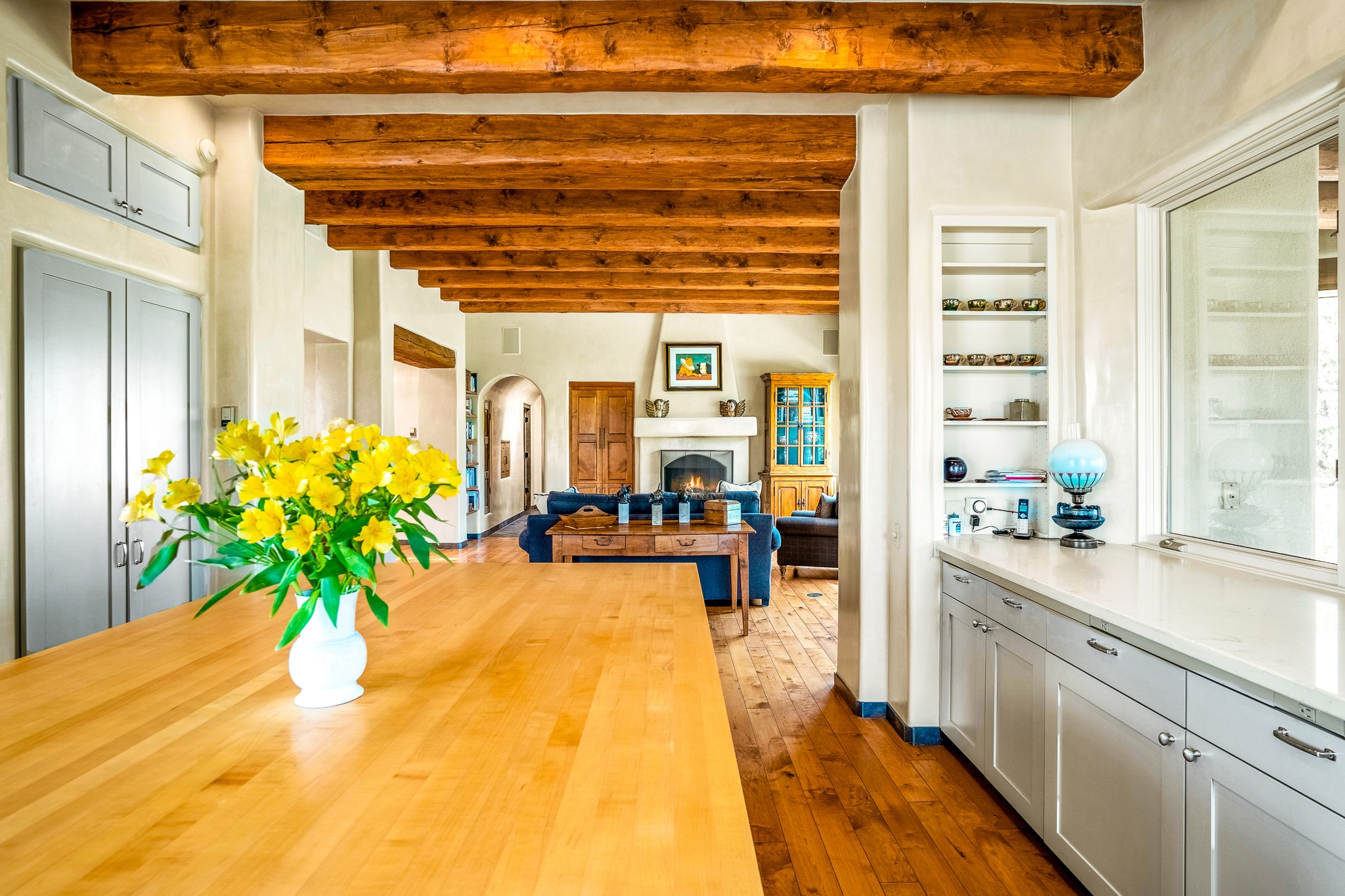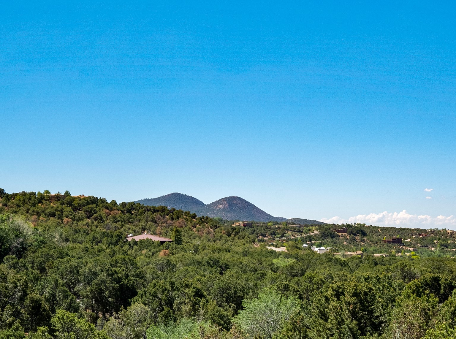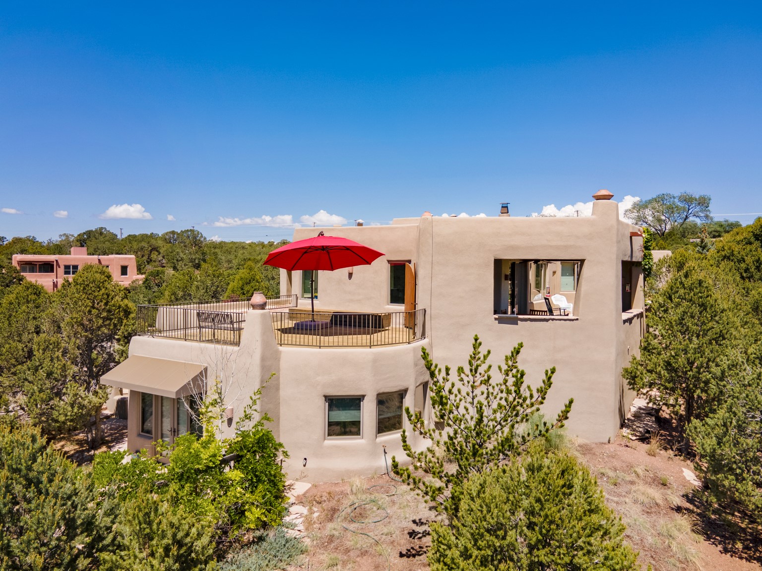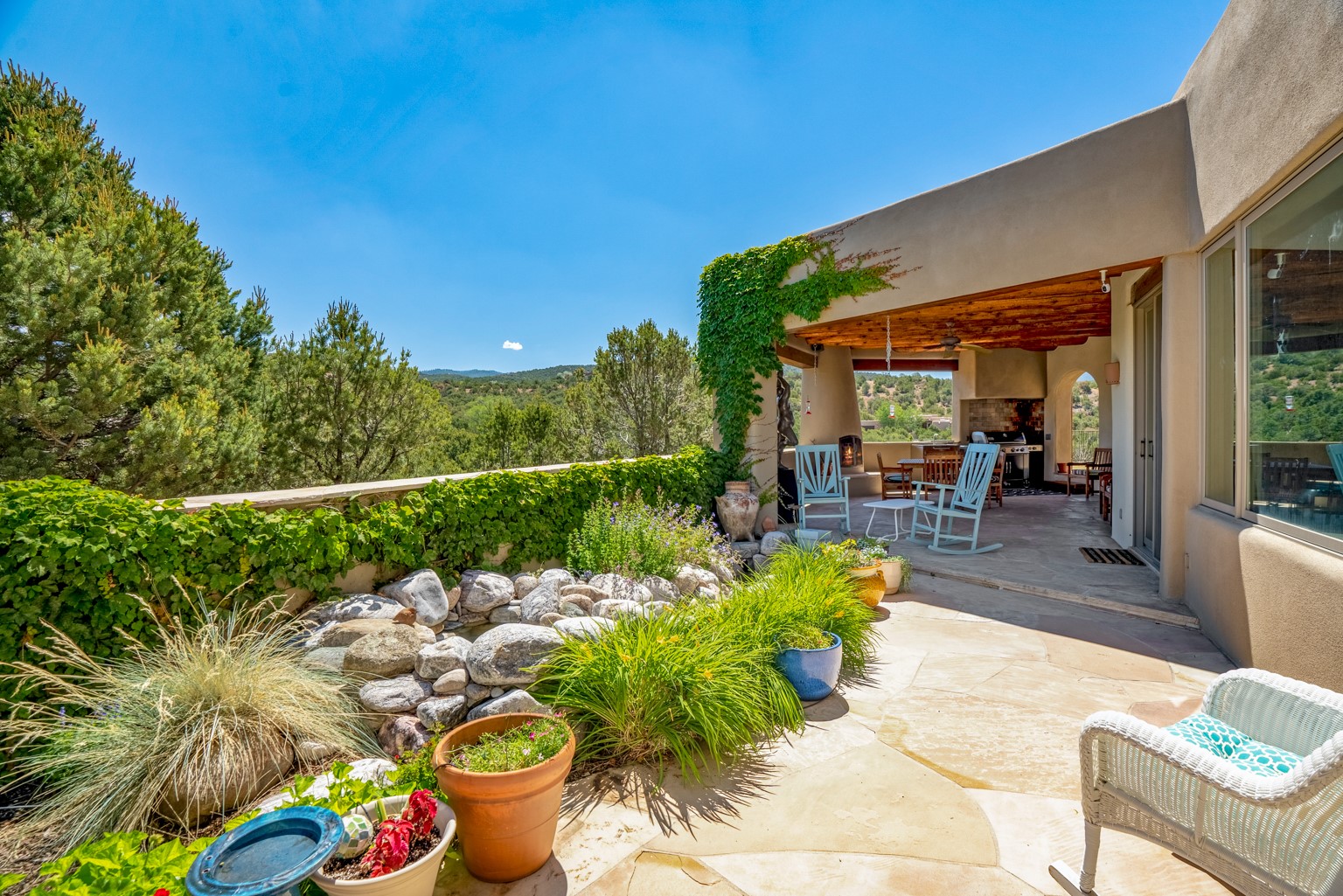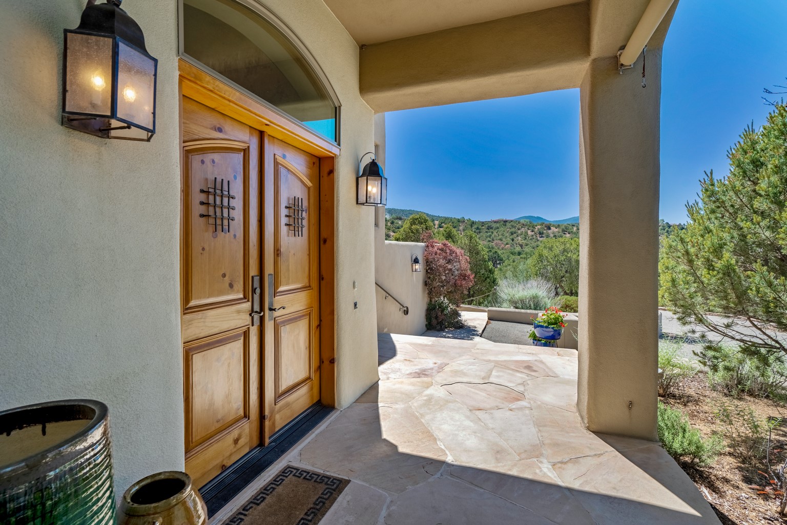 Beautiful and privately located house with guest casita that takes advantages of the mountain views. The main house with two bedrooms/two full baths boasts a cook's kitchen that opens to an airy living room with large windows. Connected to the kitchen is a large portal with gas grill, wet sink, outdoor fireplace, a landscaped courtyard with small pond and elevated deck. Large primary suite with fireplace, marble floor bath with a sliding glass door to the garden, freestanding tub and separate shower, bidet and his and her closets. Included in the house is a cooled wine cellar and four car garage. The private, attached casita with one bedroom/full bath and fully equipped kitchen has a fireplace, patio and dedicated parking. The 1.34 acre property is loaded with pinons which have been lovingly cared for by the owners. And a new roof to top off all the fine details of this house. Located back off Bishop's Lodge Rd and approximately 2 miles north of the Plaza, this home is in an area with large lots with underground utilities to better take advantage of the mountain views.