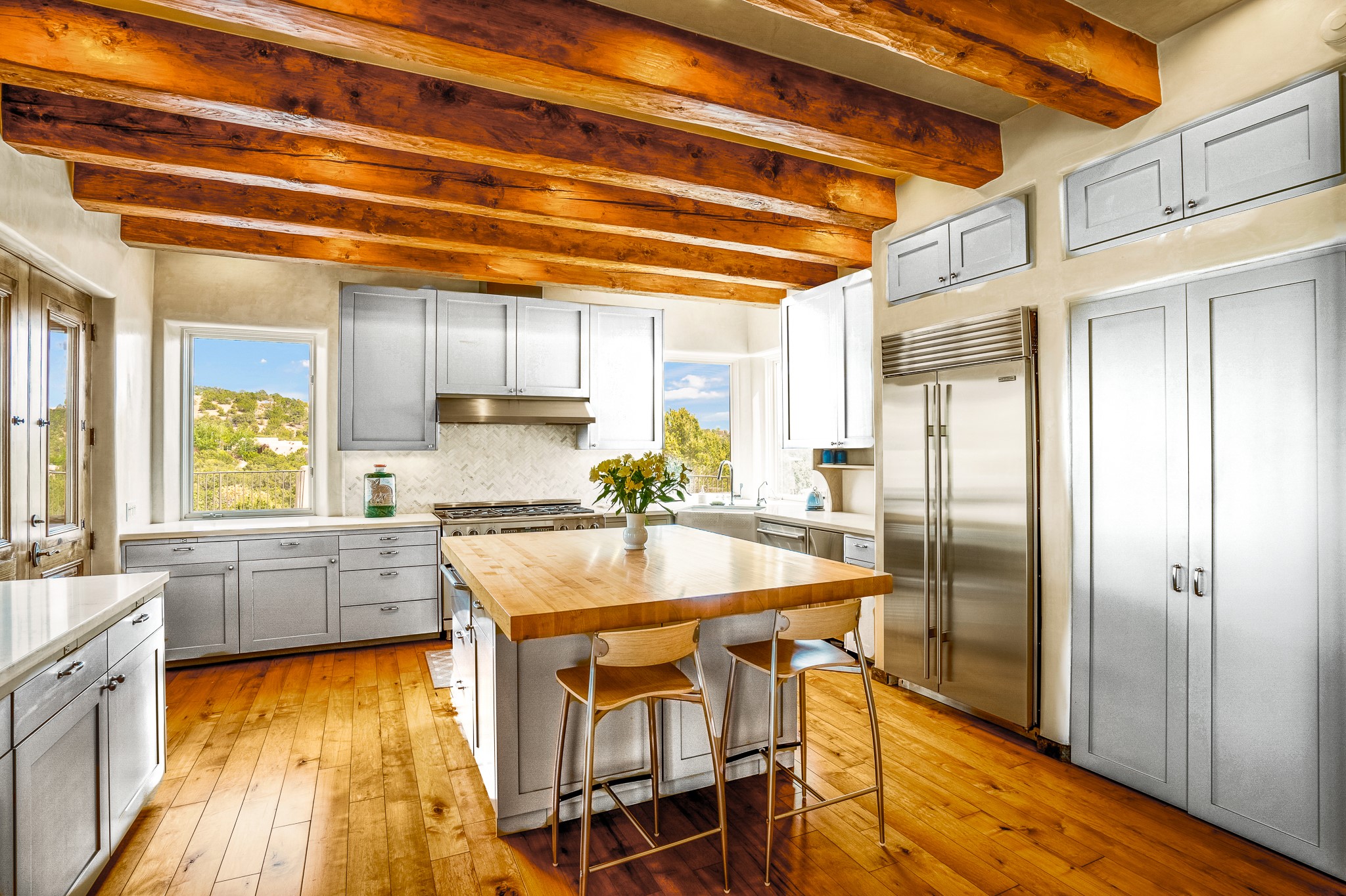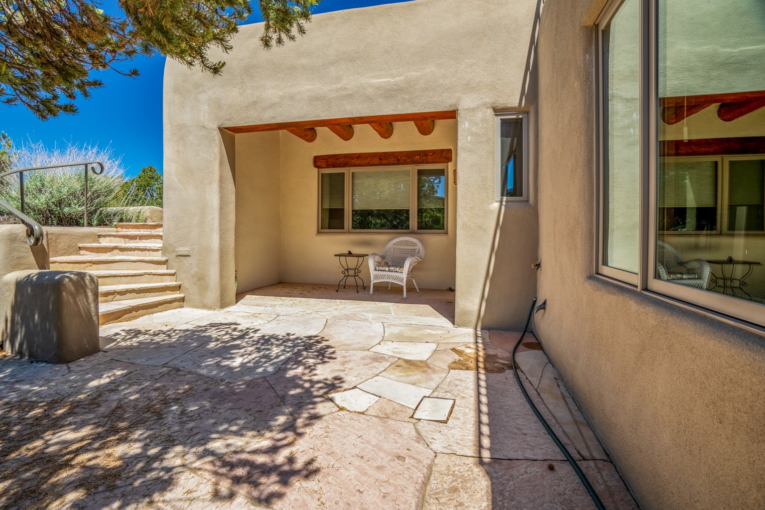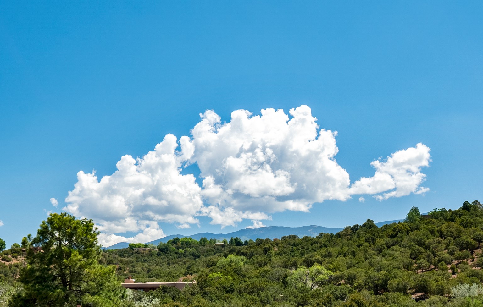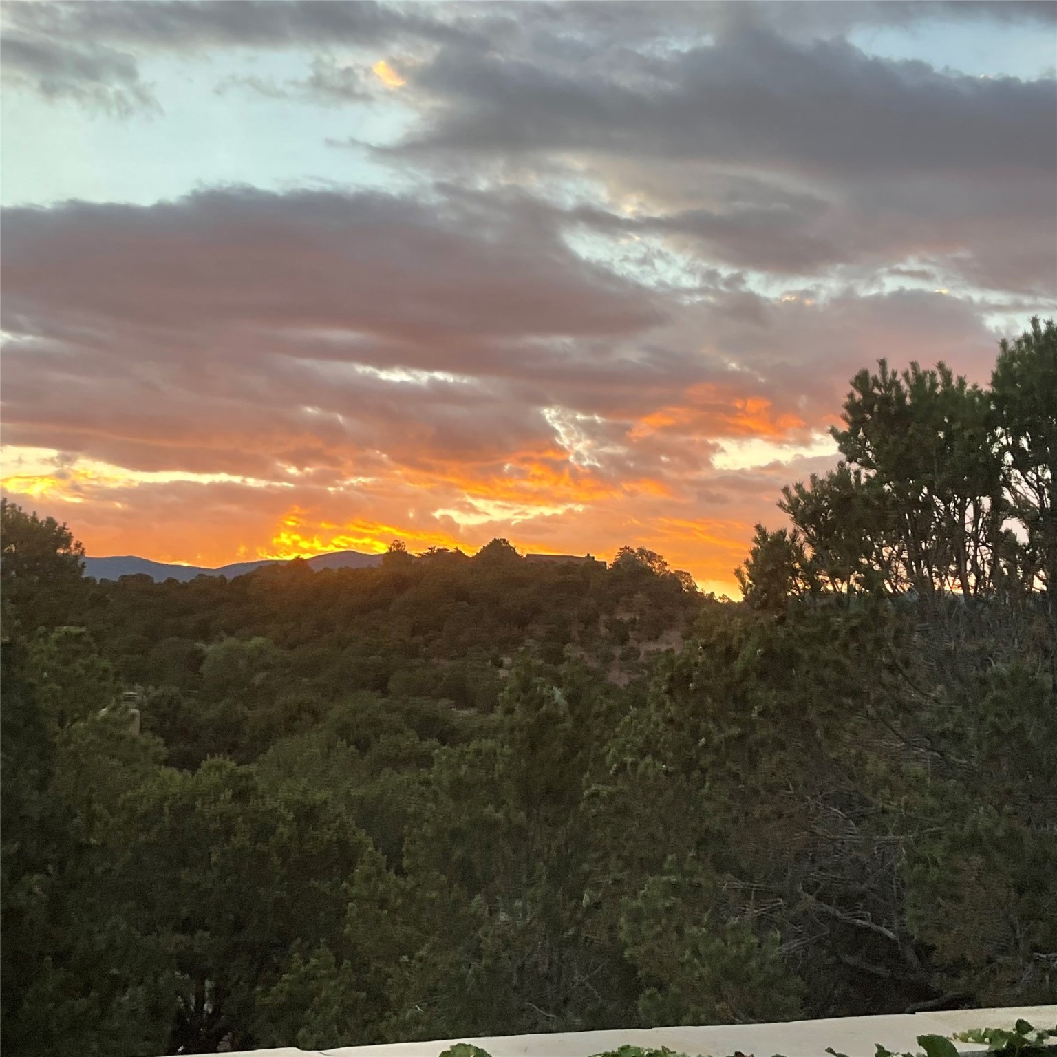 Beautiful and privately located house with guest casita that takes advantages of the mountain views. The main house with two bedrooms/two full baths boasts a cook's kitchen that opens to an airy living room with large windows. Connected to the kitchen is a large portal with gas grill, wet sink, outdoor fireplace, a landscaped courtyard with small pond and elevated deck. Large primary suite with fireplace, marble floor bath with a sliding glass door to the garden, freestanding tub and separate shower, bidet and his and her closets. Included in the house is a cooled wine cellar and four car garage. The private, attached casita with one bedroom/full bath and fully equipped kitchen has a fireplace, patio and dedicated parking. The 1.34 acre property is loaded with pinons which have been lovingly cared for by the owners. And a new roof to top off all the fine details of this house. Located back off Bishop's Lodge Rd and approximately 2 miles north of the Plaza, this home is in an area with large lots with underground utilities to better take advantage of the mountain views.