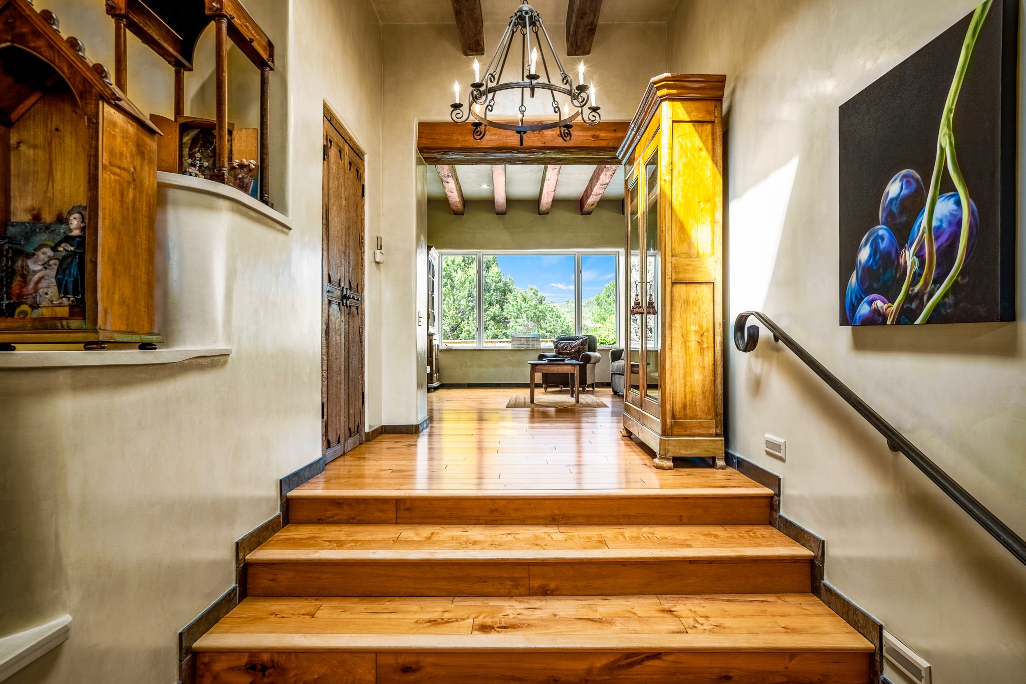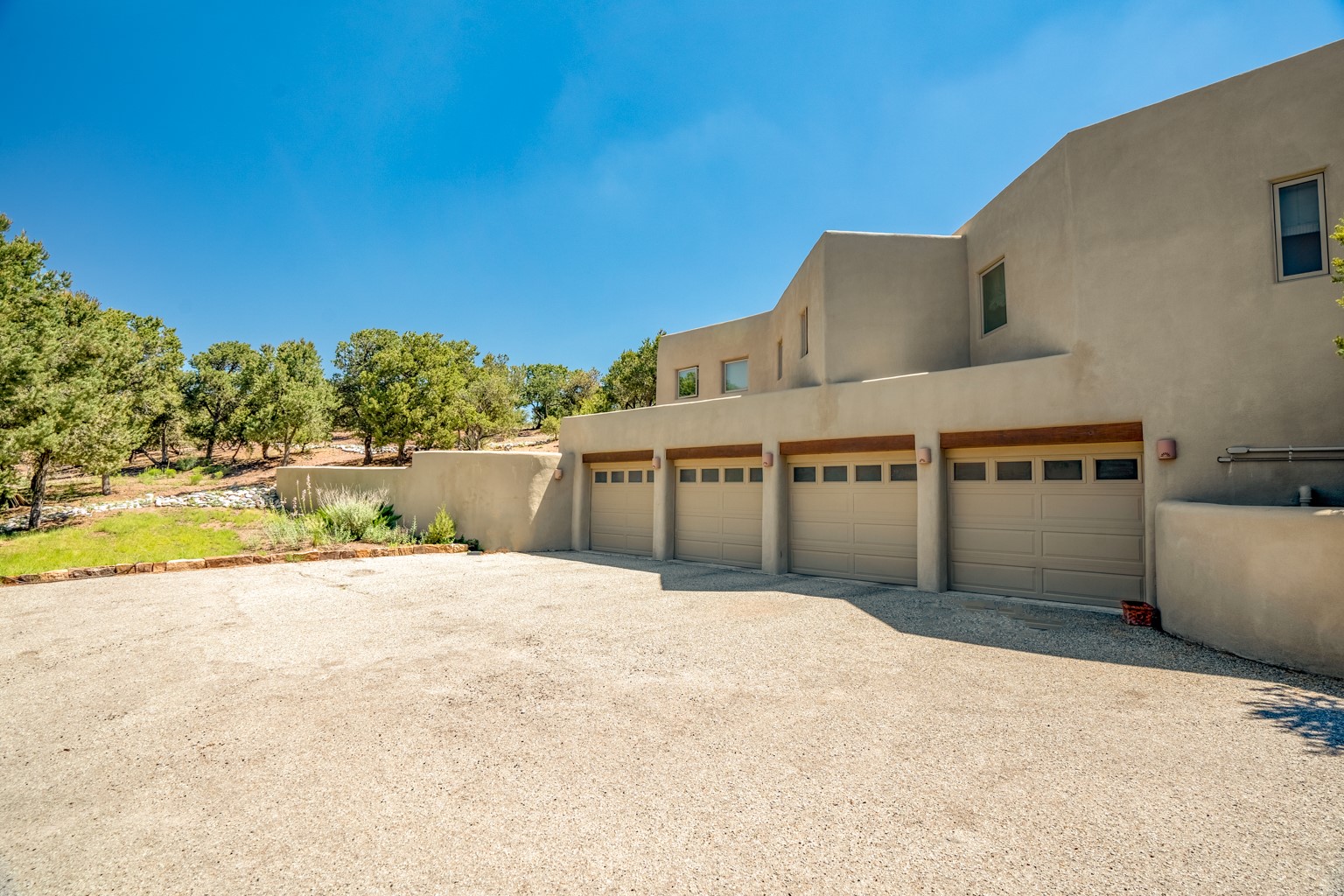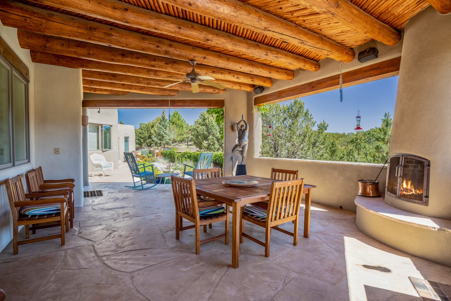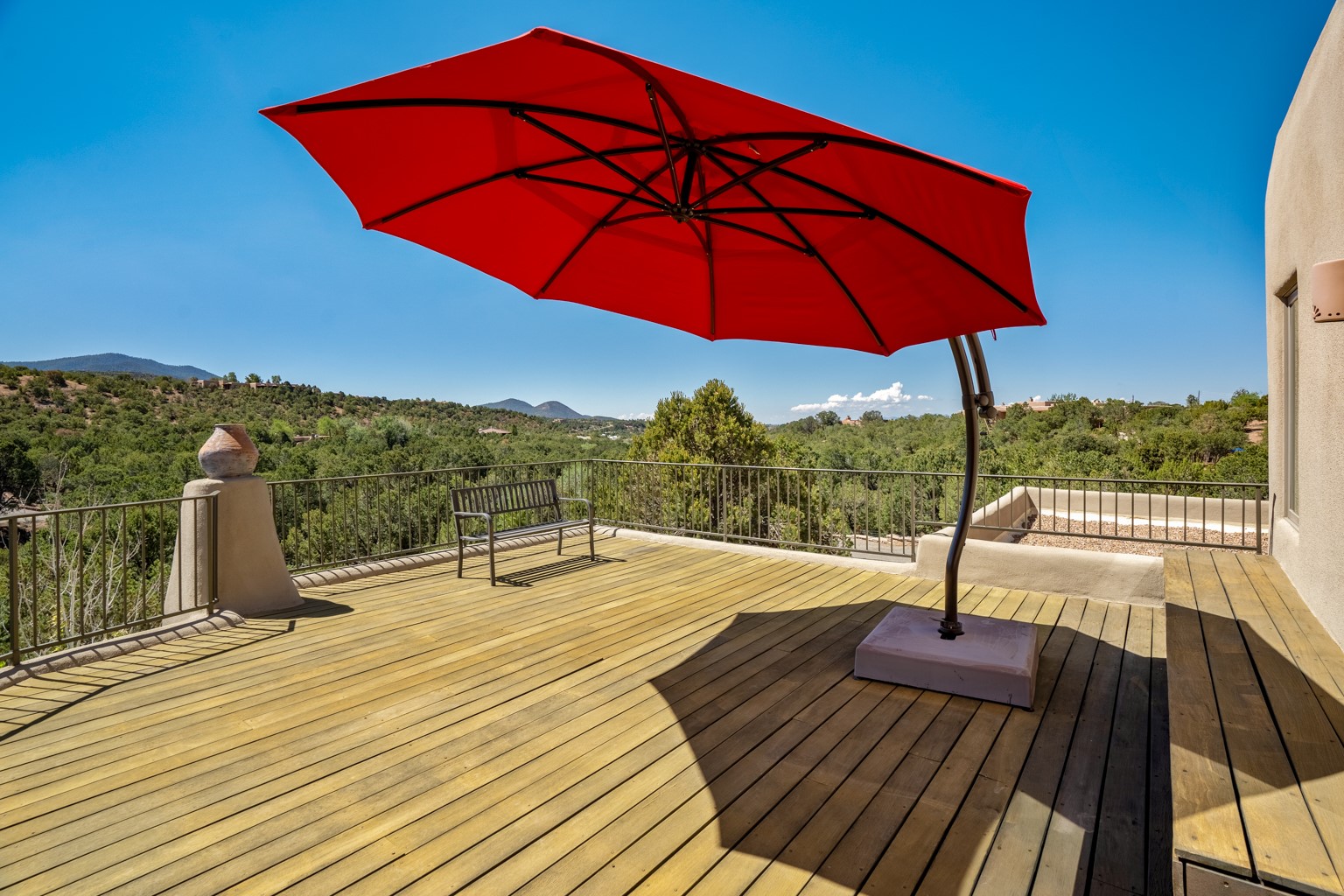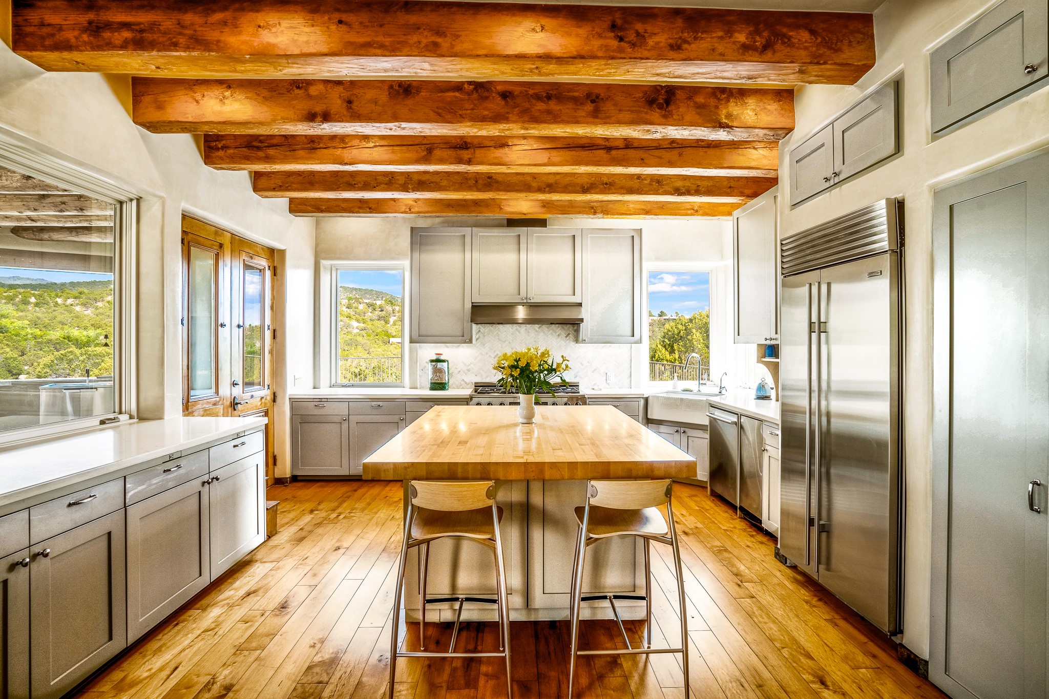 Beautiful and privately located house with guest casita that takes advantages of the mountain views. The main house with two bedrooms/two full baths boasts a cook's kitchen that opens to an airy living room with large windows. Connected to the kitchen is a large portal with gas grill, wet sink, outdoor fireplace, a landscaped courtyard with small pond and elevated deck. Large primary suite with fireplace, marble floor bath with a sliding glass door to the garden, freestanding tub and separate shower, bidet and his and her closets. Included in the house is a cooled wine cellar and four car garage. The private, attached casita with one bedroom/full bath and fully equipped kitchen has a fireplace, patio and dedicated parking. The 1.34 acre property is loaded with pinons which have been lovingly cared for by the owners. And a new roof to top off all the fine details of this house. Located back off Bishop's Lodge Rd and approximately 2 miles north of the Plaza, this home is in an area with large lots with underground utilities to better take advantage of the mountain views.
