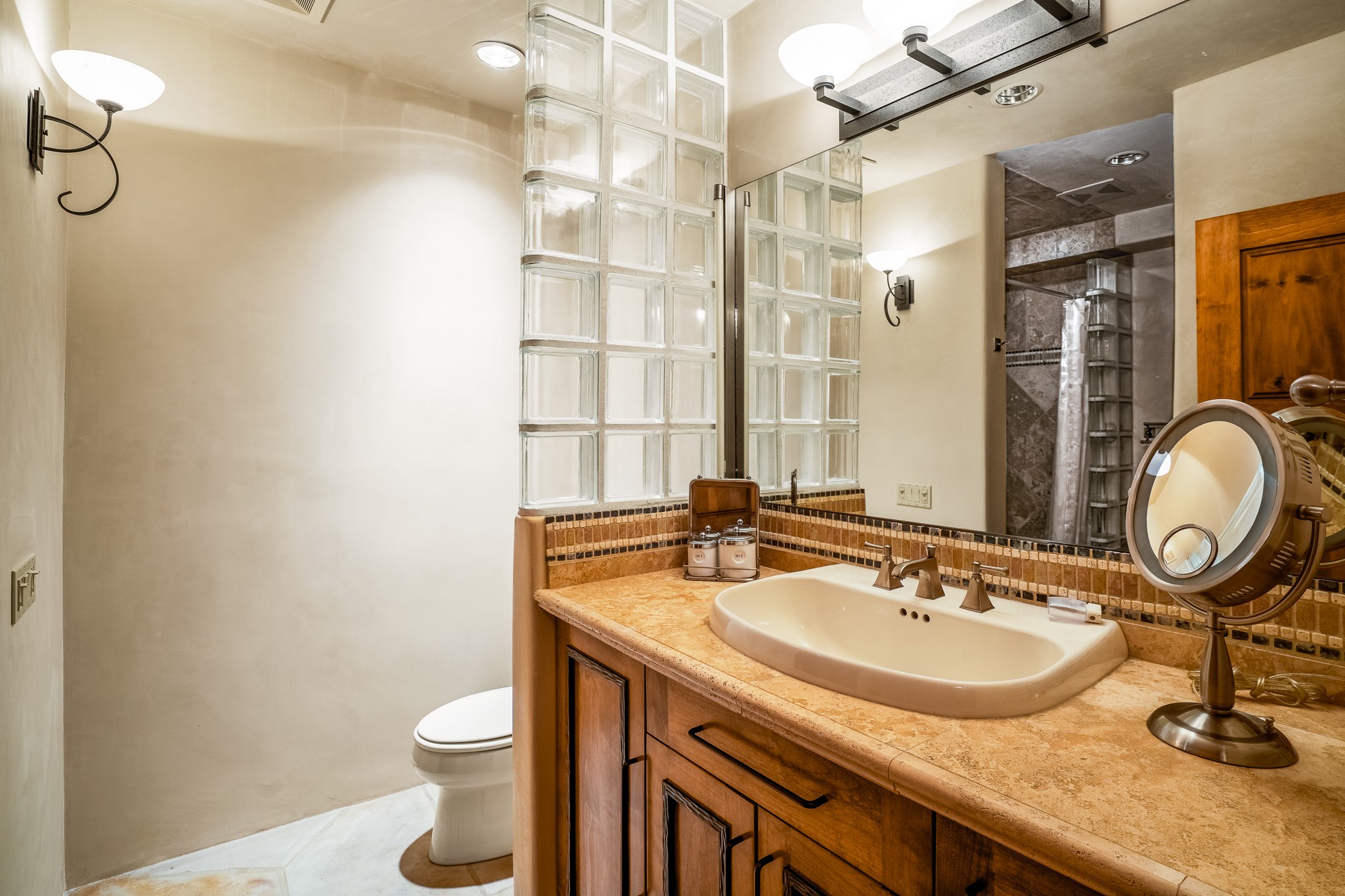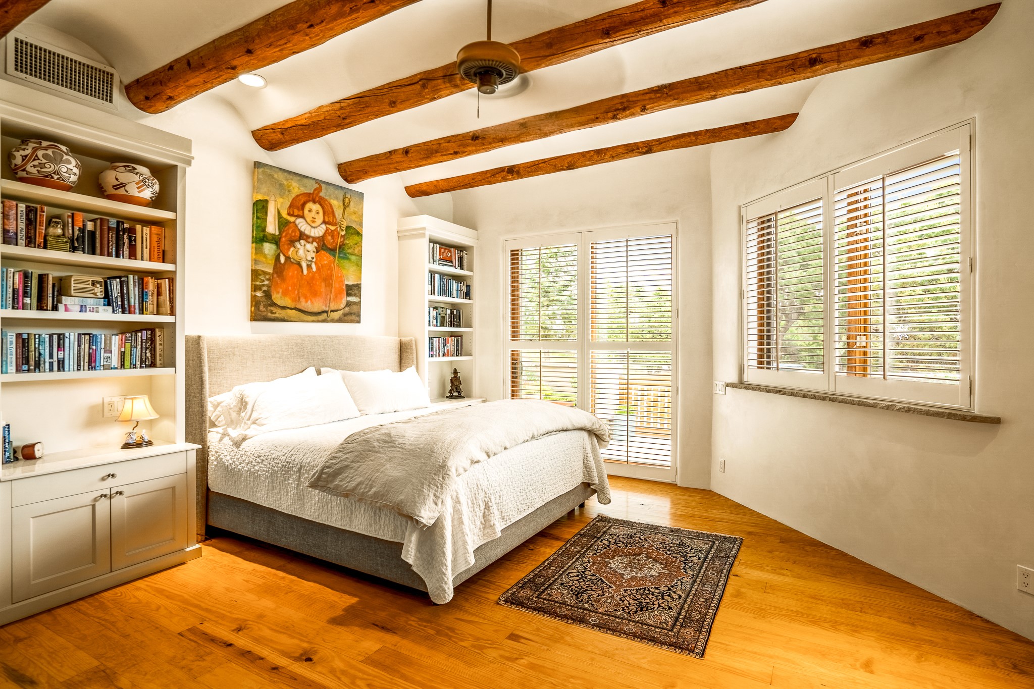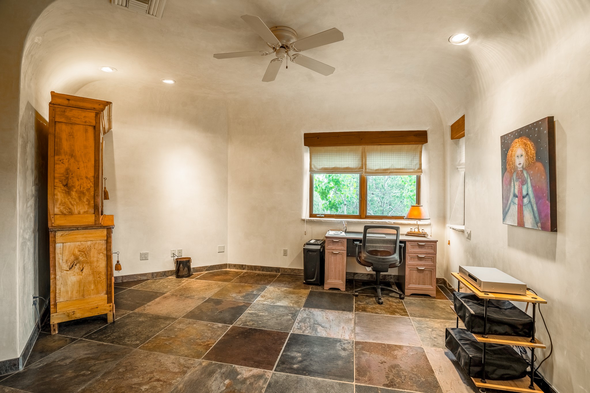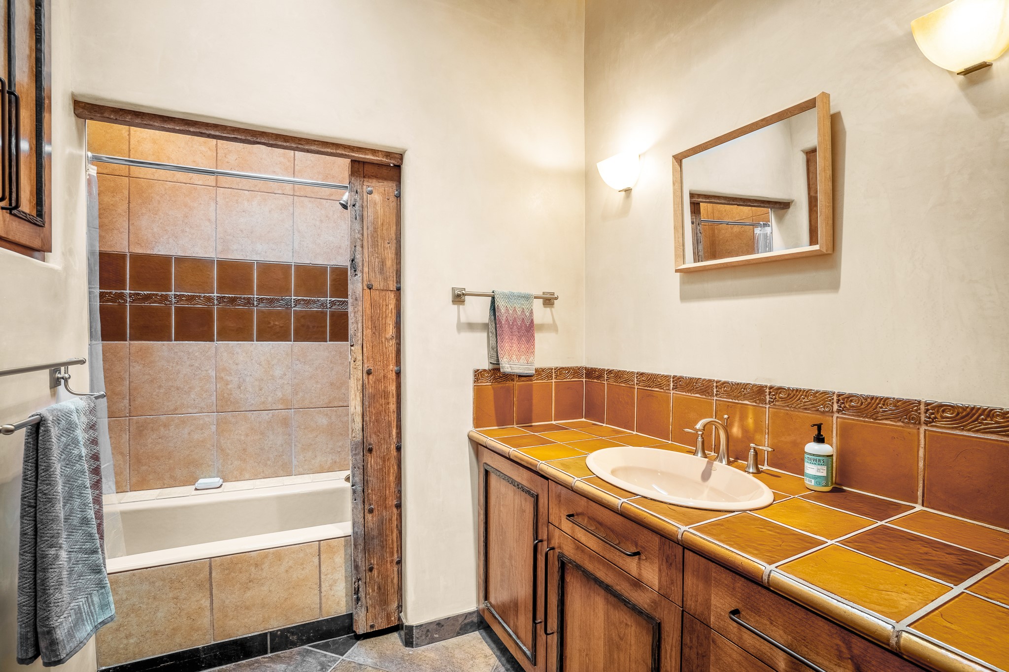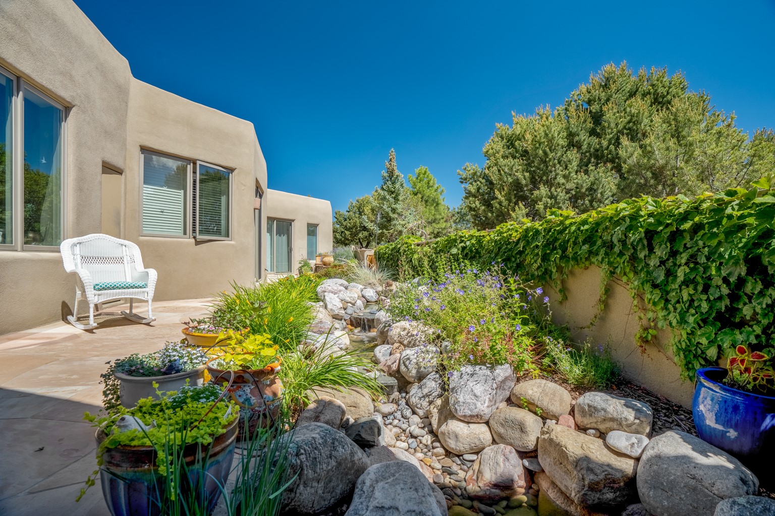 Beautiful and privately located house with guest casita that takes advantages of the mountain views. The main house with two bedrooms/two full baths boasts a cook's kitchen that opens to an airy living room with large windows. Connected to the kitchen is a large portal with gas grill, wet sink, outdoor fireplace, a landscaped courtyard with small pond and elevated deck. Large primary suite with fireplace, marble floor bath with a sliding glass door to the garden, freestanding tub and separate shower, bidet and his and her closets. Included in the house is a cooled wine cellar and four car garage. The private, attached casita with one bedroom/full bath and fully equipped kitchen has a fireplace, patio and dedicated parking. The 1.34 acre property is loaded with pinons which have been lovingly cared for by the owners. And a new roof to top off all the fine details of this house. Located back off Bishop's Lodge Rd and approximately 2 miles north of the Plaza, this home is in an area with large lots with underground utilities to better take advantage of the mountain views.