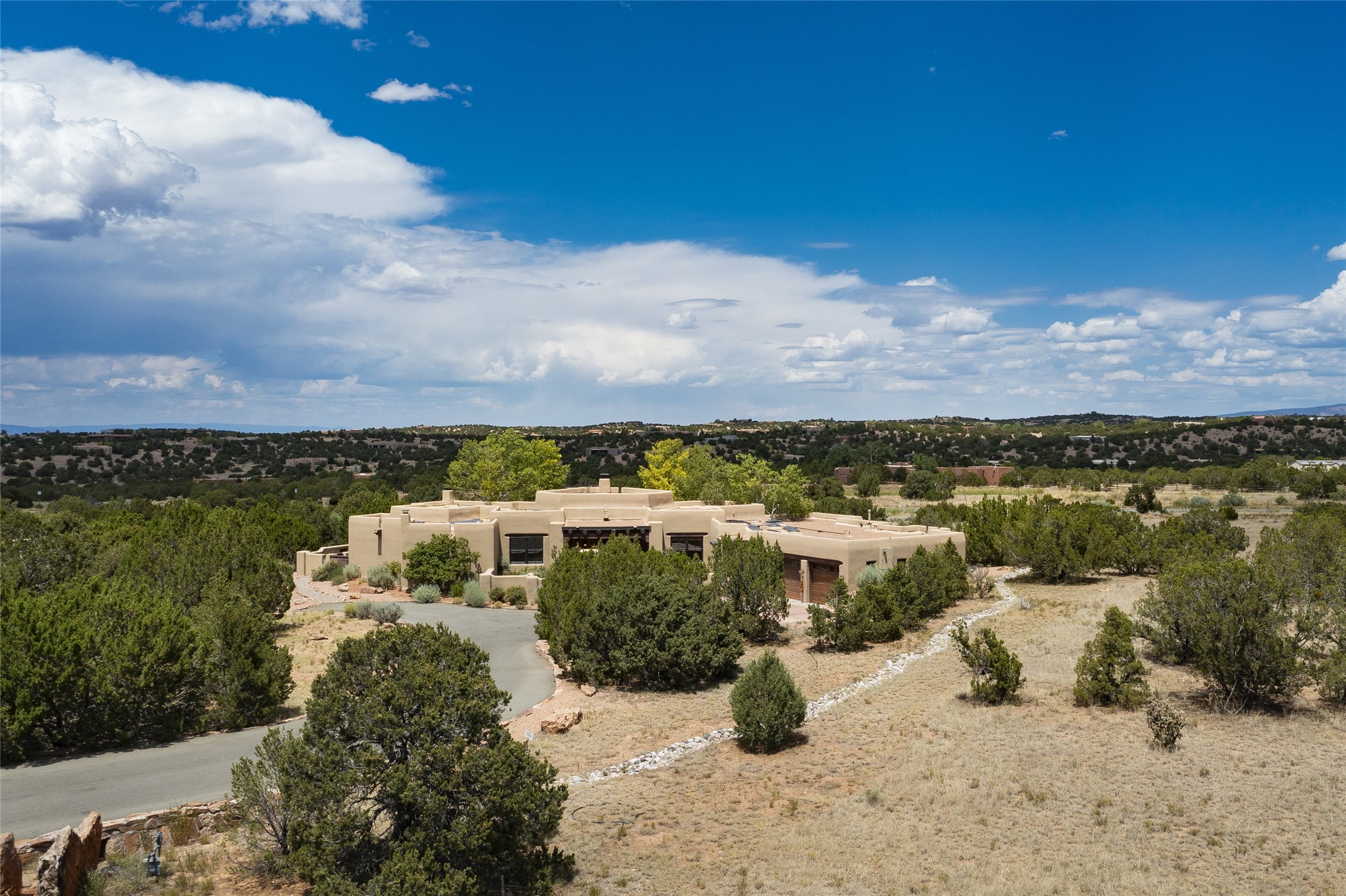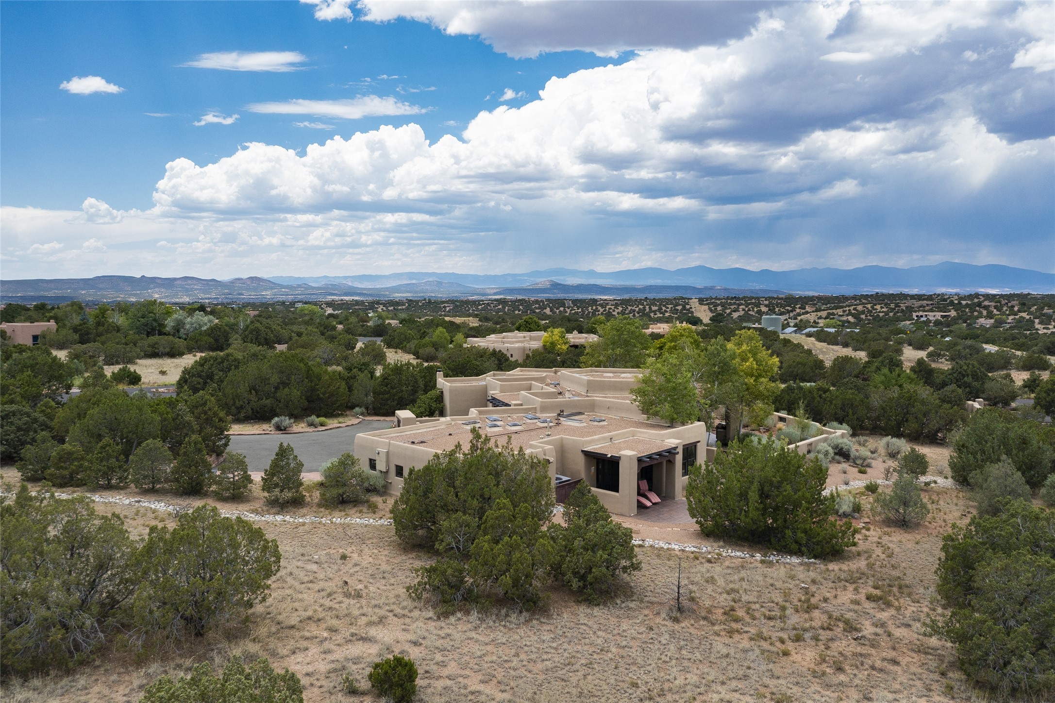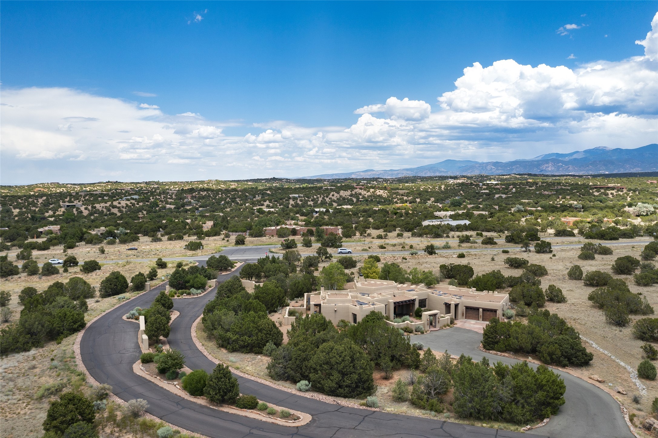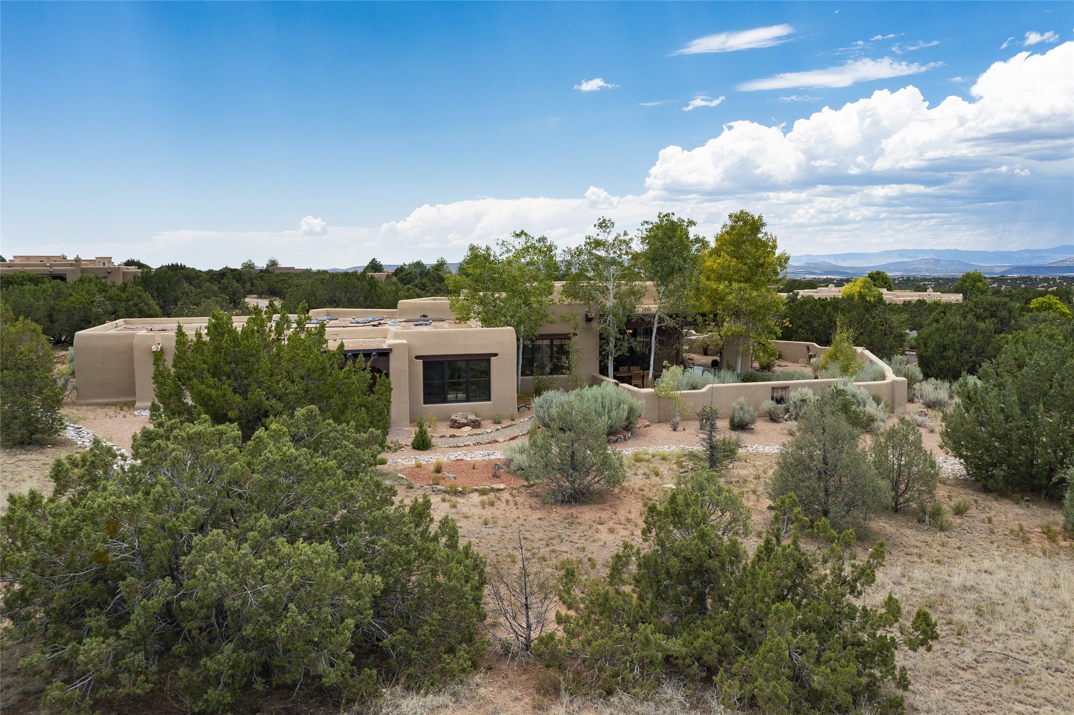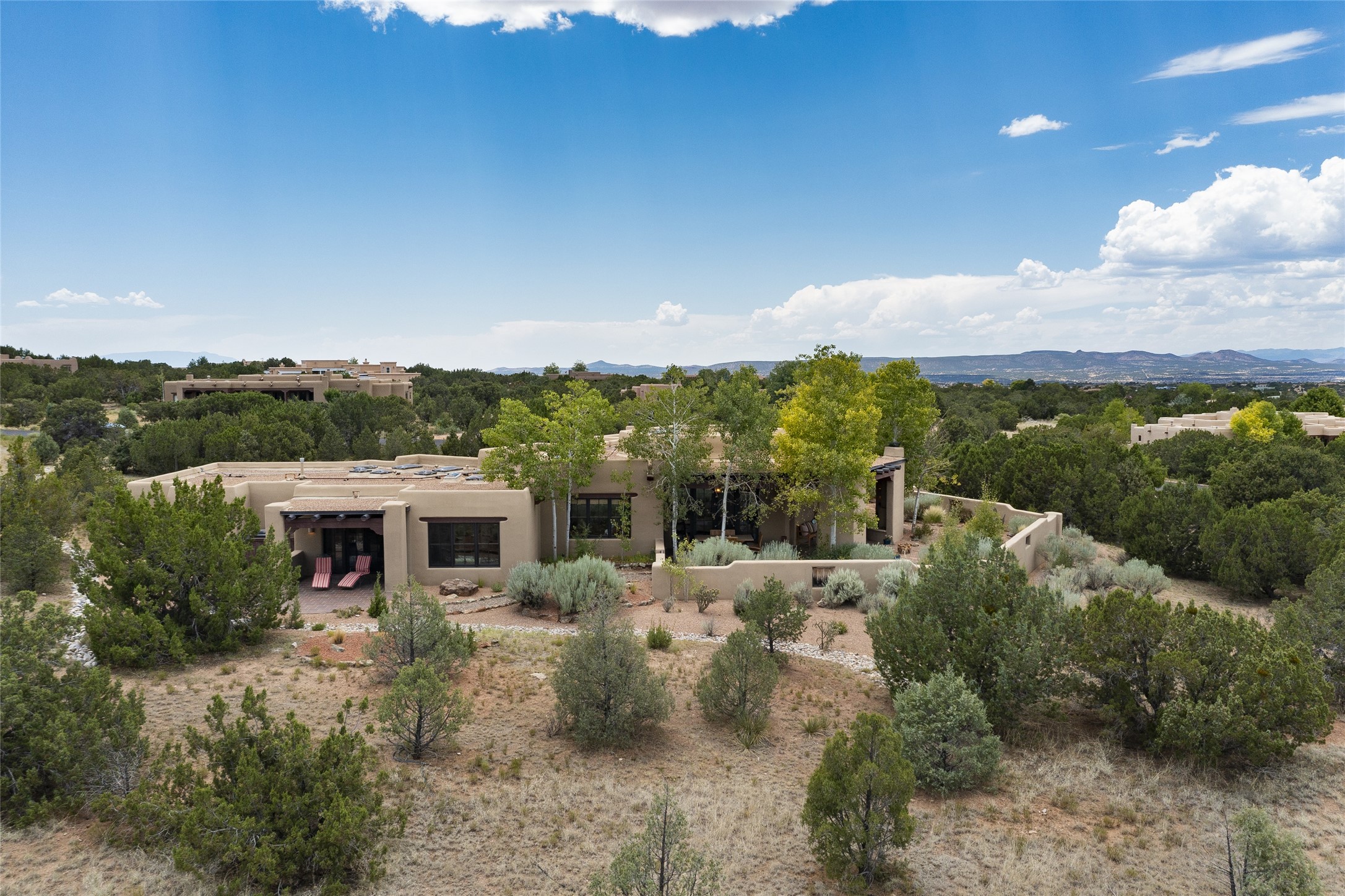 Timeless Santa Fe architecture, spectacular Sangre de Cristo and Jemez Mountain views, and superior outdoor living areas are celebrated at this exciting residence built by renowned builder, Michael Kern. Centrally located within the master planned community of Las Campanas, minutes to the Plaza and The Club at Las Campanas, this exquisite home impresses with exceptional design and the highest level of craftsmanship throughout. Designed to embrace the ultimate Santa Fe lifestyle, this quality single level home offers an excellent separation of space, with a private owner's suite complete with a fireplace, portal access, a tranquil spa-like bath with a jetted tub, dual vanities, walk-in shower and a large walk-in closet. Guests enjoy their own separate guest wing complete with two ensuite bedrooms with Sangre De Cristo Mountain views, private portals and separate entrances. Located off the front entrance is a well-appointed office or ideal fourth bedroom, with custom built-in cabinetry and courtyard views. The spacious chef's kitchen, ideal for entertaining, delights with luxury appliances including a 6-burner gas range with a griddle and double ovens, a free-standing island, and a breakfast bar, all of which open to the spacious living room with a grand fireplace, dining room, and all outdoor living areas. The outdoor living experience is enhanced by deep surround portals, a park-like setting, fully enclosed front and back walled courtyards with an outdoor built-in BBQ, water feature, and expansive back outdoor dining with views of the Sangre de Cristo Mountains. Luxury finishes include plaster walls, rich wood ceiling accents with vigas and corbels throughout, 22 skylights, and rare old-world craftsmanship throughout this one of kind residence. The owner's Equity Golf Membership to The Club at Las Campanas is available for purchase on a separate bill of sale.