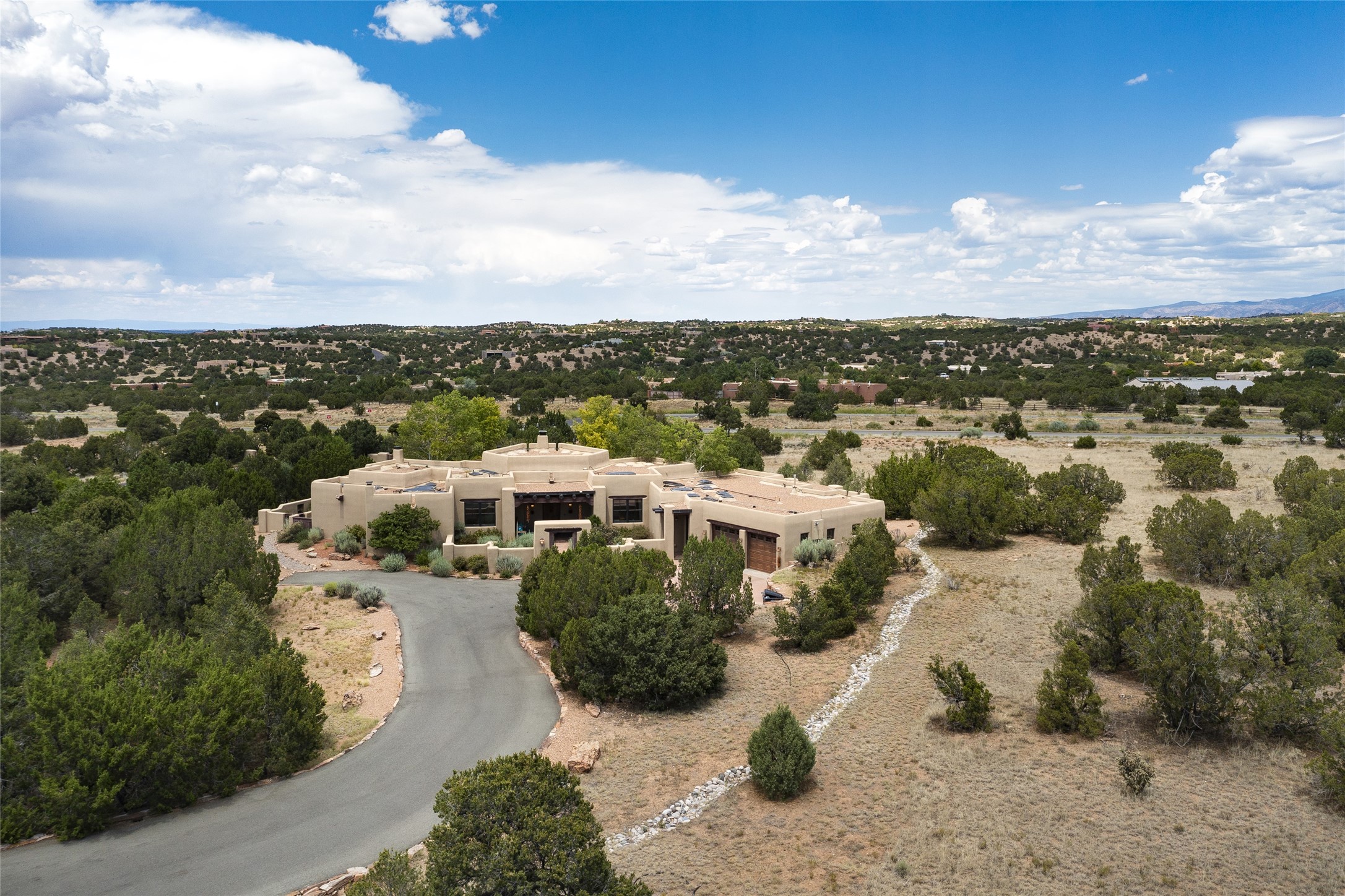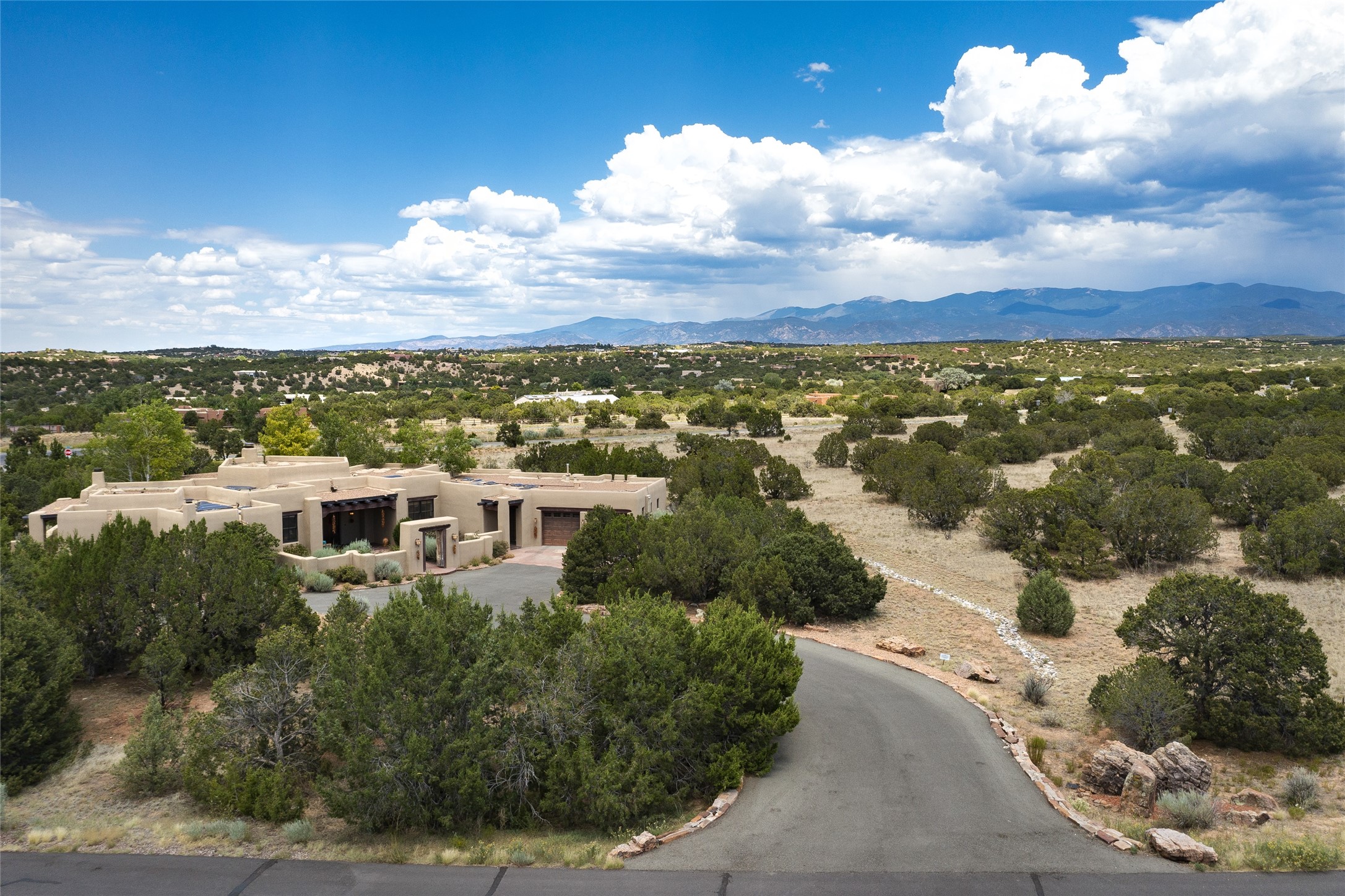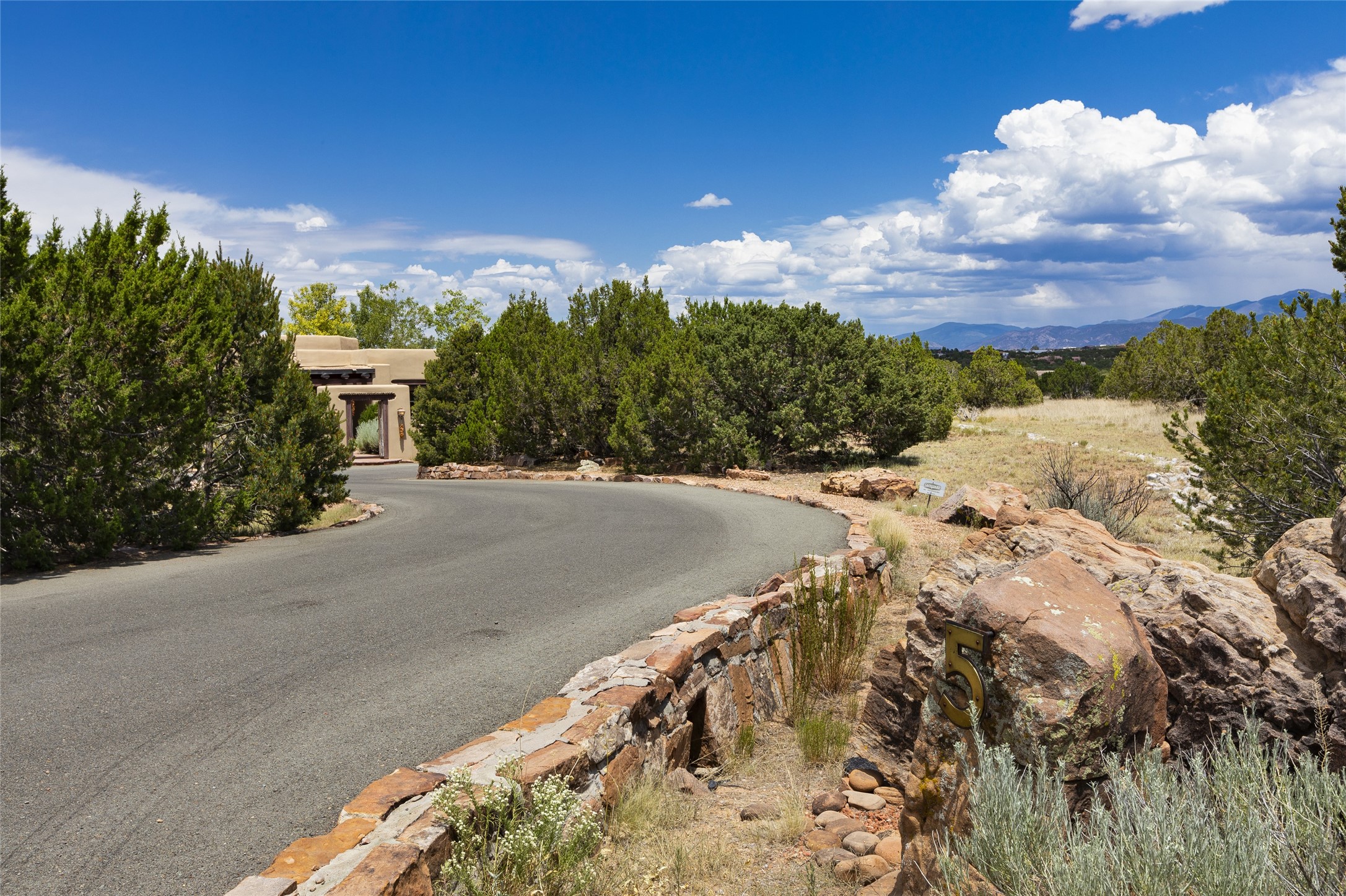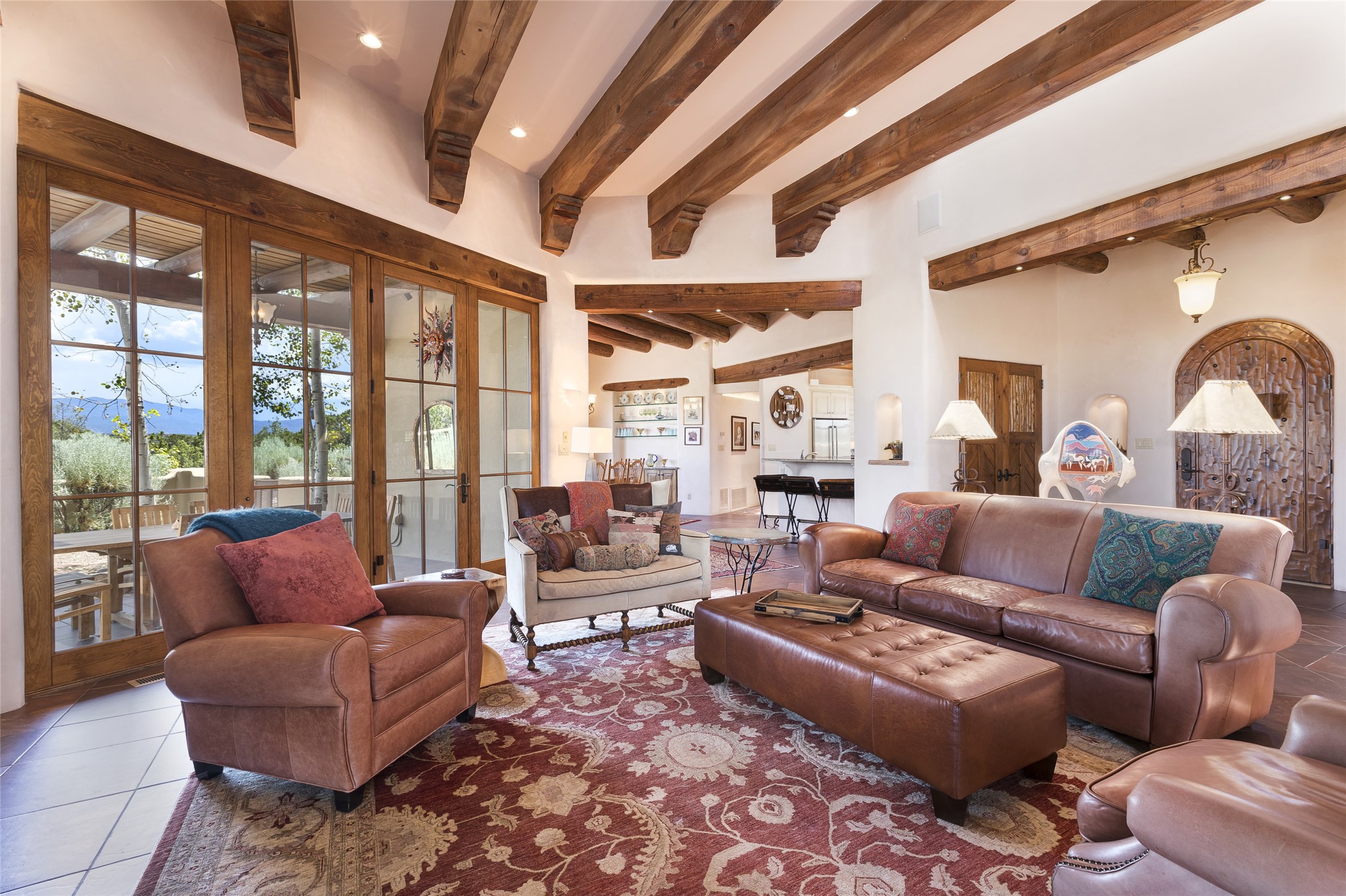Timeless Santa Fe architecture, spectacular Sangre de Cristo and Jemez Mountain views, and superior outdoor living areas are celebrated at this exciting residence built by renowned builder, Michael Kern. Centrally located within the master planned community of Las Campanas, minutes to the Plaza and The Club at Las Campanas, this exquisite home impresses with exceptional design and the highest level of craftsmanship throughout. Designed to embrace the ultimate Santa Fe lifestyle, this quality single level home offers an excellent separation of space, with a private owner's suite complete with a fireplace, portal access, a tranquil spa-like bath with a jetted tub, dual vanities, walk-in shower and a large walk-in closet. Guests enjoy their own separate guest wing complete with two ensuite bedrooms with Sangre De Cristo Mountain views, private portals and separate entrances. Located off the front entrance is a well-appointed office or ideal fourth bedroom, with custom built-in cabinetry and courtyard views. The spacious chef's kitchen, ideal for entertaining, delights with luxury appliances including a 6-burner gas range with a griddle and double ovens, a free-standing island, and a breakfast bar, all of which open to the spacious living room with a grand fireplace, dining room, and all outdoor living areas. The outdoor living experience is enhanced by deep surround portals, a park-like setting, fully enclosed front and back walled courtyards with an outdoor built-in BBQ, water feature, and expansive back outdoor dining with views of the Sangre de Cristo Mountains. Luxury finishes include plaster walls, rich wood ceiling accents with vigas and corbels throughout, 22 skylights, and rare old-world craftsmanship throughout this one of kind residence. The owner's Equity Golf Membership to The Club at Las Campanas is available for purchase on a separate bill of sale.
