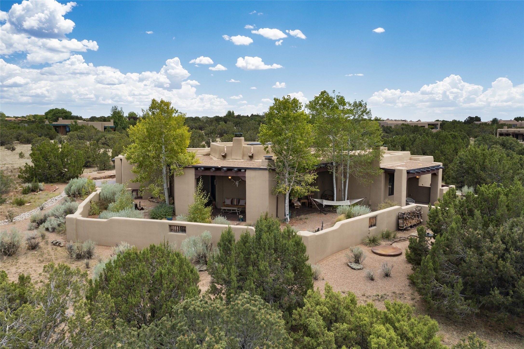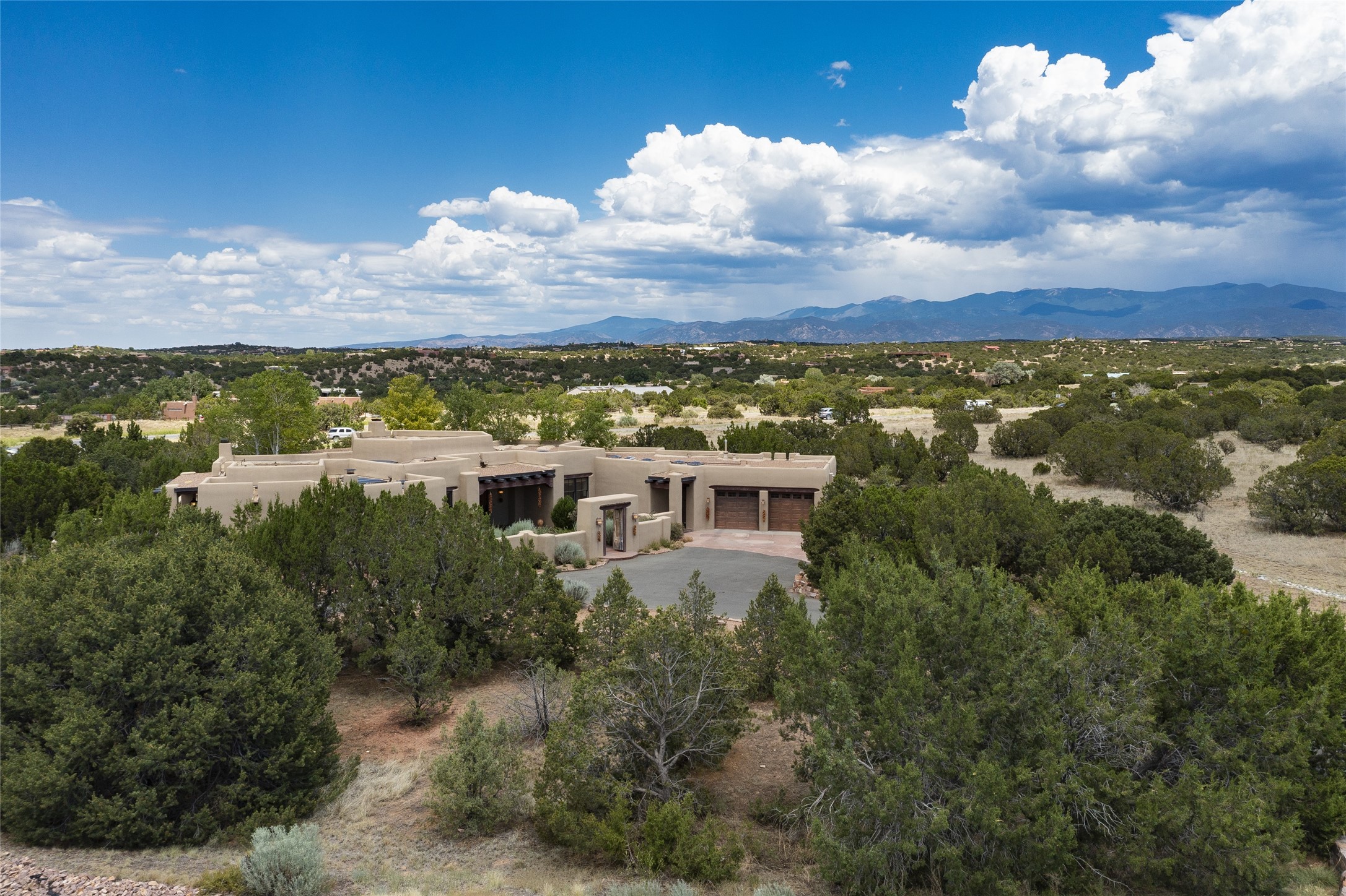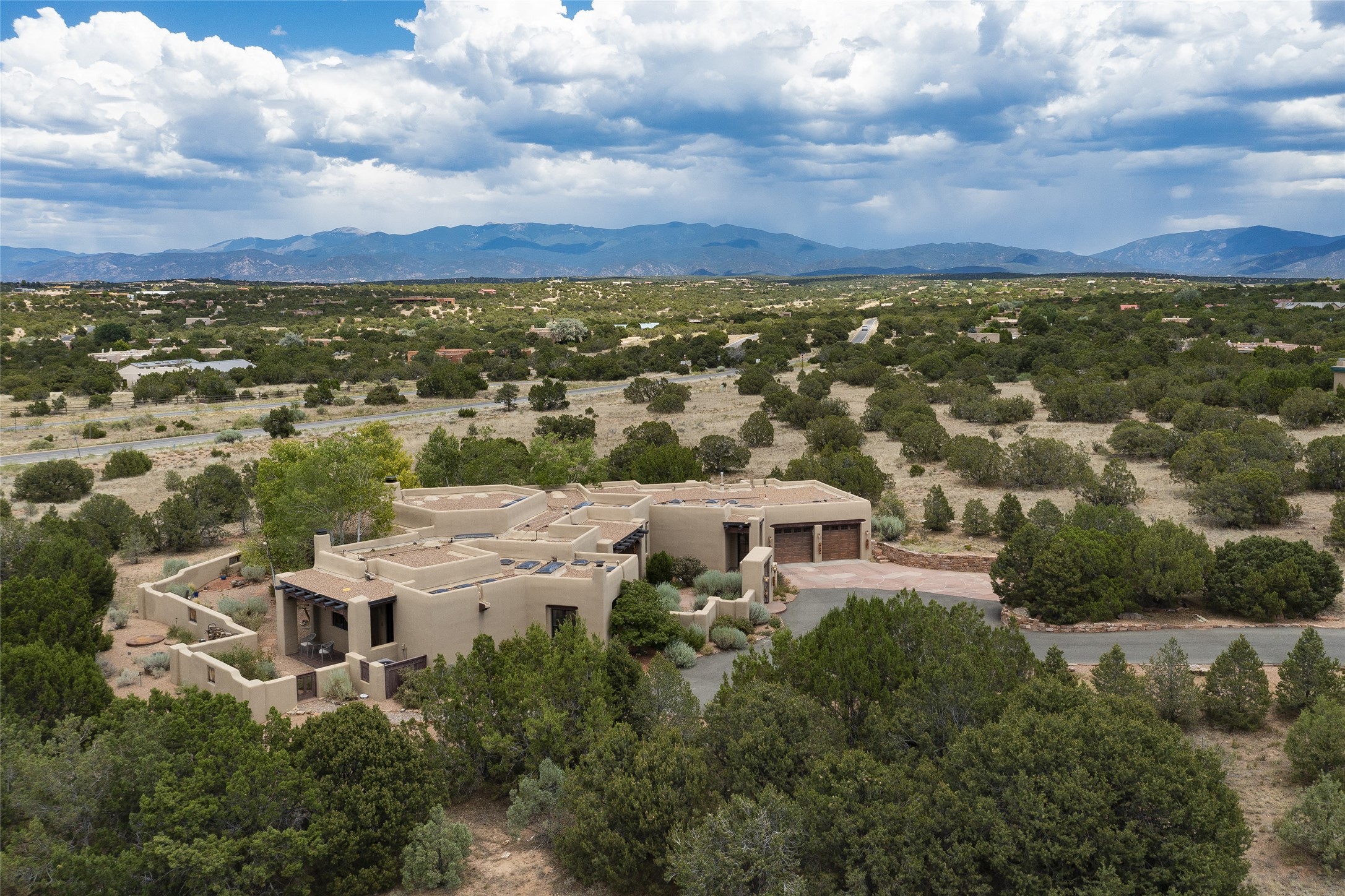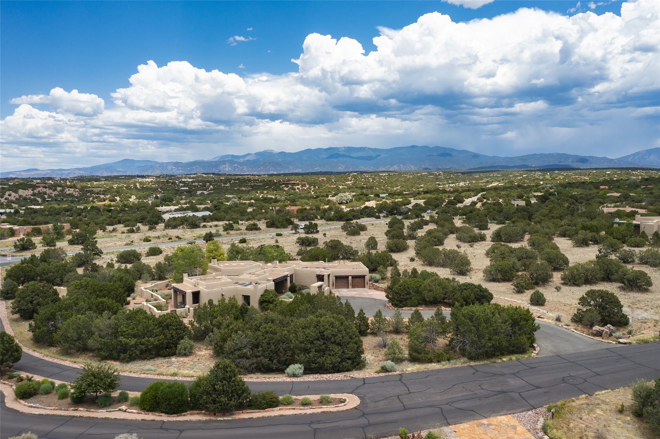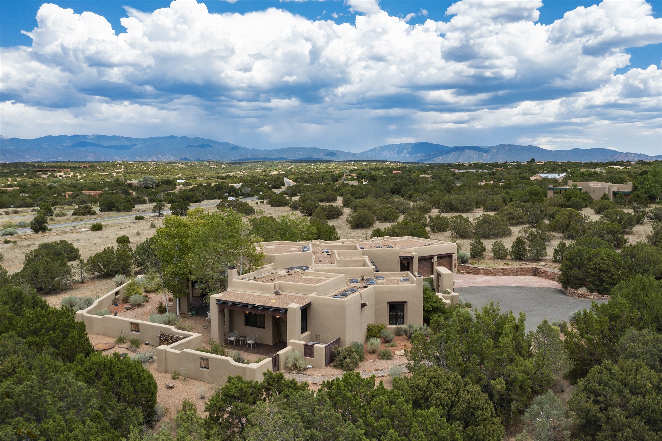 Timeless Santa Fe architecture, spectacular Sangre de Cristo and Jemez Mountain views, and superior outdoor living areas are celebrated at this exciting residence built by renowned builder, Michael Kern. Centrally located within the master planned community of Las Campanas, minutes to the Plaza and The Club at Las Campanas, this exquisite home impresses with exceptional design and the highest level of craftsmanship throughout. Designed to embrace the ultimate Santa Fe lifestyle, this quality single level home offers an excellent separation of space, with a private owner's suite complete with a fireplace, portal access, a tranquil spa-like bath with a jetted tub, dual vanities, walk-in shower and a large walk-in closet. Guests enjoy their own separate guest wing complete with two ensuite bedrooms with Sangre De Cristo Mountain views, private portals and separate entrances. Located off the front entrance is a well-appointed office or ideal fourth bedroom, with custom built-in cabinetry and courtyard views. The spacious chef's kitchen, ideal for entertaining, delights with luxury appliances including a 6-burner gas range with a griddle and double ovens, a free-standing island, and a breakfast bar, all of which open to the spacious living room with a grand fireplace, dining room, and all outdoor living areas. The outdoor living experience is enhanced by deep surround portals, a park-like setting, fully enclosed front and back walled courtyards with an outdoor built-in BBQ, water feature, and expansive back outdoor dining with views of the Sangre de Cristo Mountains. Luxury finishes include plaster walls, rich wood ceiling accents with vigas and corbels throughout, 22 skylights, and rare old-world craftsmanship throughout this one of kind residence. The owner's Equity Golf Membership to The Club at Las Campanas is available for purchase on a separate bill of sale.