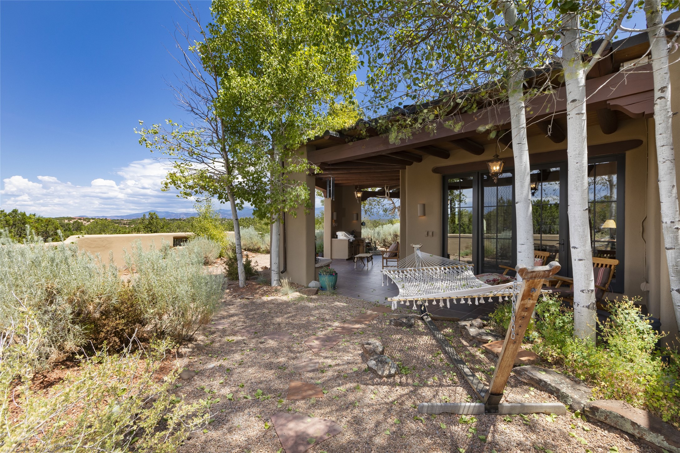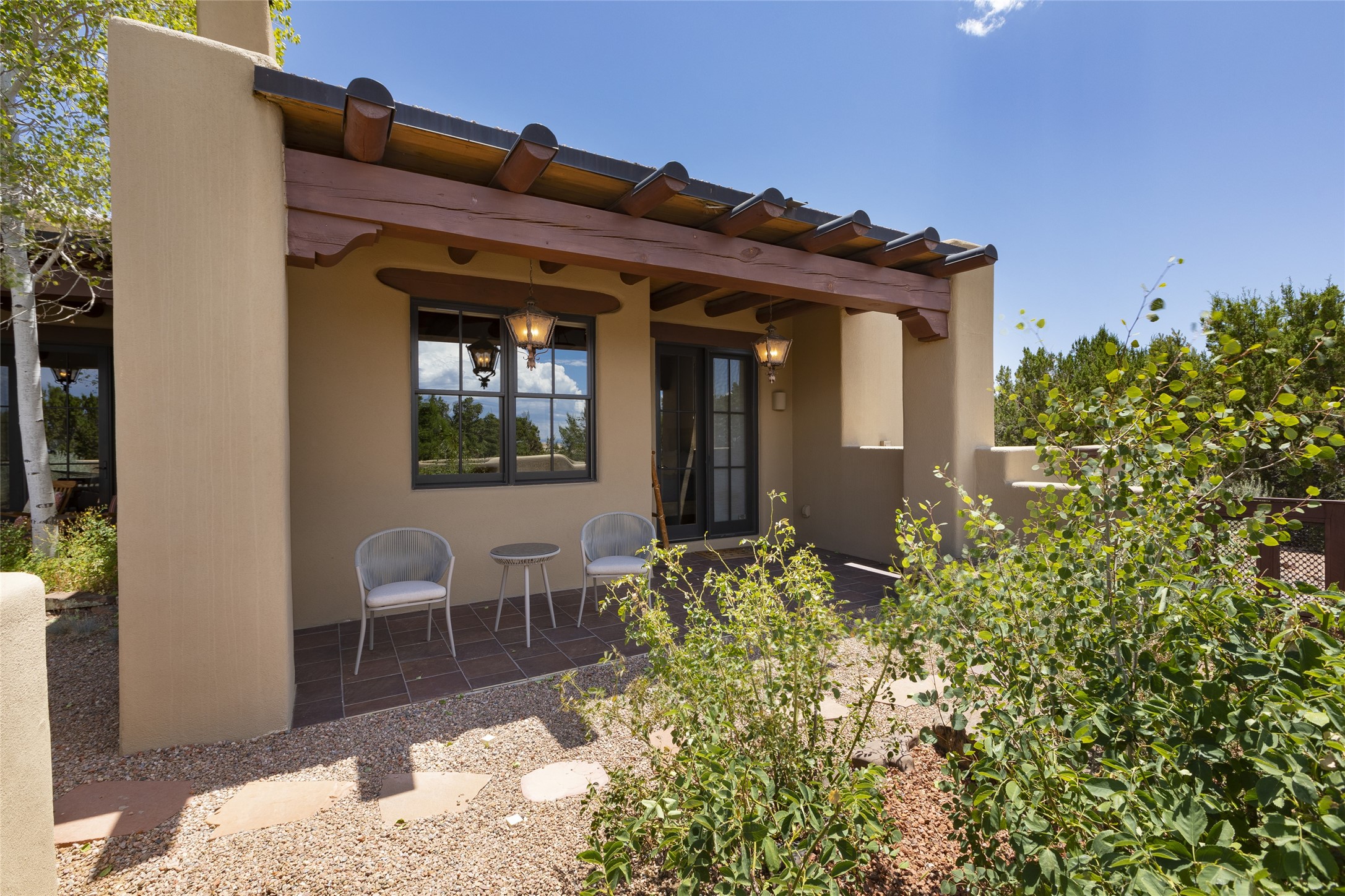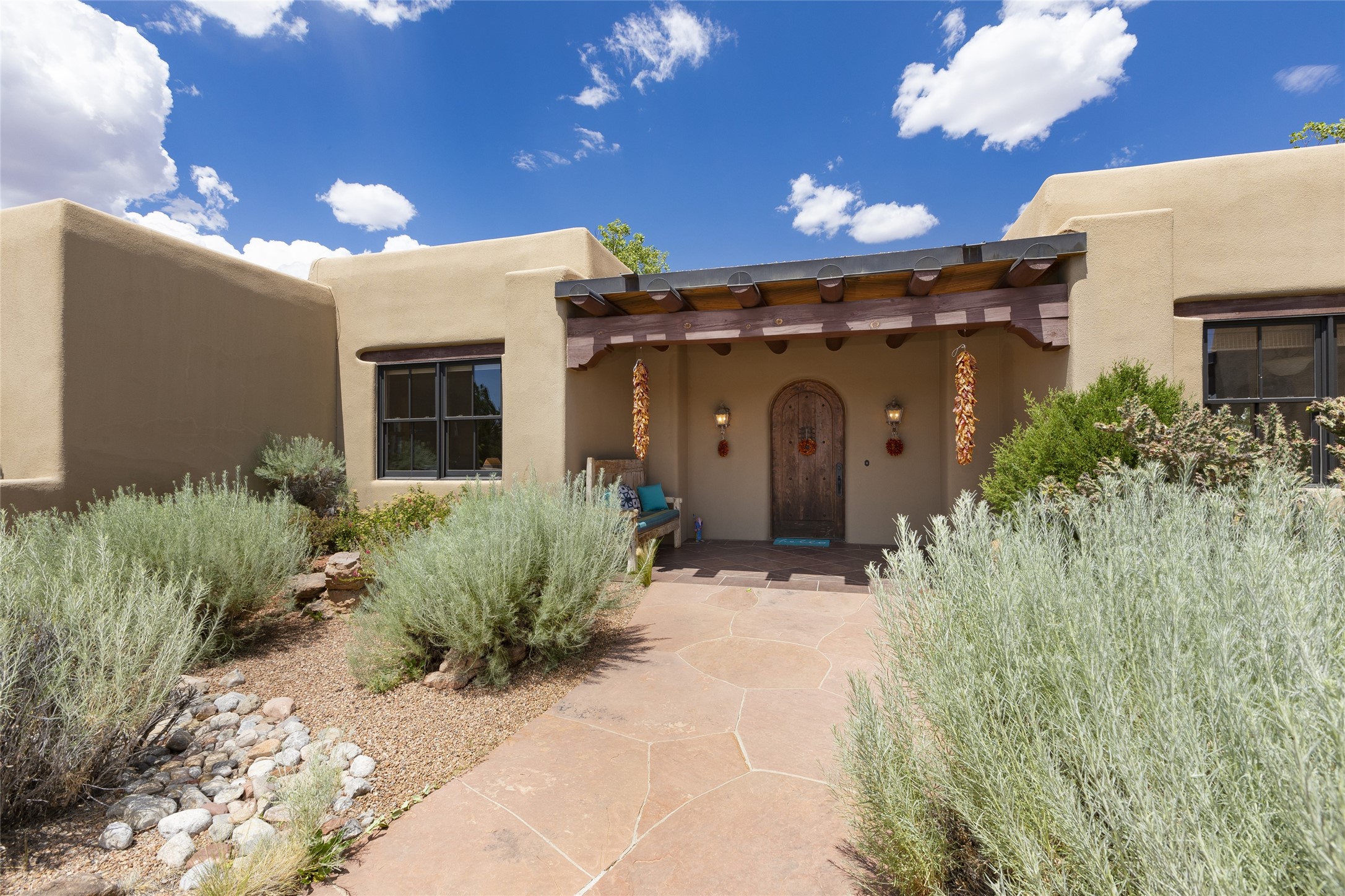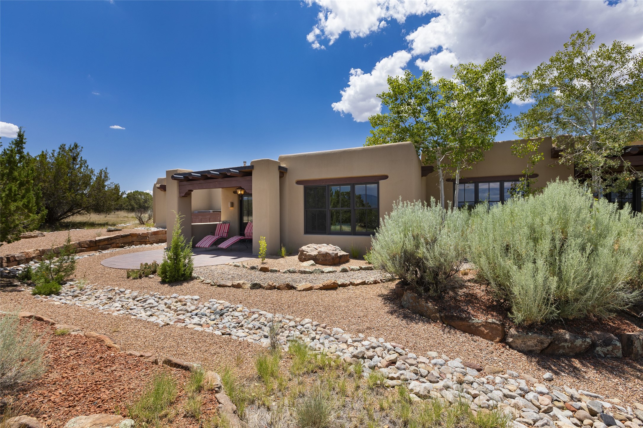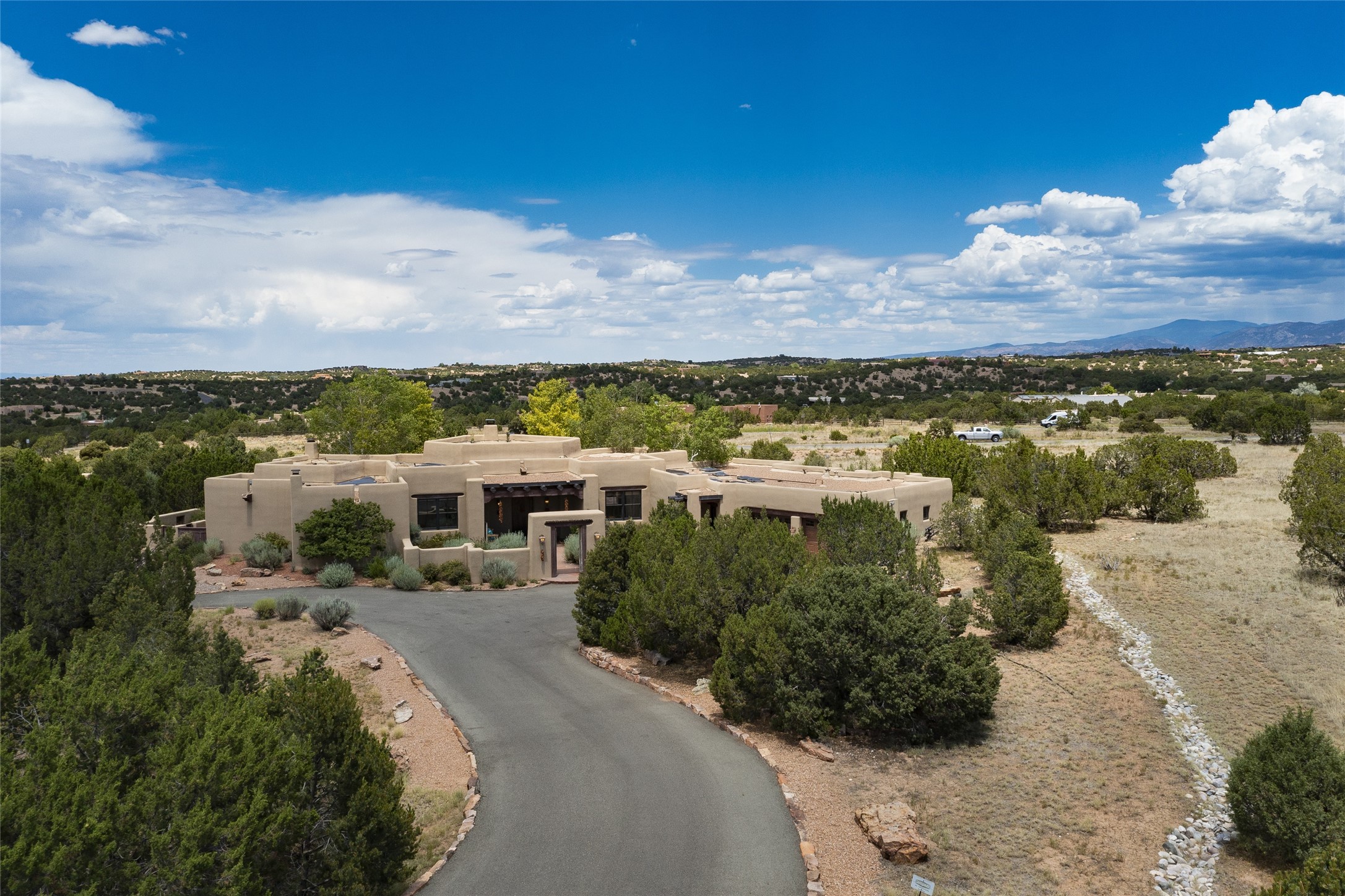 Timeless Santa Fe architecture, spectacular Sangre de Cristo and Jemez Mountain views, and superior outdoor living areas are celebrated at this exciting residence built by renowned builder, Michael Kern. Centrally located within the master planned community of Las Campanas, minutes to the Plaza and The Club at Las Campanas, this exquisite home impresses with exceptional design and the highest level of craftsmanship throughout. Designed to embrace the ultimate Santa Fe lifestyle, this quality single level home offers an excellent separation of space, with a private owner's suite complete with a fireplace, portal access, a tranquil spa-like bath with a jetted tub, dual vanities, walk-in shower and a large walk-in closet. Guests enjoy their own separate guest wing complete with two ensuite bedrooms with Sangre De Cristo Mountain views, private portals and separate entrances. Located off the front entrance is a well-appointed office or ideal fourth bedroom, with custom built-in cabinetry and courtyard views. The spacious chef's kitchen, ideal for entertaining, delights with luxury appliances including a 6-burner gas range with a griddle and double ovens, a free-standing island, and a breakfast bar, all of which open to the spacious living room with a grand fireplace, dining room, and all outdoor living areas. The outdoor living experience is enhanced by deep surround portals, a park-like setting, fully enclosed front and back walled courtyards with an outdoor built-in BBQ, water feature, and expansive back outdoor dining with views of the Sangre de Cristo Mountains. Luxury finishes include plaster walls, rich wood ceiling accents with vigas and corbels throughout, 22 skylights, and rare old-world craftsmanship throughout this one of kind residence. The owner's Equity Golf Membership to The Club at Las Campanas is available for purchase on a separate bill of sale.
