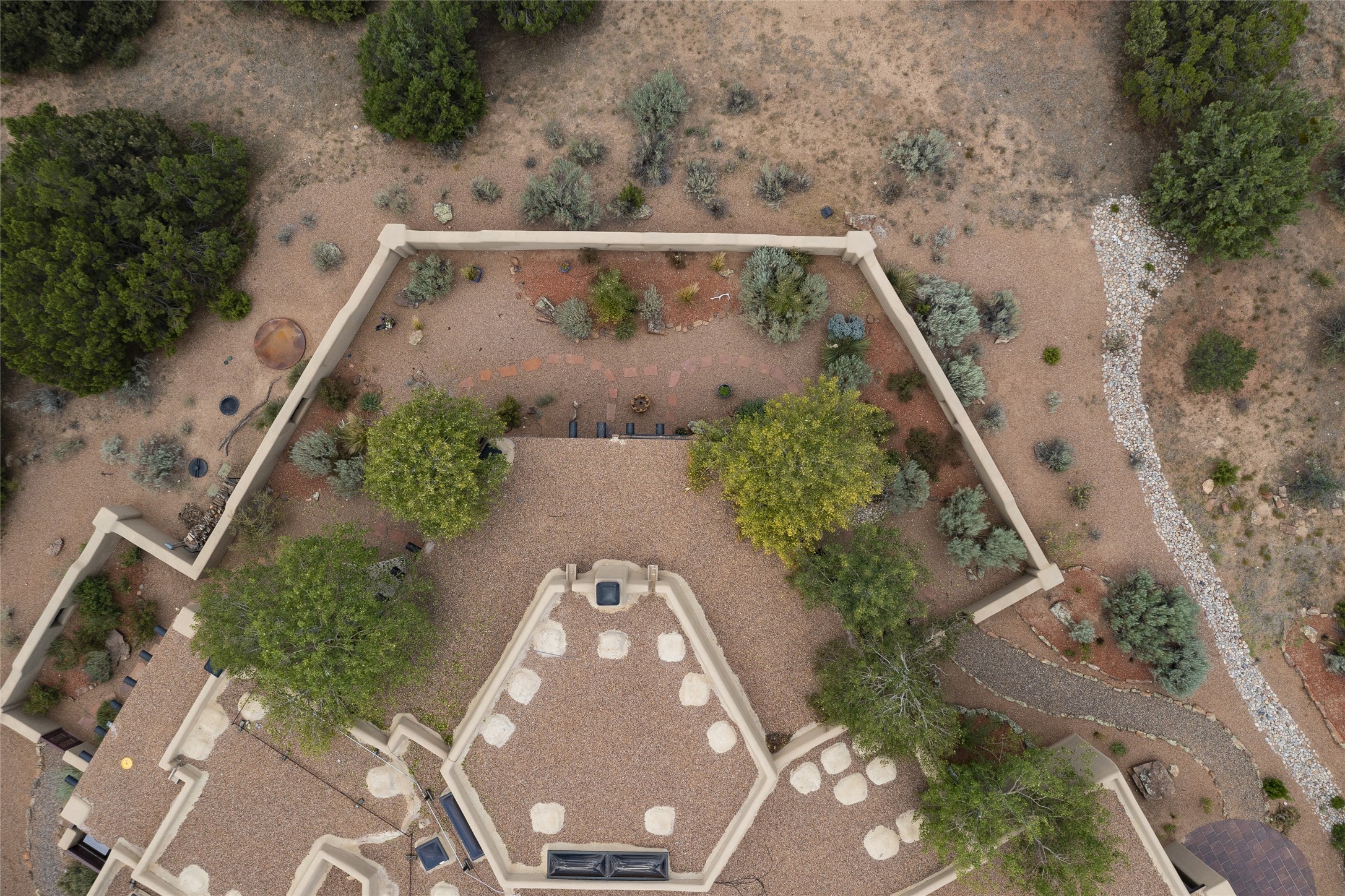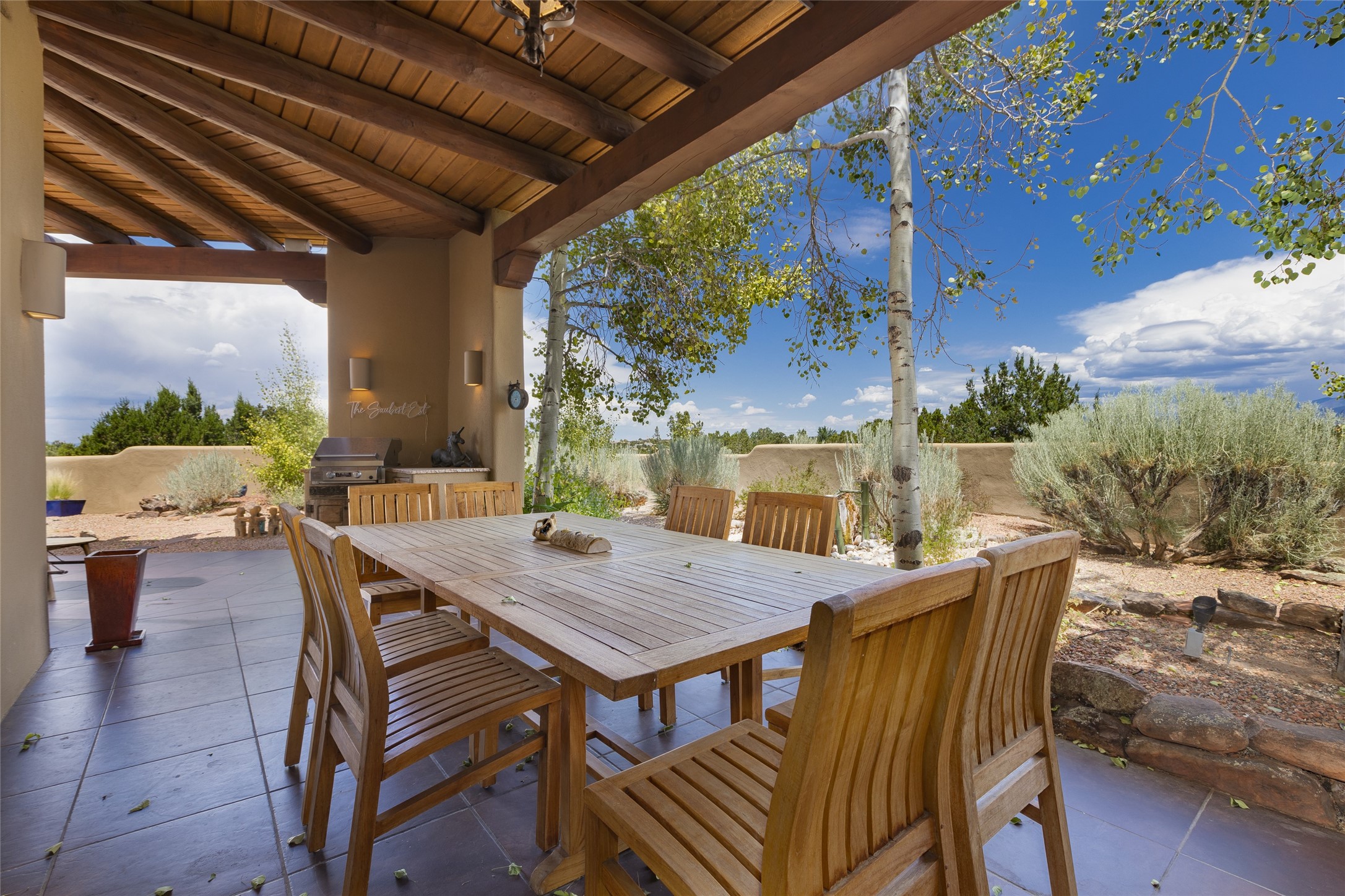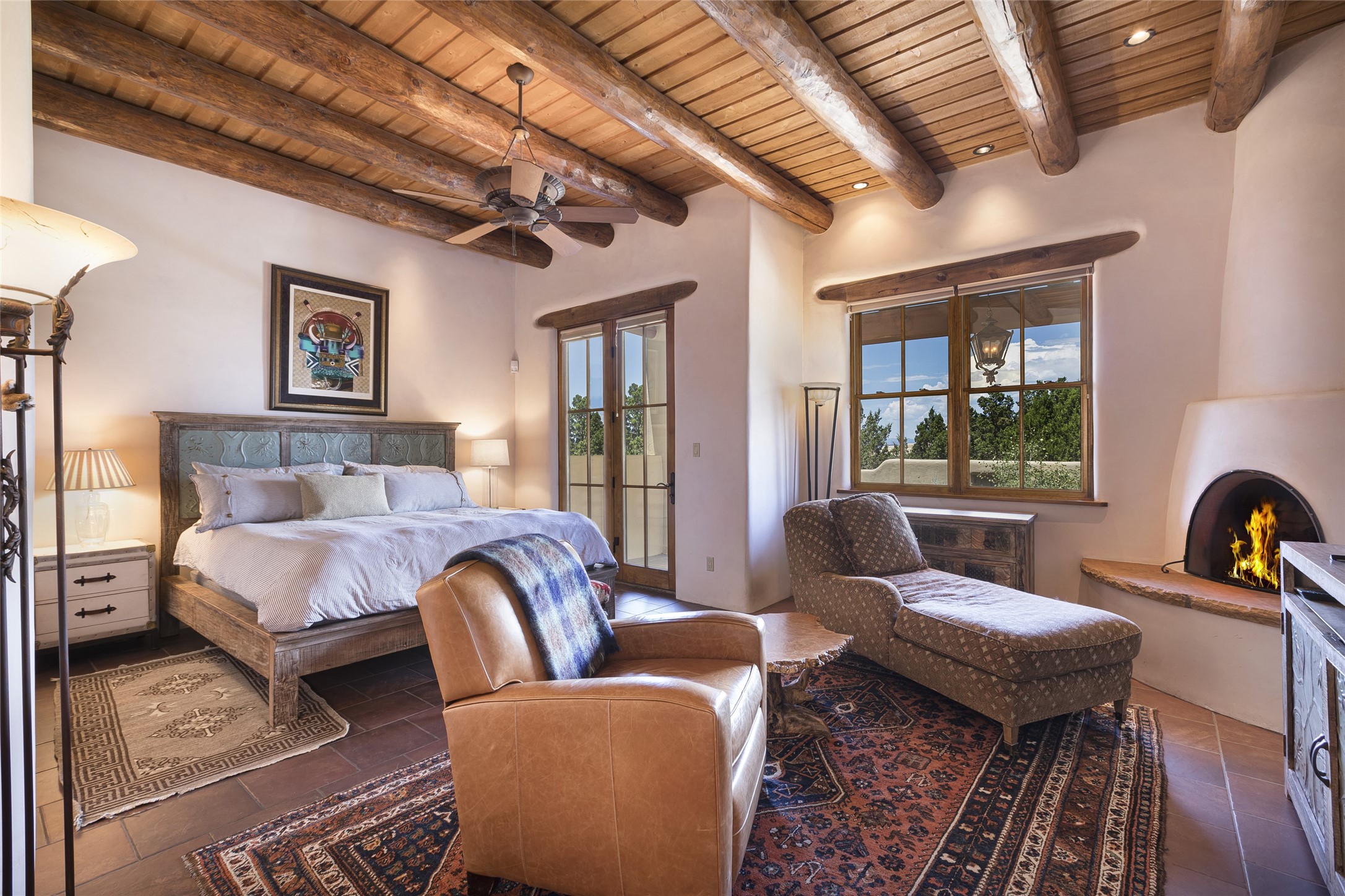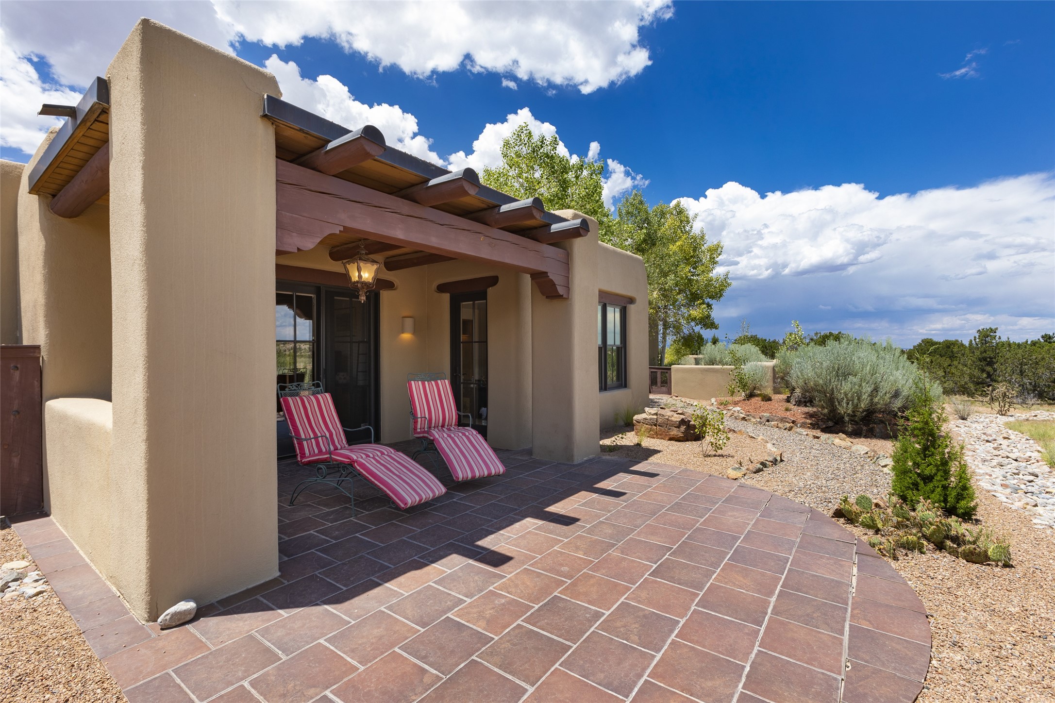 Timeless Santa Fe architecture, spectacular Sangre de Cristo and Jemez Mountain views, and superior outdoor living areas are celebrated at this exciting residence built by renowned builder, Michael Kern. Centrally located within the master planned community of Las Campanas, minutes to the Plaza and The Club at Las Campanas, this exquisite home impresses with exceptional design and the highest level of craftsmanship throughout. Designed to embrace the ultimate Santa Fe lifestyle, this quality single level home offers an excellent separation of space, with a private owner's suite complete with a fireplace, portal access, a tranquil spa-like bath with a jetted tub, dual vanities, walk-in shower and a large walk-in closet. Guests enjoy their own separate guest wing complete with two ensuite bedrooms with Sangre De Cristo Mountain views, private portals and separate entrances. Located off the front entrance is a well-appointed office or ideal fourth bedroom, with custom built-in cabinetry and courtyard views. The spacious chef's kitchen, ideal for entertaining, delights with luxury appliances including a 6-burner gas range with a griddle and double ovens, a free-standing island, and a breakfast bar, all of which open to the spacious living room with a grand fireplace, dining room, and all outdoor living areas. The outdoor living experience is enhanced by deep surround portals, a park-like setting, fully enclosed front and back walled courtyards with an outdoor built-in BBQ, water feature, and expansive back outdoor dining with views of the Sangre de Cristo Mountains. Luxury finishes include plaster walls, rich wood ceiling accents with vigas and corbels throughout, 22 skylights, and rare old-world craftsmanship throughout this one of kind residence. The owner's Equity Golf Membership to The Club at Las Campanas is available for purchase on a separate bill of sale.