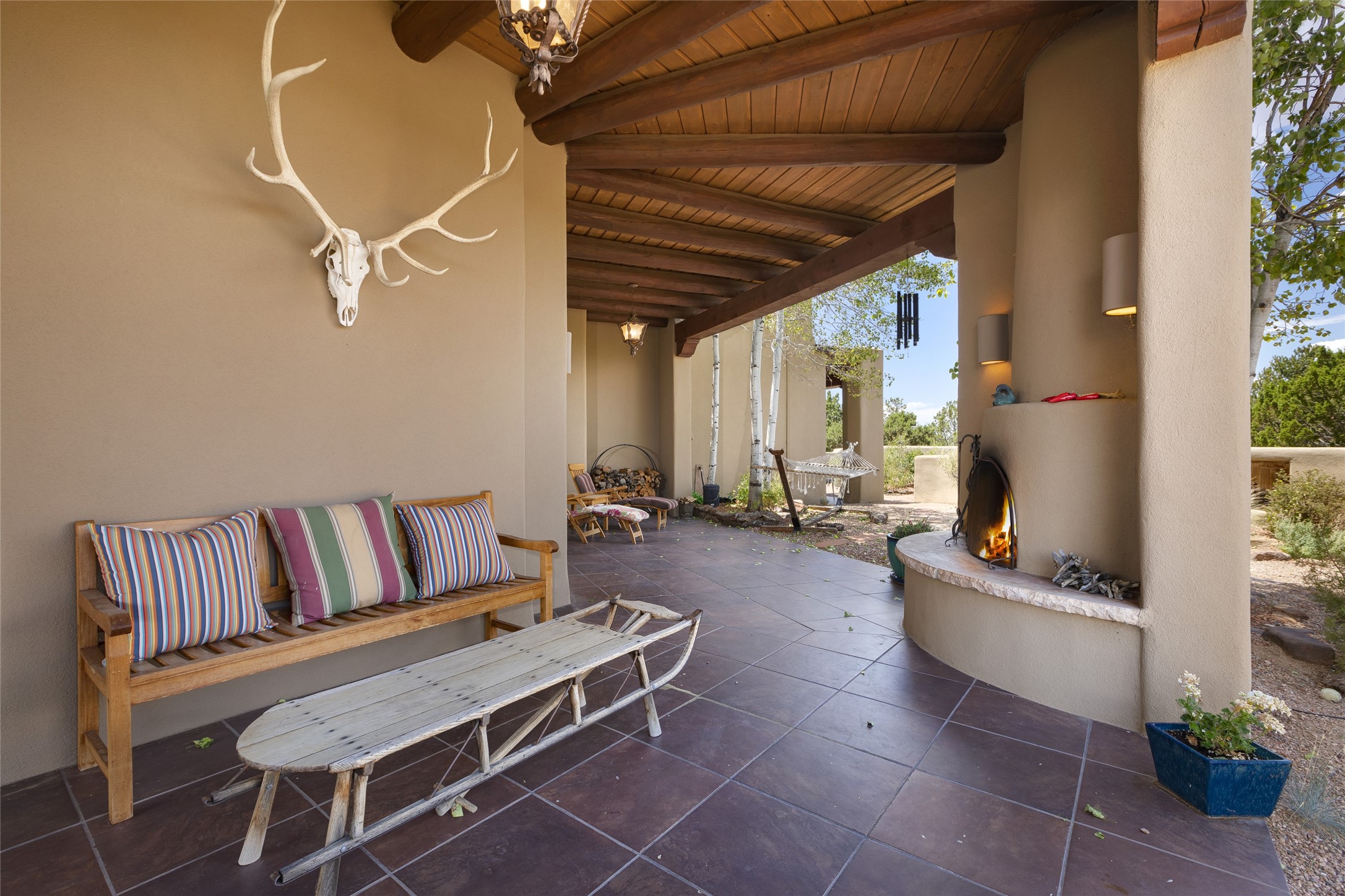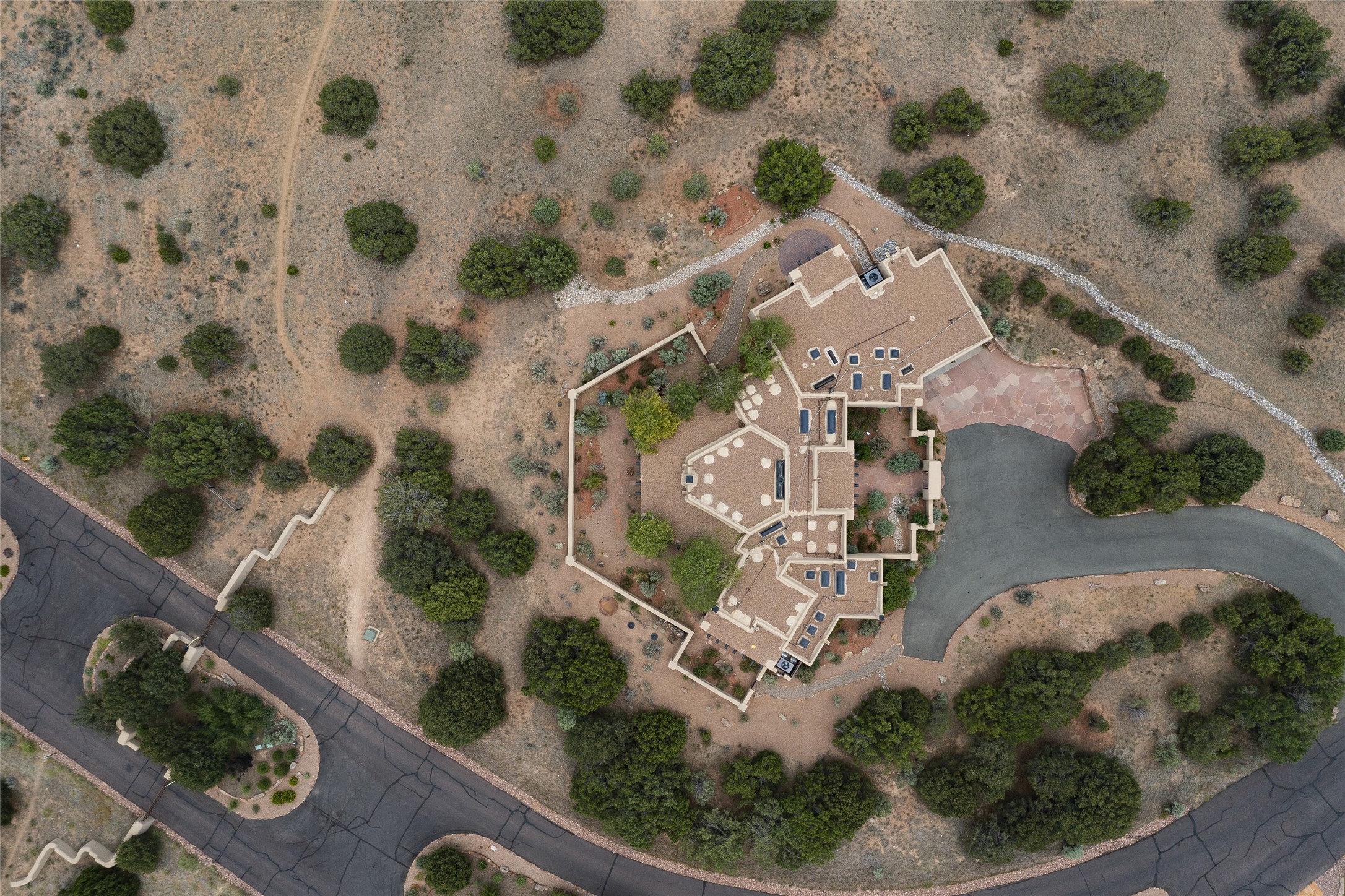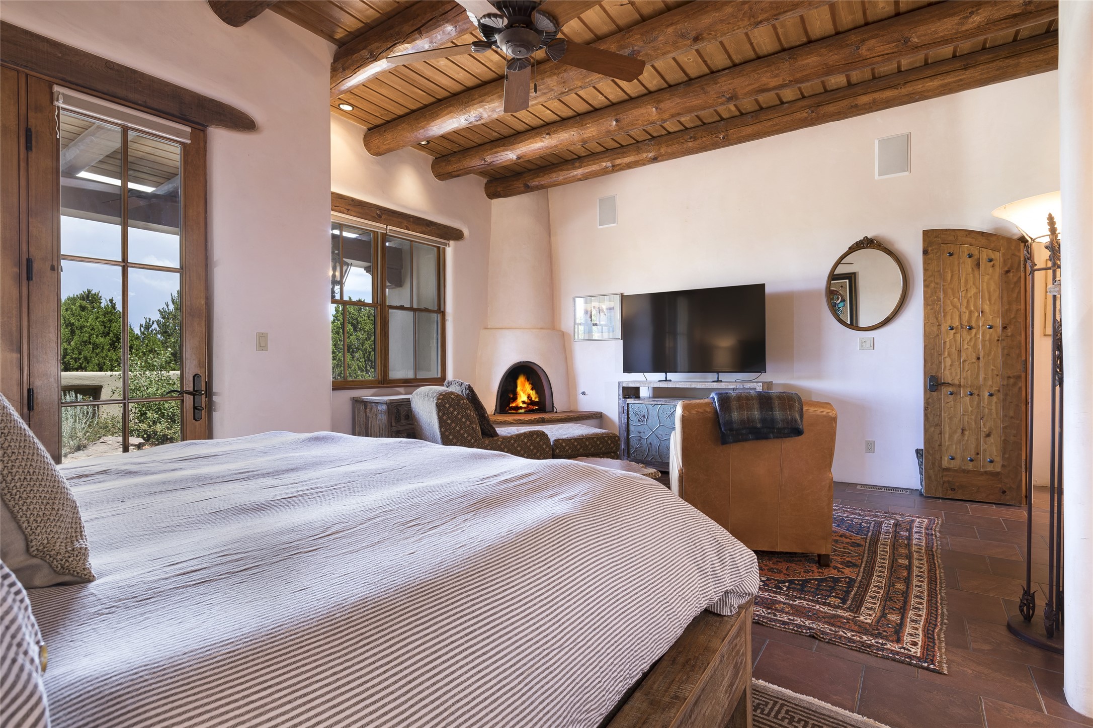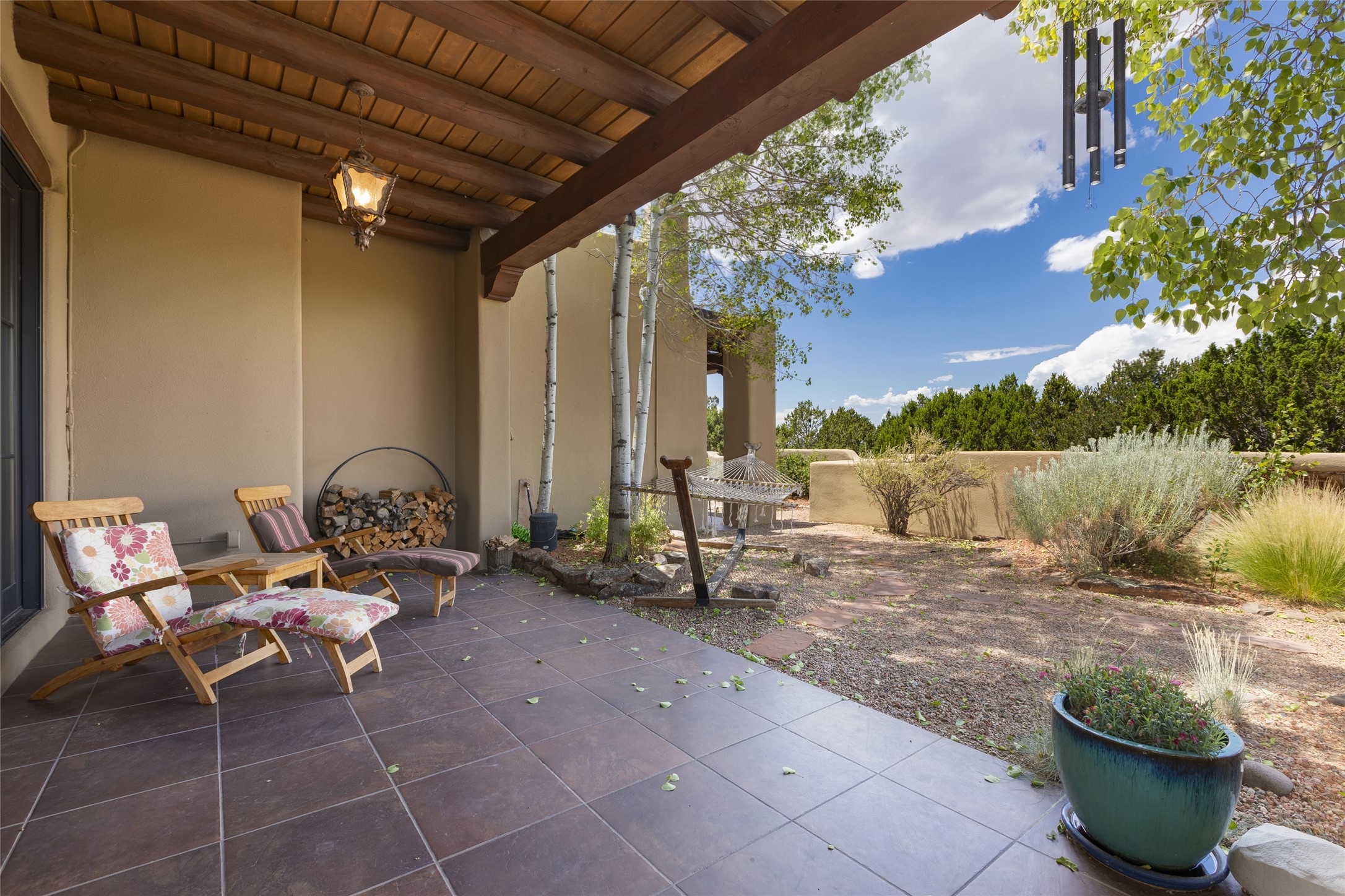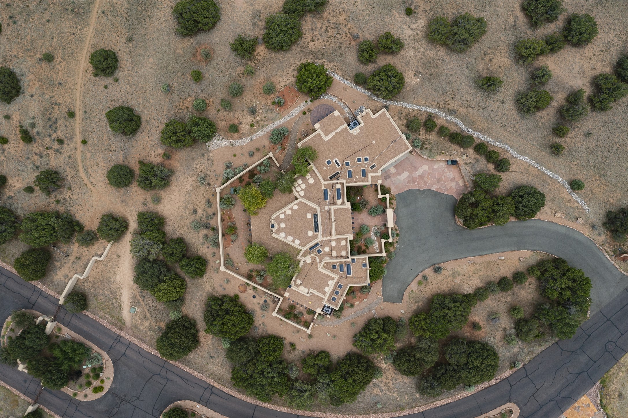 Timeless Santa Fe architecture, spectacular Sangre de Cristo and Jemez Mountain views, and superior outdoor living areas are celebrated at this exciting residence built by renowned builder, Michael Kern. Centrally located within the master planned community of Las Campanas, minutes to the Plaza and The Club at Las Campanas, this exquisite home impresses with exceptional design and the highest level of craftsmanship throughout. Designed to embrace the ultimate Santa Fe lifestyle, this quality single level home offers an excellent separation of space, with a private owner's suite complete with a fireplace, portal access, a tranquil spa-like bath with a jetted tub, dual vanities, walk-in shower and a large walk-in closet. Guests enjoy their own separate guest wing complete with two ensuite bedrooms with Sangre De Cristo Mountain views, private portals and separate entrances. Located off the front entrance is a well-appointed office or ideal fourth bedroom, with custom built-in cabinetry and courtyard views. The spacious chef's kitchen, ideal for entertaining, delights with luxury appliances including a 6-burner gas range with a griddle and double ovens, a free-standing island, and a breakfast bar, all of which open to the spacious living room with a grand fireplace, dining room, and all outdoor living areas. The outdoor living experience is enhanced by deep surround portals, a park-like setting, fully enclosed front and back walled courtyards with an outdoor built-in BBQ, water feature, and expansive back outdoor dining with views of the Sangre de Cristo Mountains. Luxury finishes include plaster walls, rich wood ceiling accents with vigas and corbels throughout, 22 skylights, and rare old-world craftsmanship throughout this one of kind residence. The owner's Equity Golf Membership to The Club at Las Campanas is available for purchase on a separate bill of sale.