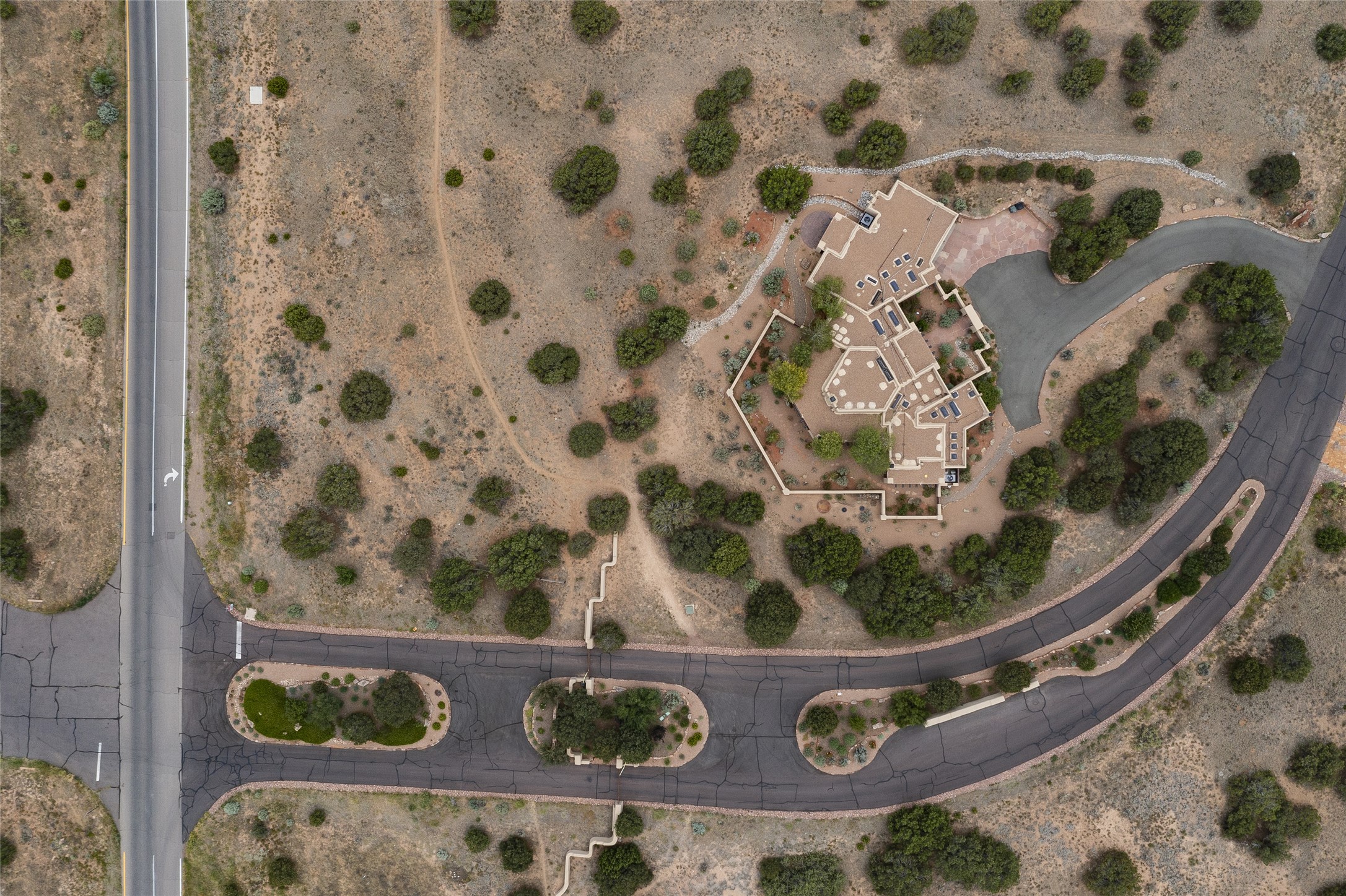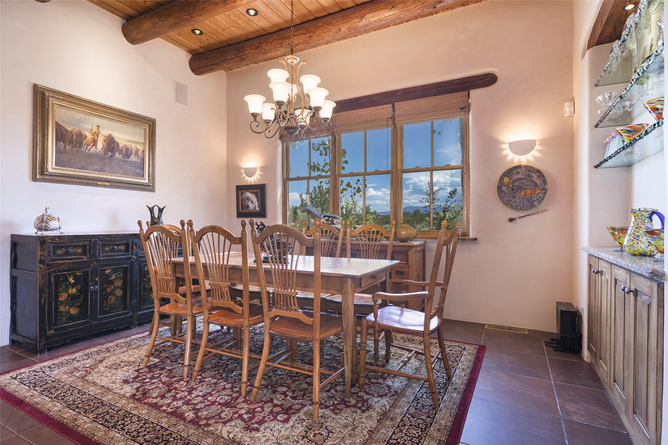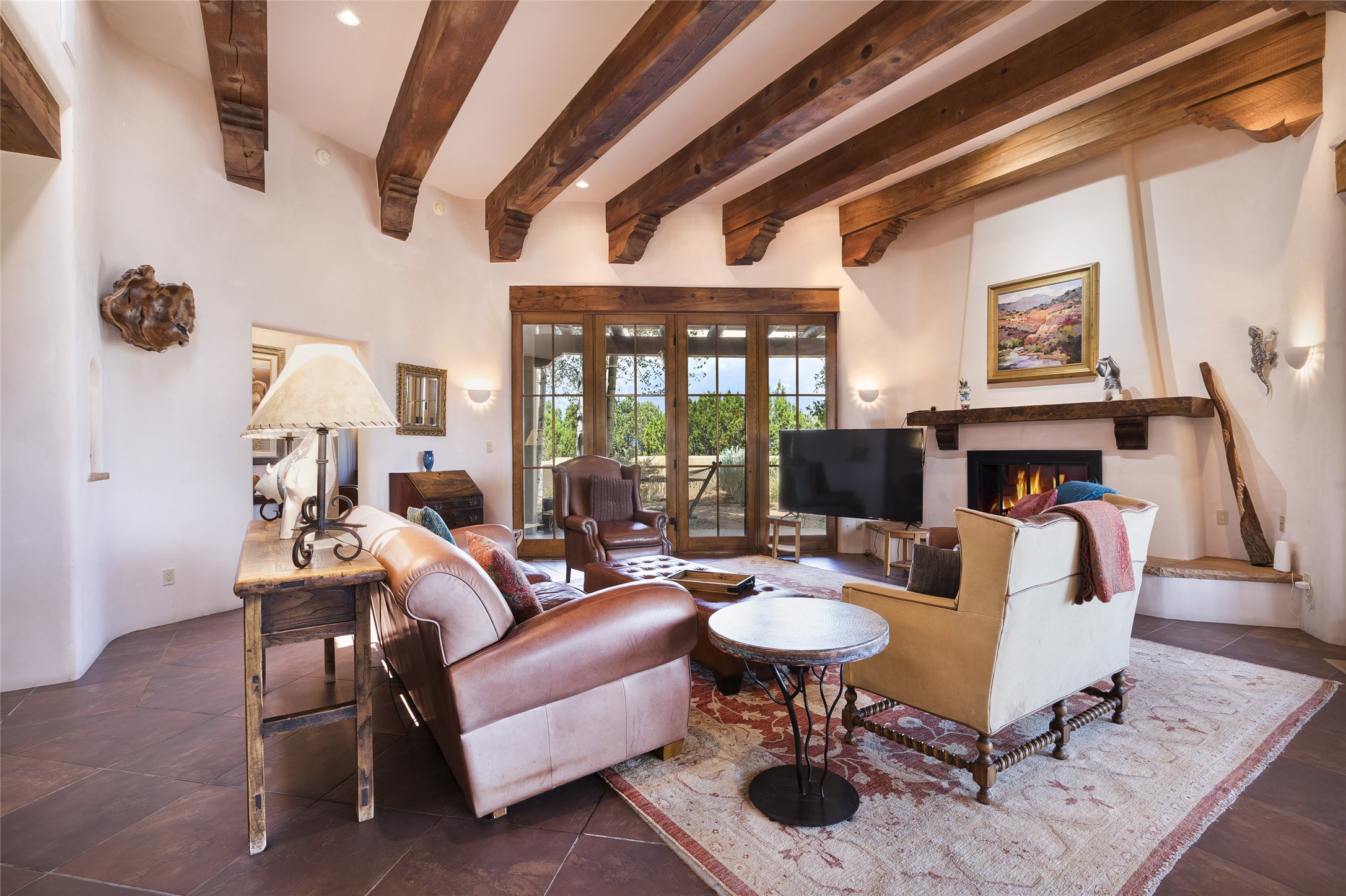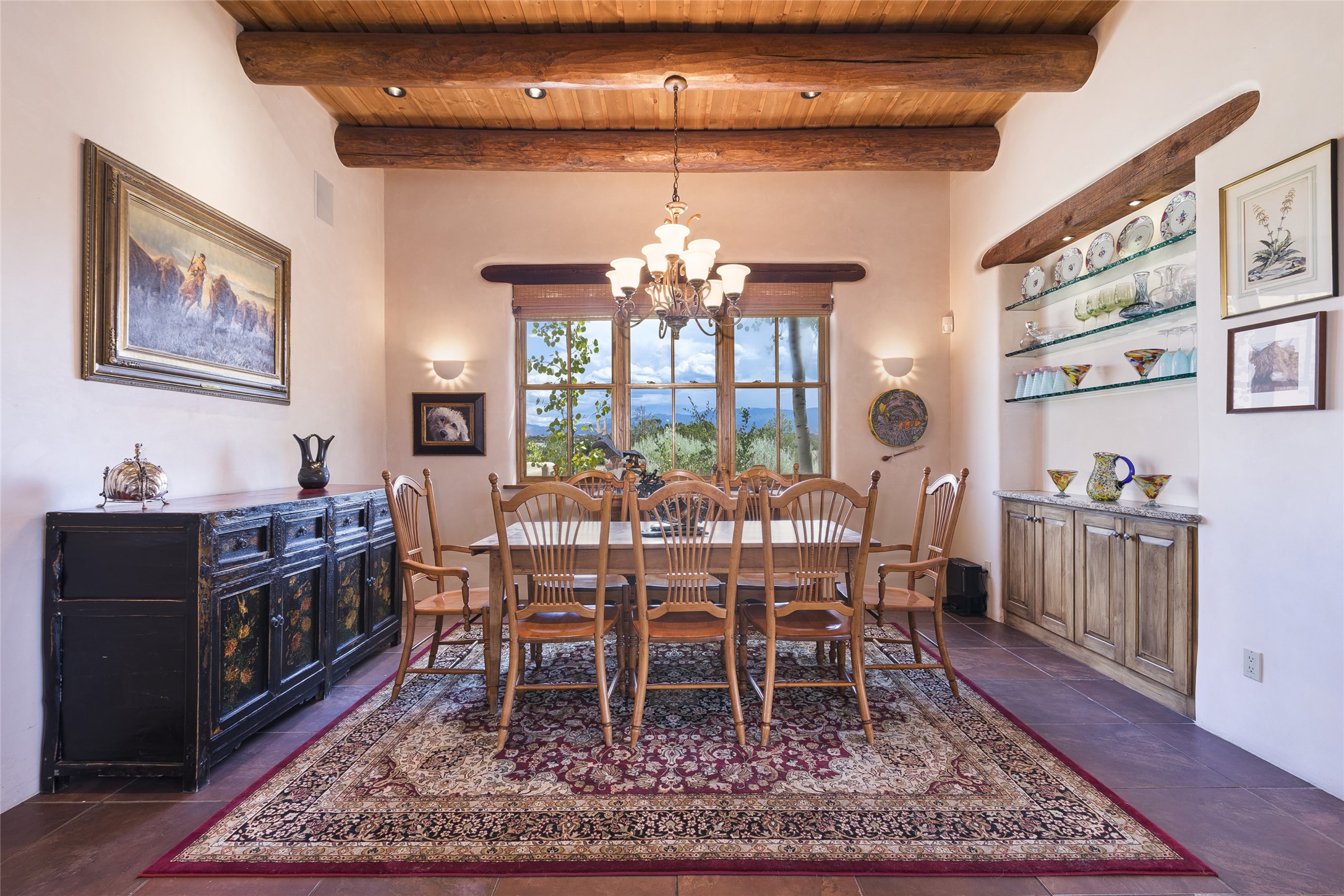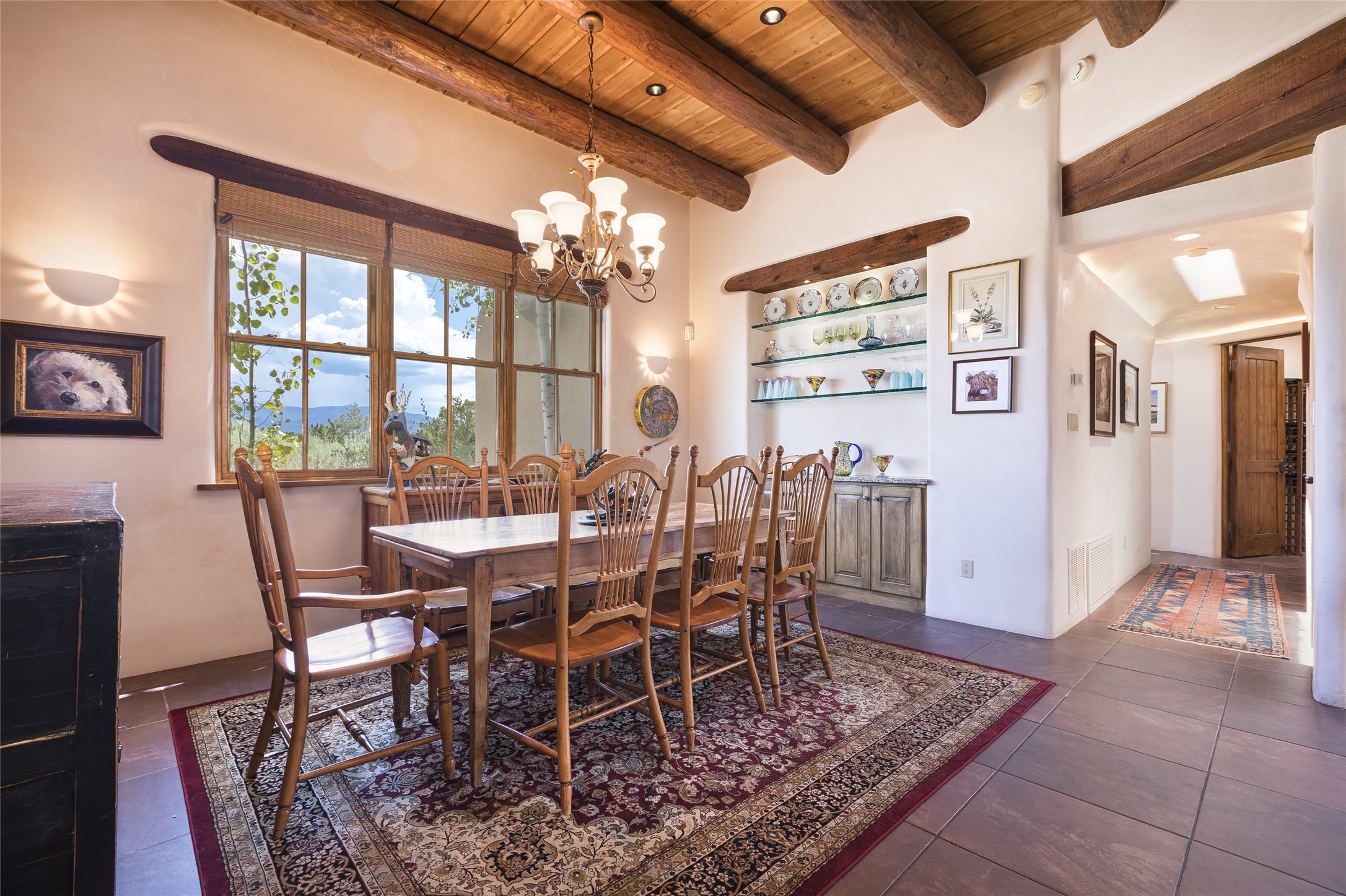Timeless Santa Fe architecture, spectacular Sangre de Cristo and Jemez Mountain views, and superior outdoor living areas are celebrated at this exciting residence built by renowned builder, Michael Kern. Centrally located within the master planned community of Las Campanas, minutes to the Plaza and The Club at Las Campanas, this exquisite home impresses with exceptional design and the highest level of craftsmanship throughout. Designed to embrace the ultimate Santa Fe lifestyle, this quality single level home offers an excellent separation of space, with a private owner's suite complete with a fireplace, portal access, a tranquil spa-like bath with a jetted tub, dual vanities, walk-in shower and a large walk-in closet. Guests enjoy their own separate guest wing complete with two ensuite bedrooms with Sangre De Cristo Mountain views, private portals and separate entrances. Located off the front entrance is a well-appointed office or ideal fourth bedroom, with custom built-in cabinetry and courtyard views. The spacious chef's kitchen, ideal for entertaining, delights with luxury appliances including a 6-burner gas range with a griddle and double ovens, a free-standing island, and a breakfast bar, all of which open to the spacious living room with a grand fireplace, dining room, and all outdoor living areas. The outdoor living experience is enhanced by deep surround portals, a park-like setting, fully enclosed front and back walled courtyards with an outdoor built-in BBQ, water feature, and expansive back outdoor dining with views of the Sangre de Cristo Mountains. Luxury finishes include plaster walls, rich wood ceiling accents with vigas and corbels throughout, 22 skylights, and rare old-world craftsmanship throughout this one of kind residence. The owner's Equity Golf Membership to The Club at Las Campanas is available for purchase on a separate bill of sale.