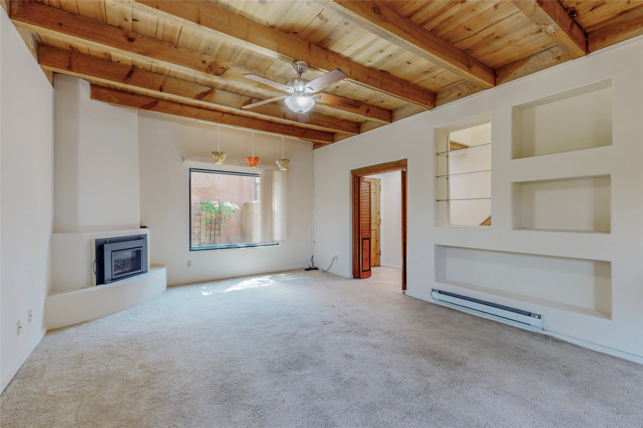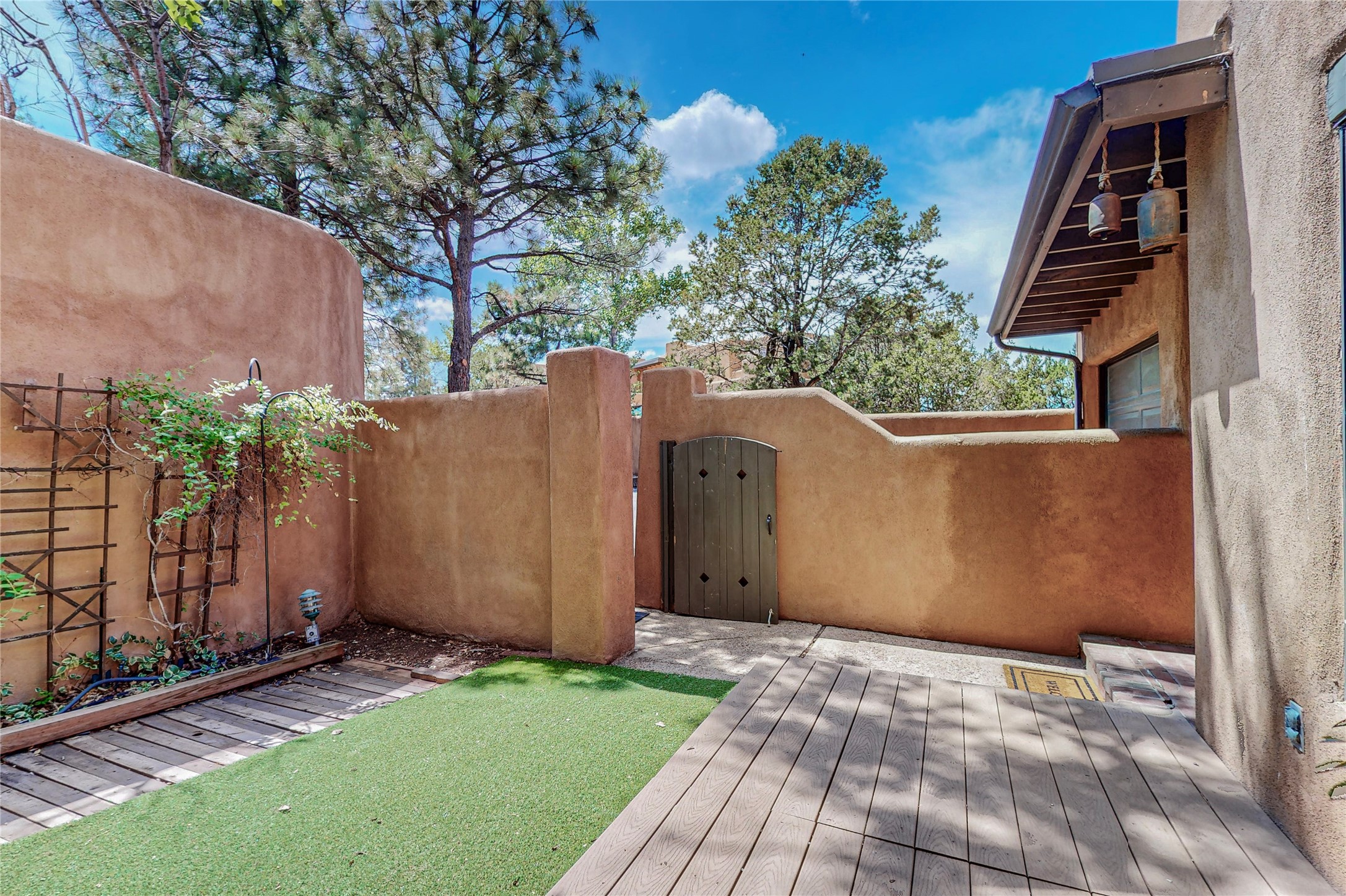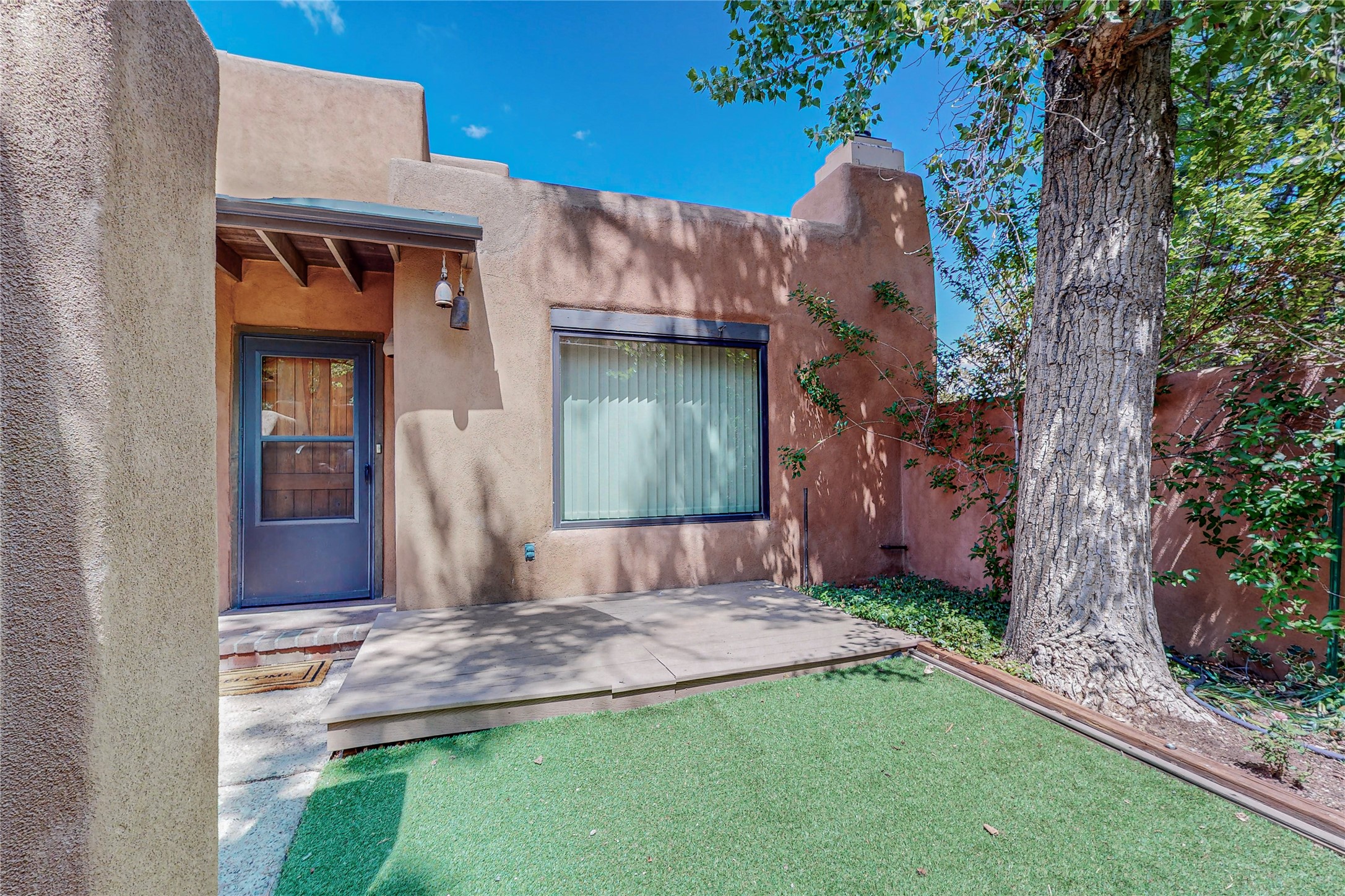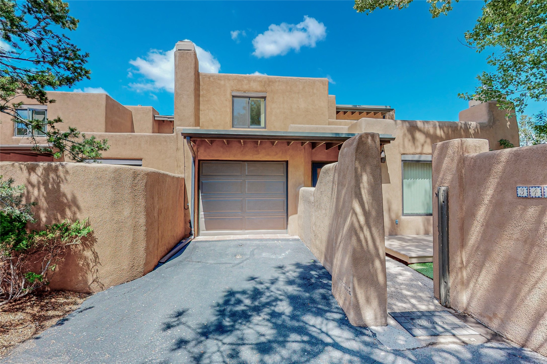Sunny and secluded - an ideal location for your new Santa Fe home! This condo unit will surprise you, it's private and tucked away at the end of a cul-de-sac. A peaceful courtyard greets you, and this area of greenery and sunshine is also seen from inside the unit. The entire first floor is open space planning focused on a large light-filled living room, complete with a gas-fired corner kiva fireplace. The open space flows to a dining area and from these windows you'll see mountain views of the Sangres - and possibly snow-covered peaks. The open kitchen is euro style with a Wolf induction cook top. Currently there is no oven, but there is a cabinet space (under counter) in the kitchen that formerly had an oven and this is where a new oven could be installed. The extra-deep attached garage, laundry area, and bath with walk-in shower complete the first floor. Up the staircase you'll find two generous bedrooms with a large full bath between. Both bedrooms offer big windows, good closets and lots of natural light. With professional HOA coverage on many exterior items plus the new roof completed in September of 2021, this unit will provide the new owner with easy living. The location offers you close proximity to all of downtown Santa Fe, for restaurants, museums, shopping. Nearby are numerous grocery store options and the farmers' market. Within 5 minutes you can be ordering breakfast at a downtown location. Also, just at the base of the hill is Ft Marcy park, which offers multiple choices: pickle ball courts, indoor swimming pool, basketball court, exercise rooms, and good dog walking options. OR, you can walk downhill to the Plaza in about 20 minutes. This is a very comfortable place as a full time home or your Santa Fe escape. Welcome to Santa Fe!