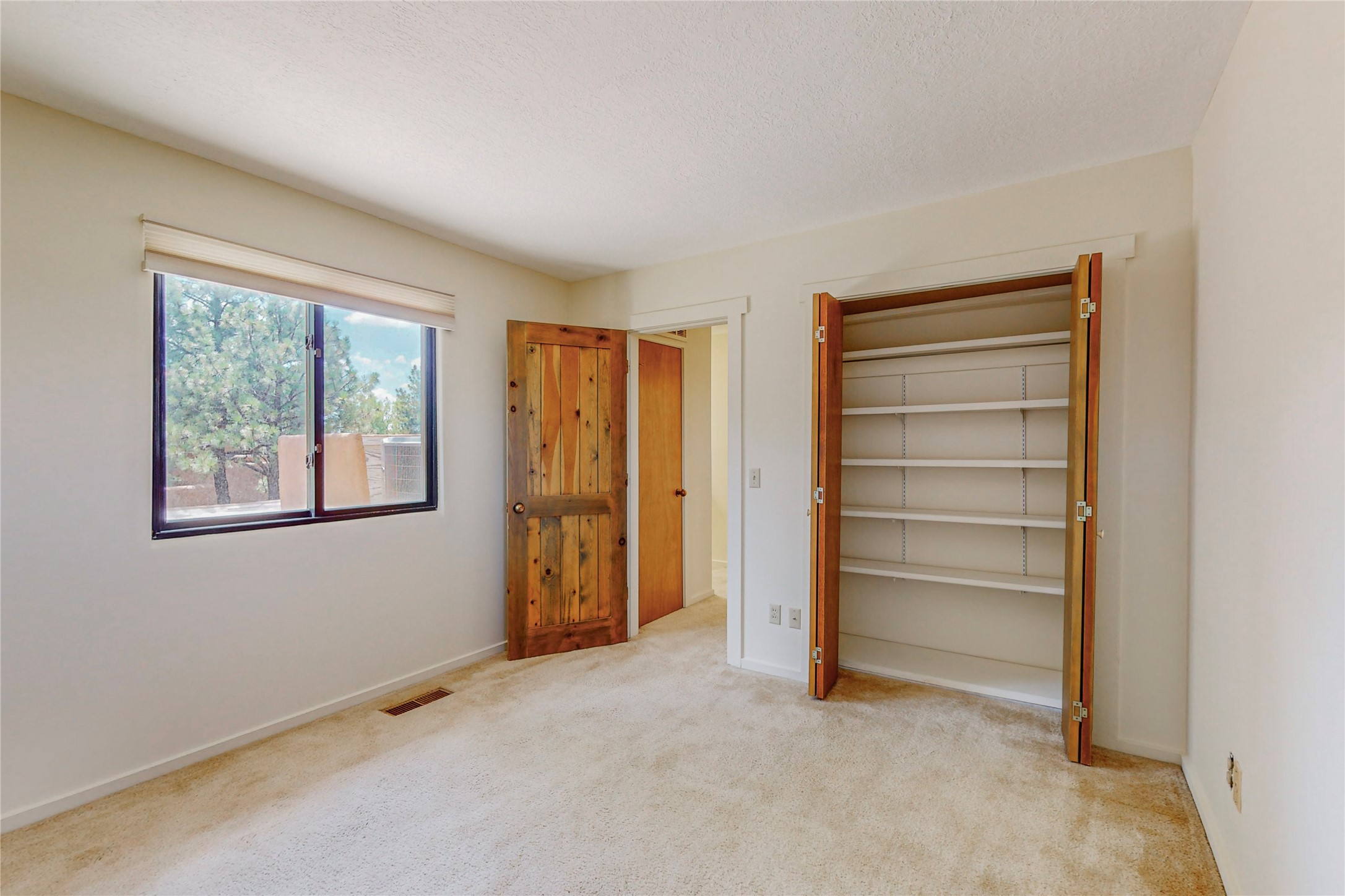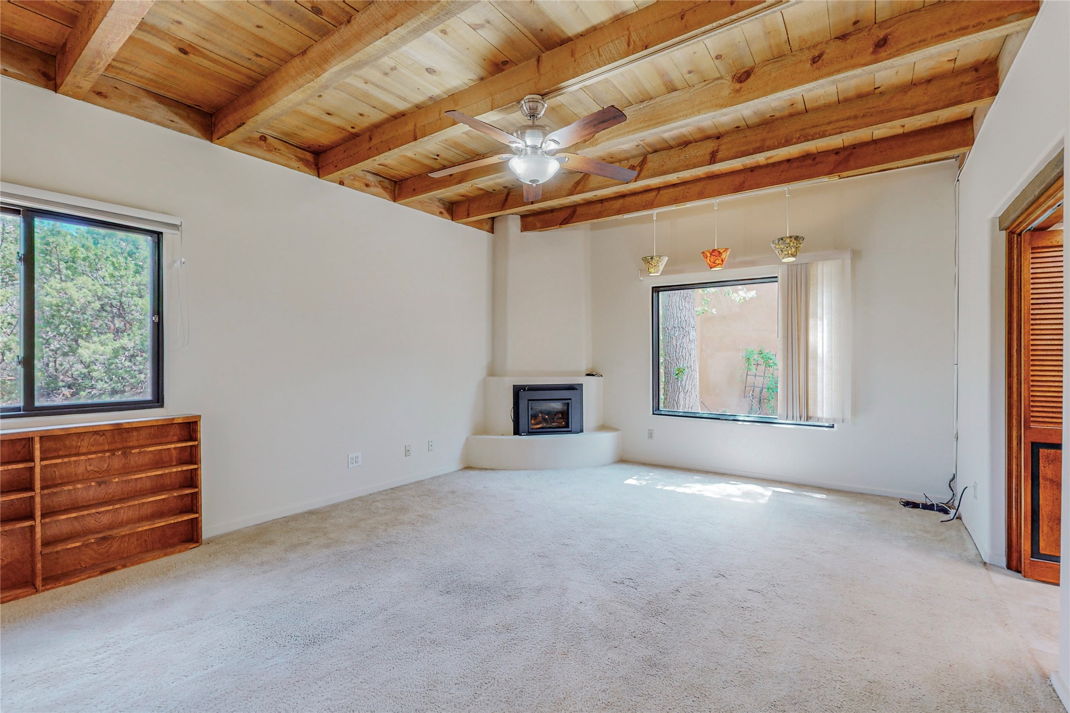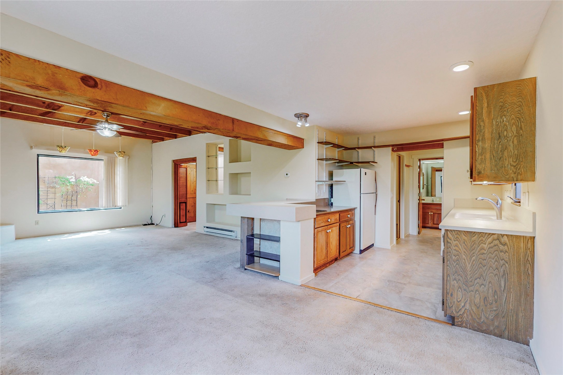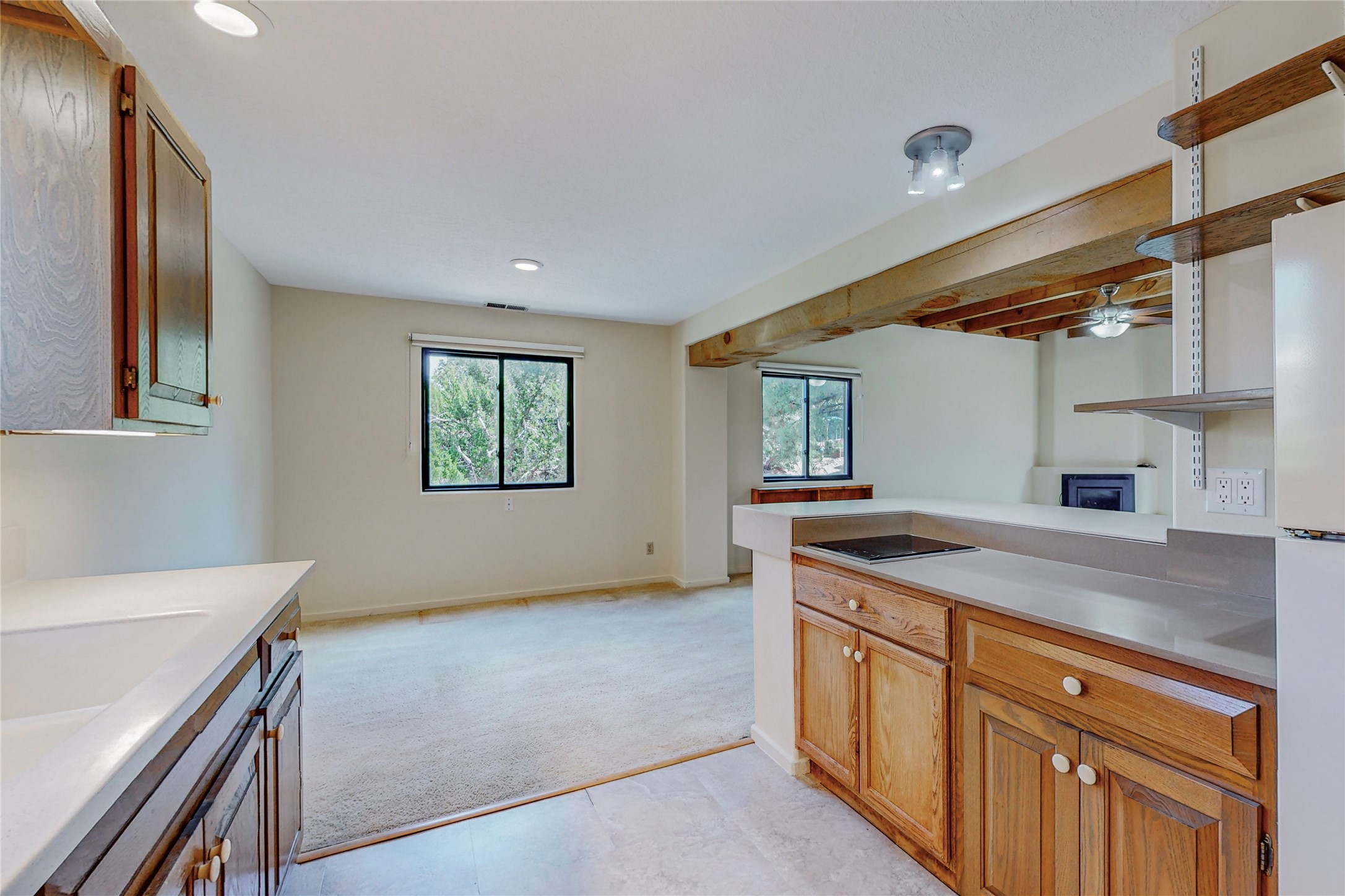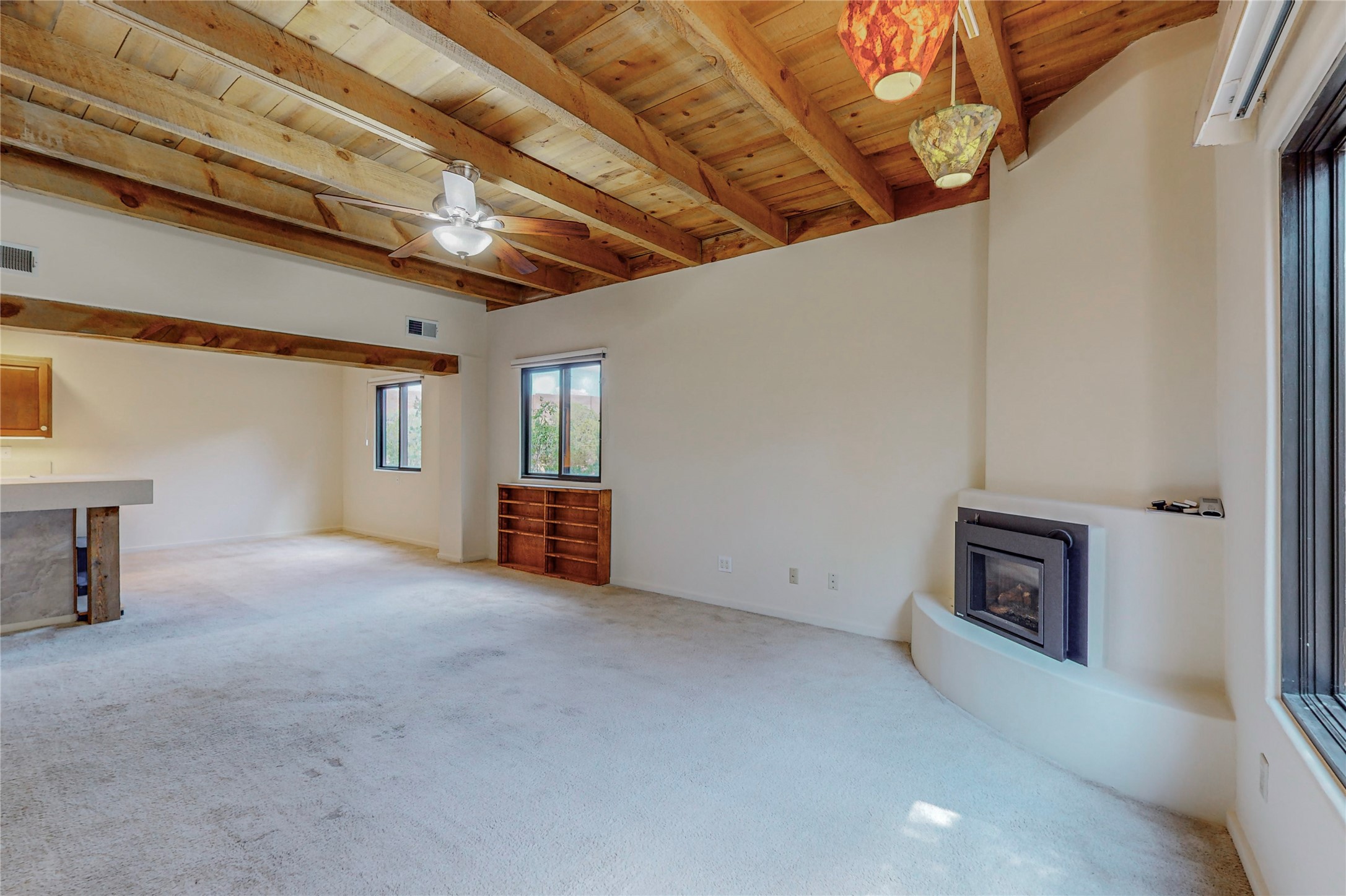 Sunny and secluded - an ideal location for your new Santa Fe home! This condo unit will surprise you, it's private and tucked away at the end of a cul-de-sac. A peaceful courtyard greets you, and this area of greenery and sunshine is also seen from inside the unit. The entire first floor is open space planning focused on a large light-filled living room, complete with a gas-fired corner kiva fireplace. The open space flows to a dining area and from these windows you'll see mountain views of the Sangres - and possibly snow-covered peaks. The open kitchen is euro style with a Wolf induction cook top. Currently there is no oven, but there is a cabinet space (under counter) in the kitchen that formerly had an oven and this is where a new oven could be installed. The extra-deep attached garage, laundry area, and bath with walk-in shower complete the first floor. Up the staircase you'll find two generous bedrooms with a large full bath between. Both bedrooms offer big windows, good closets and lots of natural light. With professional HOA coverage on many exterior items plus the new roof completed in September of 2021, this unit will provide the new owner with easy living. The location offers you close proximity to all of downtown Santa Fe, for restaurants, museums, shopping. Nearby are numerous grocery store options and the farmers' market. Within 5 minutes you can be ordering breakfast at a downtown location. Also, just at the base of the hill is Ft Marcy park, which offers multiple choices: pickle ball courts, indoor swimming pool, basketball court, exercise rooms, and good dog walking options. OR, you can walk downhill to the Plaza in about 20 minutes. This is a very comfortable place as a full time home or your Santa Fe escape. Welcome to Santa Fe!