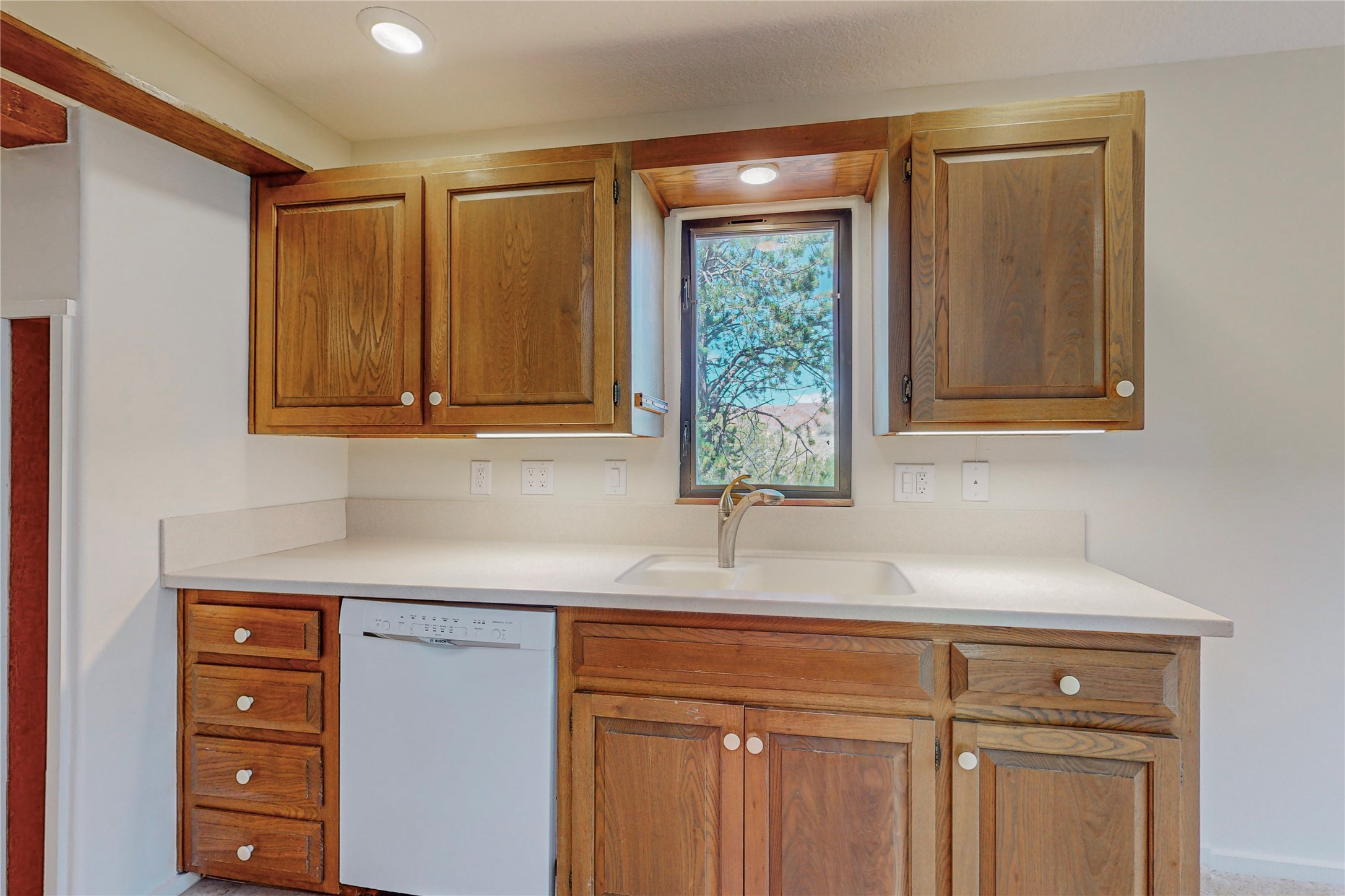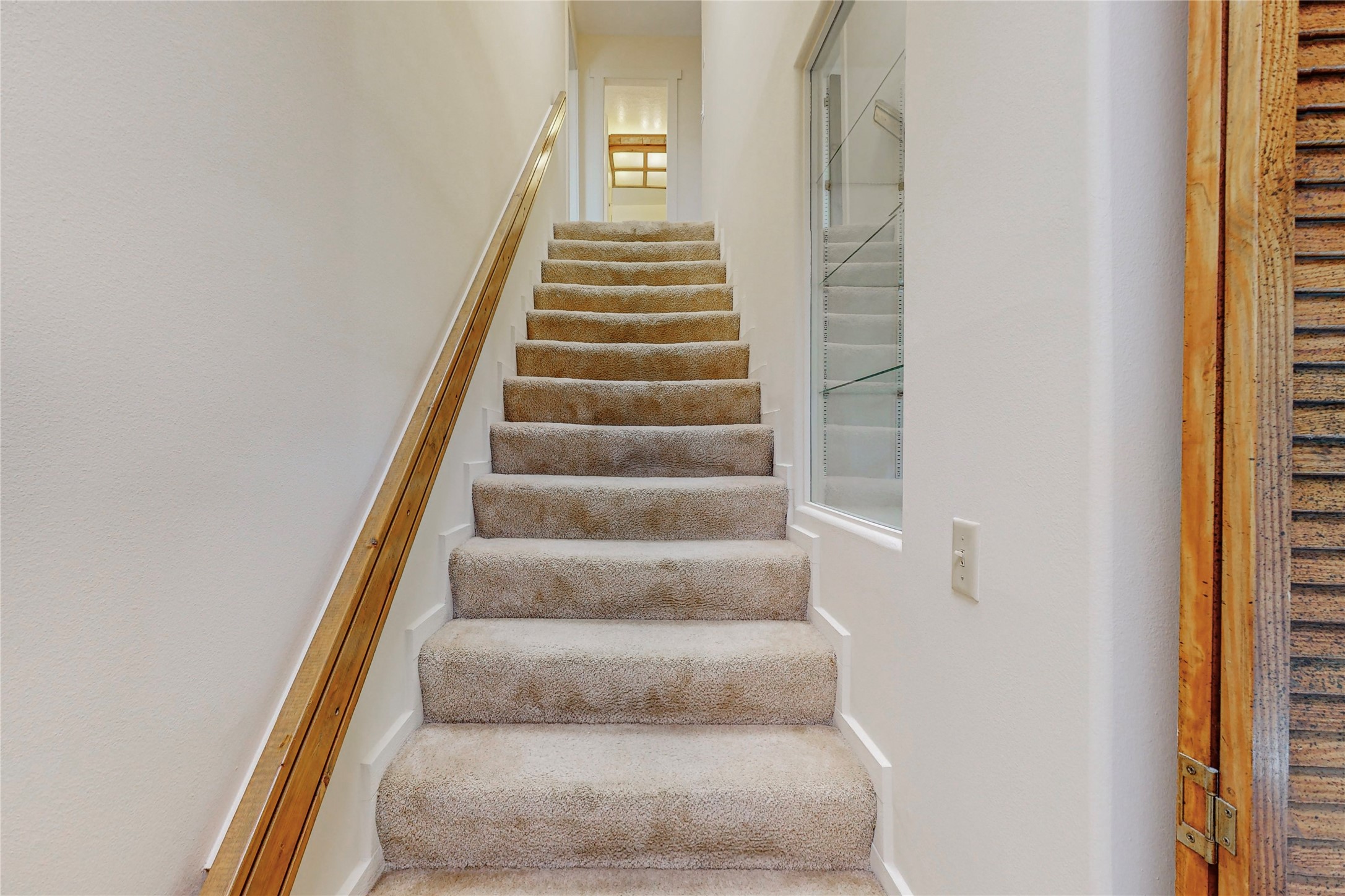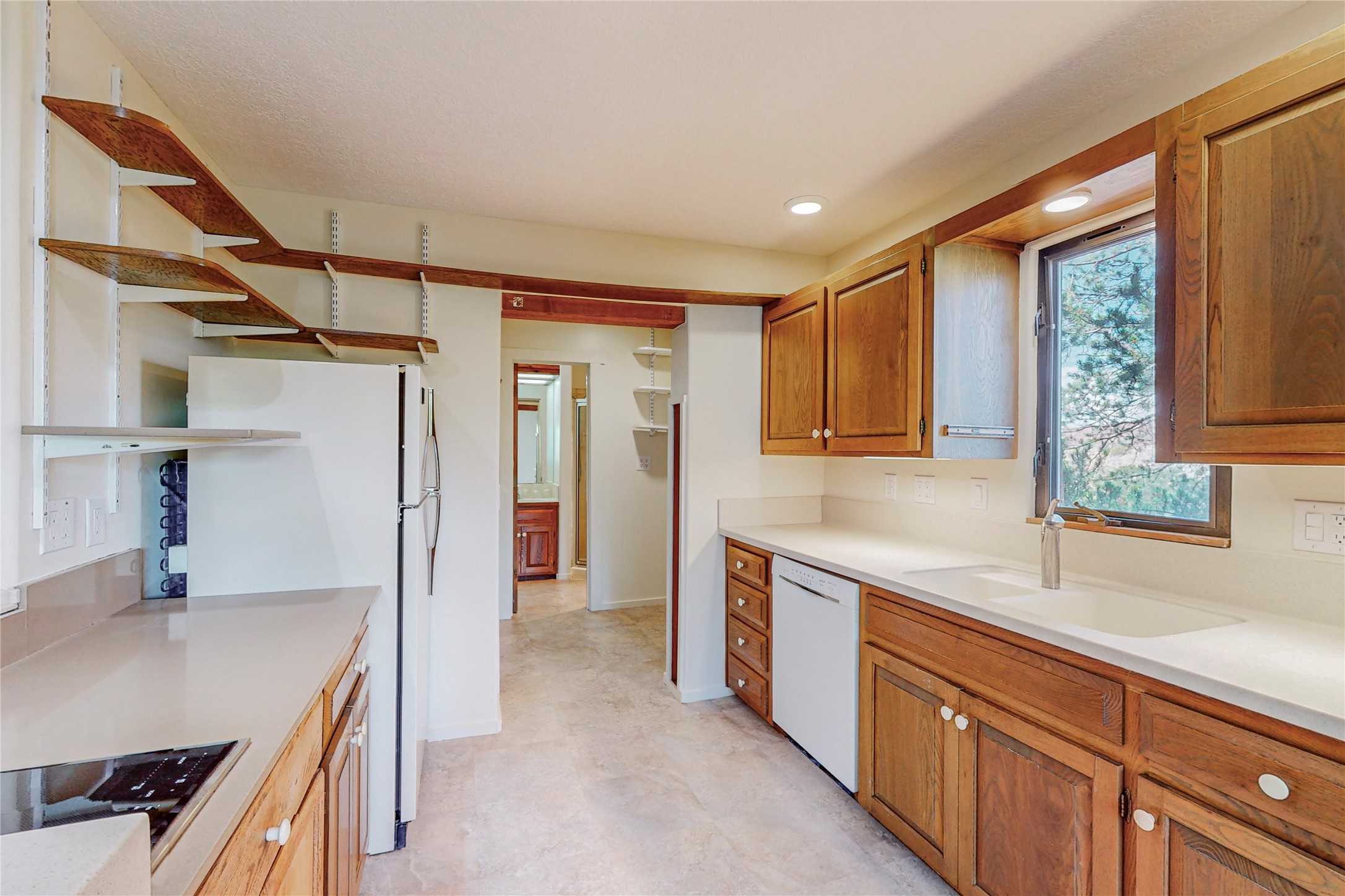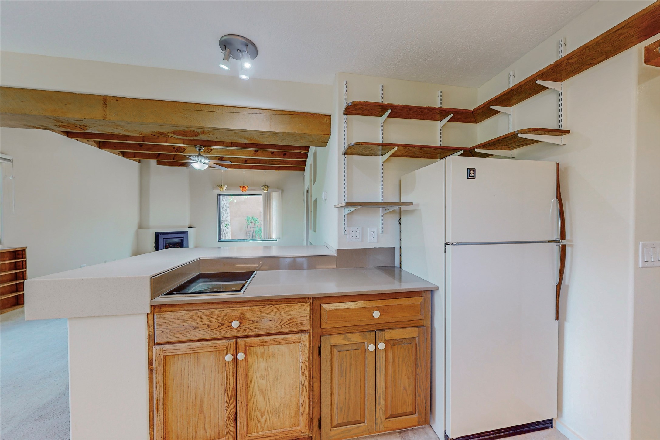 Sunny and secluded - an ideal location for your new Santa Fe home! This condo unit will surprise you, it's private and tucked away at the end of a cul-de-sac. A peaceful courtyard greets you, and this area of greenery and sunshine is also seen from inside the unit. The entire first floor is open space planning focused on a large light-filled living room, complete with a gas-fired corner kiva fireplace. The open space flows to a dining area and from these windows you'll see mountain views of the Sangres - and possibly snow-covered peaks. The open kitchen is euro style with a Wolf induction cook top. Currently there is no oven, but there is a cabinet space (under counter) in the kitchen that formerly had an oven and this is where a new oven could be installed. The extra-deep attached garage, laundry area, and bath with walk-in shower complete the first floor. Up the staircase you'll find two generous bedrooms with a large full bath between. Both bedrooms offer big windows, good closets and lots of natural light. With professional HOA coverage on many exterior items plus the new roof completed in September of 2021, this unit will provide the new owner with easy living. The location offers you close proximity to all of downtown Santa Fe, for restaurants, museums, shopping. Nearby are numerous grocery store options and the farmers' market. Within 5 minutes you can be ordering breakfast at a downtown location. Also, just at the base of the hill is Ft Marcy park, which offers multiple choices: pickle ball courts, indoor swimming pool, basketball court, exercise rooms, and good dog walking options. OR, you can walk downhill to the Plaza in about 20 minutes. This is a very comfortable place as a full time home or your Santa Fe escape. Welcome to Santa Fe!