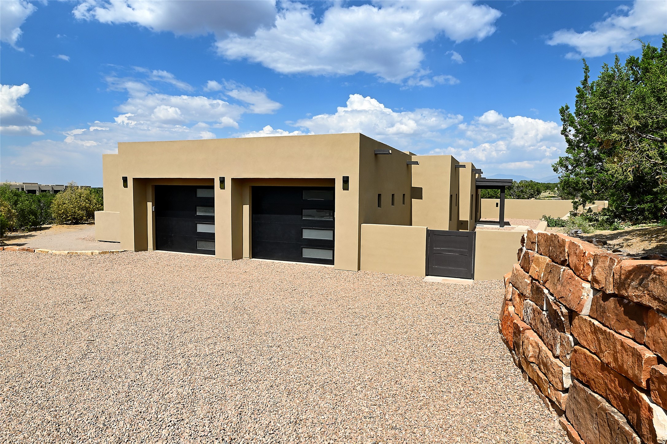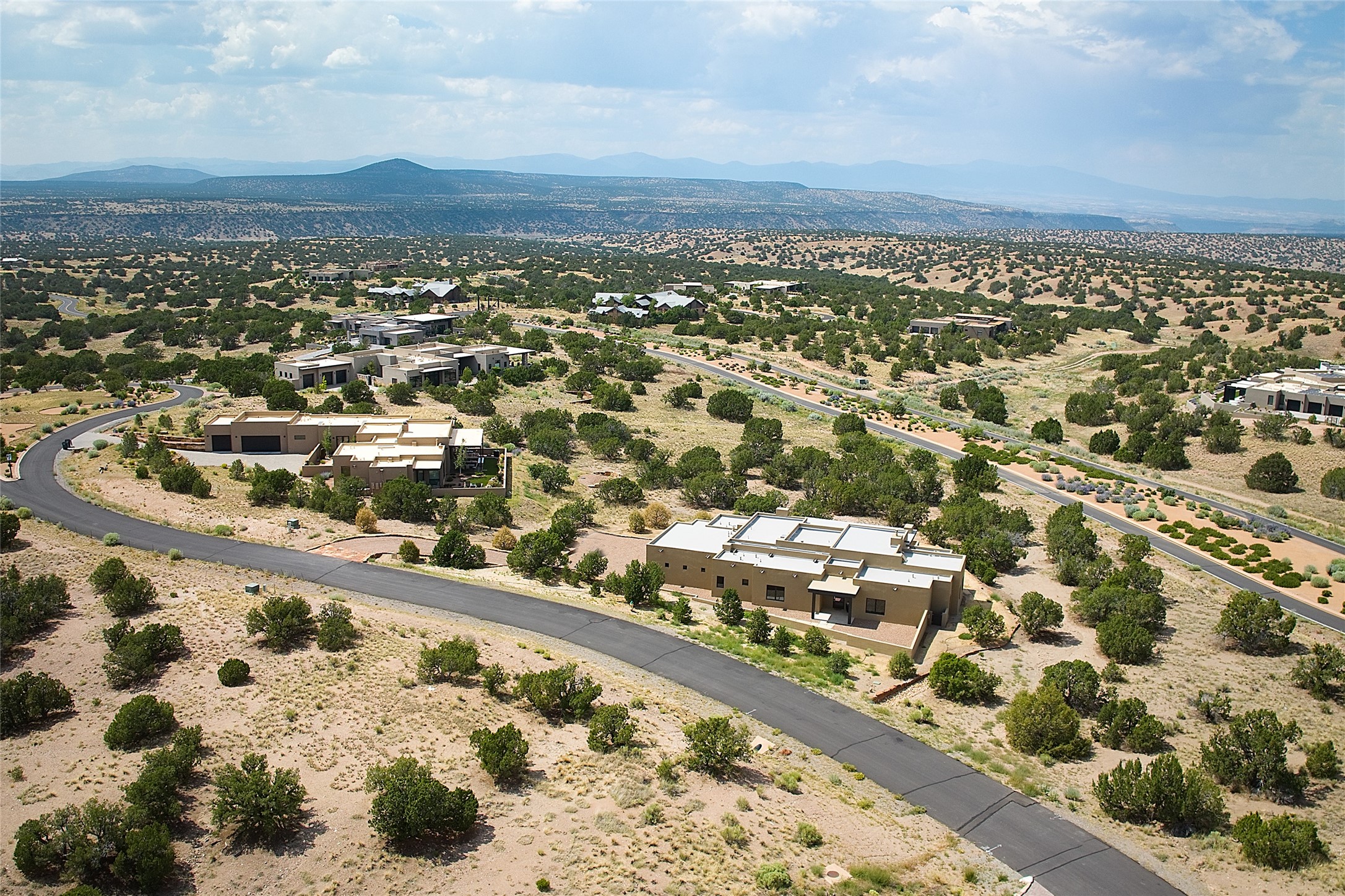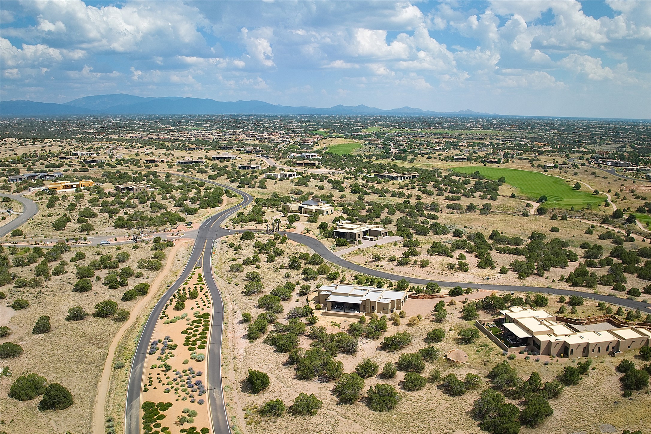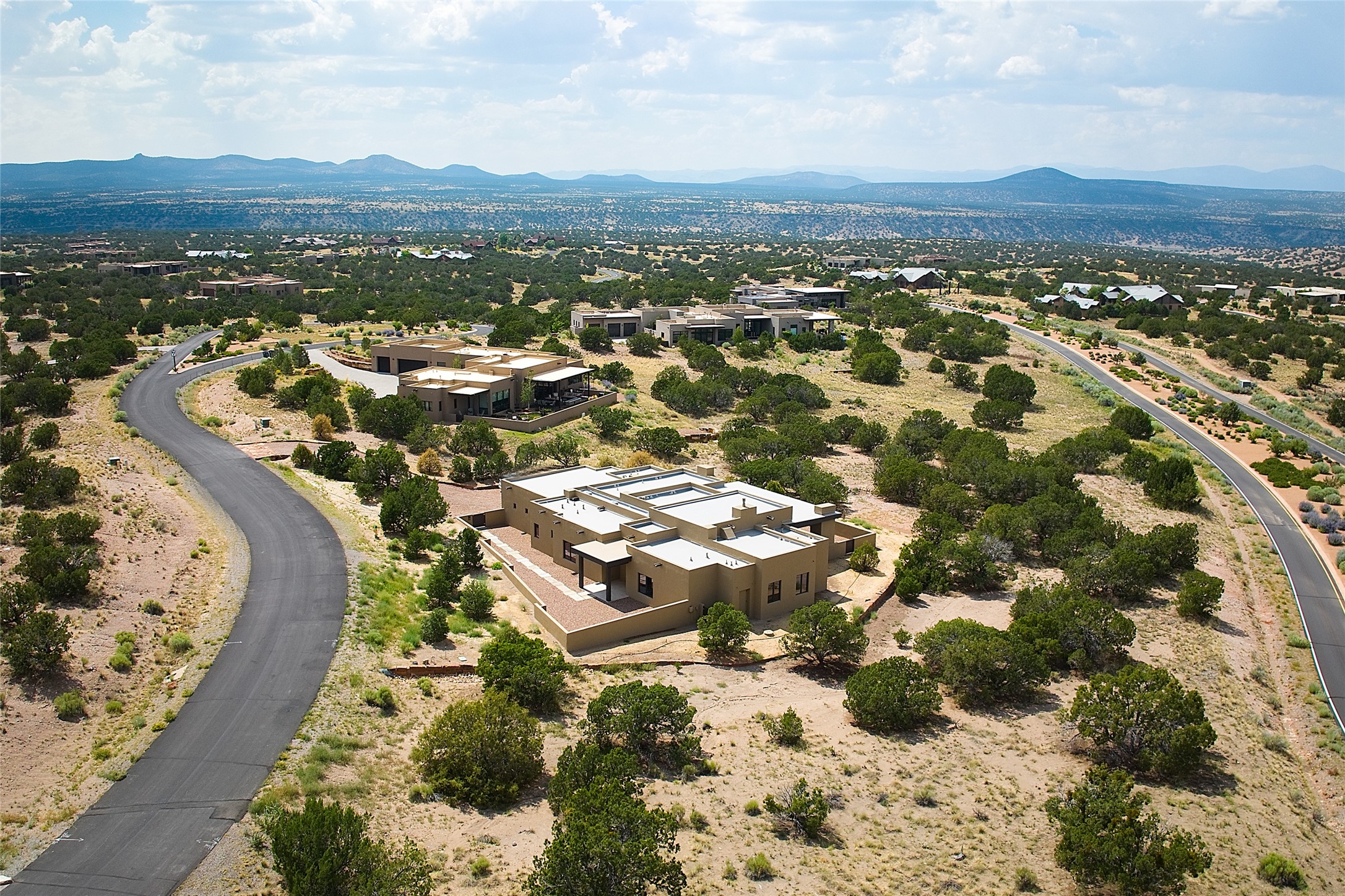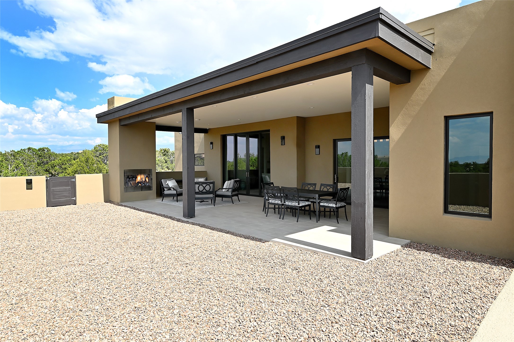 Exemplifying sleek, chic contemporary design in one of the most desirable locations in Santa Fe, this light-filled new three-bedroom, 3,394-square-foot residence affords sweeping vistas from its ideal location in the western reaches of the exclusive Las Campanas community. Sophisticated living and entertaining are effortless indoors and out thanks to an easy open floor plan that encompasses a living room with a soaring beamed ceiling, a modern gas fireplace, handsome built-ins, and 10-foot glass doors; a dining area with sliding glass doors; an impeccably appointed chef's kitchen with Caesarstone counters, handcrafted cabinets, and top-caliber appliances; and a Jemez-facing portal and courtyard-all linked in an effortless flow and basking in mountain and sunset views. Two generous guest bedrooms with spacious closets and en suite baths enjoy the seclusion of their own wing, while a quiet home office-which could easily serve as a fourth bedroom-is located down the hall and steps from a three-quarter bath. A serene, solitary oasis, the primary bedroom suite is tucked in a peaceful private spot and features a contemporary gas fireplace, a lavish bath with two vanities and both a soaking tub and a shower, and an impressively outfitted room-sized walk-in closet of nearly 200 square feet. Other welcome elements include a walk-in pantry or storage room; a bright, discreet laundry room; and a two-door, two-car garage with additional storage space.