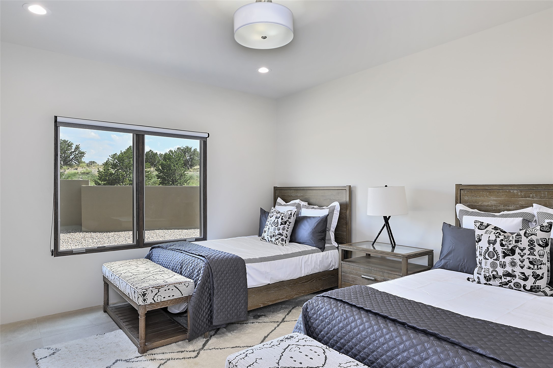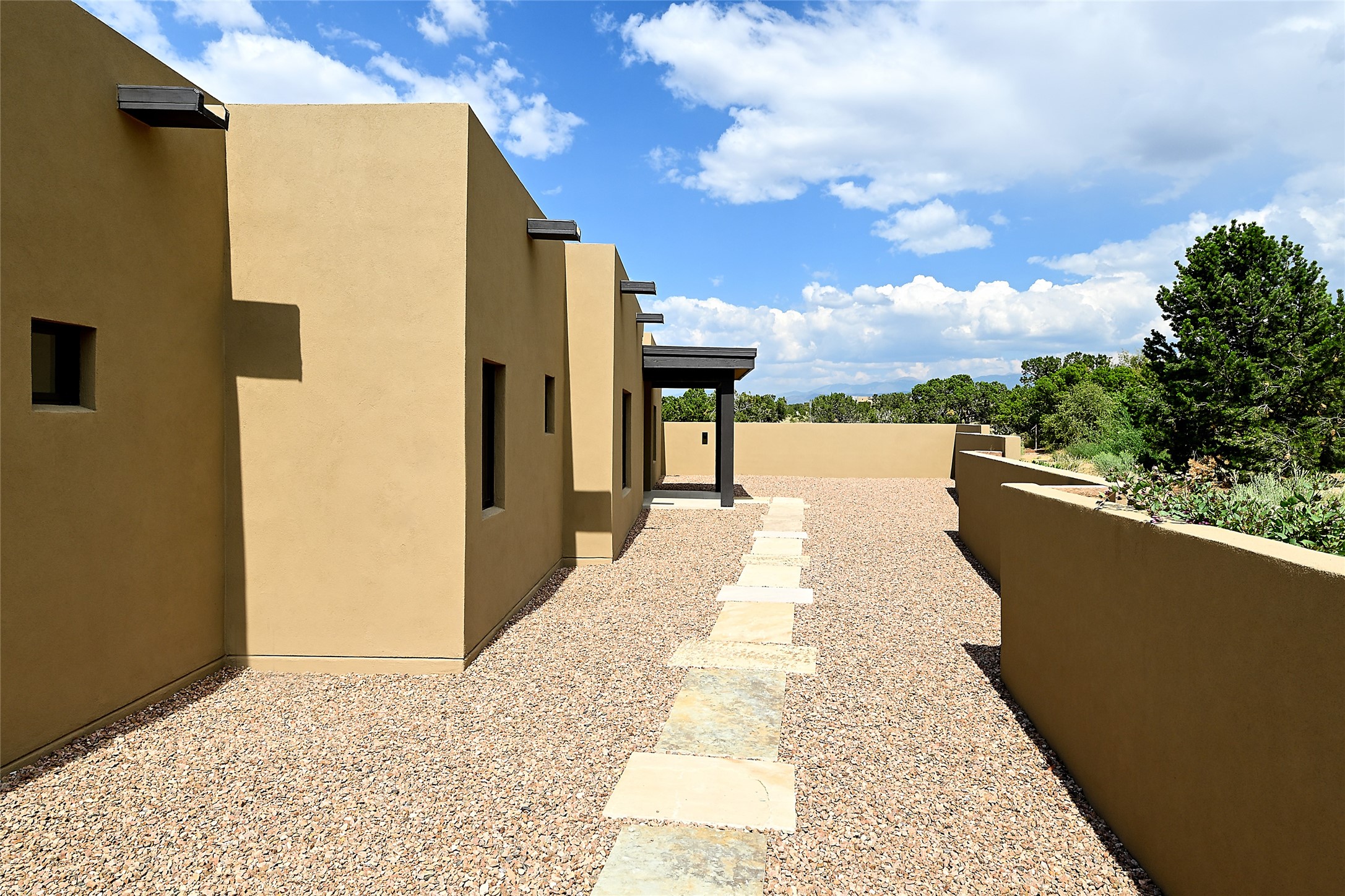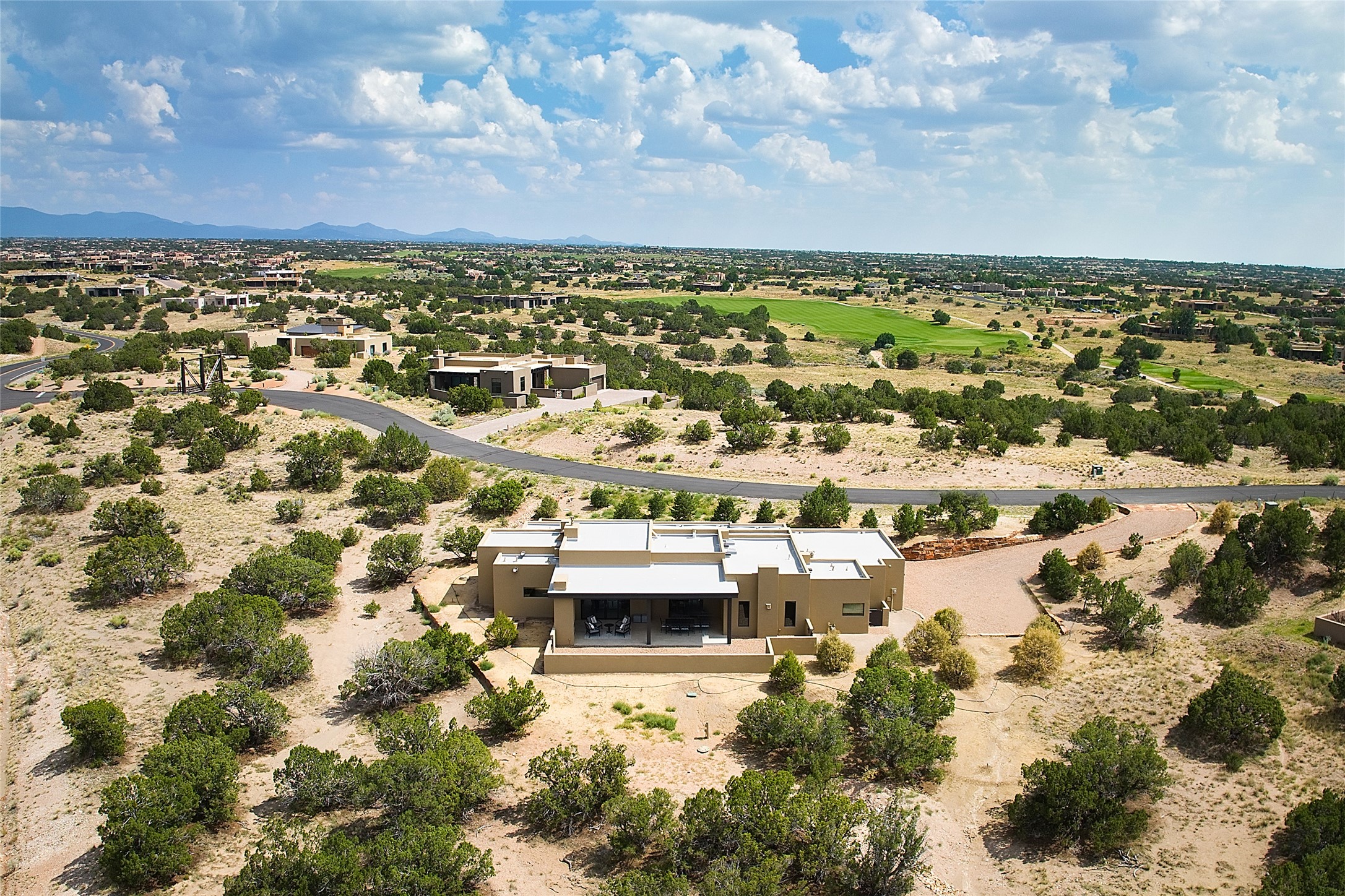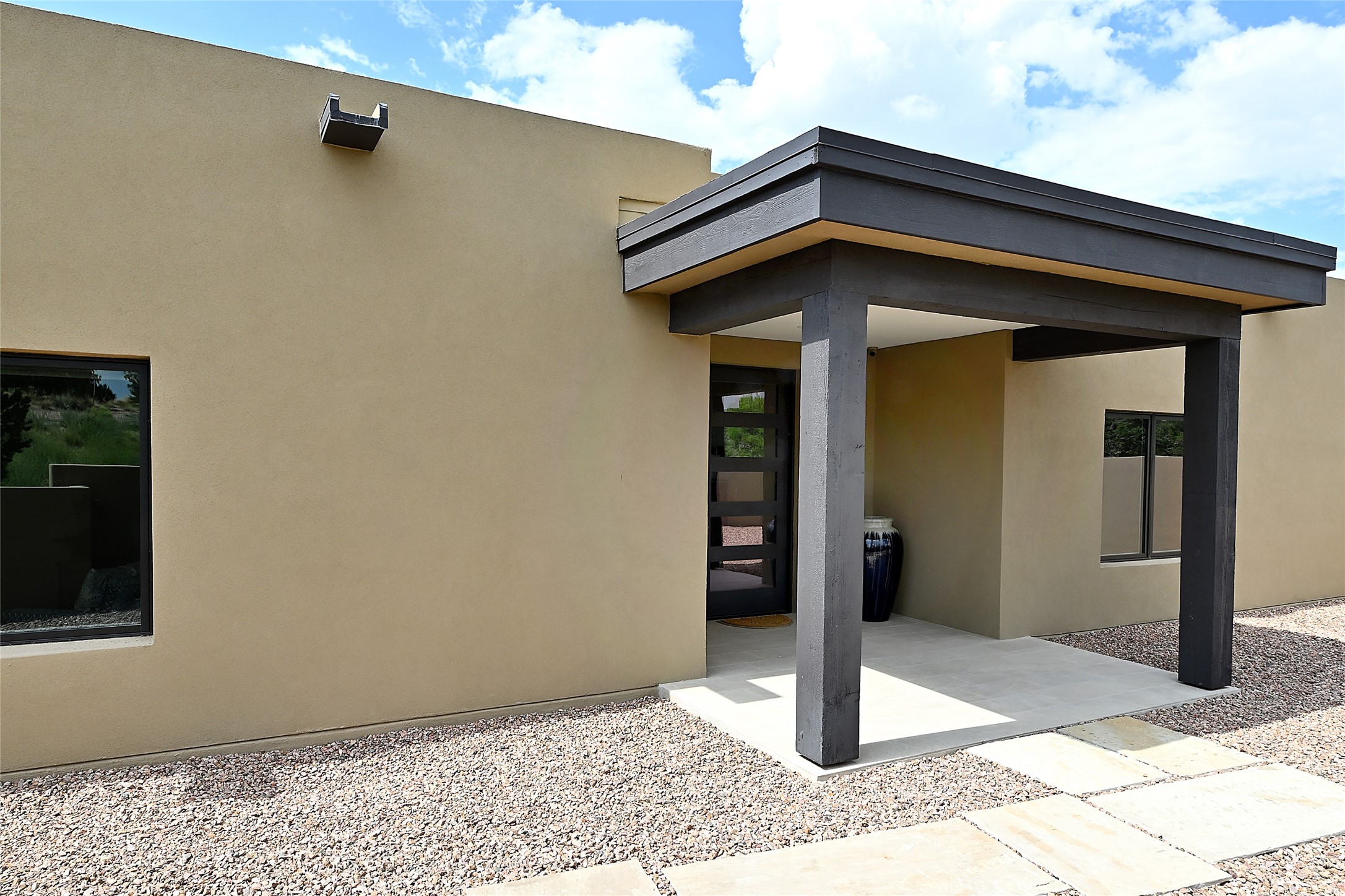 Exemplifying sleek, chic contemporary design in one of the most desirable locations in Santa Fe, this light-filled new three-bedroom, 3,394-square-foot residence affords sweeping vistas from its ideal location in the western reaches of the exclusive Las Campanas community. Sophisticated living and entertaining are effortless indoors and out thanks to an easy open floor plan that encompasses a living room with a soaring beamed ceiling, a modern gas fireplace, handsome built-ins, and 10-foot glass doors; a dining area with sliding glass doors; an impeccably appointed chef's kitchen with Caesarstone counters, handcrafted cabinets, and top-caliber appliances; and a Jemez-facing portal and courtyard-all linked in an effortless flow and basking in mountain and sunset views. Two generous guest bedrooms with spacious closets and en suite baths enjoy the seclusion of their own wing, while a quiet home office-which could easily serve as a fourth bedroom-is located down the hall and steps from a three-quarter bath. A serene, solitary oasis, the primary bedroom suite is tucked in a peaceful private spot and features a contemporary gas fireplace, a lavish bath with two vanities and both a soaking tub and a shower, and an impressively outfitted room-sized walk-in closet of nearly 200 square feet. Other welcome elements include a walk-in pantry or storage room; a bright, discreet laundry room; and a two-door, two-car garage with additional storage space.