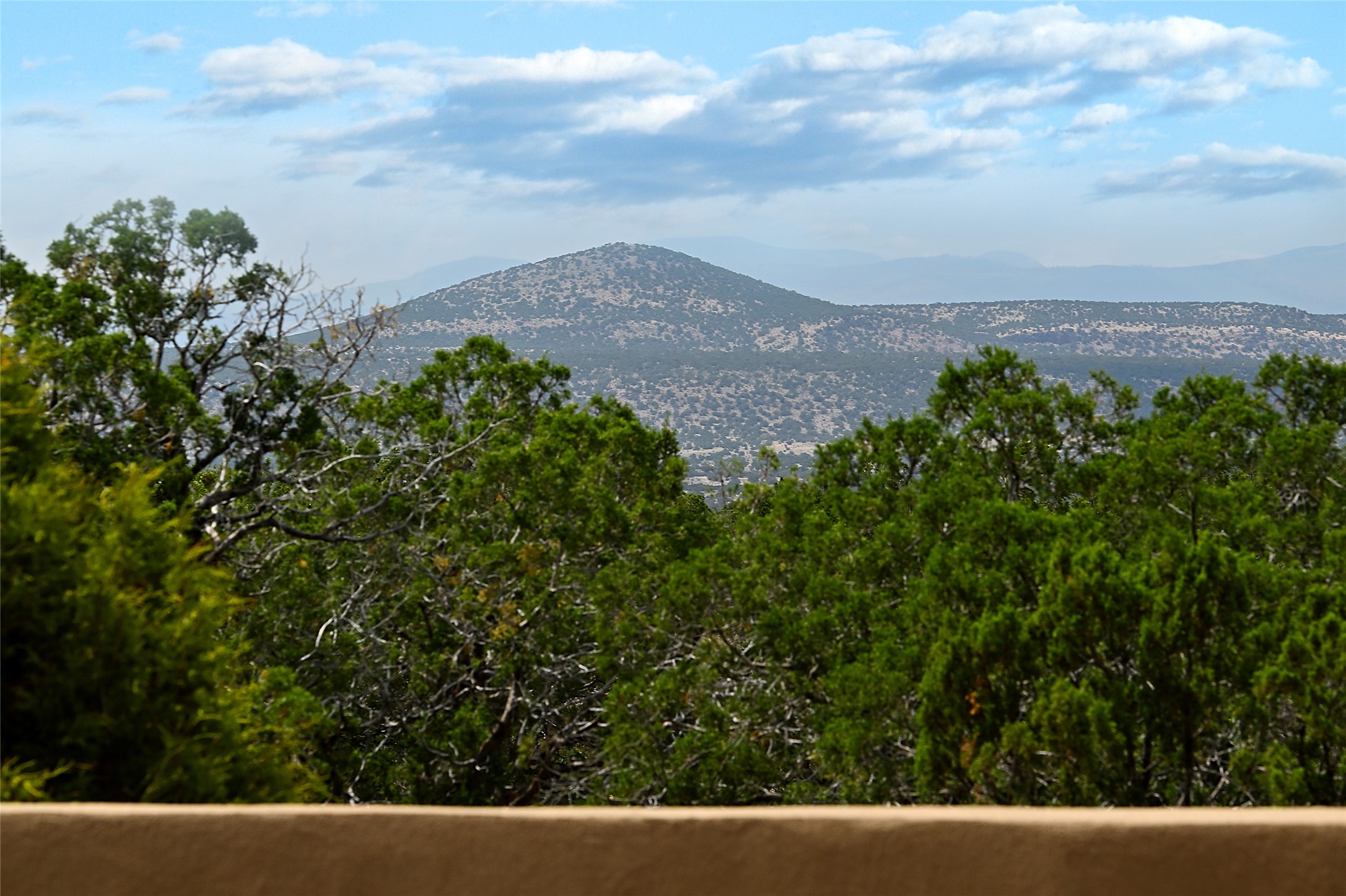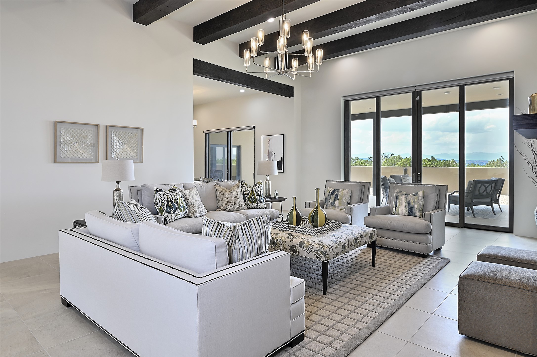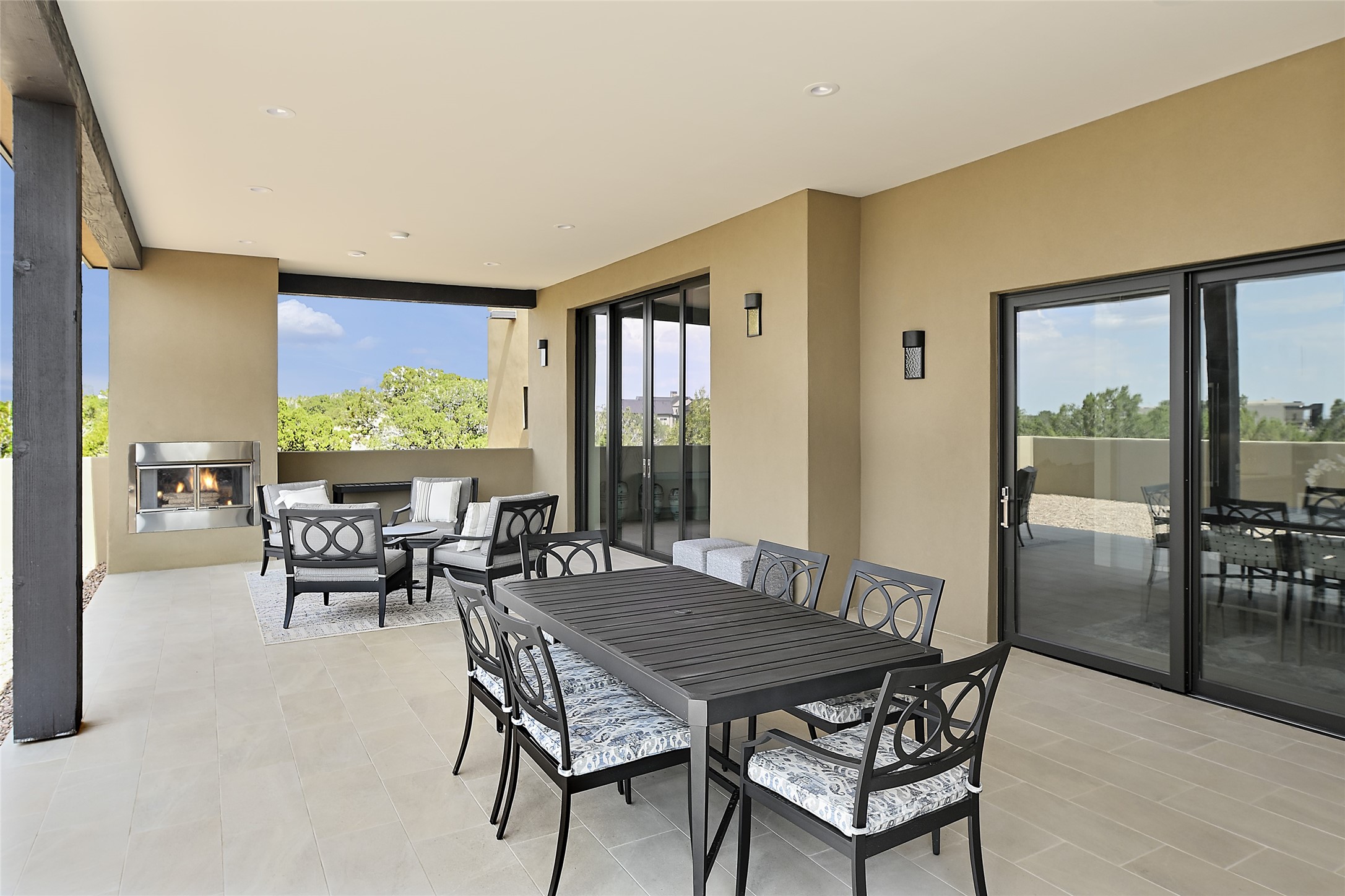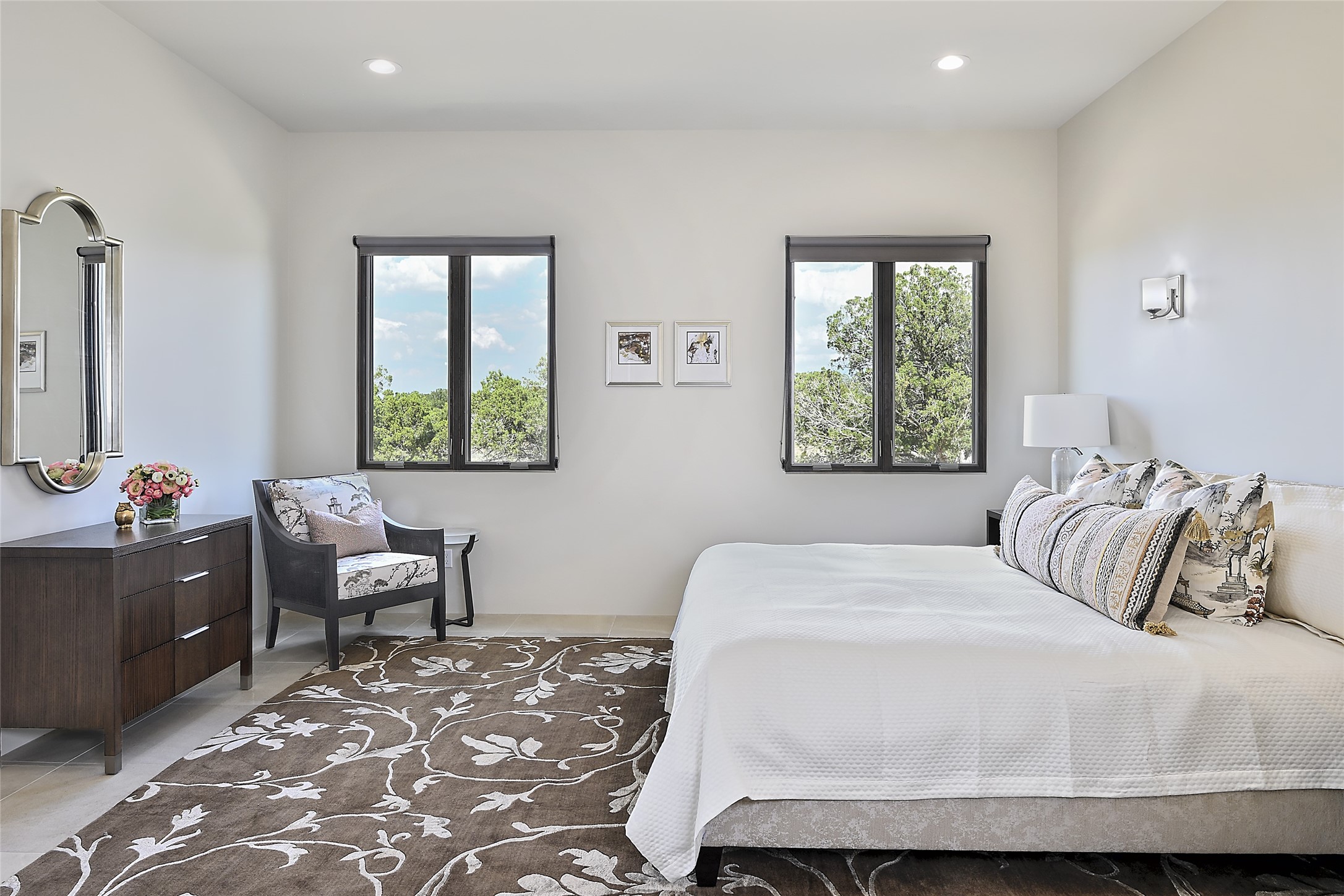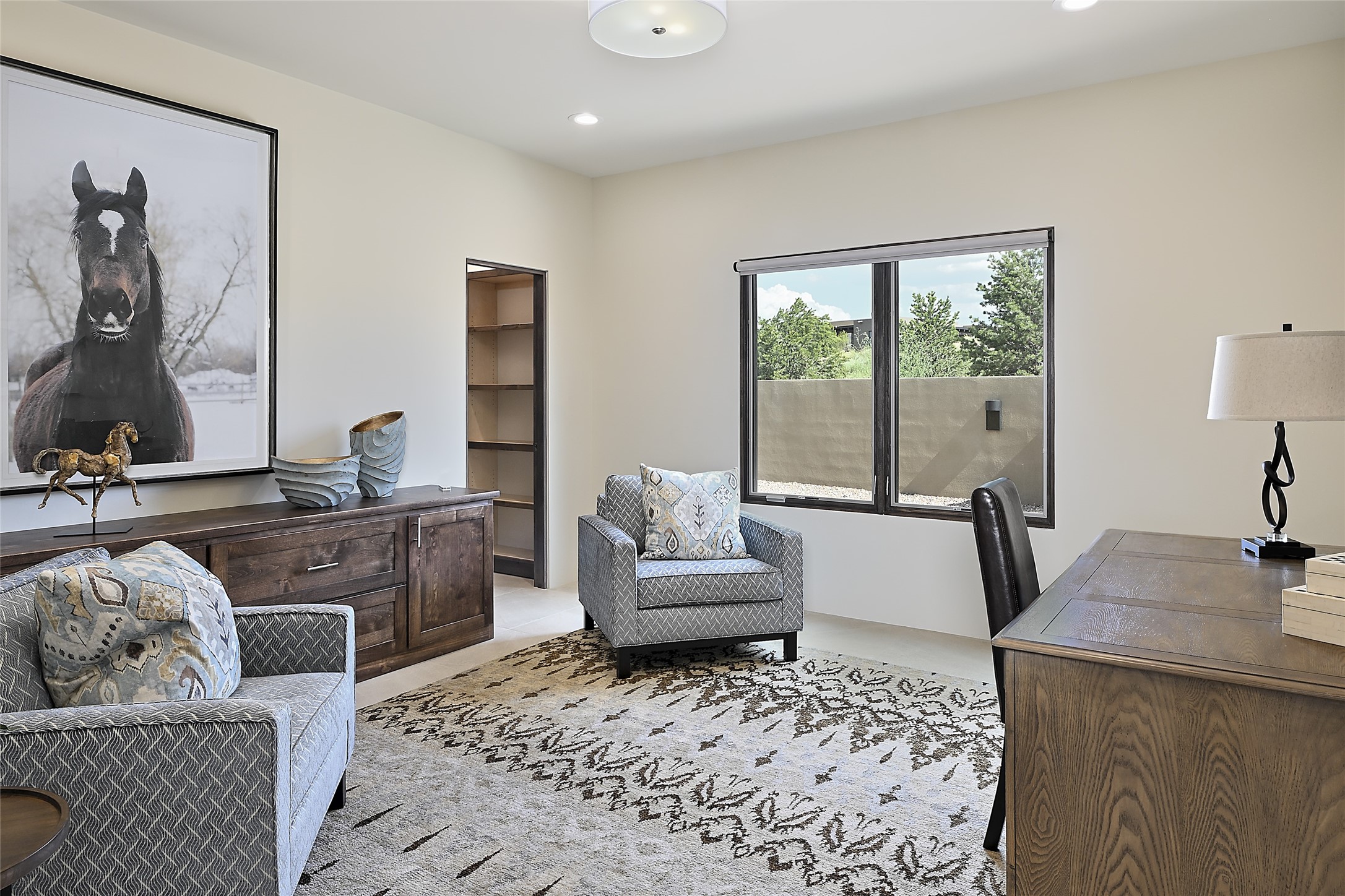 Exemplifying sleek, chic contemporary design in one of the most desirable locations in Santa Fe, this light-filled new three-bedroom, 3,394-square-foot residence affords sweeping vistas from its ideal location in the western reaches of the exclusive Las Campanas community. Sophisticated living and entertaining are effortless indoors and out thanks to an easy open floor plan that encompasses a living room with a soaring beamed ceiling, a modern gas fireplace, handsome built-ins, and 10-foot glass doors; a dining area with sliding glass doors; an impeccably appointed chef's kitchen with Caesarstone counters, handcrafted cabinets, and top-caliber appliances; and a Jemez-facing portal and courtyard-all linked in an effortless flow and basking in mountain and sunset views. Two generous guest bedrooms with spacious closets and en suite baths enjoy the seclusion of their own wing, while a quiet home office-which could easily serve as a fourth bedroom-is located down the hall and steps from a three-quarter bath. A serene, solitary oasis, the primary bedroom suite is tucked in a peaceful private spot and features a contemporary gas fireplace, a lavish bath with two vanities and both a soaking tub and a shower, and an impressively outfitted room-sized walk-in closet of nearly 200 square feet. Other welcome elements include a walk-in pantry or storage room; a bright, discreet laundry room; and a two-door, two-car garage with additional storage space.