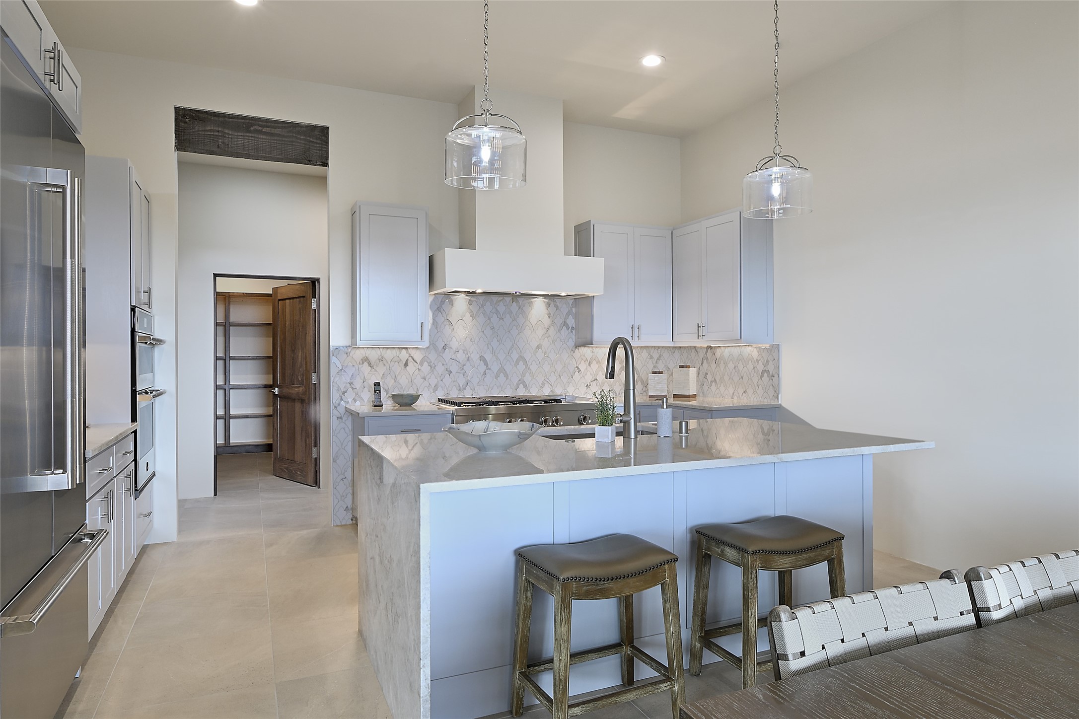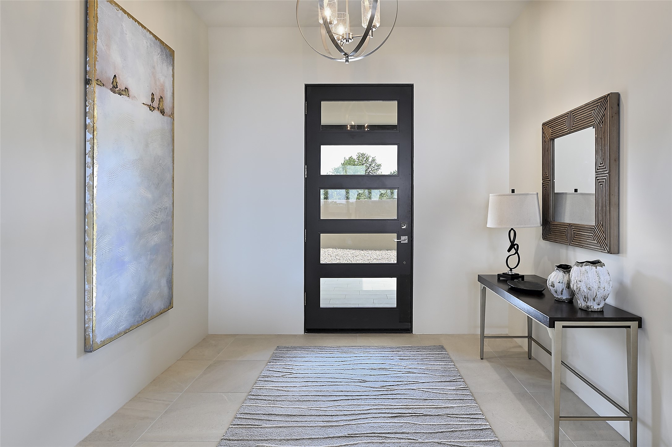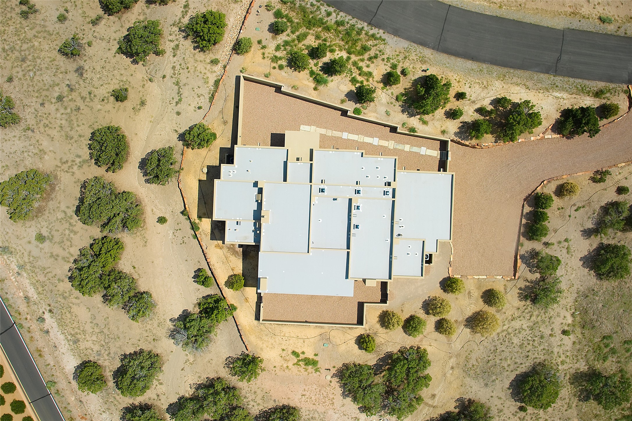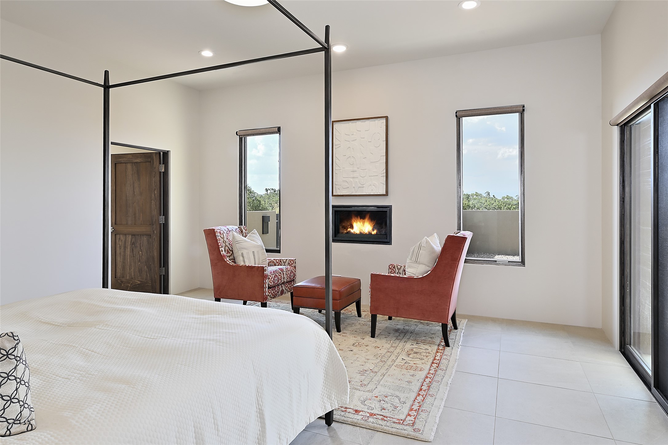 Exemplifying sleek, chic contemporary design in one of the most desirable locations in Santa Fe, this light-filled new three-bedroom, 3,394-square-foot residence affords sweeping vistas from its ideal location in the western reaches of the exclusive Las Campanas community. Sophisticated living and entertaining are effortless indoors and out thanks to an easy open floor plan that encompasses a living room with a soaring beamed ceiling, a modern gas fireplace, handsome built-ins, and 10-foot glass doors; a dining area with sliding glass doors; an impeccably appointed chef's kitchen with Caesarstone counters, handcrafted cabinets, and top-caliber appliances; and a Jemez-facing portal and courtyard-all linked in an effortless flow and basking in mountain and sunset views. Two generous guest bedrooms with spacious closets and en suite baths enjoy the seclusion of their own wing, while a quiet home office-which could easily serve as a fourth bedroom-is located down the hall and steps from a three-quarter bath. A serene, solitary oasis, the primary bedroom suite is tucked in a peaceful private spot and features a contemporary gas fireplace, a lavish bath with two vanities and both a soaking tub and a shower, and an impressively outfitted room-sized walk-in closet of nearly 200 square feet. Other welcome elements include a walk-in pantry or storage room; a bright, discreet laundry room; and a two-door, two-car garage with additional storage space.