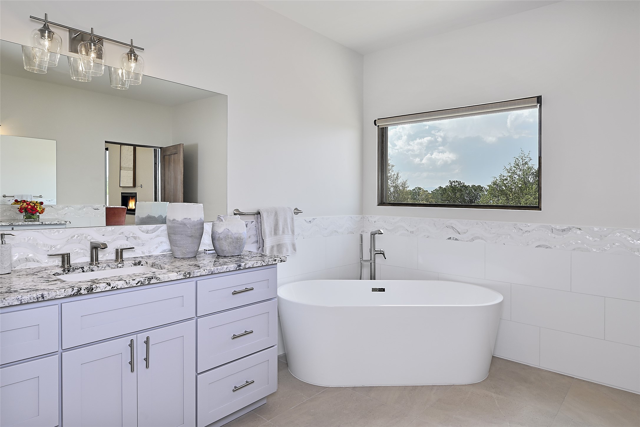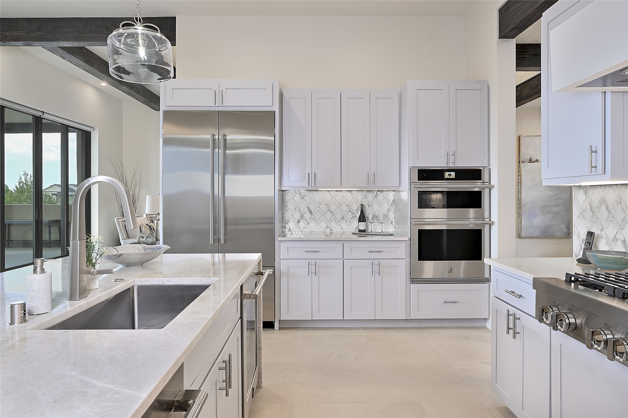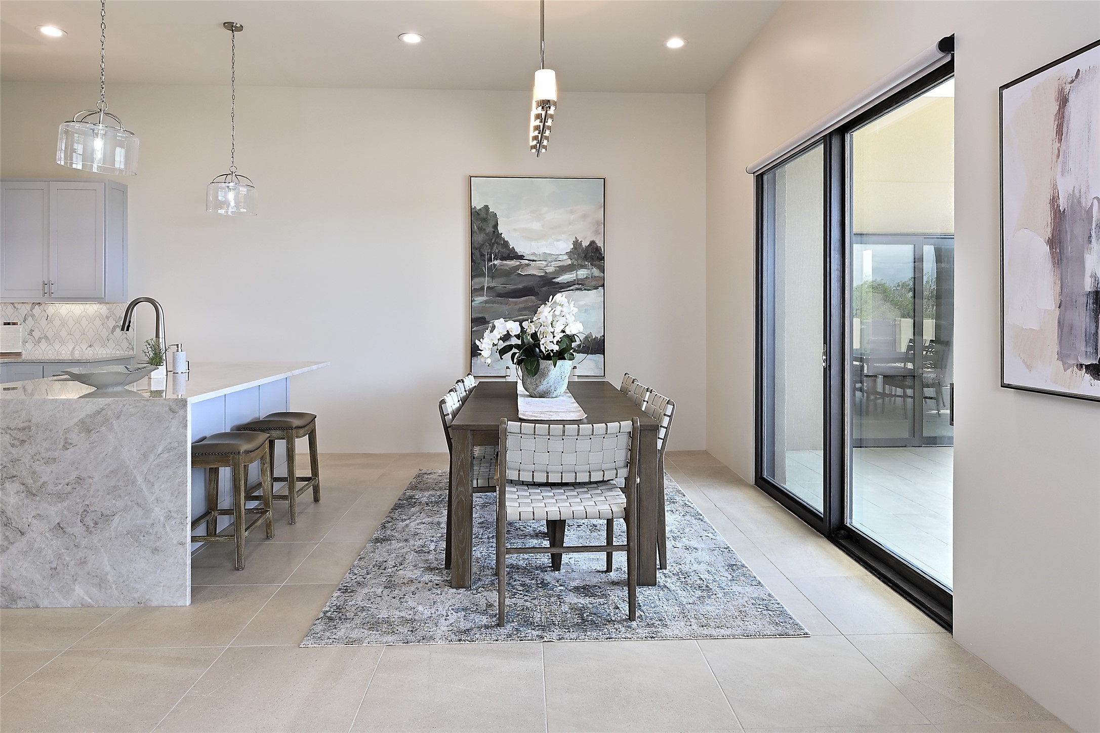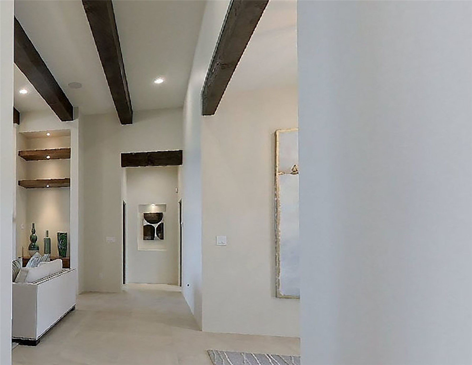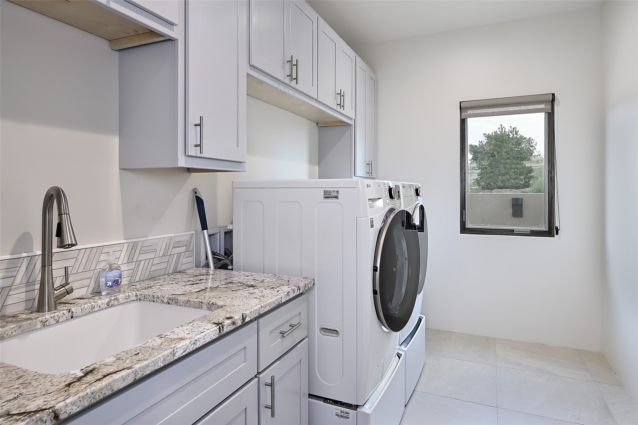 Exemplifying sleek, chic contemporary design in one of the most desirable locations in Santa Fe, this light-filled new three-bedroom, 3,394-square-foot residence affords sweeping vistas from its ideal location in the western reaches of the exclusive Las Campanas community. Sophisticated living and entertaining are effortless indoors and out thanks to an easy open floor plan that encompasses a living room with a soaring beamed ceiling, a modern gas fireplace, handsome built-ins, and 10-foot glass doors; a dining area with sliding glass doors; an impeccably appointed chef's kitchen with Caesarstone counters, handcrafted cabinets, and top-caliber appliances; and a Jemez-facing portal and courtyard-all linked in an effortless flow and basking in mountain and sunset views. Two generous guest bedrooms with spacious closets and en suite baths enjoy the seclusion of their own wing, while a quiet home office-which could easily serve as a fourth bedroom-is located down the hall and steps from a three-quarter bath. A serene, solitary oasis, the primary bedroom suite is tucked in a peaceful private spot and features a contemporary gas fireplace, a lavish bath with two vanities and both a soaking tub and a shower, and an impressively outfitted room-sized walk-in closet of nearly 200 square feet. Other welcome elements include a walk-in pantry or storage room; a bright, discreet laundry room; and a two-door, two-car garage with additional storage space.