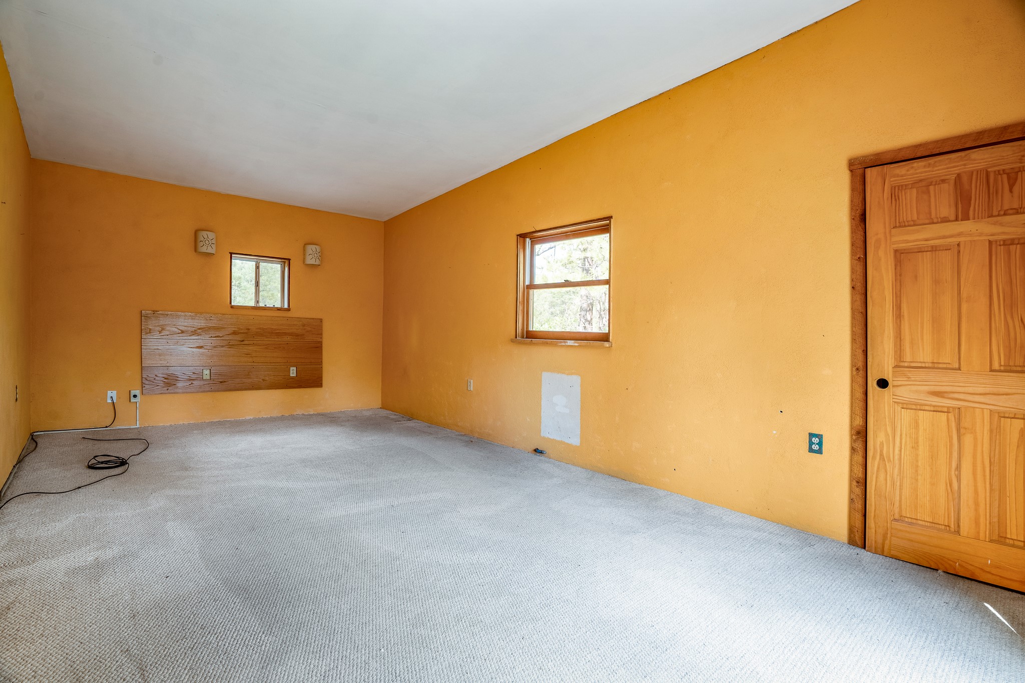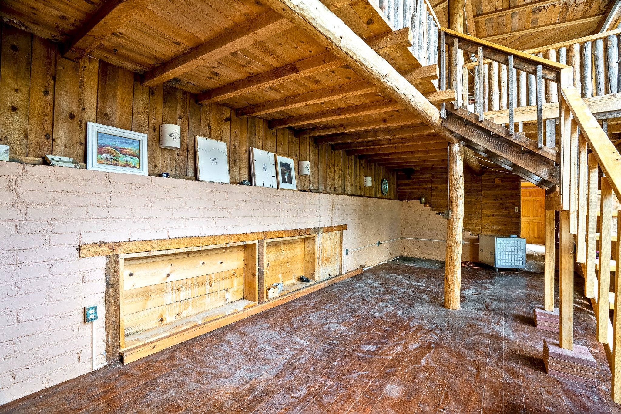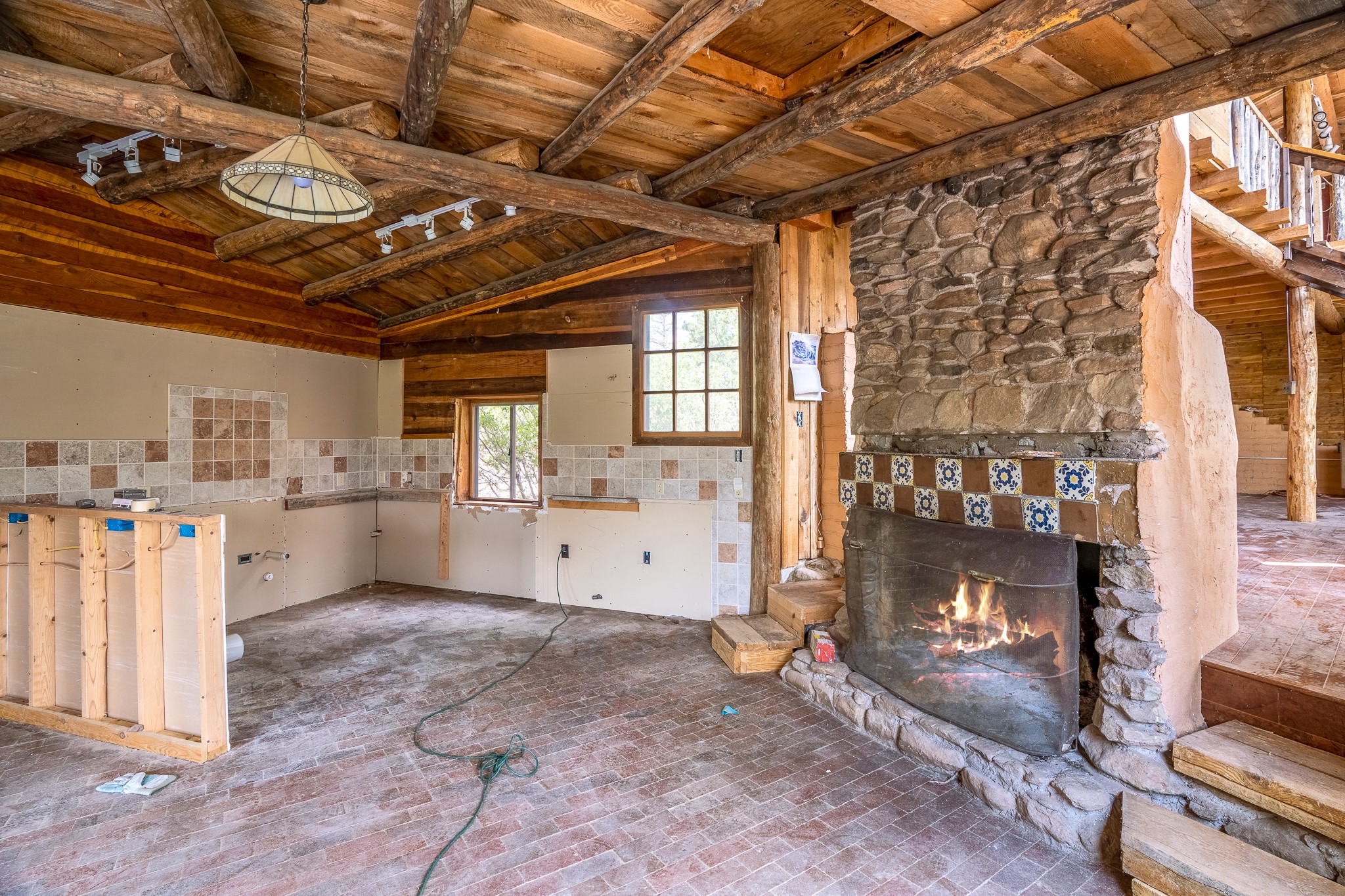 Discover serenity in this beautiful property, nine plus acres on La Cueva Road, in Glorieta. Embrace the rural setting with mature pine trees and captivating rock outcroppings. "The Barn," a spacious cabin-style home on the property, offers off-grid living at its finest. With a small PV solar system, water cistern, composting toilet and clawfoot bathtub, it's a sustainable retreat. Large exposed beams frame two loft spaces, connected by a great center staircase and catwalk. The open main level integrates the kitchen, dining, and living areas seamlessly with 3 sets of glass doors to nature. The original main structure will require renovation and is currently uninhabitable but offers features such as a private well, septic, electric utility services, large south-facing windows, sun deck, loft space, and a private primary suite. Escape the city to this rustic haven just 40 minutes from Santa Fe. Whether you seek tranquility or a creative sanctuary, this property offers both - a genuine mountain retreat. This property is an estate and being sold "as-is" with limited information available. Will most likely need to be a cash transaction given condition.