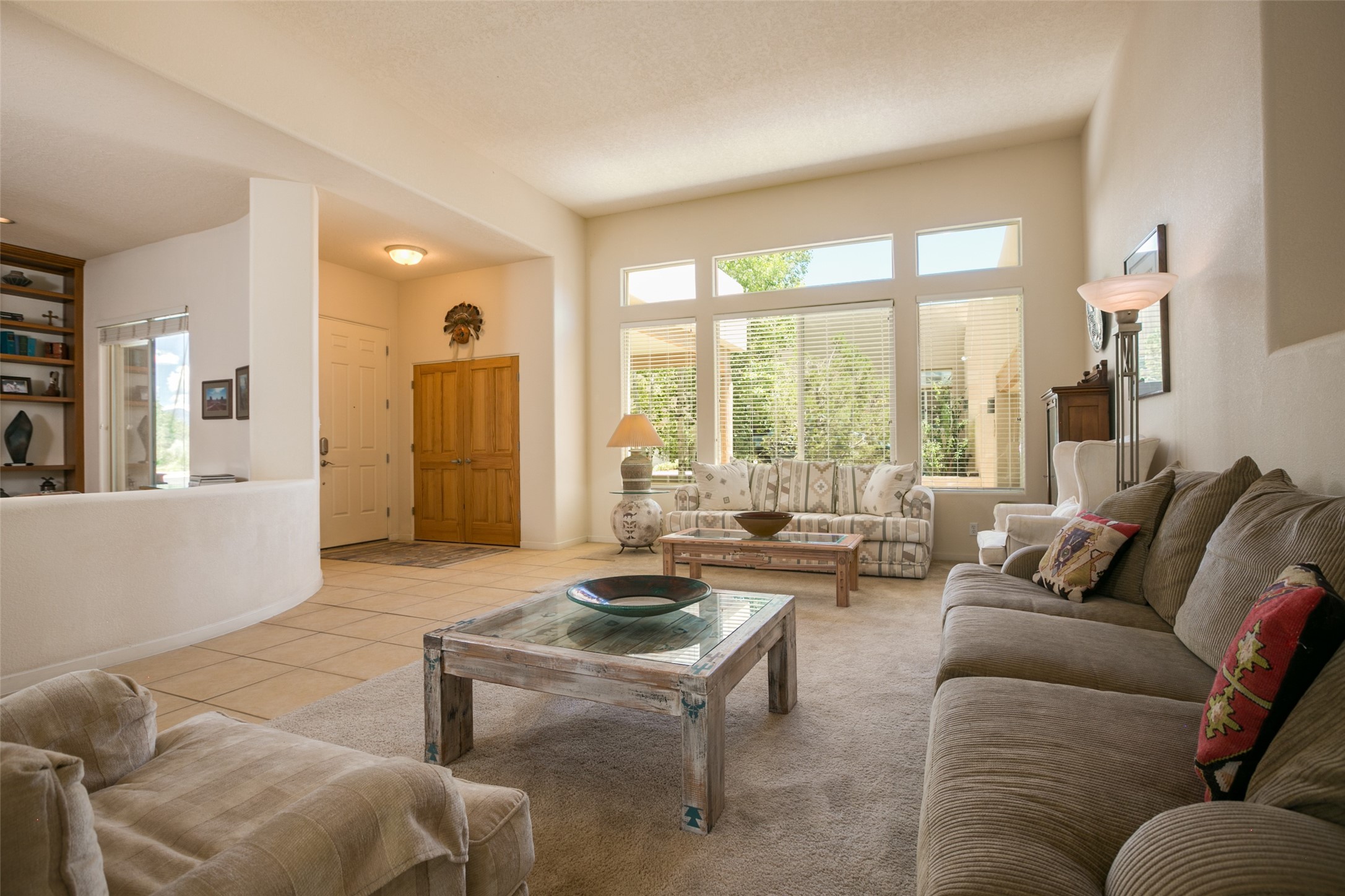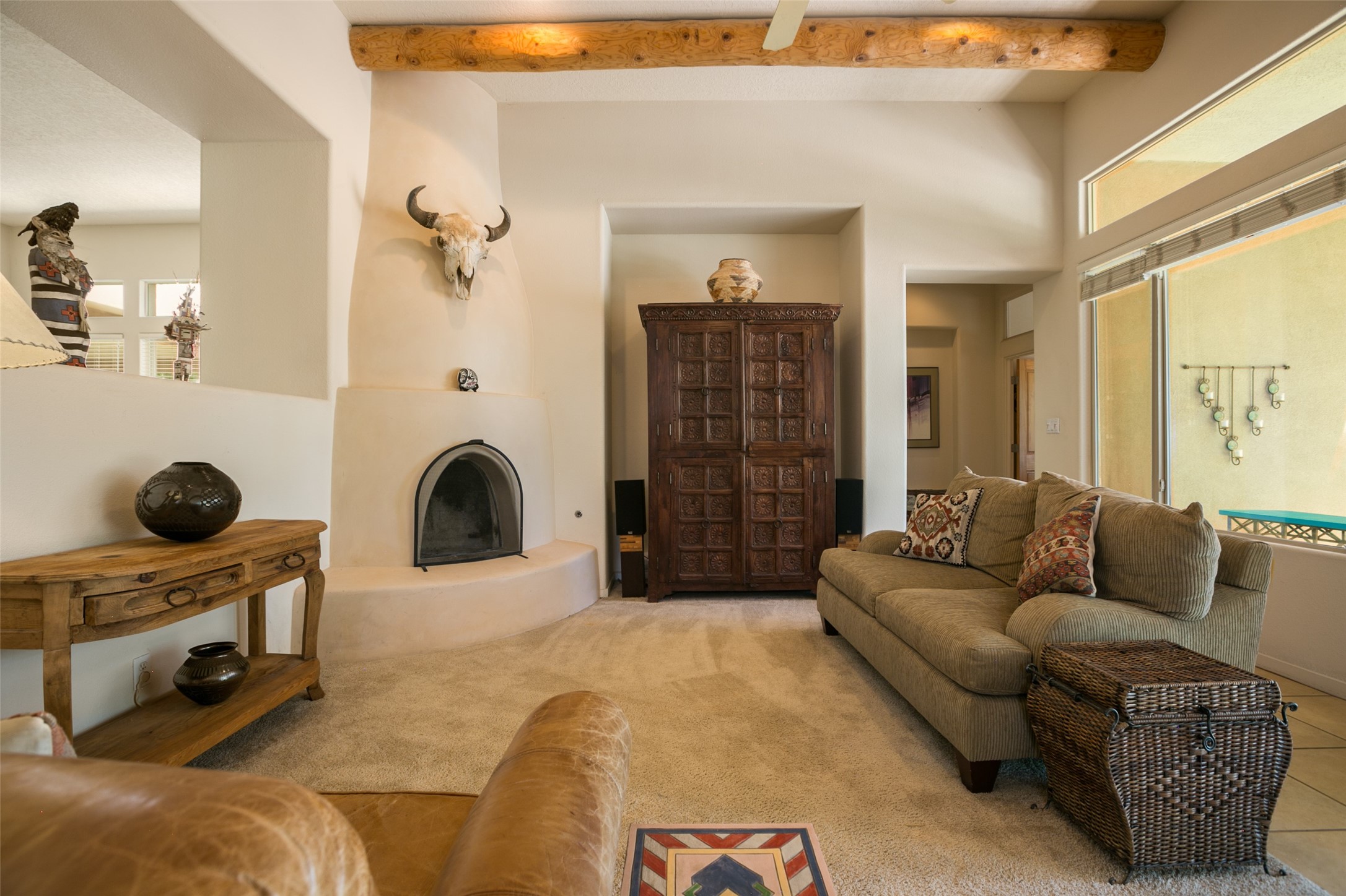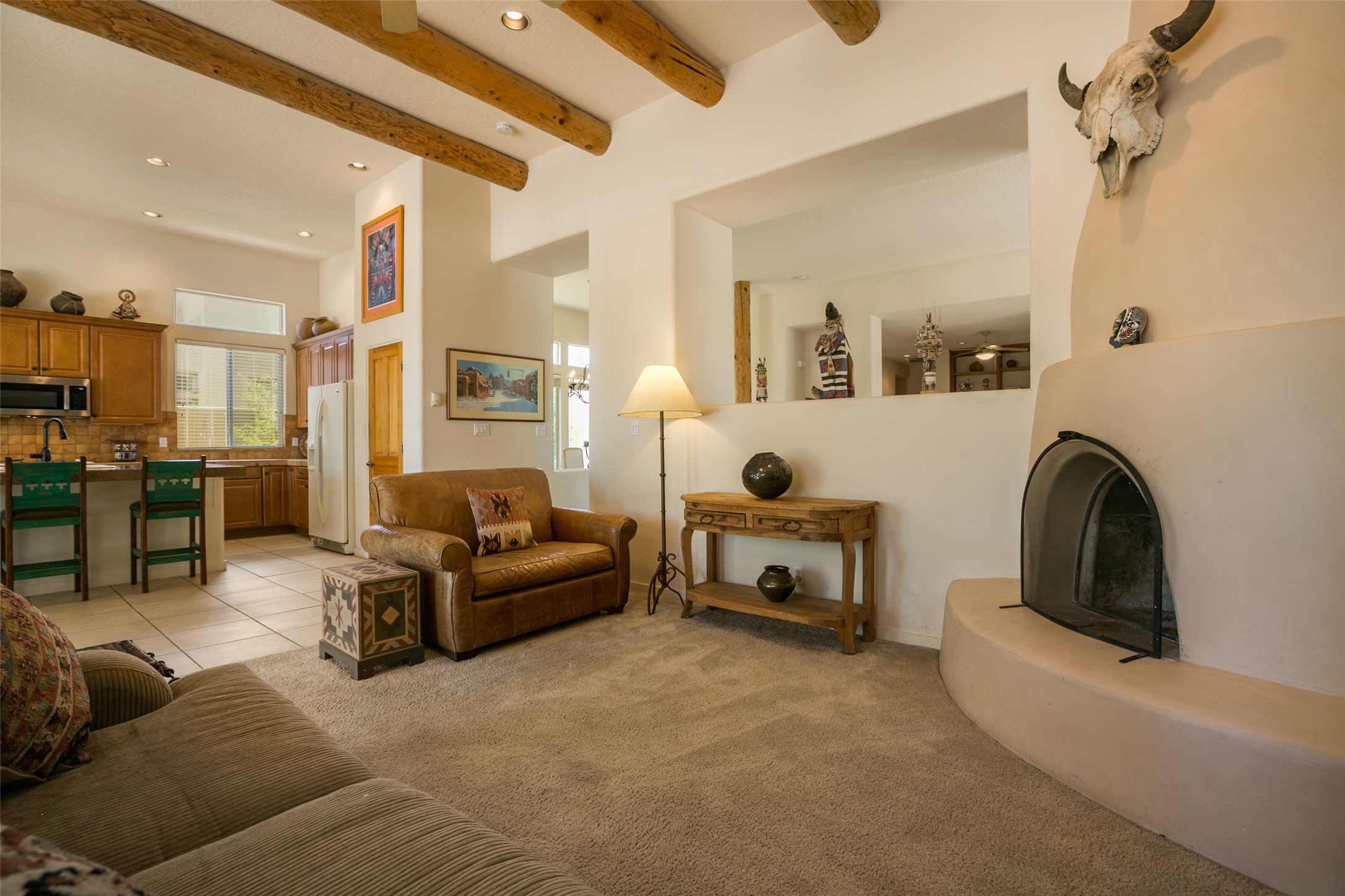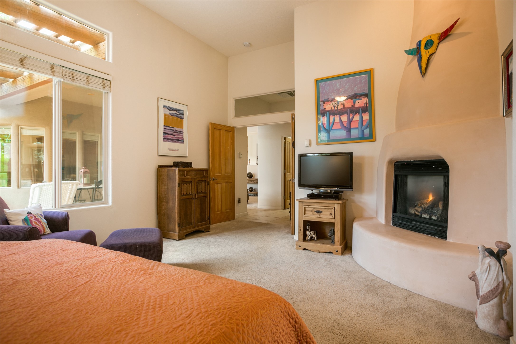 This Chaparral Model home offers an abundance of natural light, soaring 12 ft ceilings, a 4th bedroom with tile floors that could be used as a studio or private office space, mountain views, and high-end finishes throughout. The single-level open floor plan has complete separation of the primary bedroom from all other rooms in the home. The primary suite possesses a gas fireplace, a 17 ft deep walk-in closet with built-in storage from California Closets, a spa-like en-suite bathroom with double vanities, custom tile finishes, an enclosed toilet, garden tub, and a spacious walk-in shower. There is a formal living room, formal dining room, library with custom-made floor-to-ceiling bookcases, den/family room, kitchen island with seating for intimate meals, a large breakfast nook, and a laundry room with extra cabinets and storage. The Chef's kitchen is equipped with ample counter space and cabinets for storage, a large pantry, a built-in desk area, and some newer appliances. The kitchen opens up to the den/family room which features a wood-burning Kiva fireplace and a wall of windows inviting you to step outside. The amazing flagstone patio and the covered portal were custom designed with large vigas and corbels to replicate the ones found at the La Fonda Hotel. This very private and oversized lot was professionally landscaped with Aspen and Pine trees and native plants and has a new irrigation system. This home has 2 separate evaporative cooling systems and radiant heat. The residents of the Rancho Viejo community enjoy many miles of paved trails through the preserved, natural open space which provides expansive mountain views for walking and biking, plus 6 neighborhood parks with play equipment. Don't miss this true gem!
