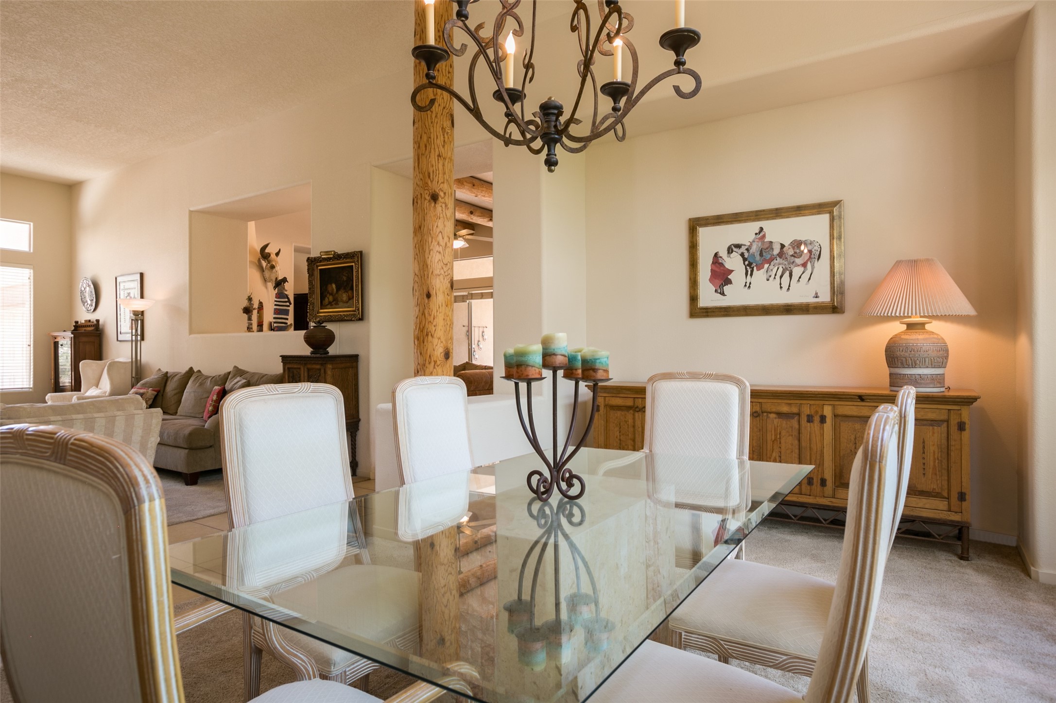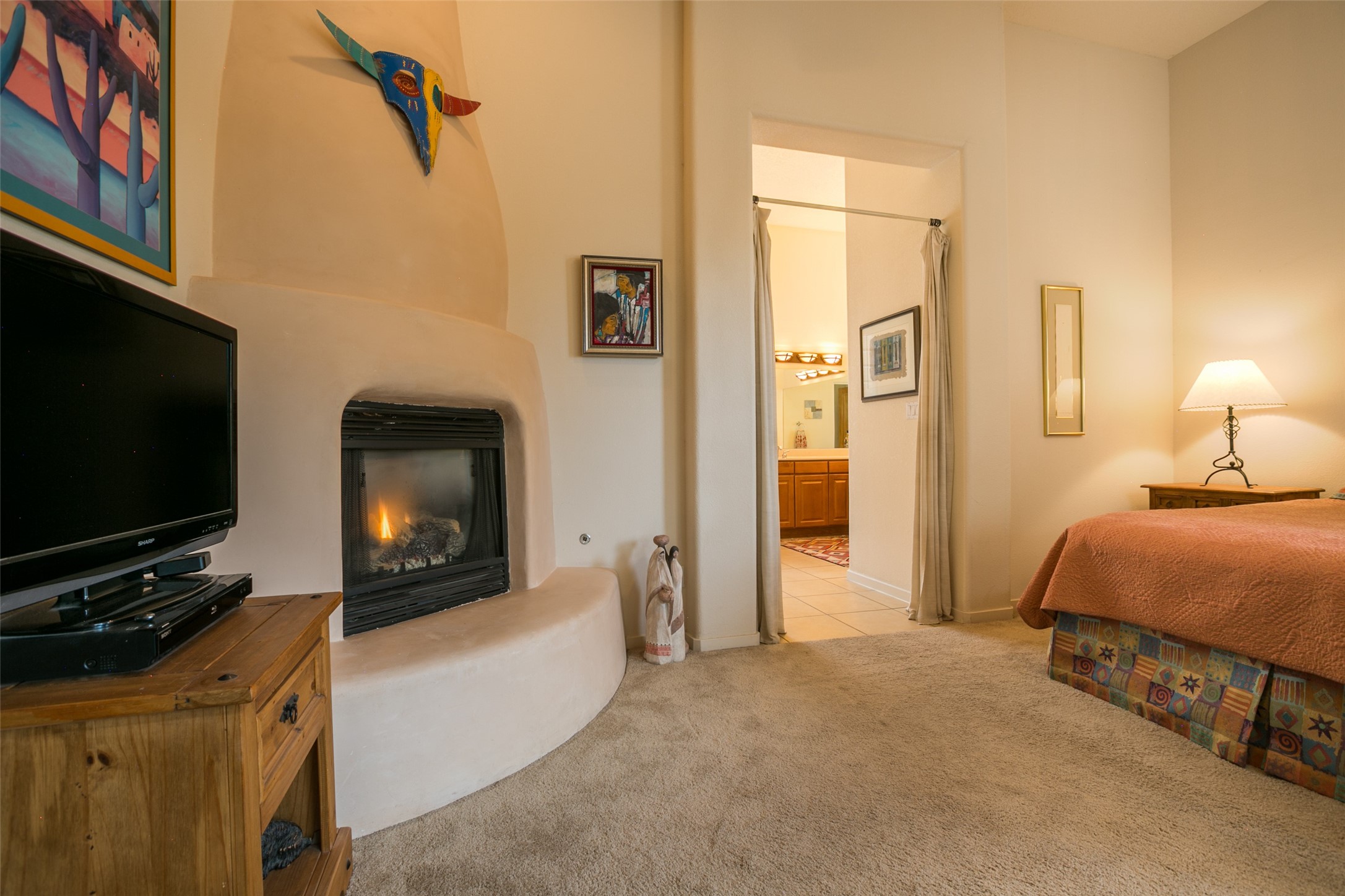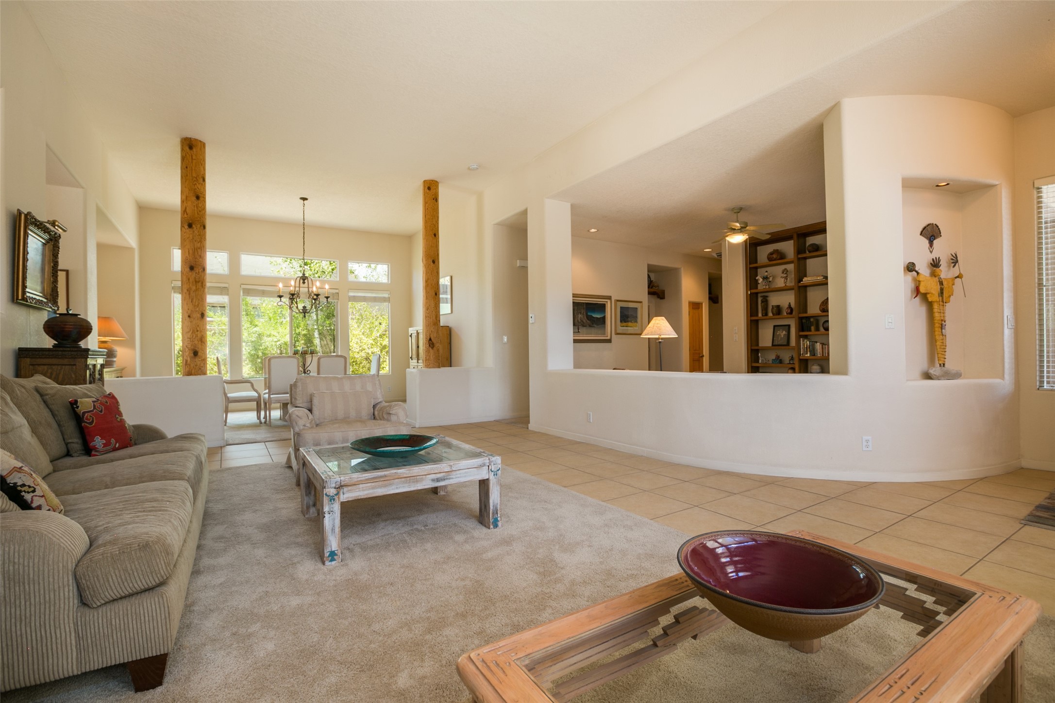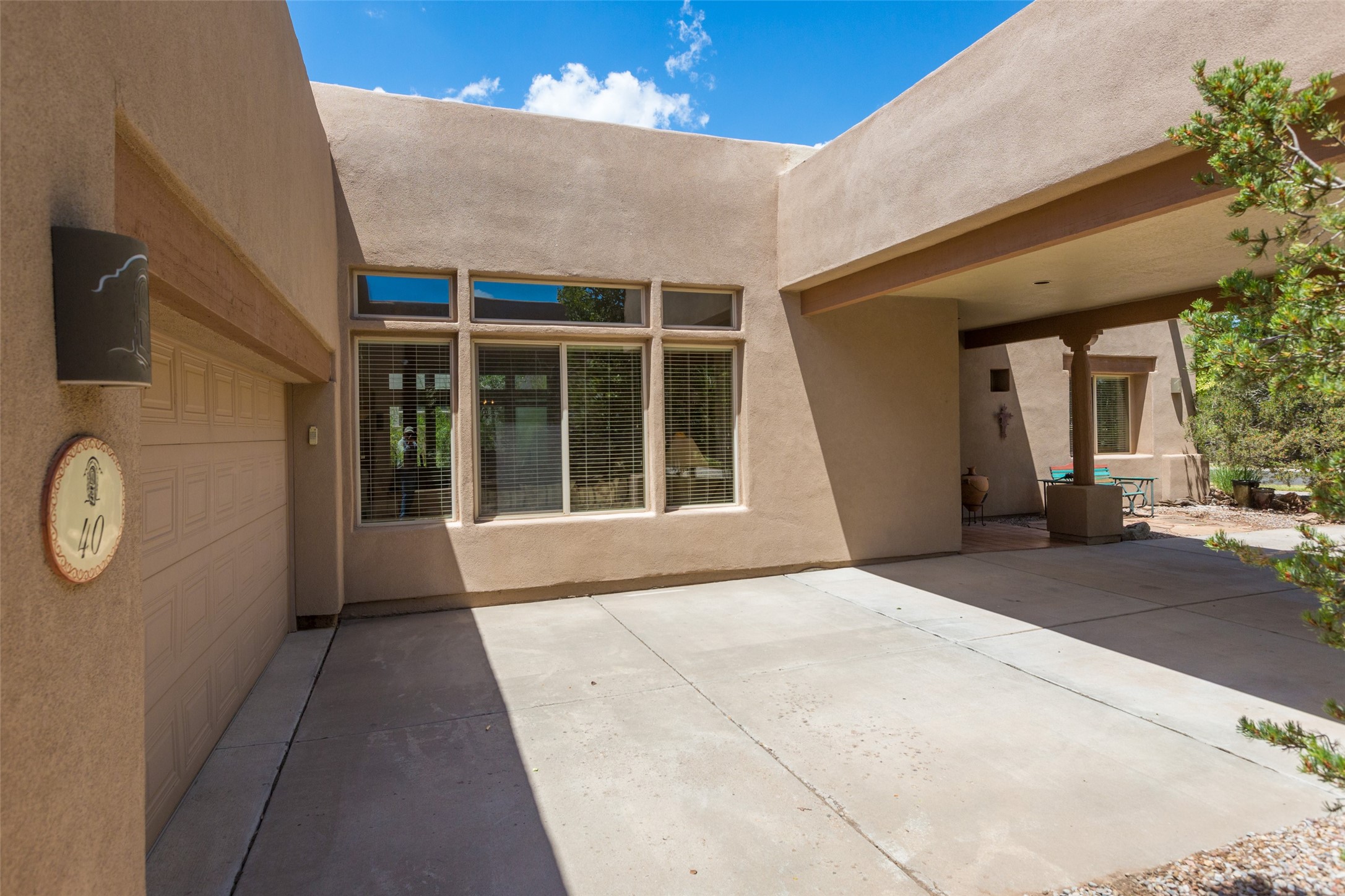 This Chaparral Model home offers an abundance of natural light, soaring 12 ft ceilings, a 4th bedroom with tile floors that could be used as a studio or private office space, mountain views, and high-end finishes throughout. The single-level open floor plan has complete separation of the primary bedroom from all other rooms in the home. The primary suite possesses a gas fireplace, a 17 ft deep walk-in closet with built-in storage from California Closets, a spa-like en-suite bathroom with double vanities, custom tile finishes, an enclosed toilet, garden tub, and a spacious walk-in shower. There is a formal living room, formal dining room, library with custom-made floor-to-ceiling bookcases, den/family room, kitchen island with seating for intimate meals, a large breakfast nook, and a laundry room with extra cabinets and storage. The Chef's kitchen is equipped with ample counter space and cabinets for storage, a large pantry, a built-in desk area, and some newer appliances. The kitchen opens up to the den/family room which features a wood-burning Kiva fireplace and a wall of windows inviting you to step outside. The amazing flagstone patio and the covered portal were custom designed with large vigas and corbels to replicate the ones found at the La Fonda Hotel. This very private and oversized lot was professionally landscaped with Aspen and Pine trees and native plants and has a new irrigation system. This home has 2 separate evaporative cooling systems and radiant heat. The residents of the Rancho Viejo community enjoy many miles of paved trails through the preserved, natural open space which provides expansive mountain views for walking and biking, plus 6 neighborhood parks with play equipment. Don't miss this true gem!