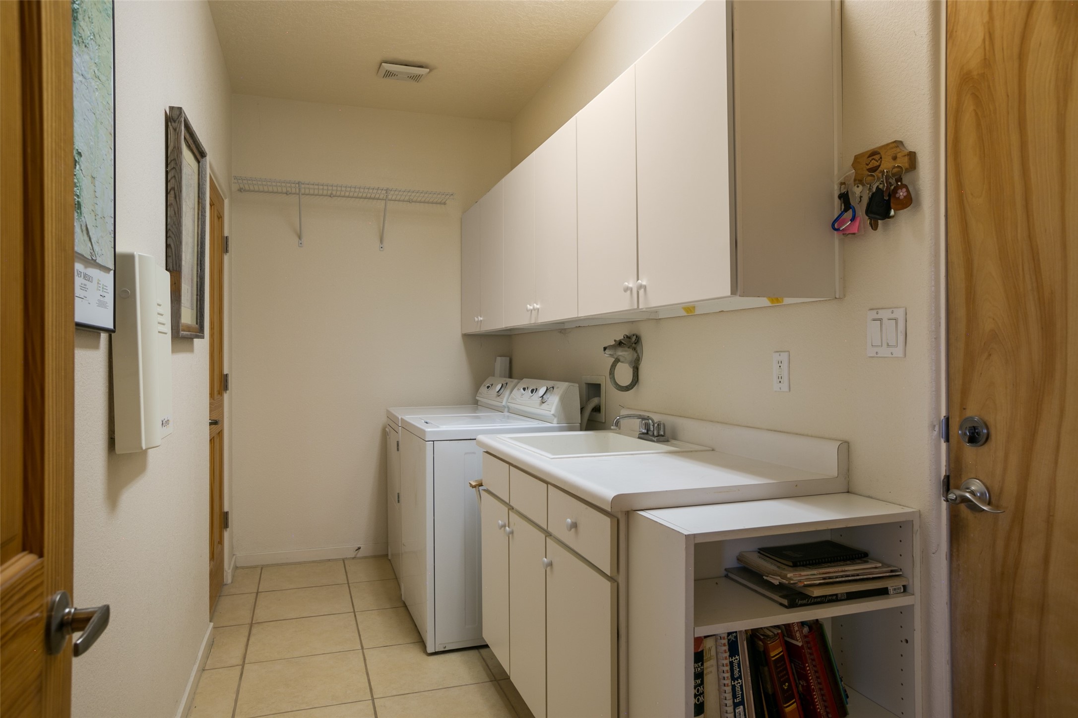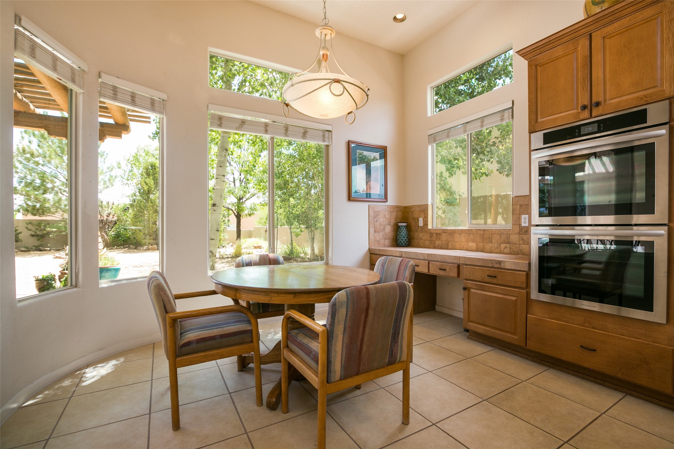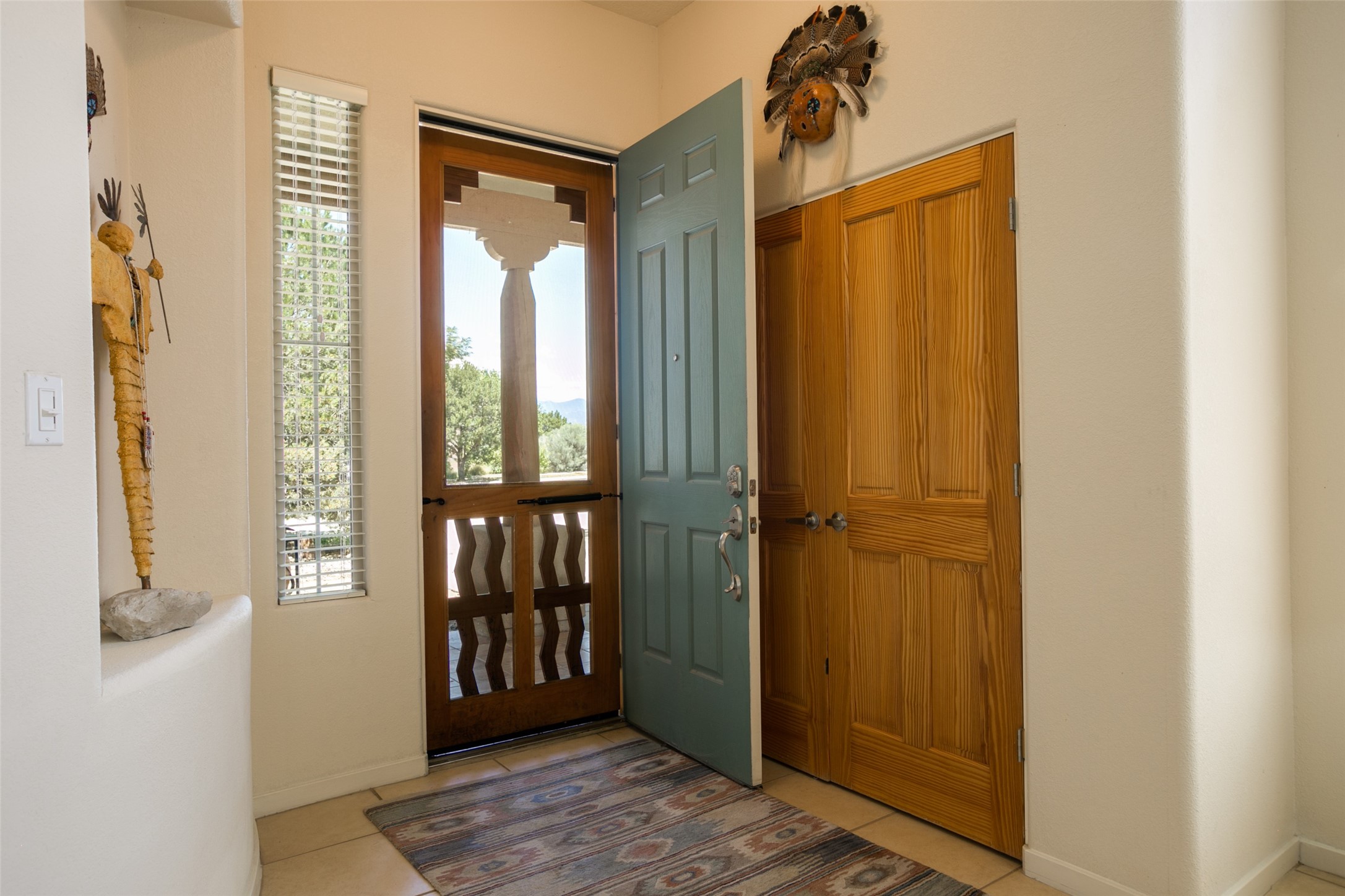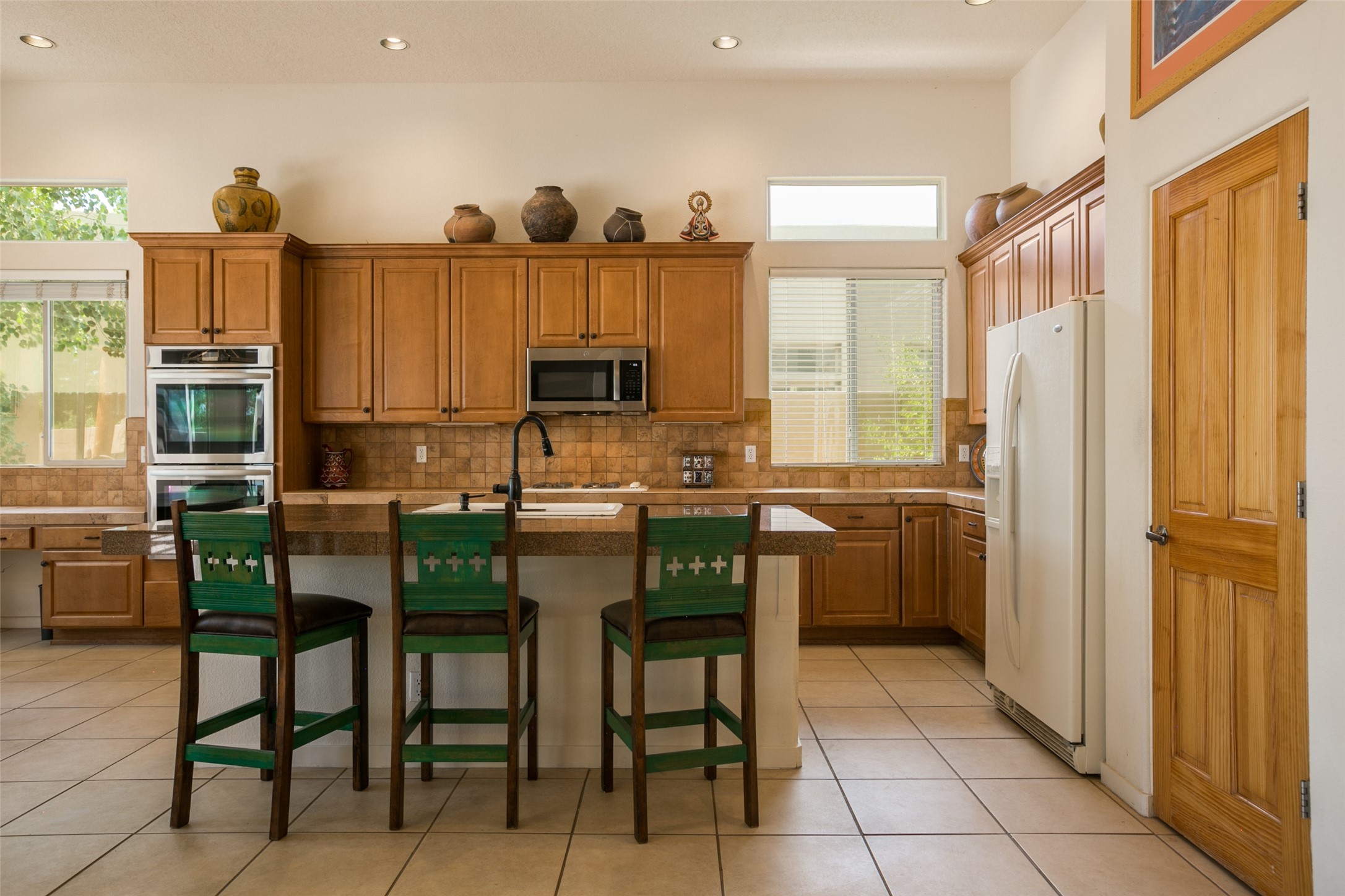 This Chaparral Model home offers an abundance of natural light, soaring 12 ft ceilings, a 4th bedroom with tile floors that could be used as a studio or private office space, mountain views, and high-end finishes throughout. The single-level open floor plan has complete separation of the primary bedroom from all other rooms in the home. The primary suite possesses a gas fireplace, a 17 ft deep walk-in closet with built-in storage from California Closets, a spa-like en-suite bathroom with double vanities, custom tile finishes, an enclosed toilet, garden tub, and a spacious walk-in shower. There is a formal living room, formal dining room, library with custom-made floor-to-ceiling bookcases, den/family room, kitchen island with seating for intimate meals, a large breakfast nook, and a laundry room with extra cabinets and storage. The Chef's kitchen is equipped with ample counter space and cabinets for storage, a large pantry, a built-in desk area, and some newer appliances. The kitchen opens up to the den/family room which features a wood-burning Kiva fireplace and a wall of windows inviting you to step outside. The amazing flagstone patio and the covered portal were custom designed with large vigas and corbels to replicate the ones found at the La Fonda Hotel. This very private and oversized lot was professionally landscaped with Aspen and Pine trees and native plants and has a new irrigation system. This home has 2 separate evaporative cooling systems and radiant heat. The residents of the Rancho Viejo community enjoy many miles of paved trails through the preserved, natural open space which provides expansive mountain views for walking and biking, plus 6 neighborhood parks with play equipment. Don't miss this true gem!