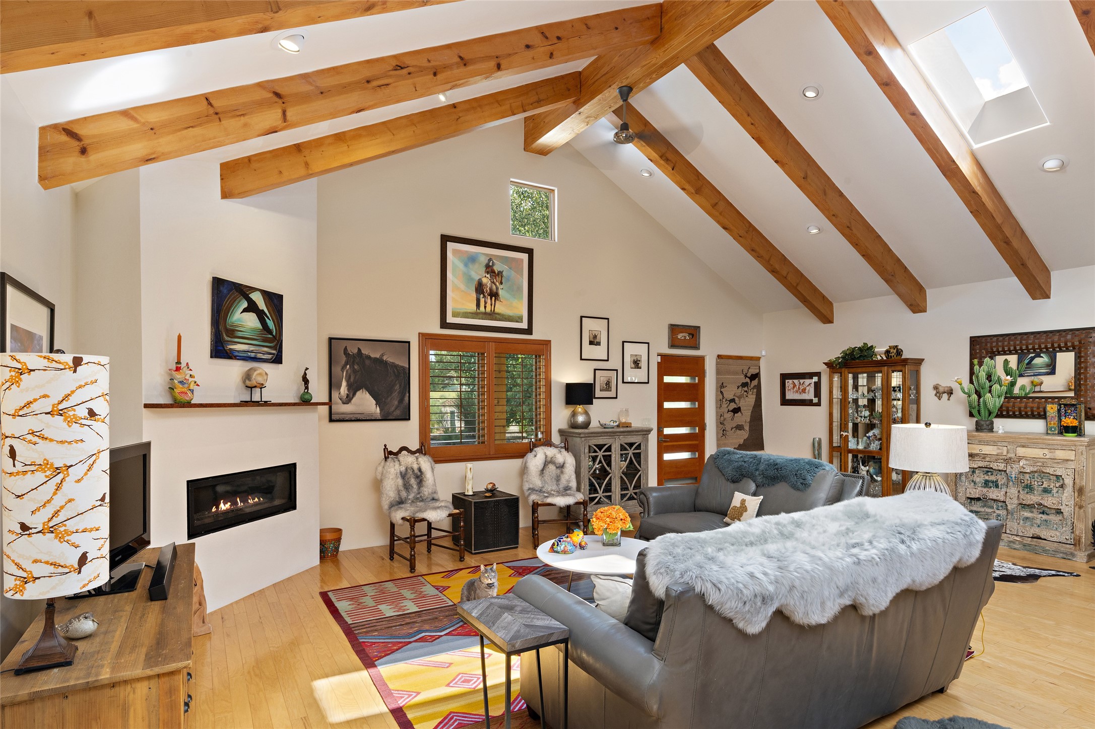 The home and location you have been waiting for - MOVE IN READY! Pitched pro-panel roof, 2300 square feet of absolute luxury, 3 bedrooms, 2 full baths all on one level. Large primary bedroom and guest room have California Closet Systems. Engineered wooden flooring and tile. The Primary suite is totally separated from the other two bedrooms. Third bedroom set up as an office has a built in desk and Closet Systems, all new solar shades and cellular shades throughout. New refrigerator and 4 mini-splits, plantation shutters, in-floor radiant heat. Laundry has CA Built-Ins, lighting with dimmers and on demand hot water. Living room boasts an elegant gas fireplace, open living room, kitchen and dining room with views to the landscaped back and side patio, coyote fencing, drip irrigation in all landscaped areas with native plants and trees leading to a designated green space. New gutters, 360 gallon catchment rain barrel; plus there are peak-boo views of the Sangre foothills from the living room. This home is a rare sparkling jewel that will amaze you!