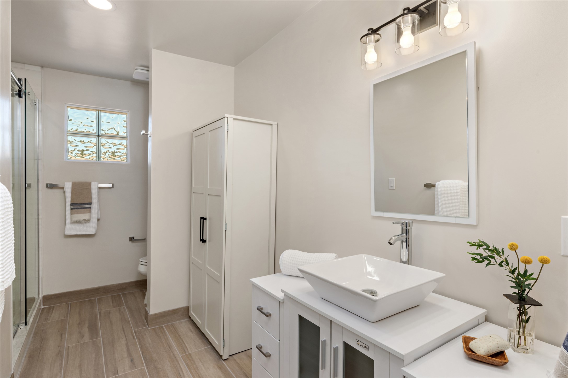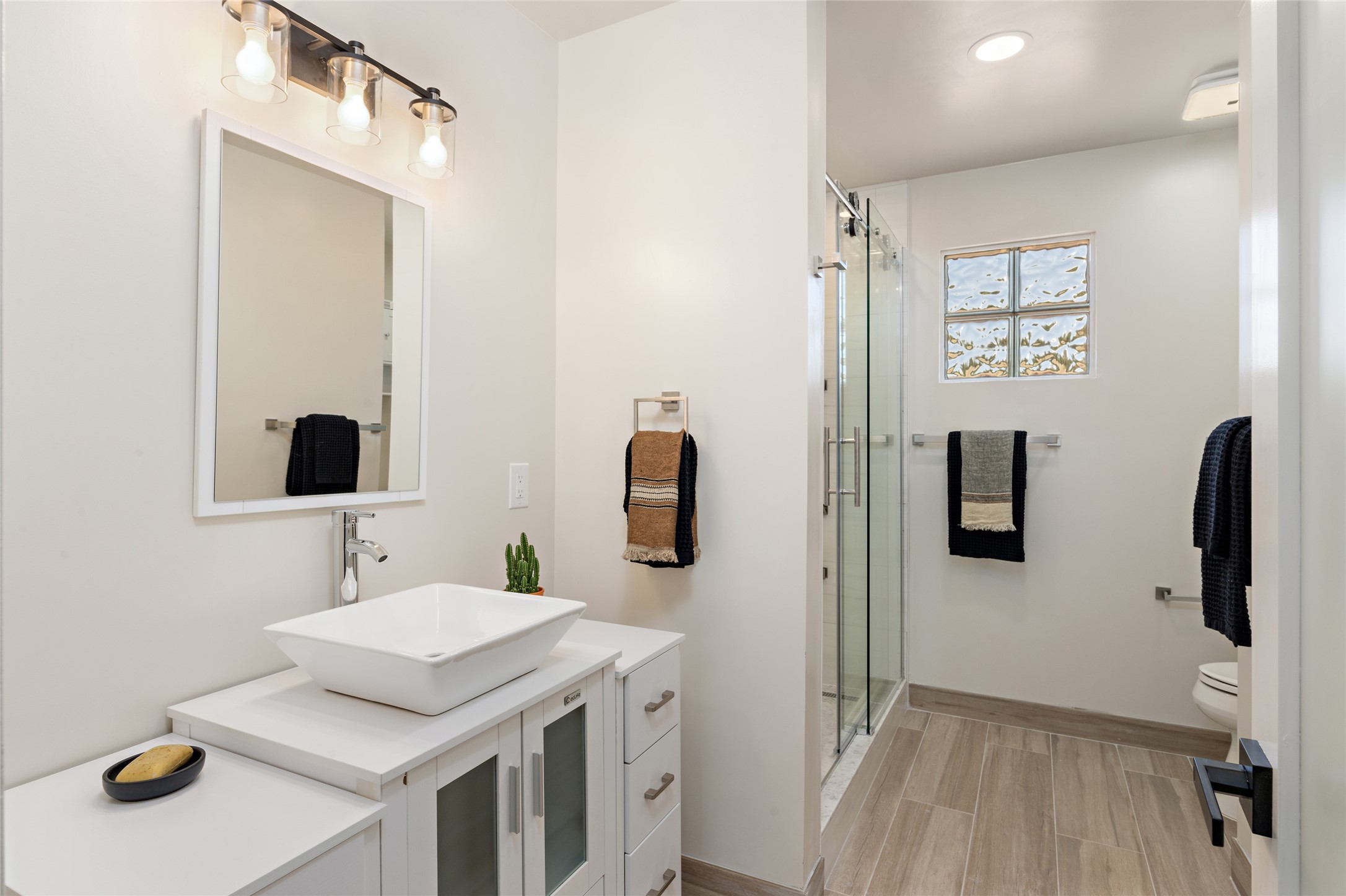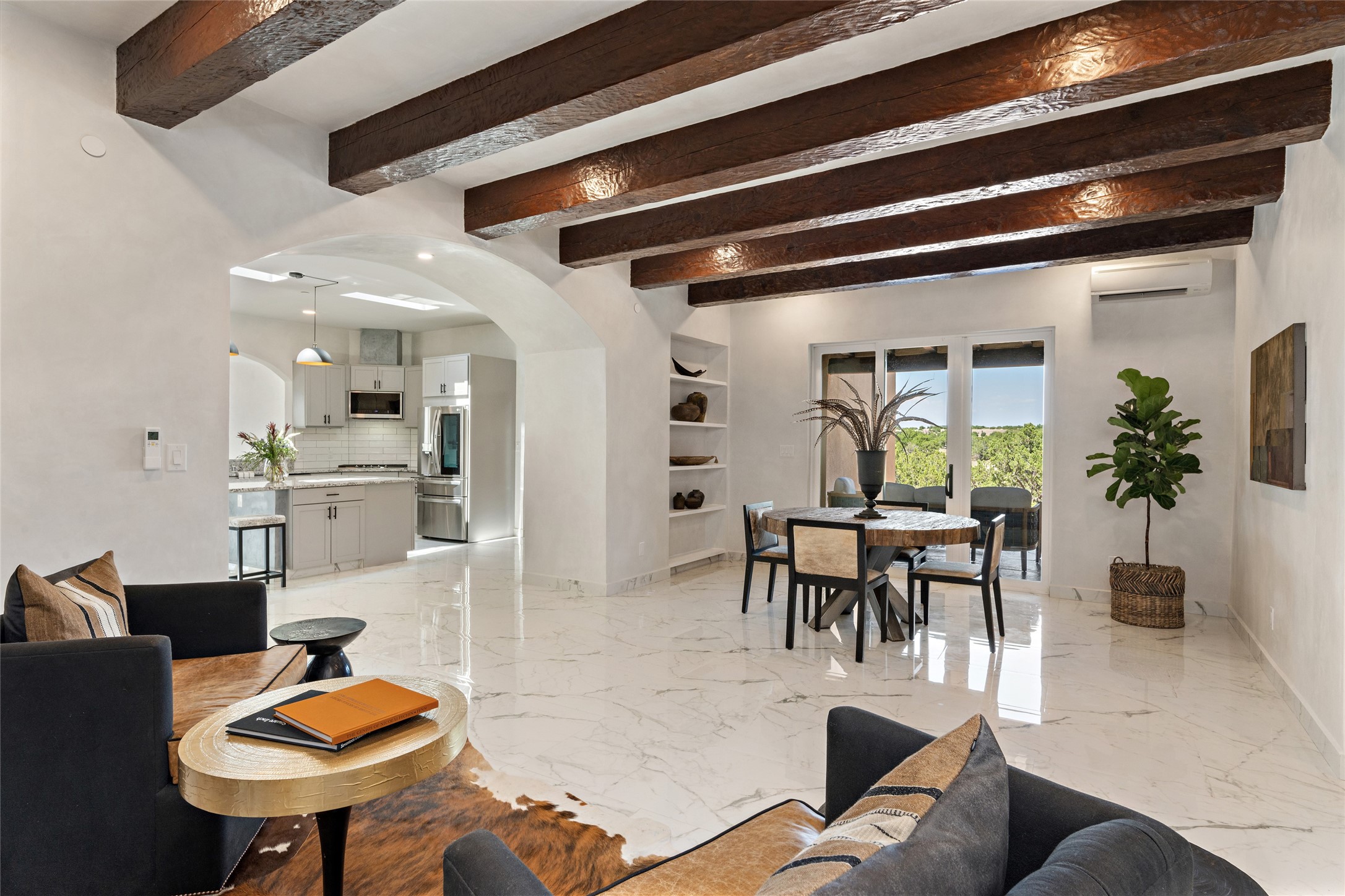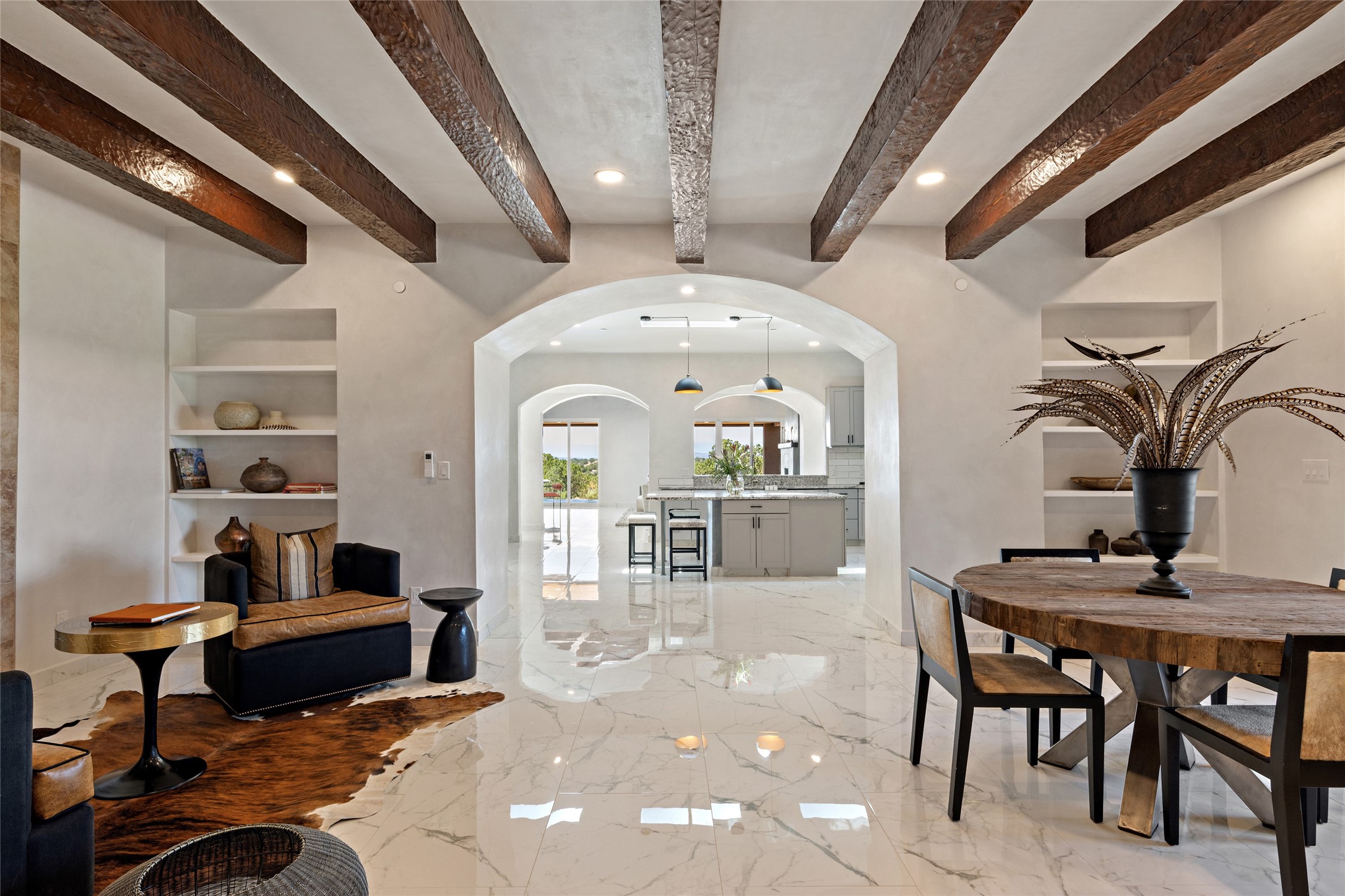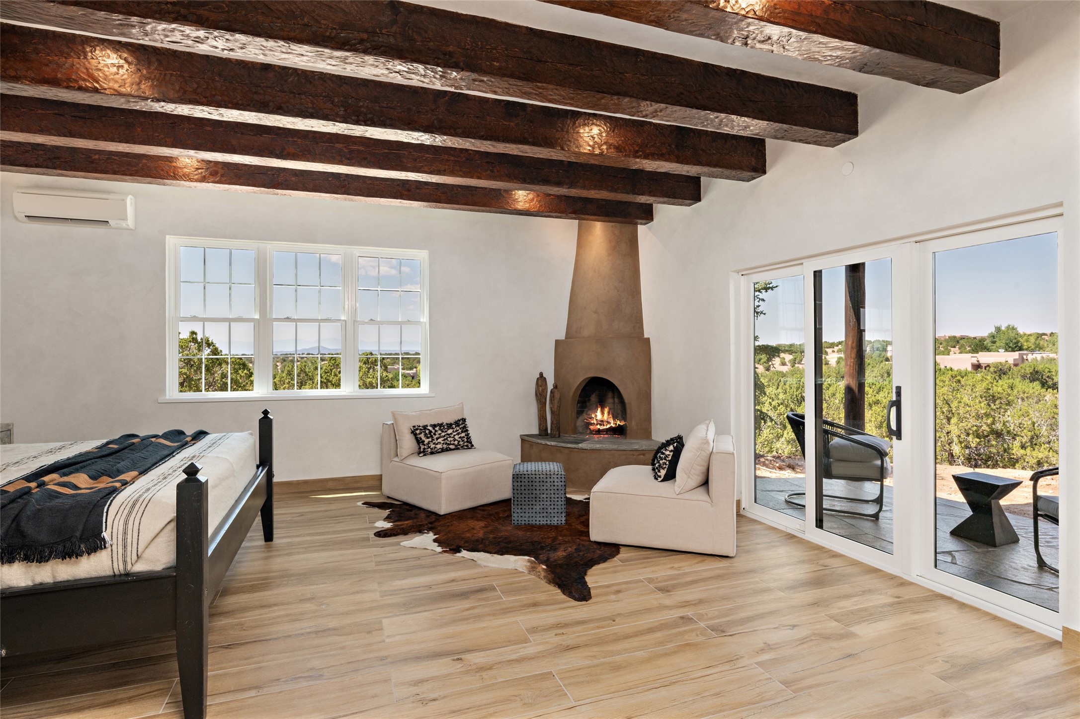 This newly constructed home on two rolling acres offers inspiring Jemez and Sangre de Cristo Mountains views, contemporary conveniences and beautiful finishes throughout. The smart, single-level floor plan was designed to satisfy the needs of various lifestyles with seamless transitions between the open interior and exterior living areas, three private bedroom suites, plus a dedicated office. Multiple chefs can enjoy cooking together in the showcase kitchen which includes a center island with seating and storage, three built-in buffets, a large butler's pantry, and a wine storage pantry. Meanwhile friends and family can relax in the adjacent living-dining room or family room each with its own view portal and fireplace. In the gracious primary bedroom suite, relax in front of the kiva fireplace or on the view portal, or luxuriate in the incredible spa bathroom with a steam shower, soaking tub and dual walk-in closets. Design elements include arched doorways, hand-troweled diamond plaster walls, lighted nichos, built-in shelving, and hand-carved beams. An oversized 2-car garage, new mechanical systems and a 6,000 gallon water harvesting cistern serving two irrigation zones complete the low-maintenance, quality-of-life package.