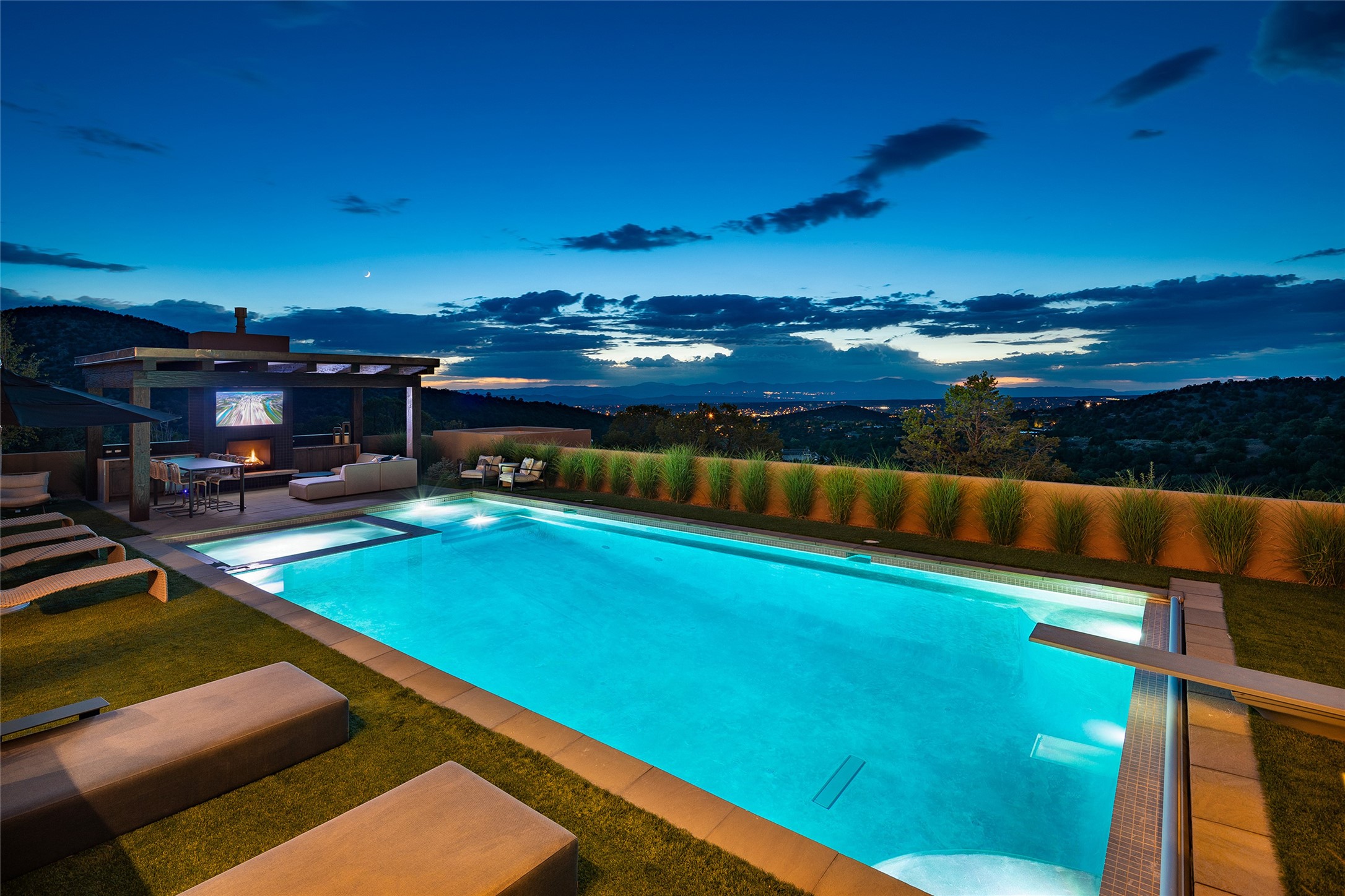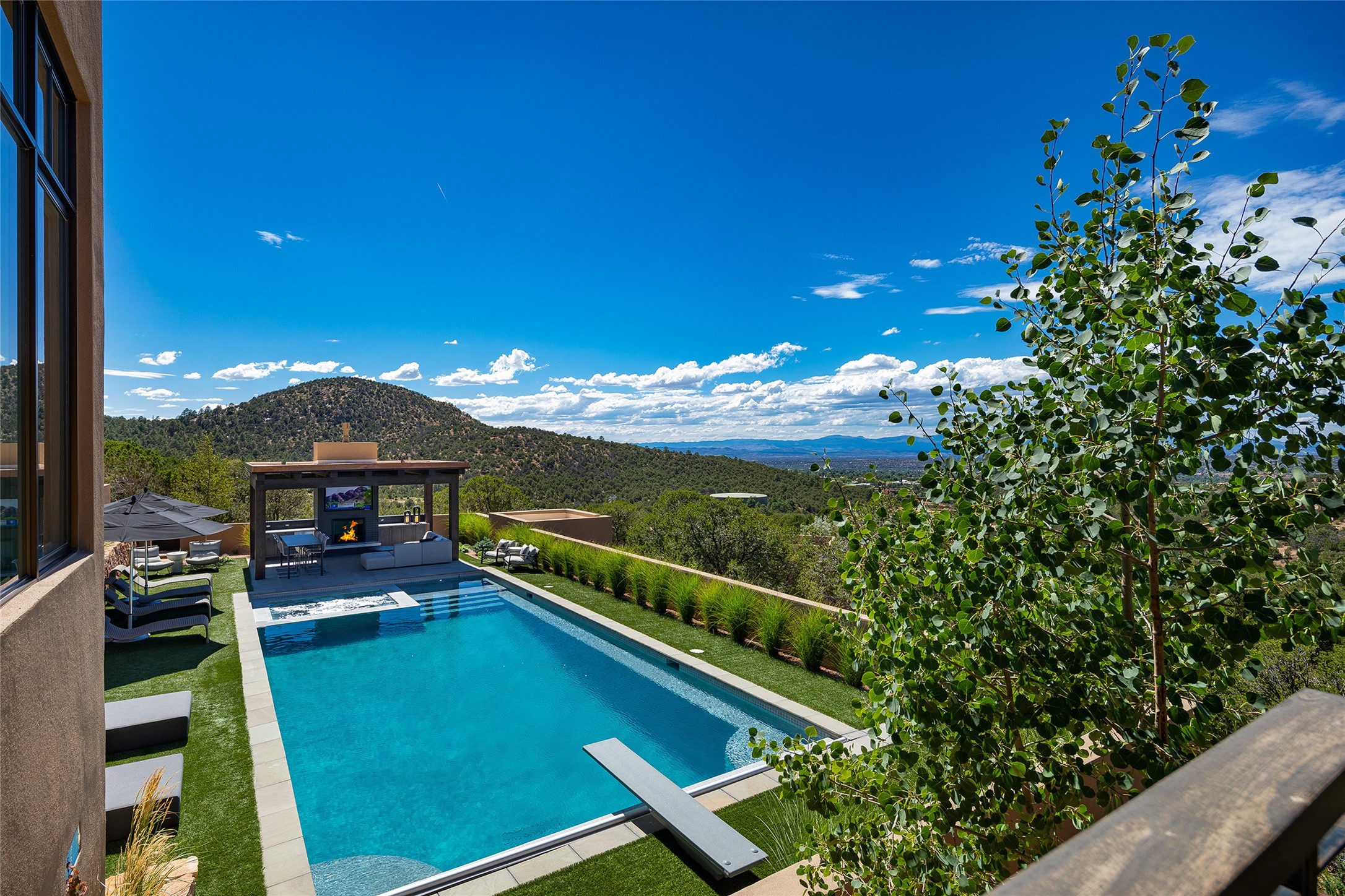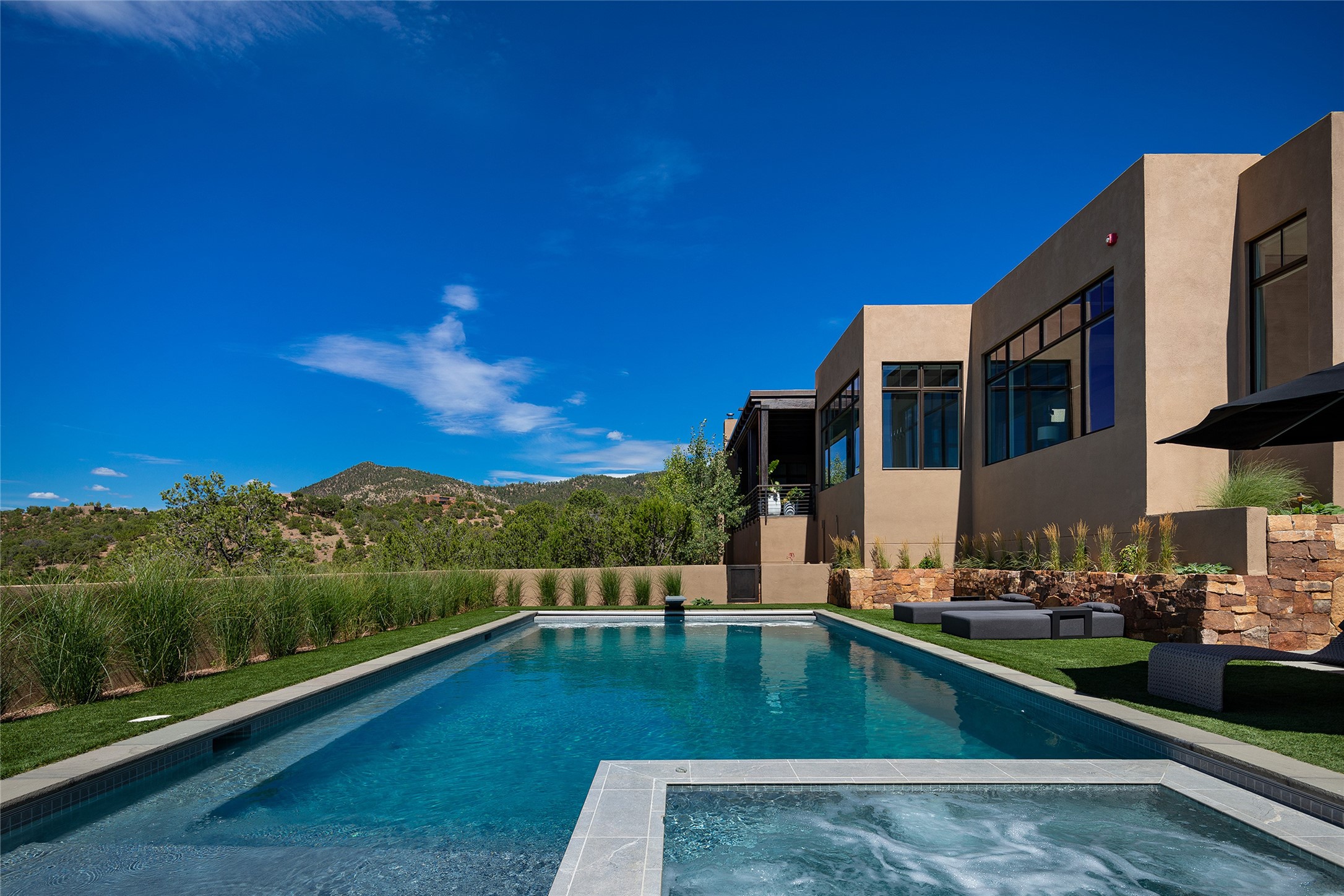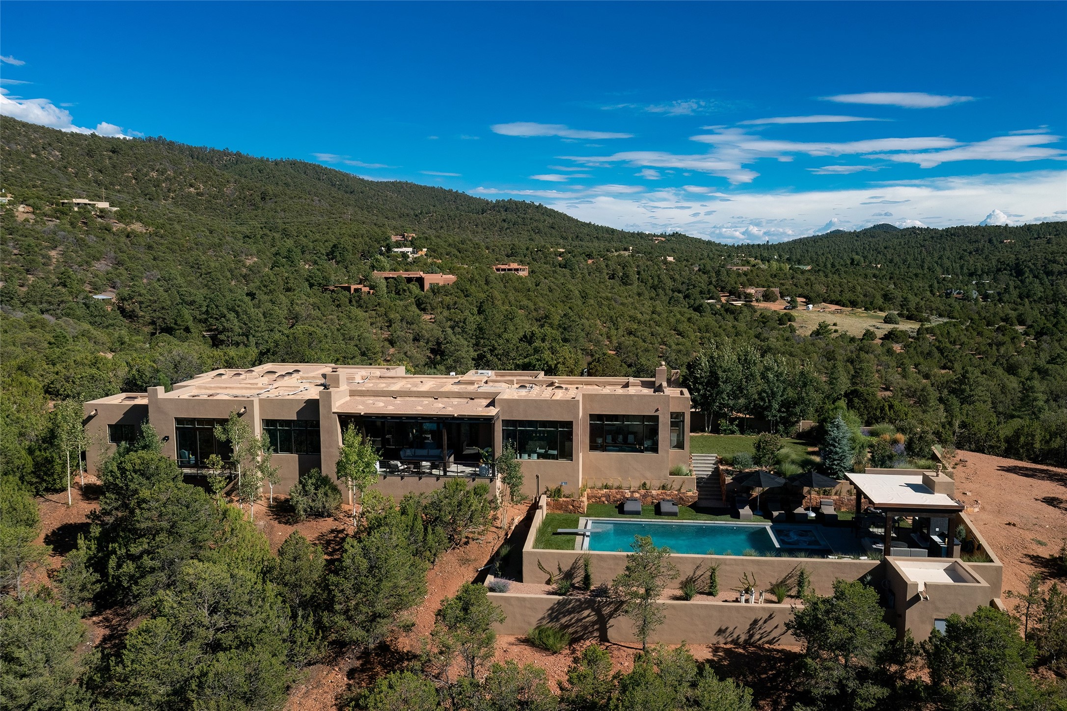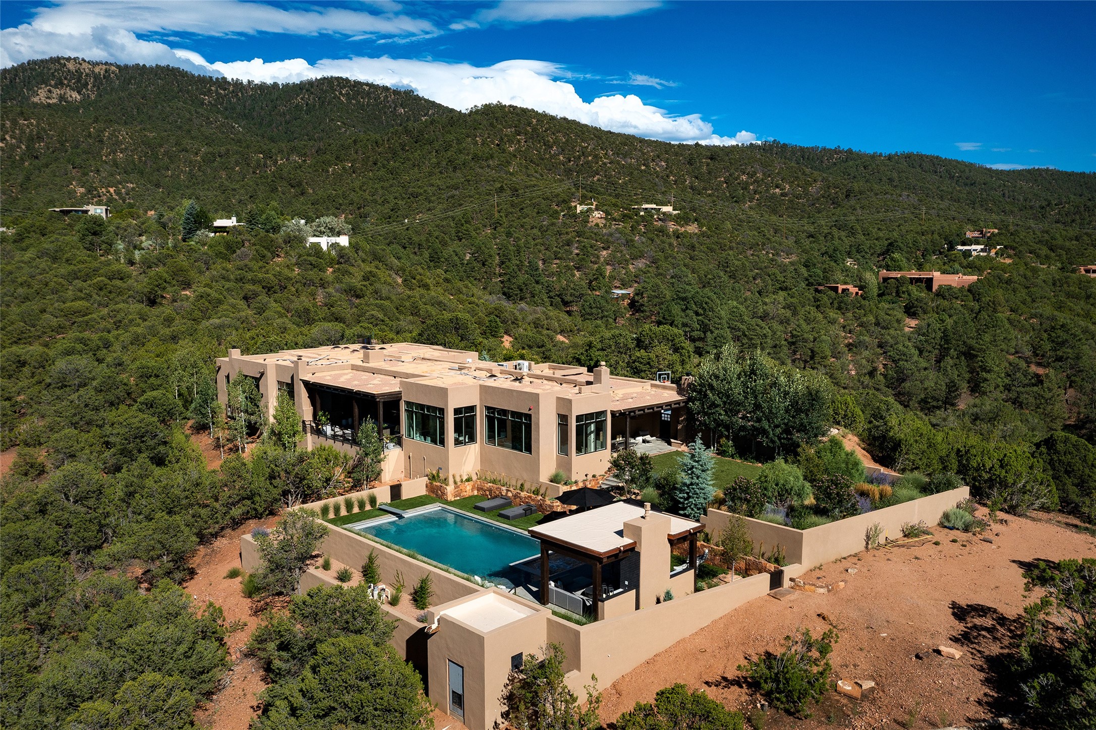One of the most extraordinary estates in all of Santa Fe, this exceptional 2018-built residence by the awarding winning, Woods Design Builders excites and captivates with powerful architecture, stunning, expansive views mountain, city and sunset views, and a rare resort-style diving pool, spa, and cabana. Located within Wilderness Gate, and sited on a superior, elevated 5 acre view lot, this exquisite gated residence, exemplifies the unique blend of sophisticated contemporary design with inherent Santa Fe warmth. Designed with a grand open concept living experience, with seamless surround view windows, this fabulous home stuns upon entering through the glass and metal pivot front entrance door into the living room and dining room, complete with a custom metal accent wall, fireplace, wet bar, wine cooler, and sliding glass doors which open to the epic mountain and city views and the the outdoor covered portal with a BBQ and fireplace. The ultimate entertainer's kitchen delights with an expansive island with waterfall Taj Mahal counters, pantry, dual sinks, and luxury appliances, which opens to a casual dining and living room with a fireplace. The luxurious owner's suite delights with majestic views, private portal, an attached office area, sitting room or an ideal media room, and a state-of-the art bath complete with a jetted tub, steam shower, and generous walk-in closet. Separate from the owner's suite are two well-appointed guest bedroom ensuites, plus an additional living room with an office niche. The newly installed heated pool and spa with a fully equipped cabana defines excellence, with resistance swim jets, an outdoor kitchen, fireplace and media center. Additional luxury features include white oak flooring, lush vibrant surround gardens with multiple outdoor entertainment areas, plaster walls, and rich beams with steel accents throughout, and all within minutes from the Plaza, steps away from Atalaya Mnt, St. Johns College, and the Dale Ball trail system.