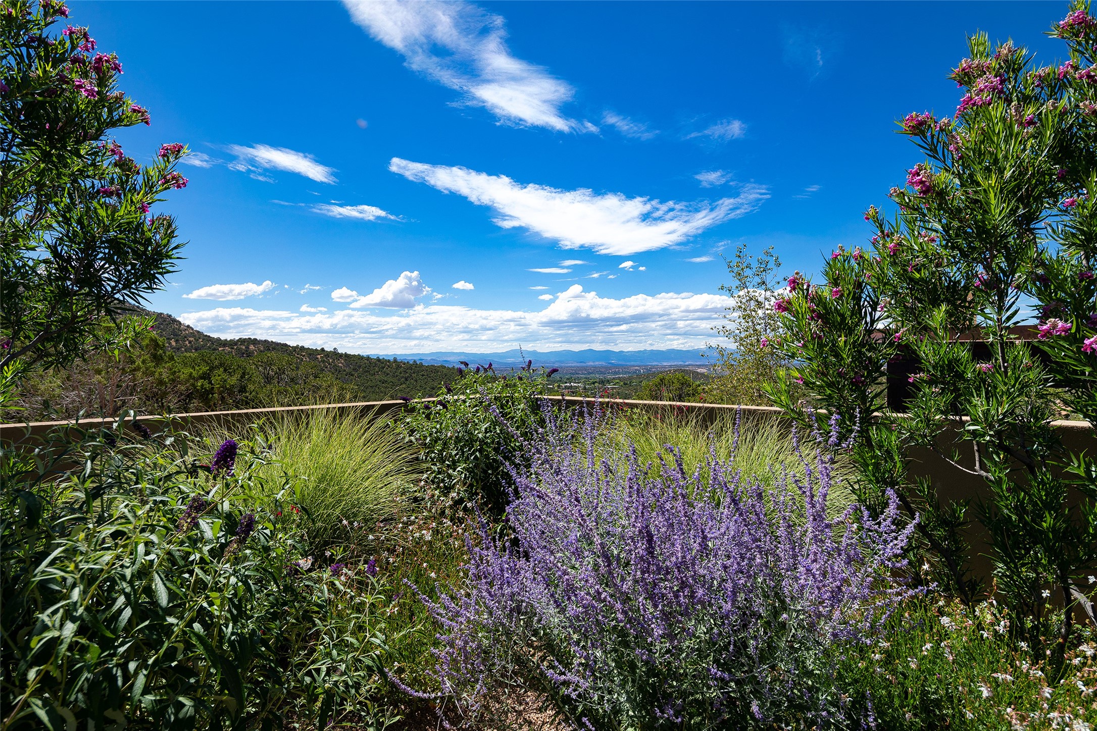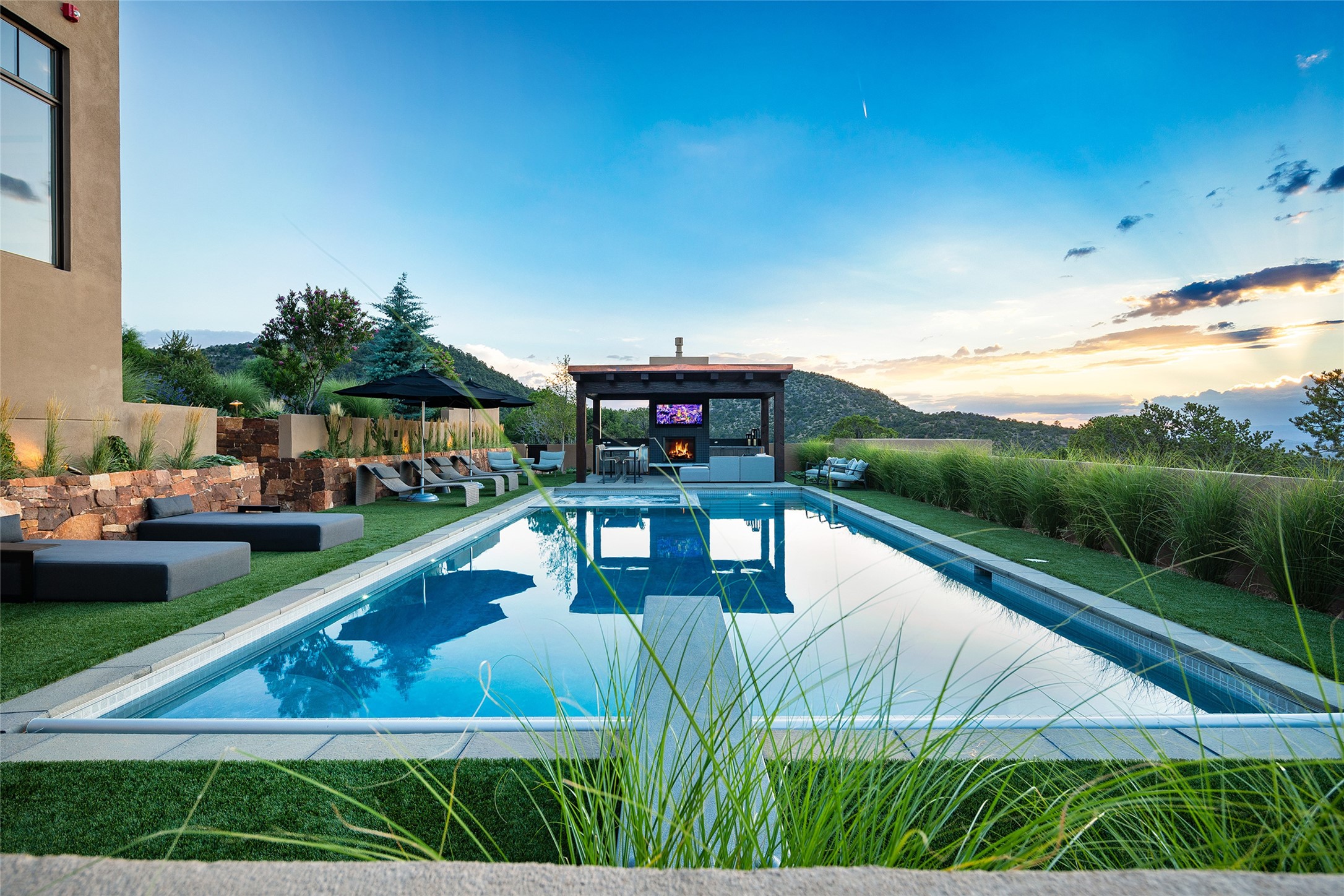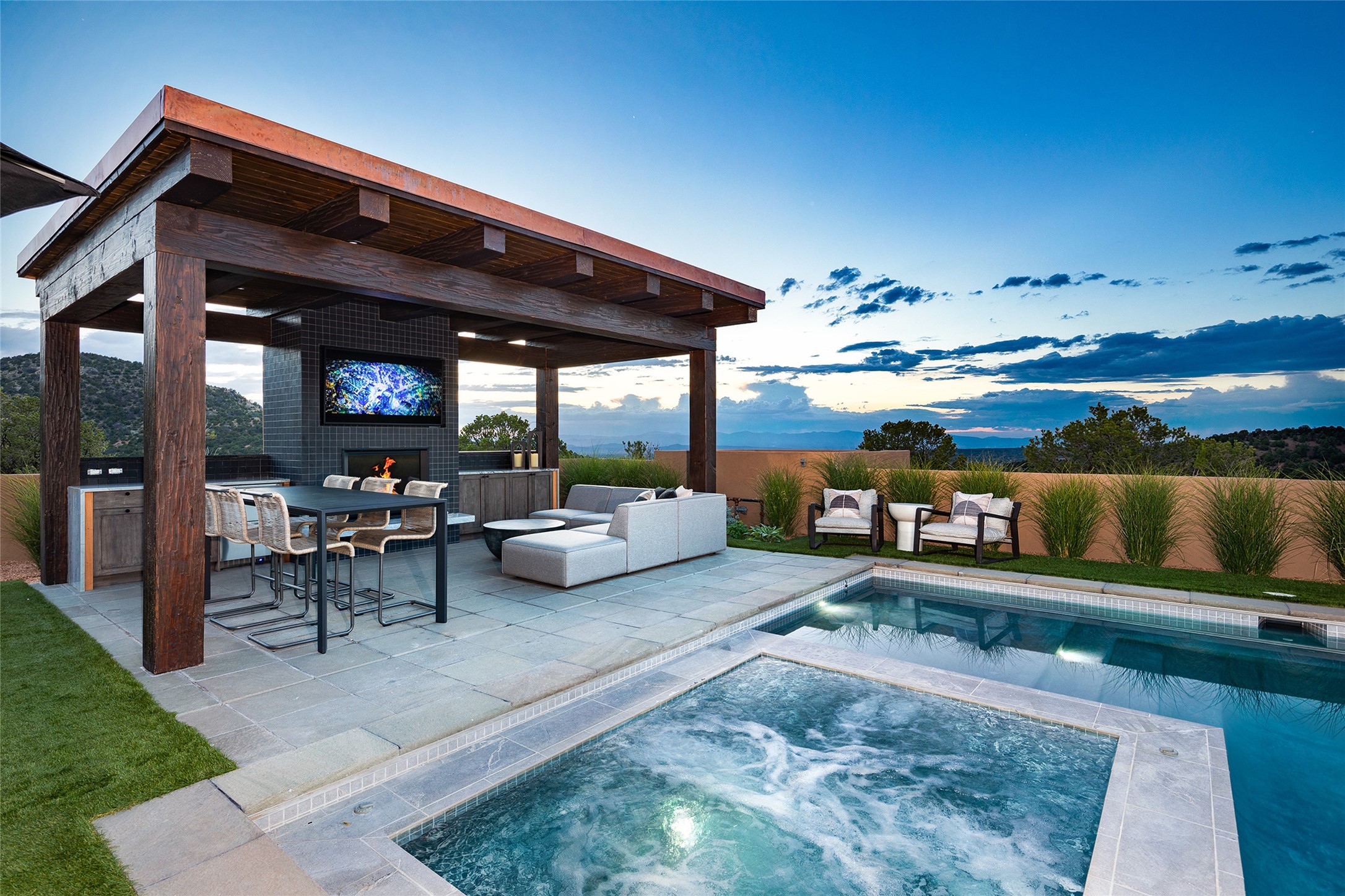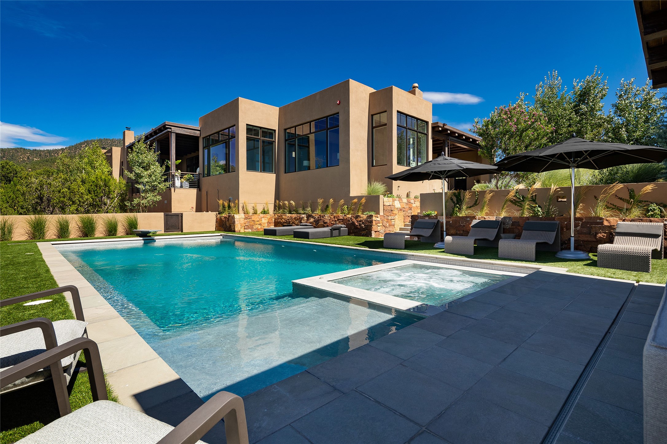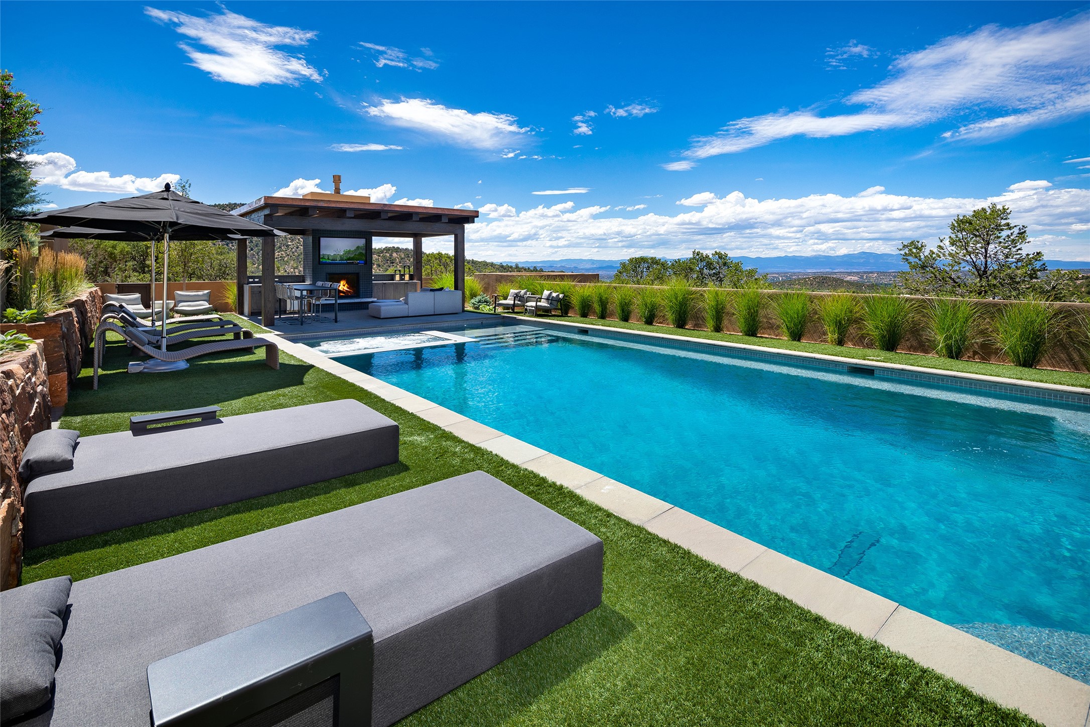 One of the most extraordinary estates in all of Santa Fe, this exceptional 2018-built residence by the awarding winning, Woods Design Builders excites and captivates with powerful architecture, stunning, expansive views mountain, city and sunset views, and a rare resort-style diving pool, spa, and cabana. Located within Wilderness Gate, and sited on a superior, elevated 5 acre view lot, this exquisite gated residence, exemplifies the unique blend of sophisticated contemporary design with inherent Santa Fe warmth. Designed with a grand open concept living experience, with seamless surround view windows, this fabulous home stuns upon entering through the glass and metal pivot front entrance door into the living room and dining room, complete with a custom metal accent wall, fireplace, wet bar, wine cooler, and sliding glass doors which open to the epic mountain and city views and the the outdoor covered portal with a BBQ and fireplace. The ultimate entertainer's kitchen delights with an expansive island with waterfall Taj Mahal counters, pantry, dual sinks, and luxury appliances, which opens to a casual dining and living room with a fireplace. The luxurious owner's suite delights with majestic views, private portal, an attached office area, sitting room or an ideal media room, and a state-of-the art bath complete with a jetted tub, steam shower, and generous walk-in closet. Separate from the owner's suite are two well-appointed guest bedroom ensuites, plus an additional living room with an office niche. The newly installed heated pool and spa with a fully equipped cabana defines excellence, with resistance swim jets, an outdoor kitchen, fireplace and media center. Additional luxury features include white oak flooring, lush vibrant surround gardens with multiple outdoor entertainment areas, plaster walls, and rich beams with steel accents throughout, and all within minutes from the Plaza, steps away from Atalaya Mnt, St. Johns College, and the Dale Ball trail system.