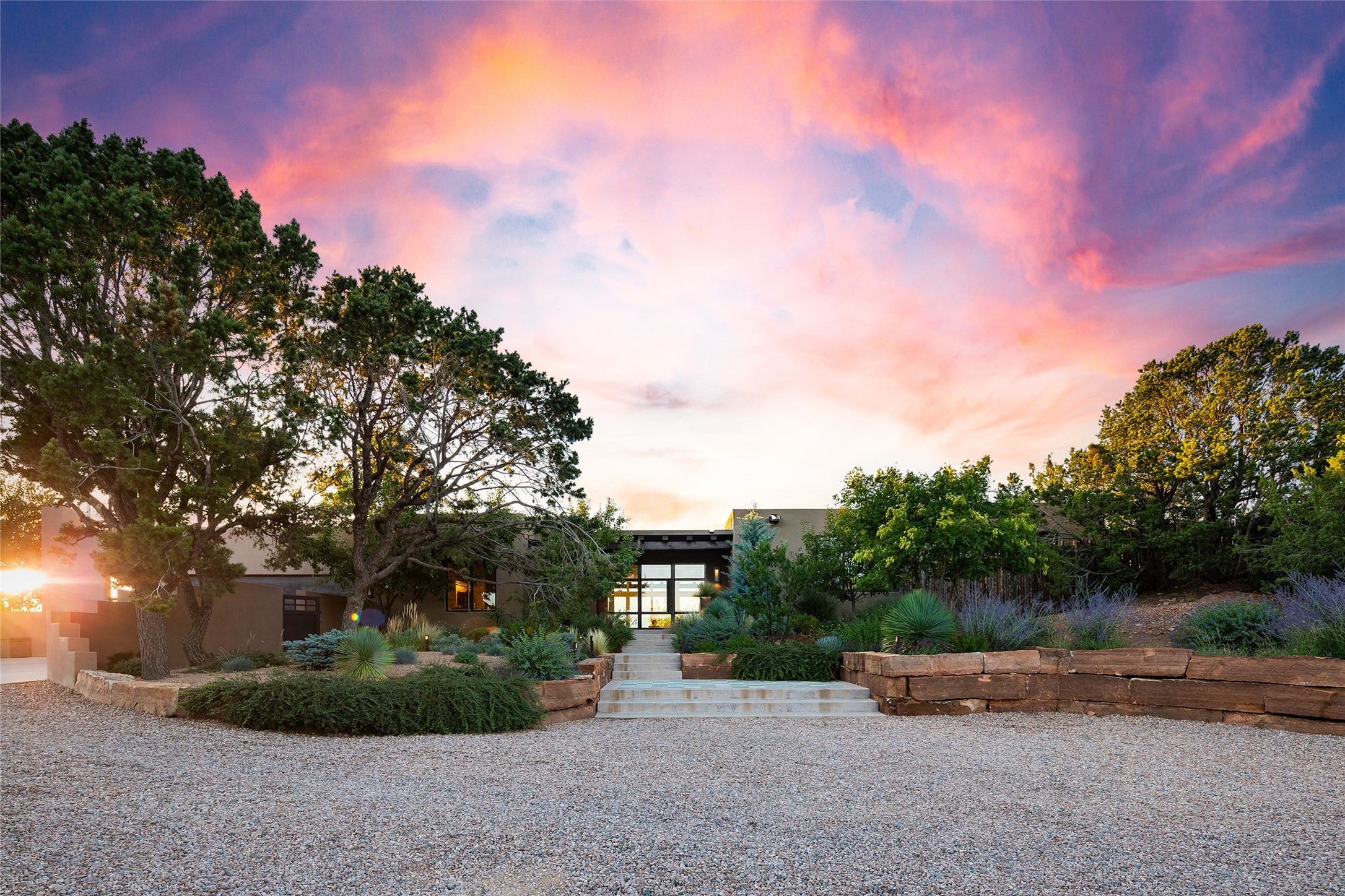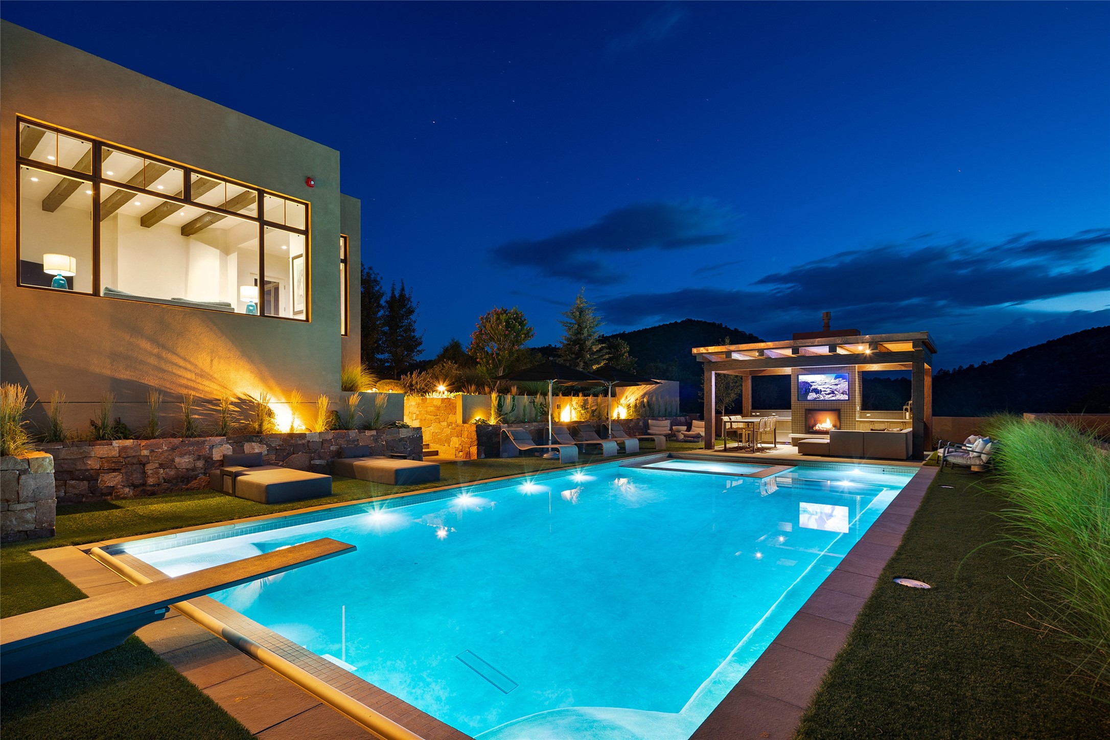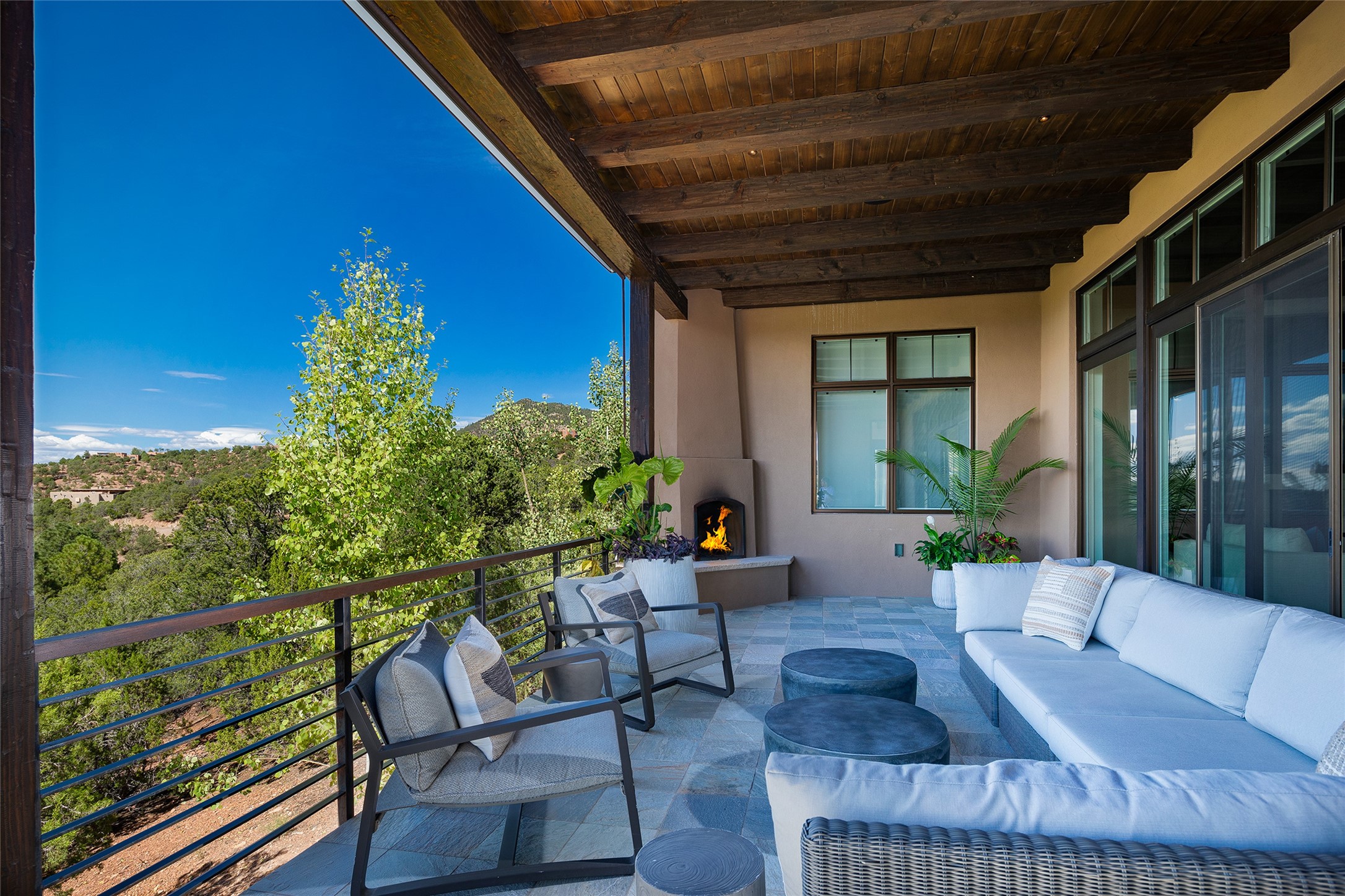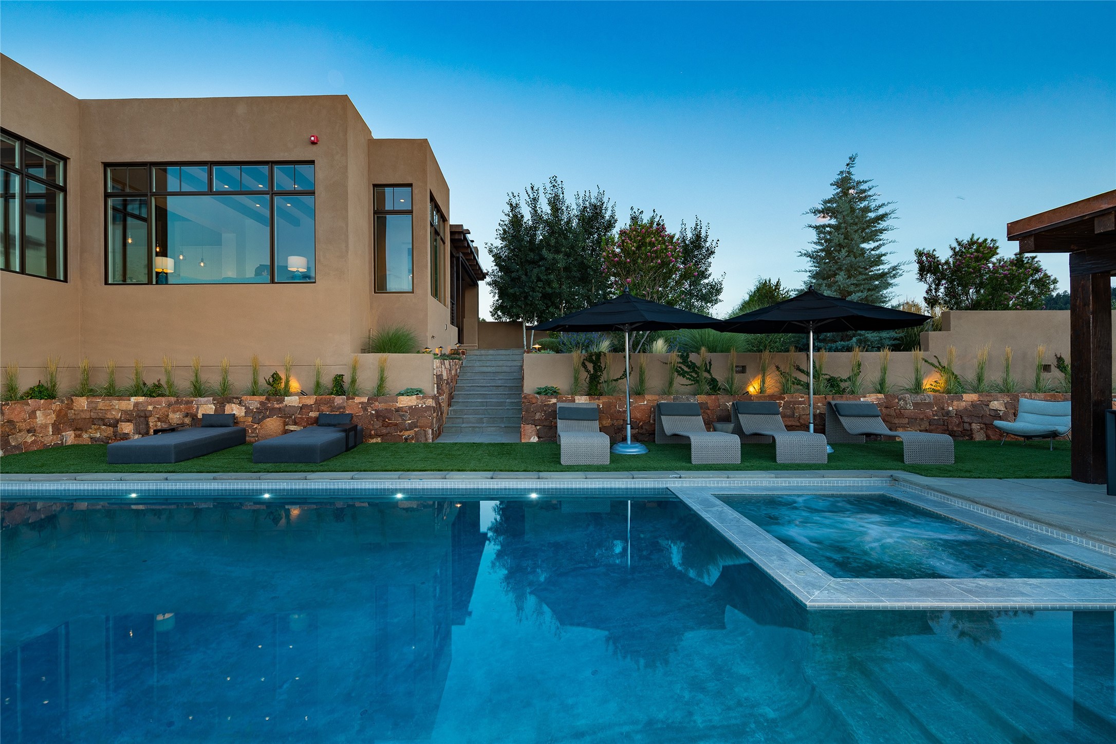One of the most extraordinary estates in all of Santa Fe, this exceptional 2018-built residence by the awarding winning, Woods Design Builders excites and captivates with powerful architecture, stunning, expansive views mountain, city and sunset views, and a rare resort-style diving pool, spa, and cabana. Located within Wilderness Gate, and sited on a superior, elevated 5 acre view lot, this exquisite gated residence, exemplifies the unique blend of sophisticated contemporary design with inherent Santa Fe warmth. Designed with a grand open concept living experience, with seamless surround view windows, this fabulous home stuns upon entering through the glass and metal pivot front entrance door into the living room and dining room, complete with a custom metal accent wall, fireplace, wet bar, wine cooler, and sliding glass doors which open to the epic mountain and city views and the the outdoor covered portal with a BBQ and fireplace. The ultimate entertainer's kitchen delights with an expansive island with waterfall Taj Mahal counters, pantry, dual sinks, and luxury appliances, which opens to a casual dining and living room with a fireplace. The luxurious owner's suite delights with majestic views, private portal, an attached office area, sitting room or an ideal media room, and a state-of-the art bath complete with a jetted tub, steam shower, and generous walk-in closet. Separate from the owner's suite are two well-appointed guest bedroom ensuites, plus an additional living room with an office niche. The newly installed heated pool and spa with a fully equipped cabana defines excellence, with resistance swim jets, an outdoor kitchen, fireplace and media center. Additional luxury features include white oak flooring, lush vibrant surround gardens with multiple outdoor entertainment areas, plaster walls, and rich beams with steel accents throughout, and all within minutes from the Plaza, steps away from Atalaya Mnt, St. Johns College, and the Dale Ball trail system.