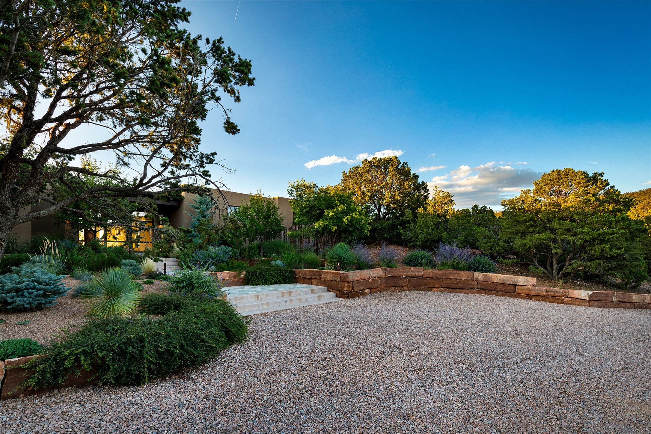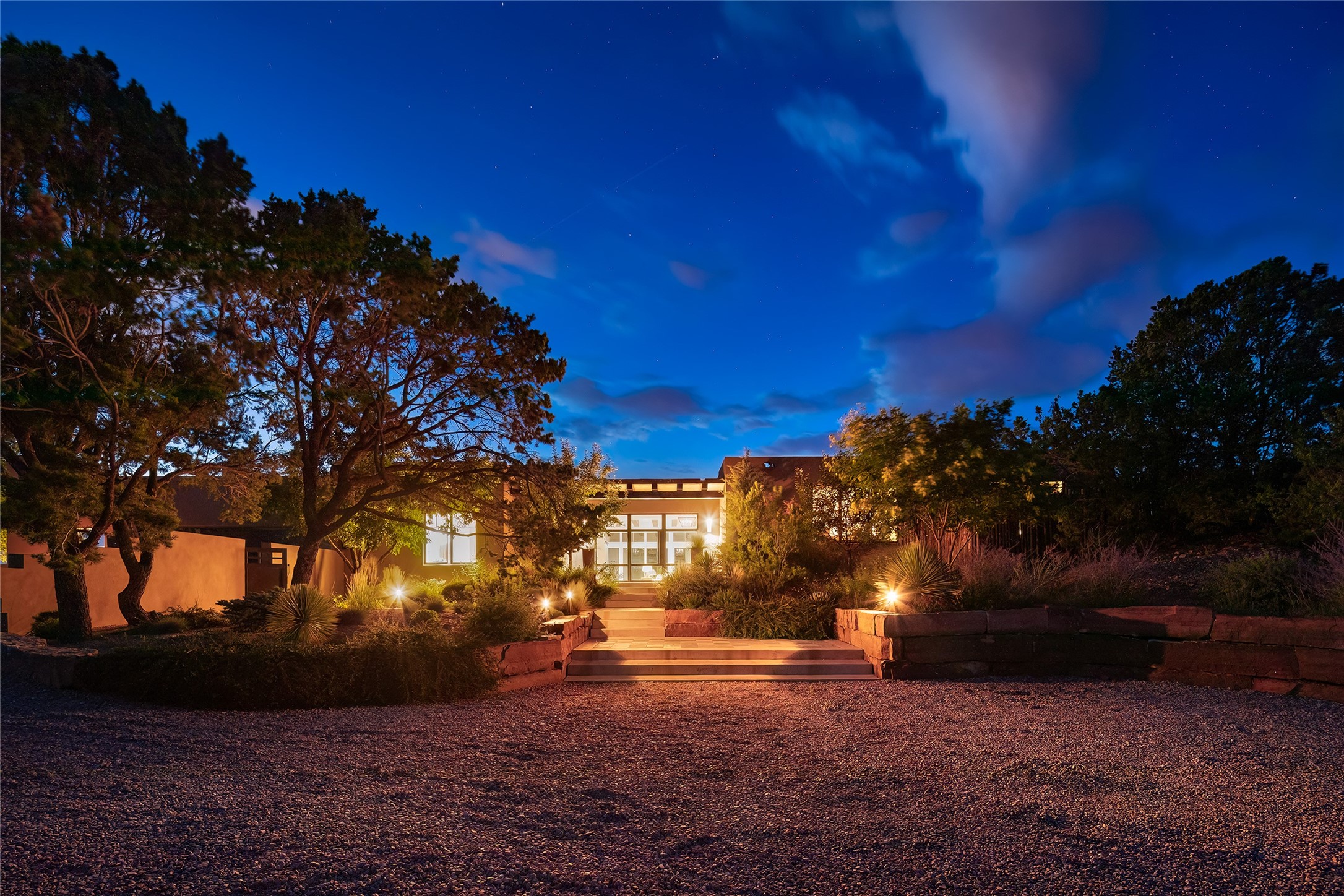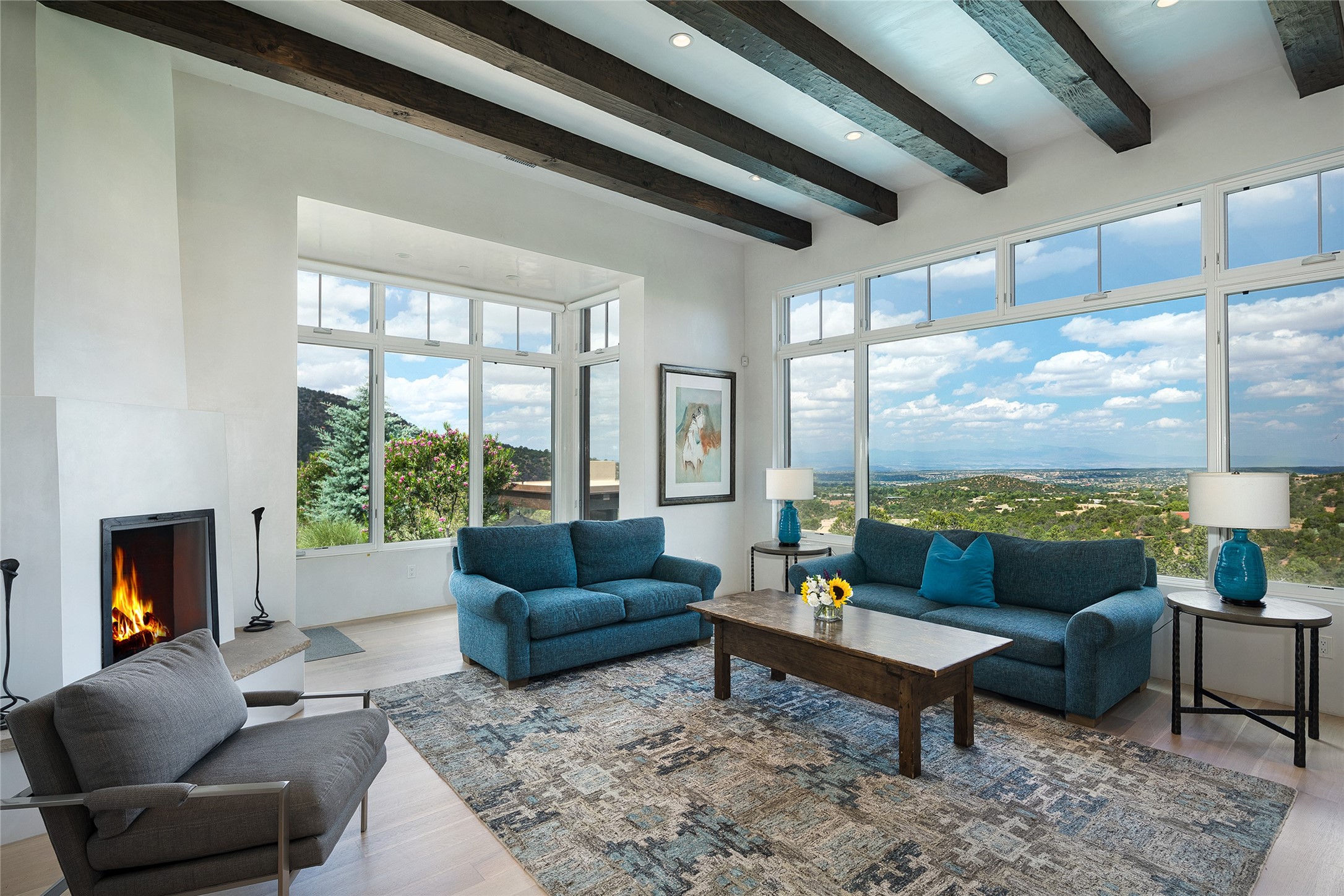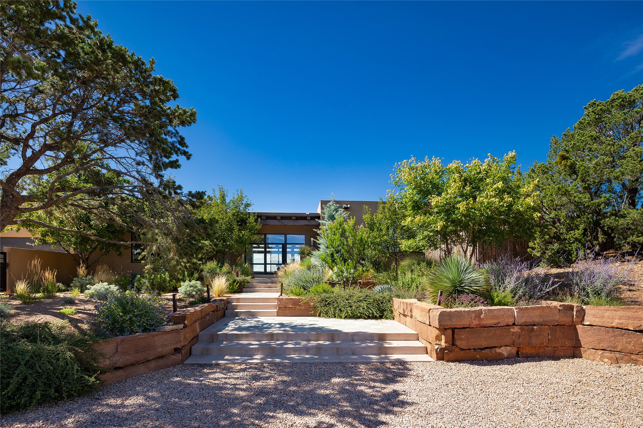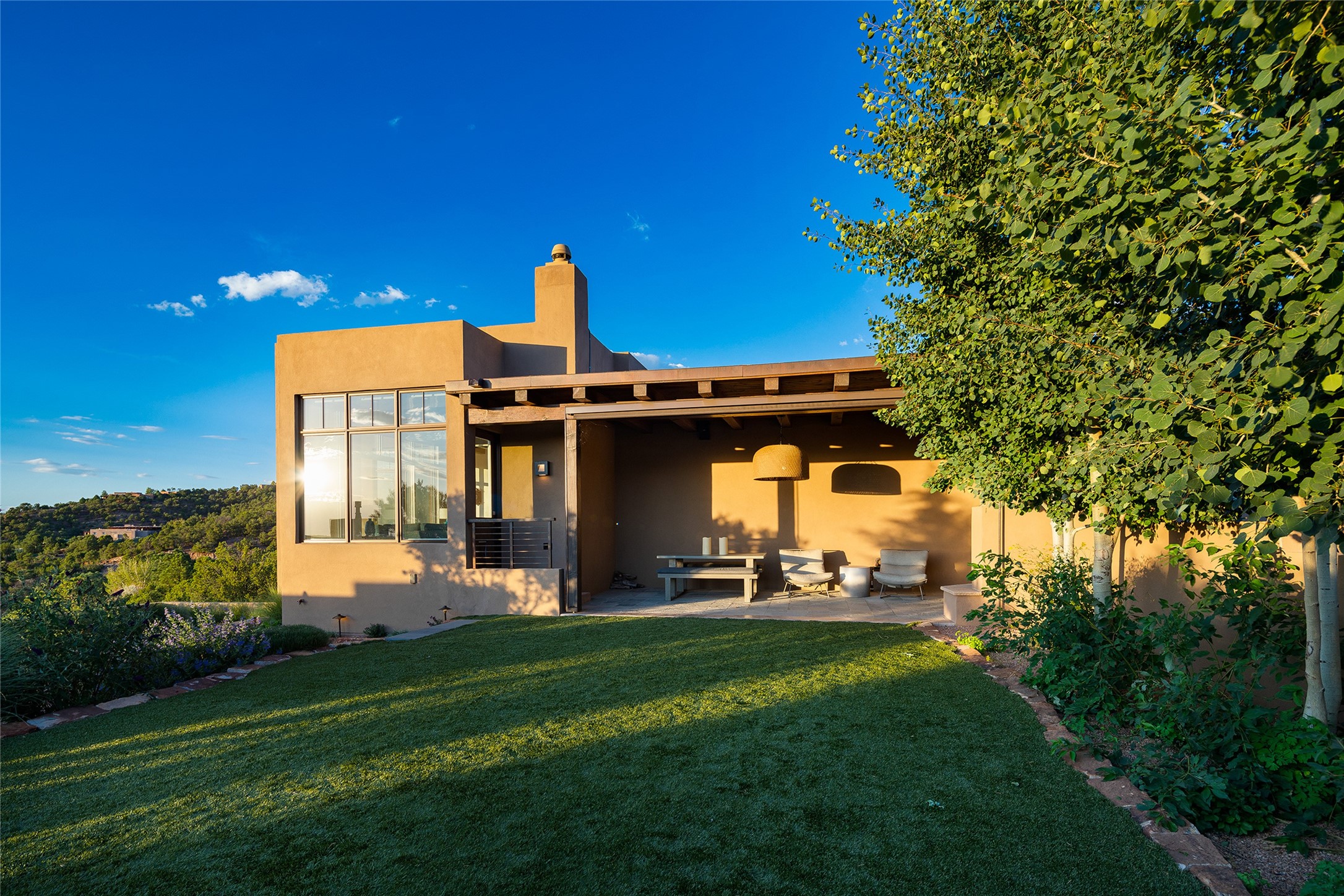 One of the most extraordinary estates in all of Santa Fe, this exceptional 2018-built residence by the awarding winning, Woods Design Builders excites and captivates with powerful architecture, stunning, expansive views mountain, city and sunset views, and a rare resort-style diving pool, spa, and cabana. Located within Wilderness Gate, and sited on a superior, elevated 5 acre view lot, this exquisite gated residence, exemplifies the unique blend of sophisticated contemporary design with inherent Santa Fe warmth. Designed with a grand open concept living experience, with seamless surround view windows, this fabulous home stuns upon entering through the glass and metal pivot front entrance door into the living room and dining room, complete with a custom metal accent wall, fireplace, wet bar, wine cooler, and sliding glass doors which open to the epic mountain and city views and the the outdoor covered portal with a BBQ and fireplace. The ultimate entertainer's kitchen delights with an expansive island with waterfall Taj Mahal counters, pantry, dual sinks, and luxury appliances, which opens to a casual dining and living room with a fireplace. The luxurious owner's suite delights with majestic views, private portal, an attached office area, sitting room or an ideal media room, and a state-of-the art bath complete with a jetted tub, steam shower, and generous walk-in closet. Separate from the owner's suite are two well-appointed guest bedroom ensuites, plus an additional living room with an office niche. The newly installed heated pool and spa with a fully equipped cabana defines excellence, with resistance swim jets, an outdoor kitchen, fireplace and media center. Additional luxury features include white oak flooring, lush vibrant surround gardens with multiple outdoor entertainment areas, plaster walls, and rich beams with steel accents throughout, and all within minutes from the Plaza, steps away from Atalaya Mnt, St. Johns College, and the Dale Ball trail system.